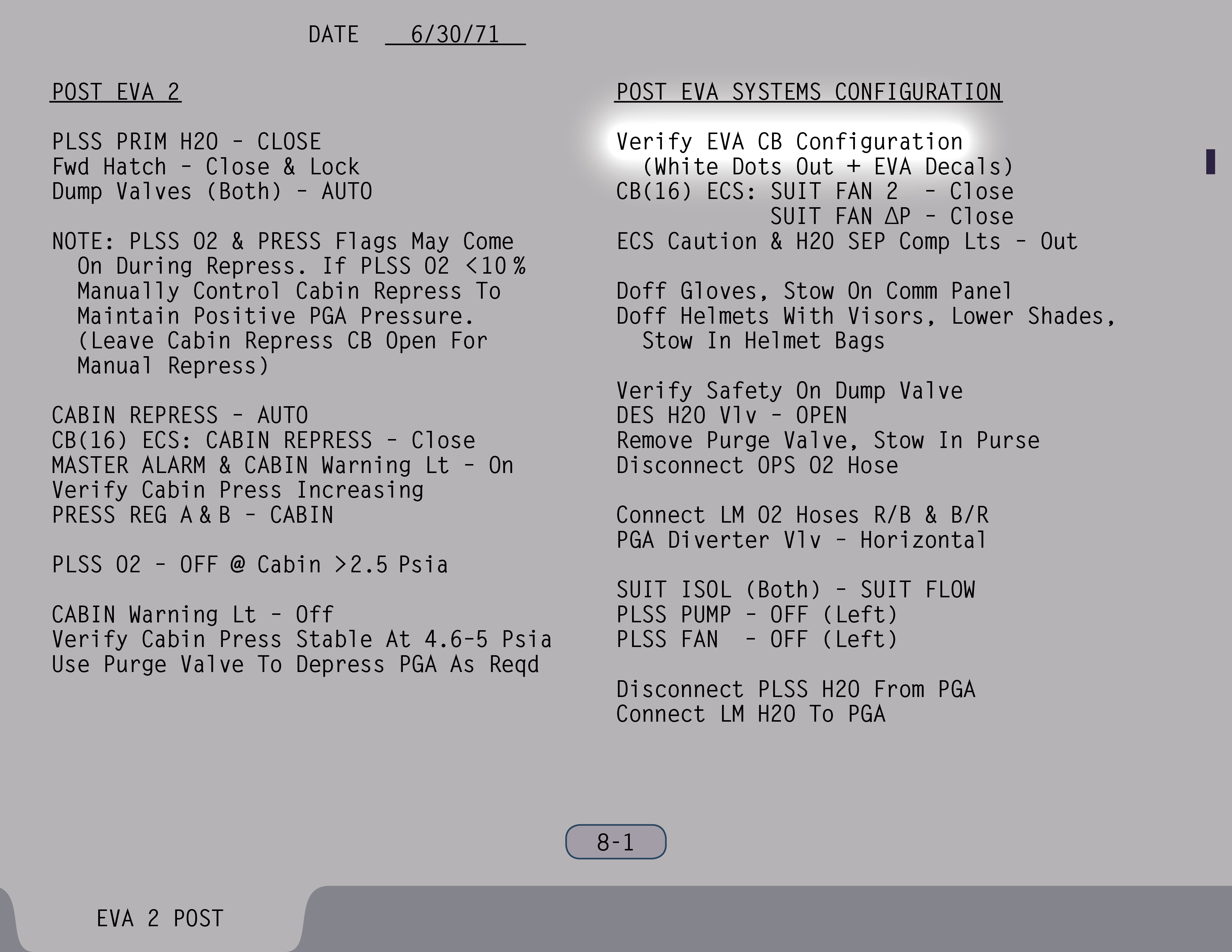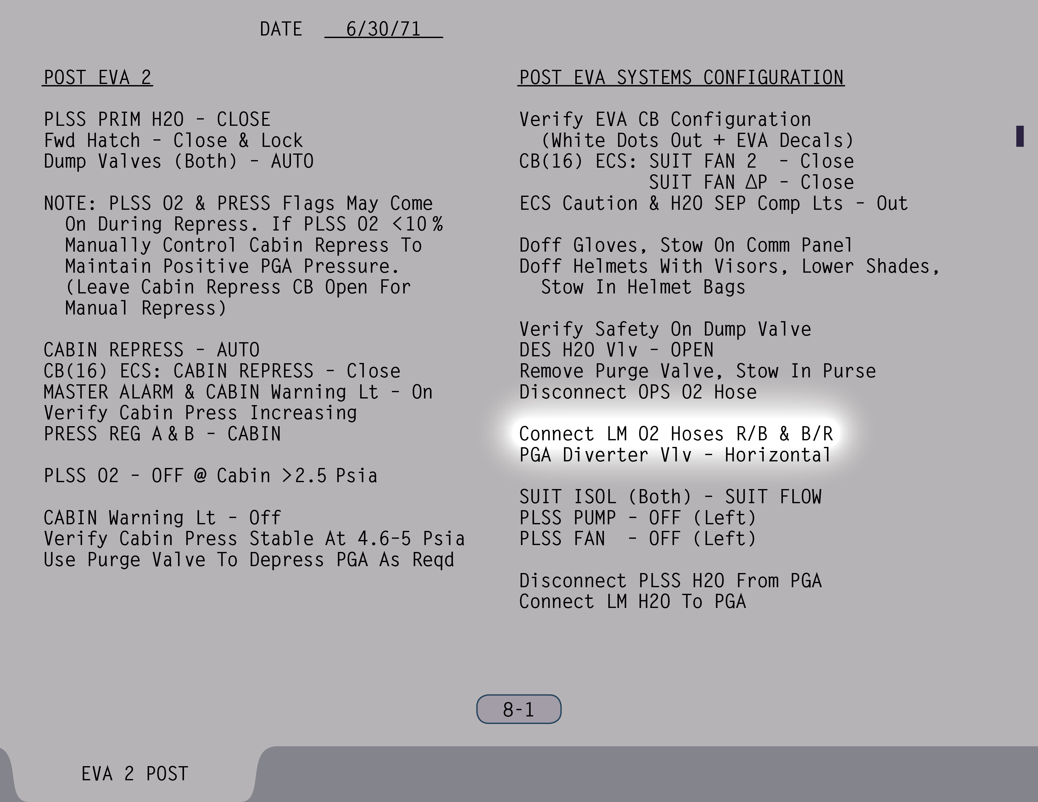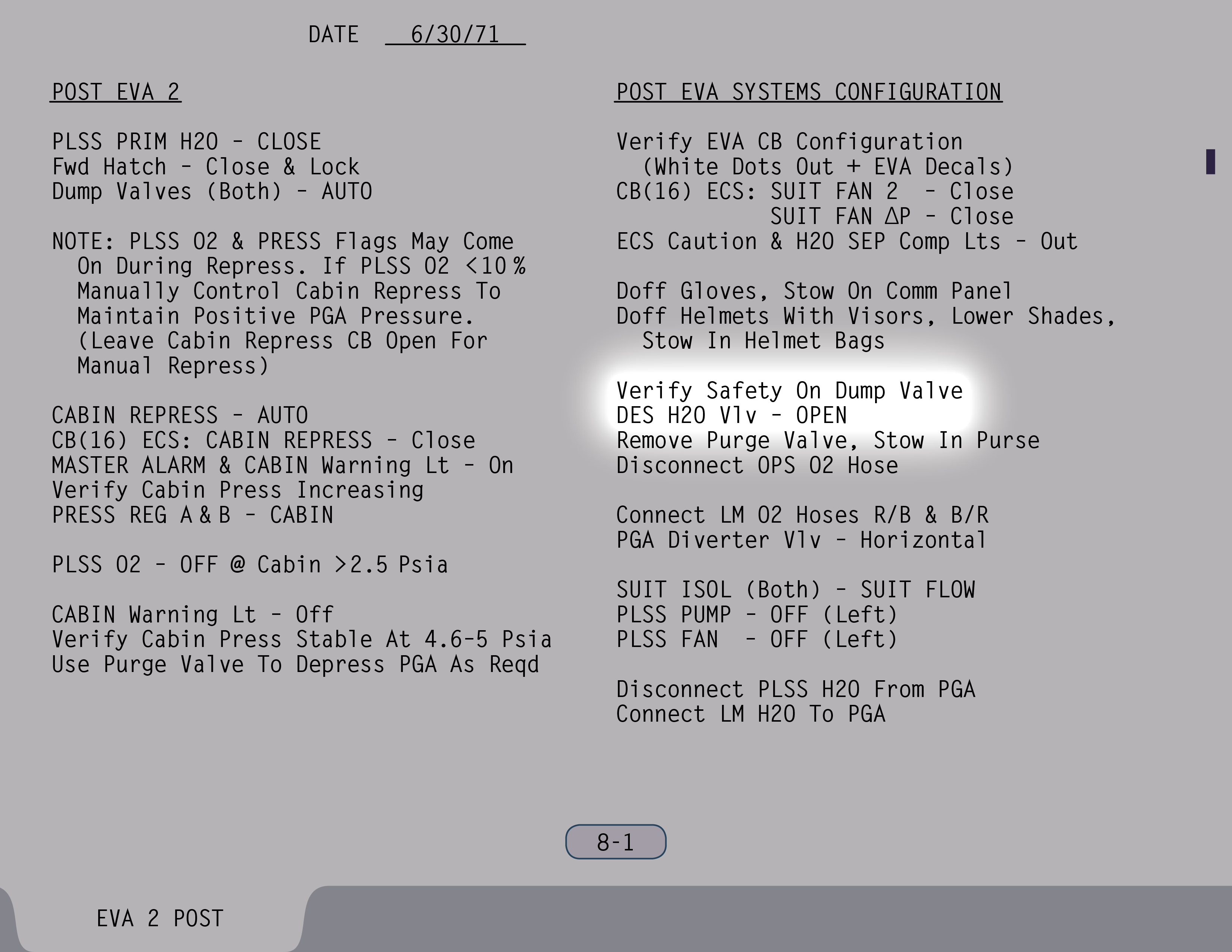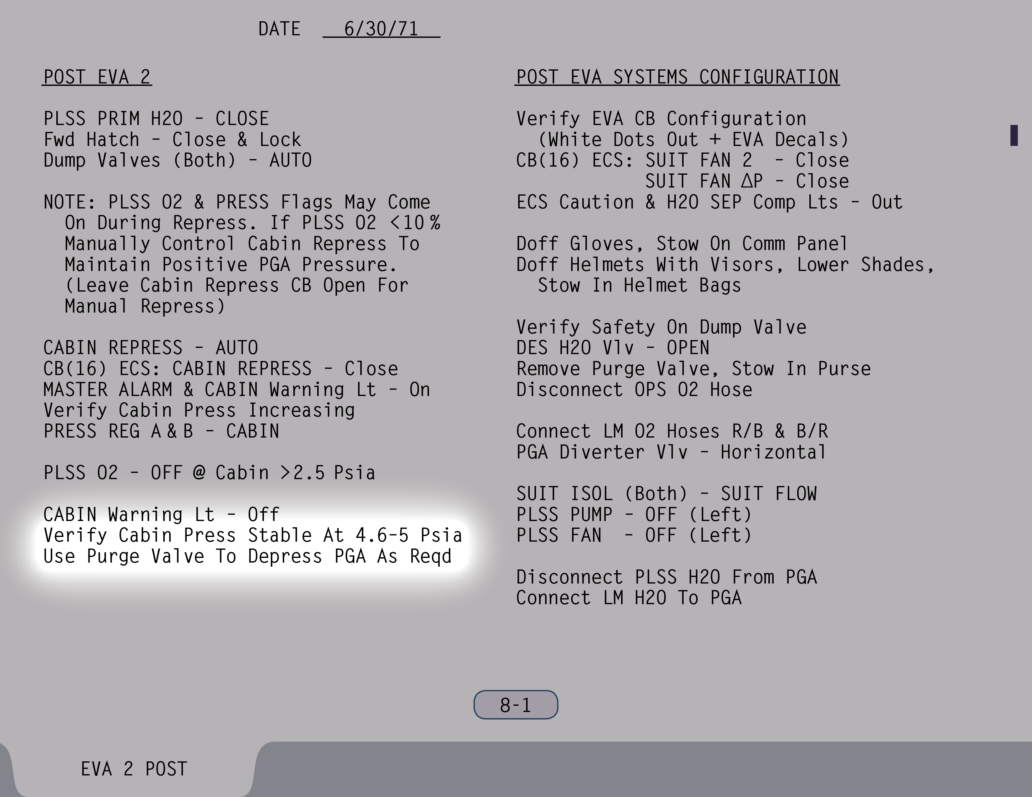 Damit ist Seite SUR 8-1 der Checkliste für den Aufenthalt auf der Mondoberfläche bei Apollo 15 (Apollo 15 LM Lunar Surface Checklist) abgearbeitet.