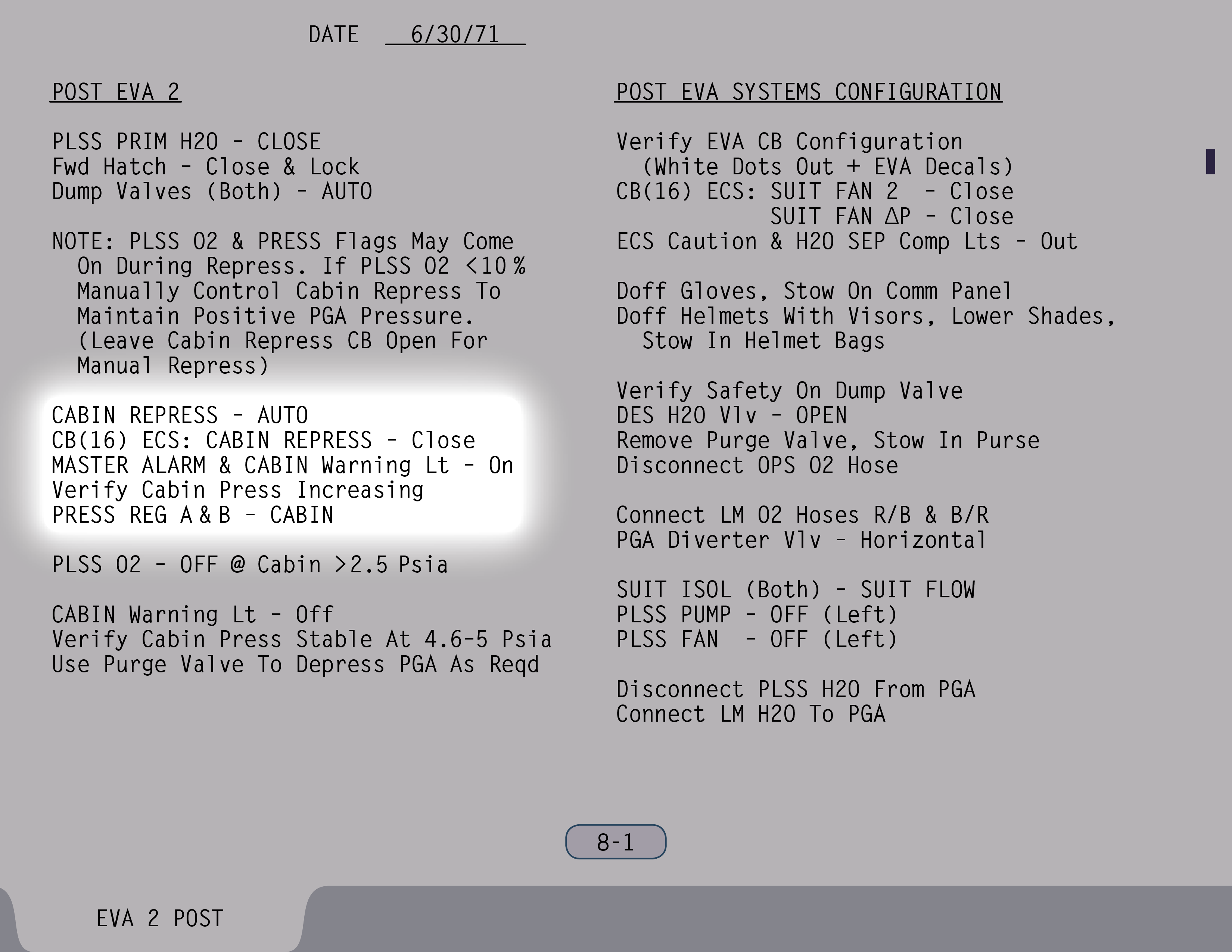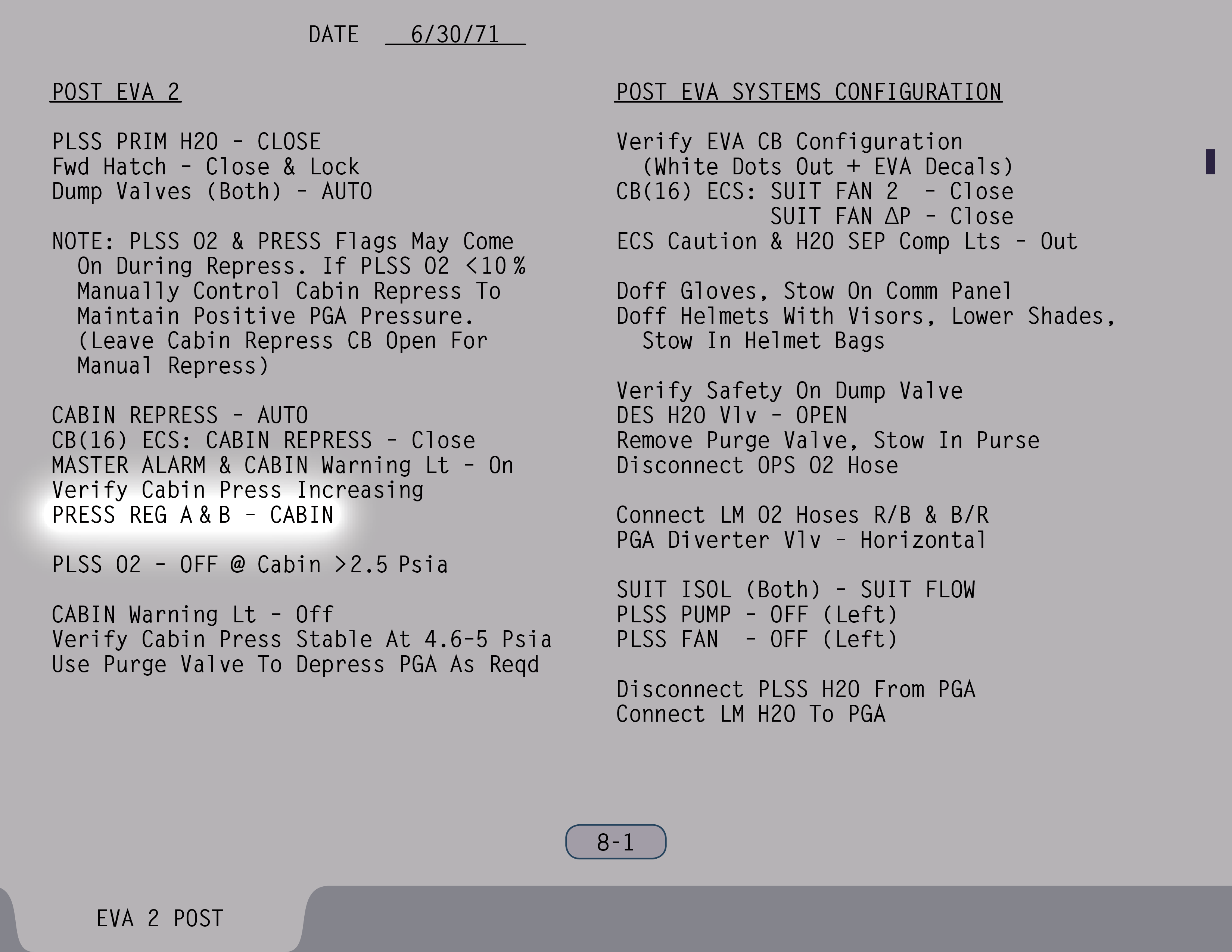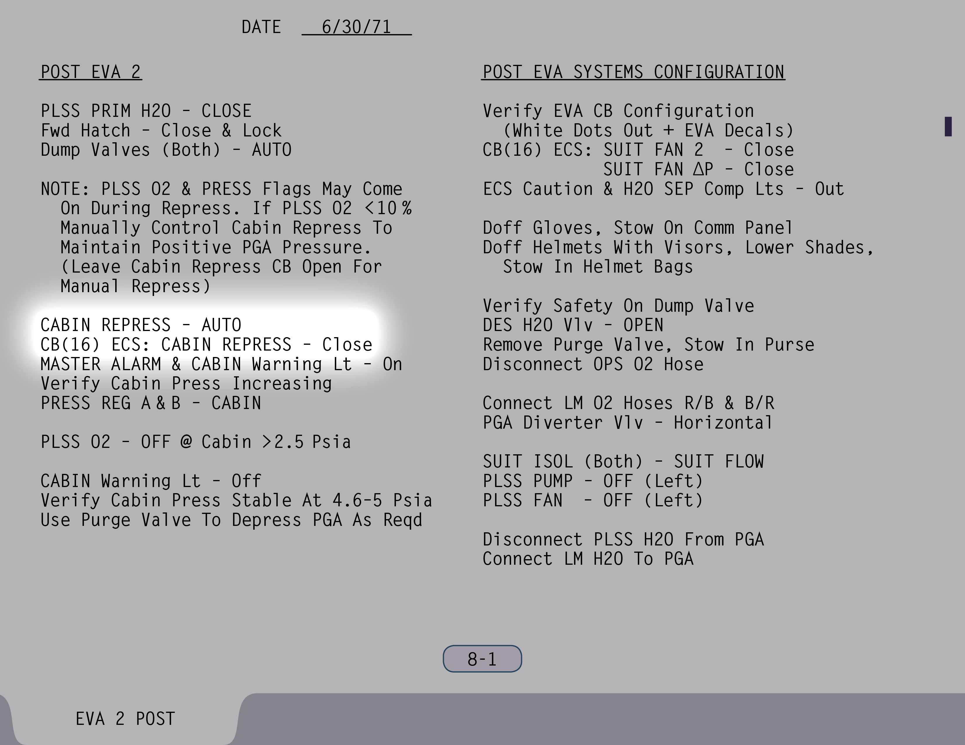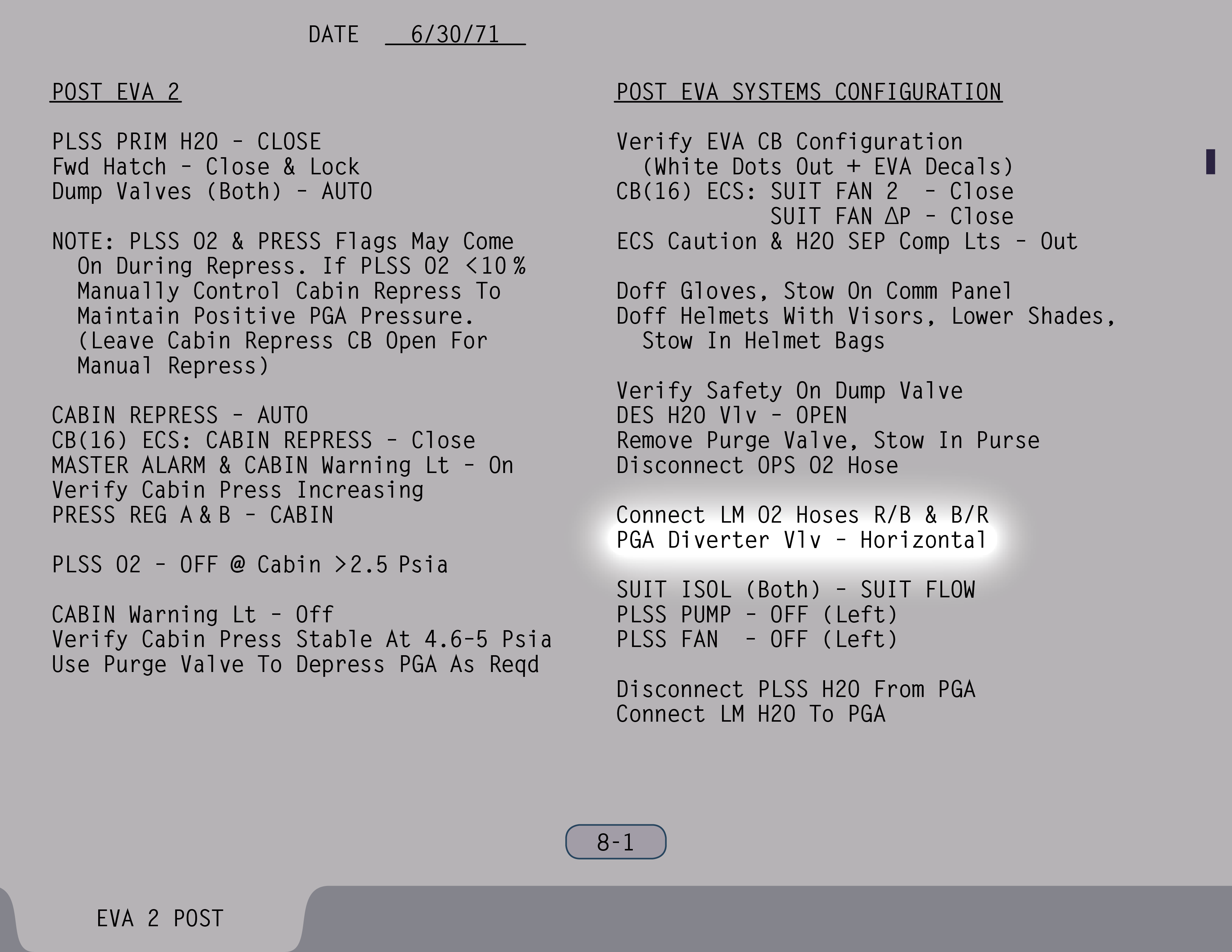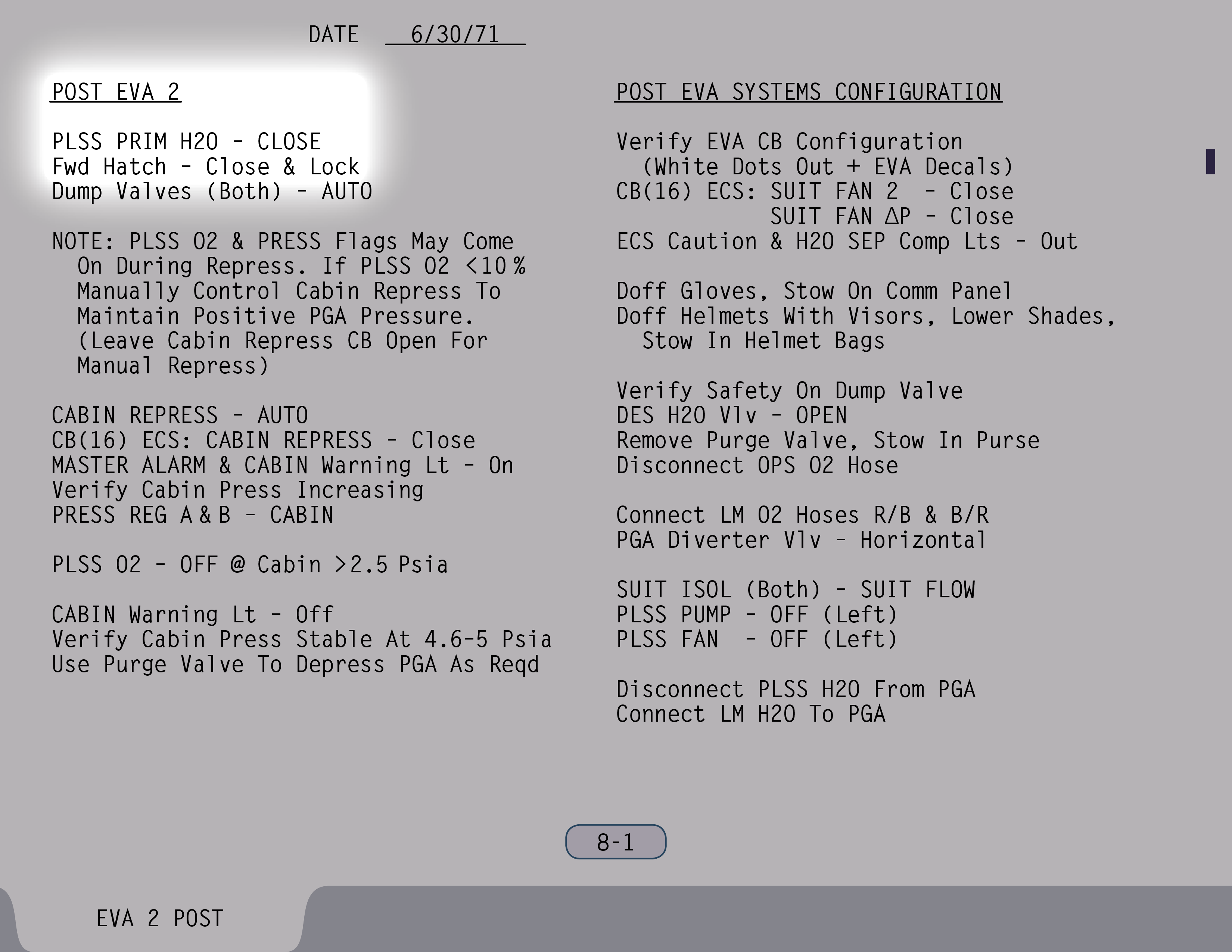 Damit ist Seite SUR 8-1 der Checkliste für den Aufenthalt auf der Mondoberfläche bei Apollo 15 (Apollo 15 LM Lunar Surface Checklist) abgearbeitet.