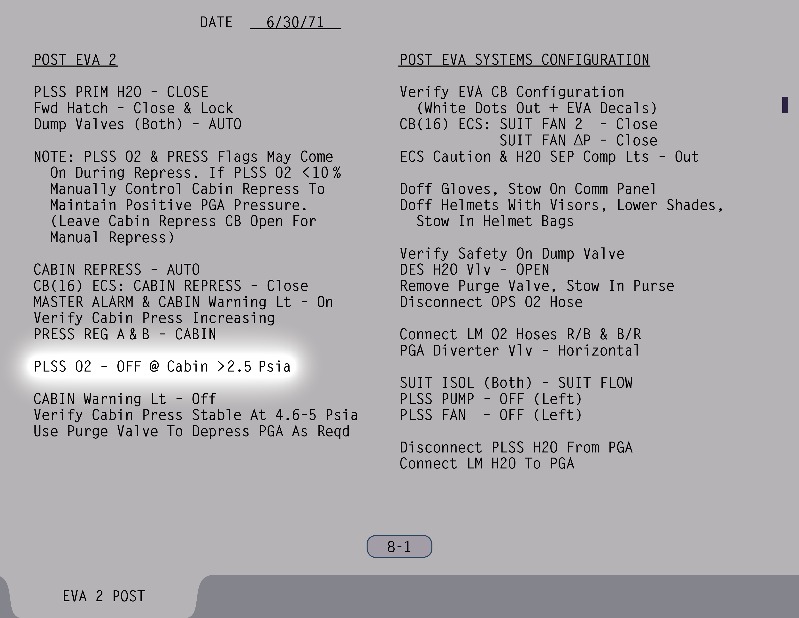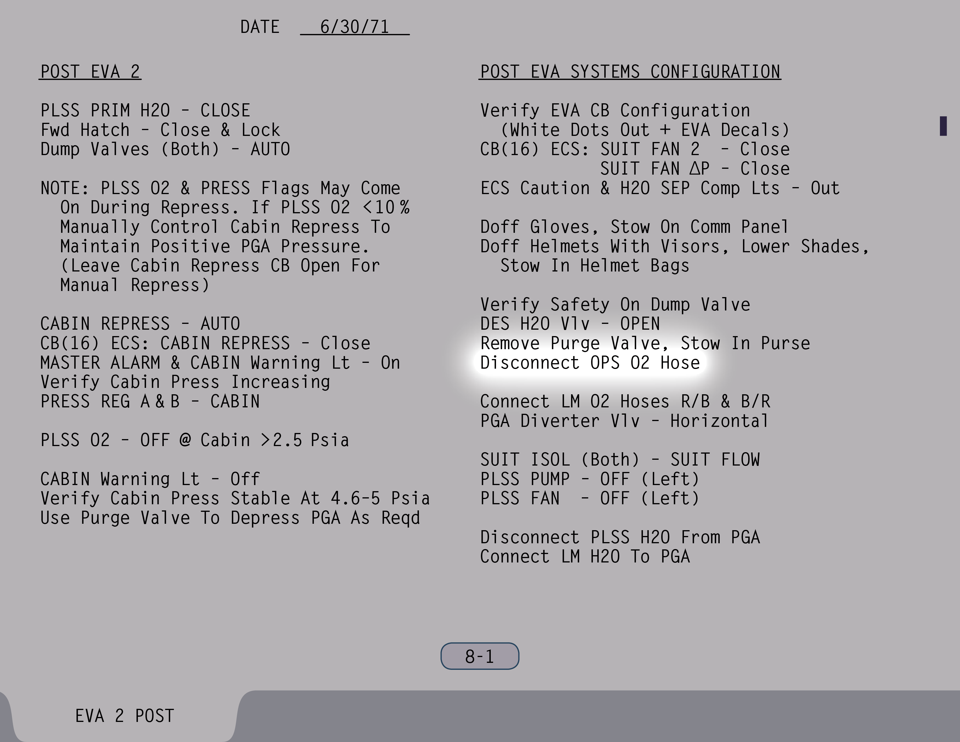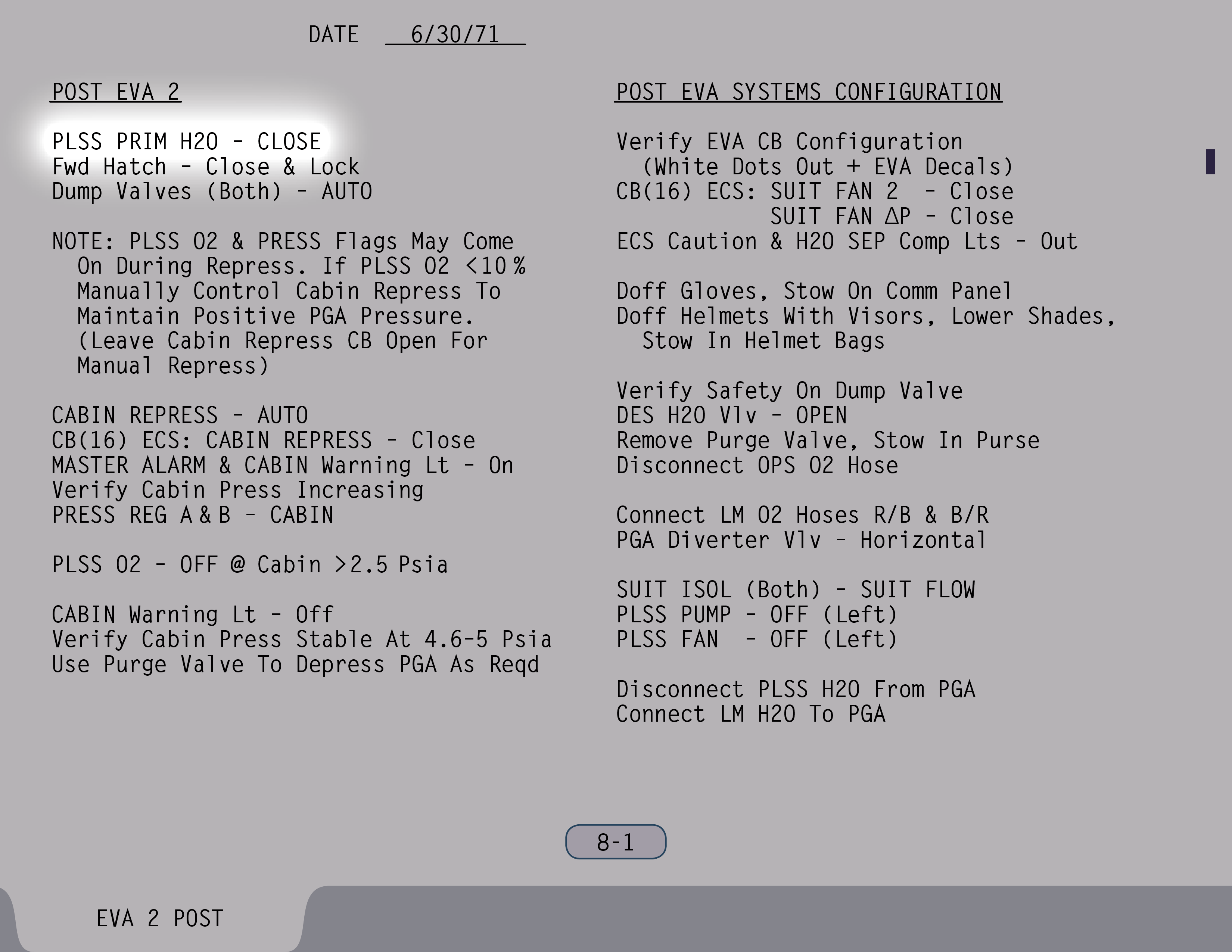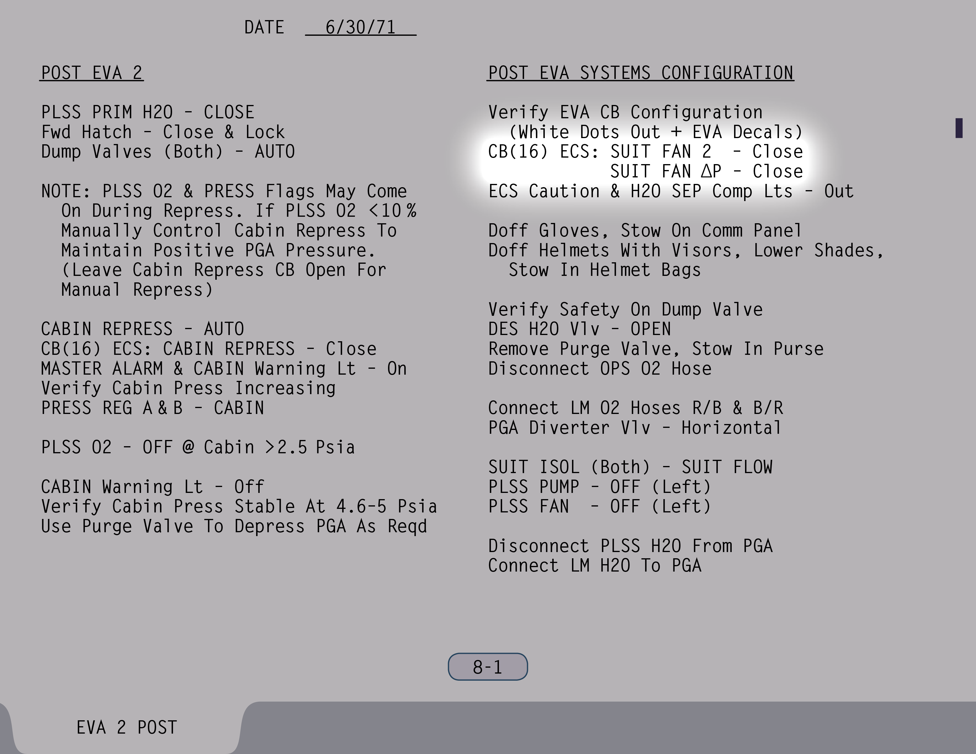 Damit ist Seite SUR 8-1 der Checkliste für den Aufenthalt auf der Mondoberfläche bei Apollo 15 (Apollo 15 LM Lunar Surface Checklist) abgearbeitet.
