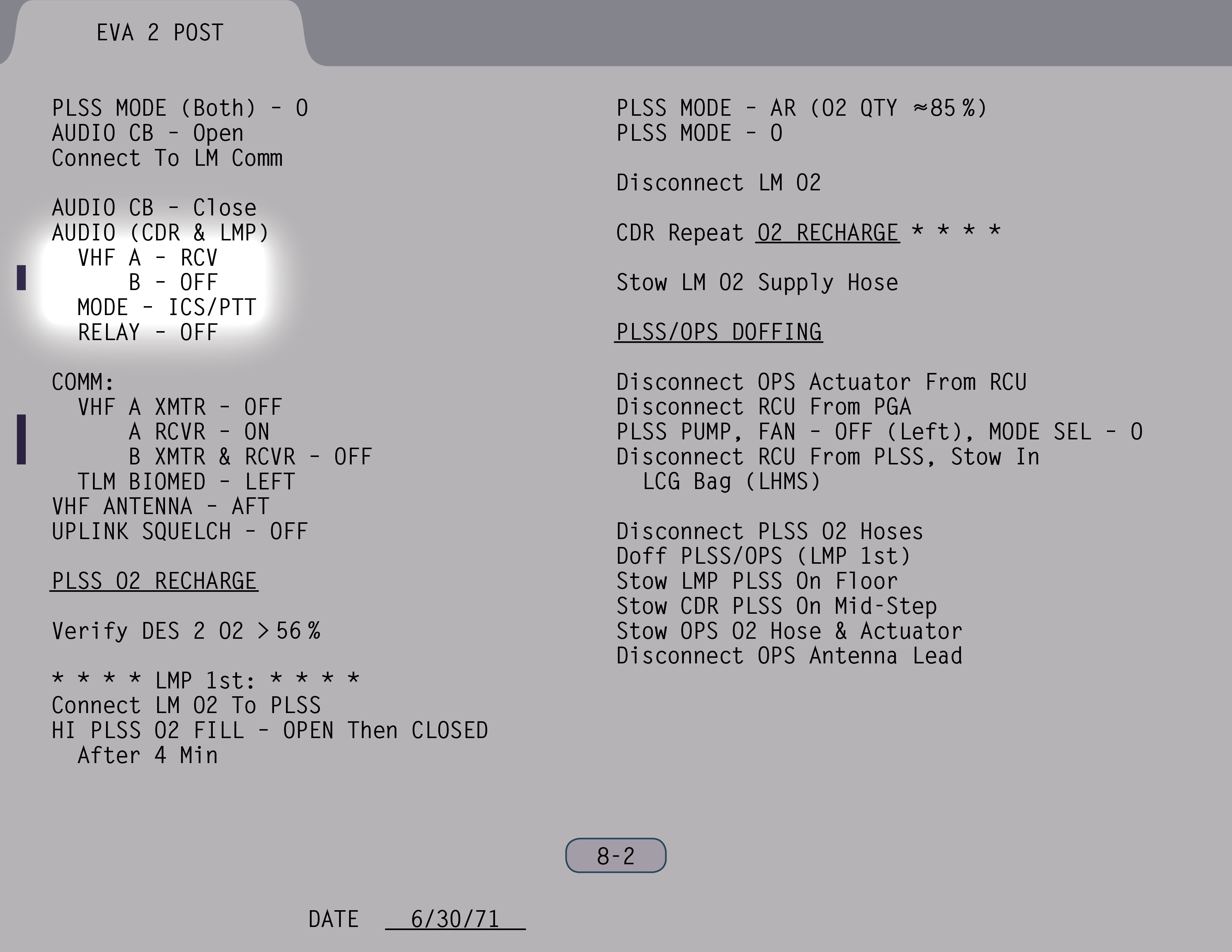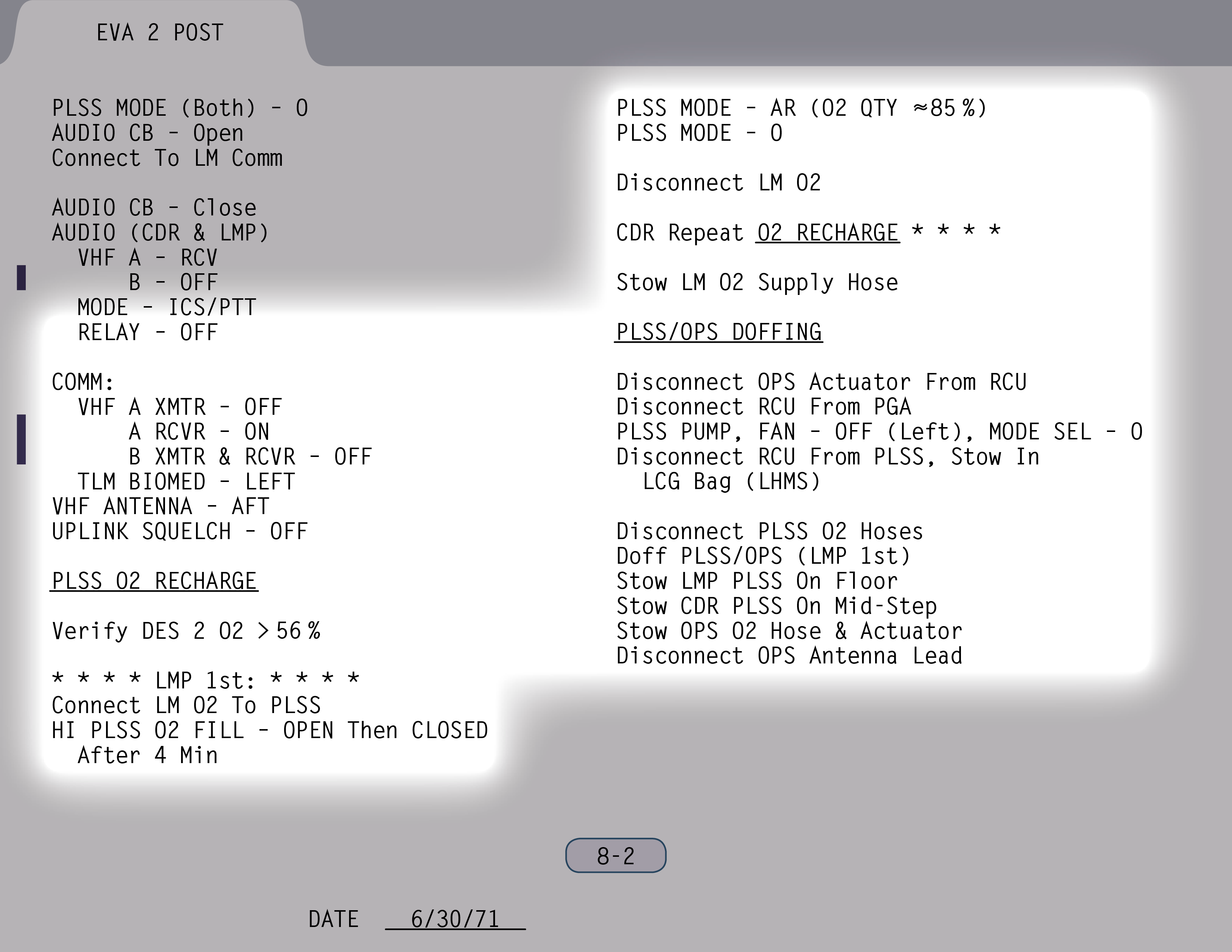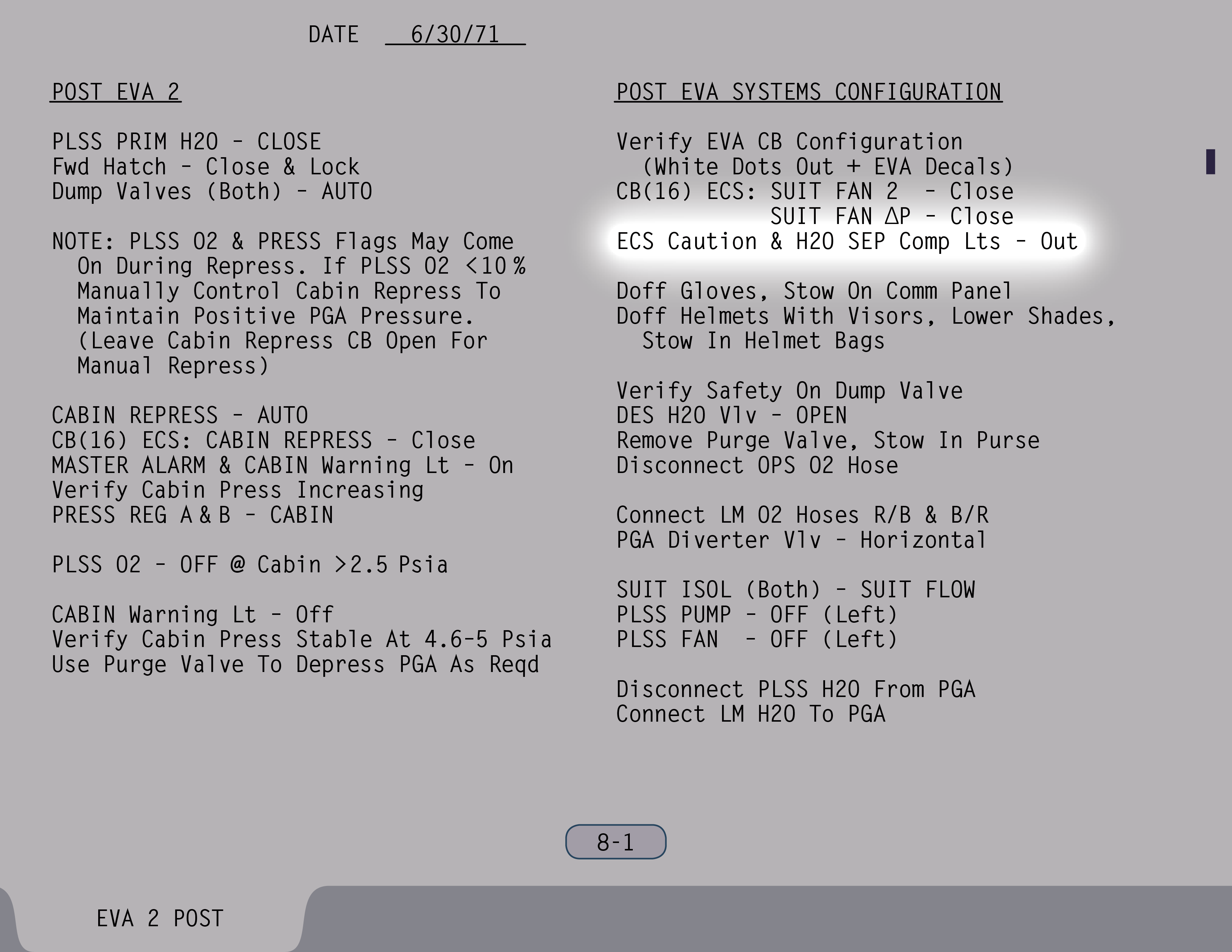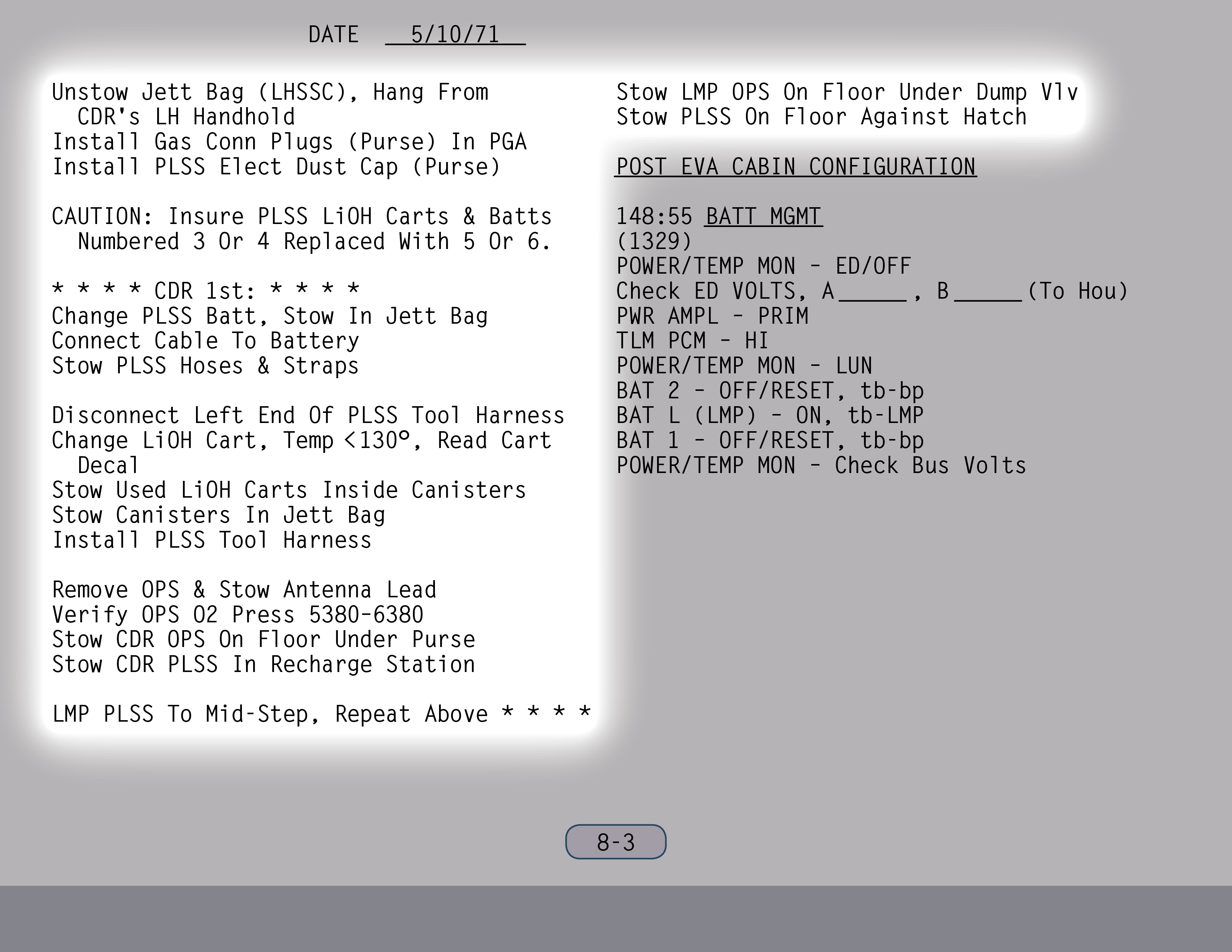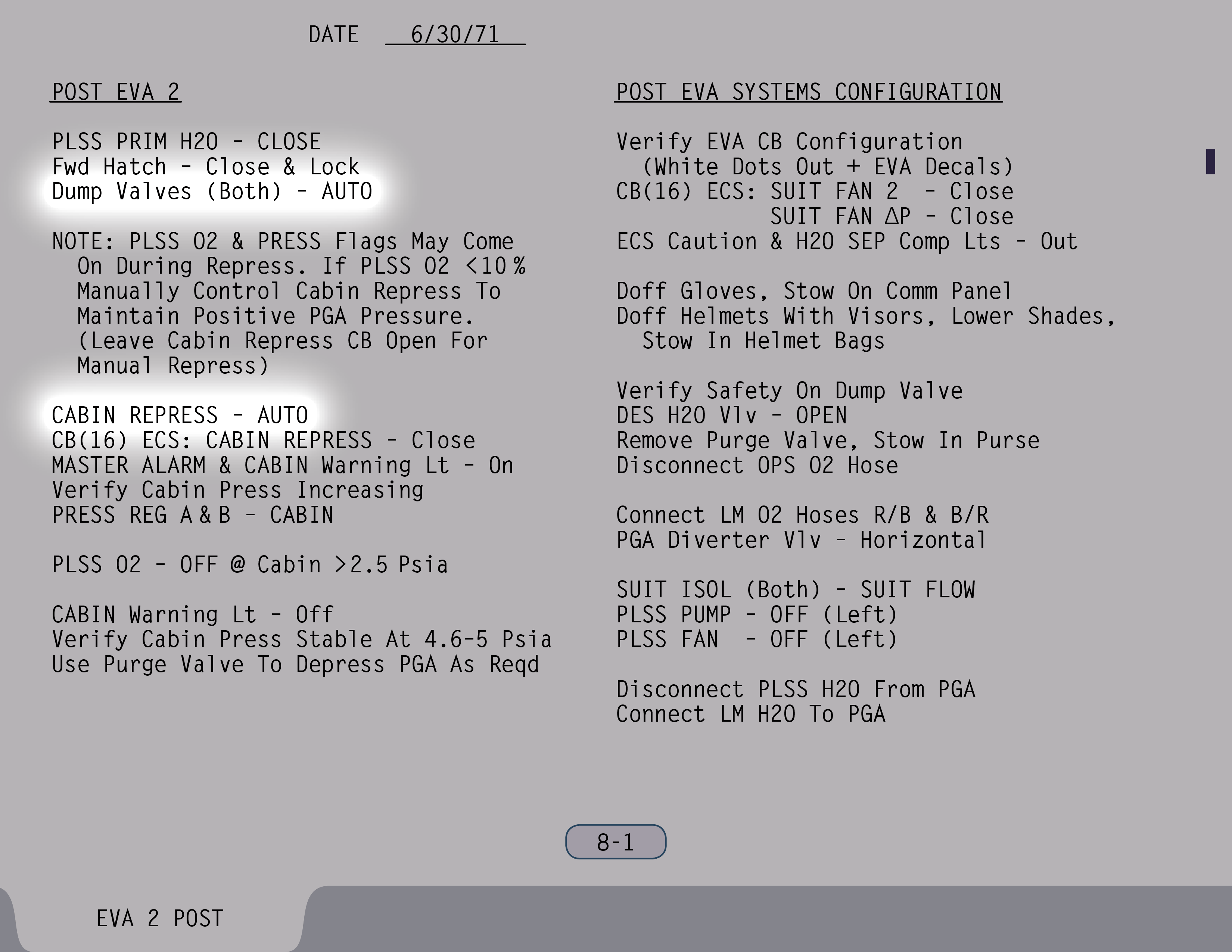 Damit ist Seite SUR 8-1 der Checkliste für den Aufenthalt auf der Mondoberfläche bei Apollo 15 (Apollo 15 LM Lunar Surface Checklist) abgearbeitet.