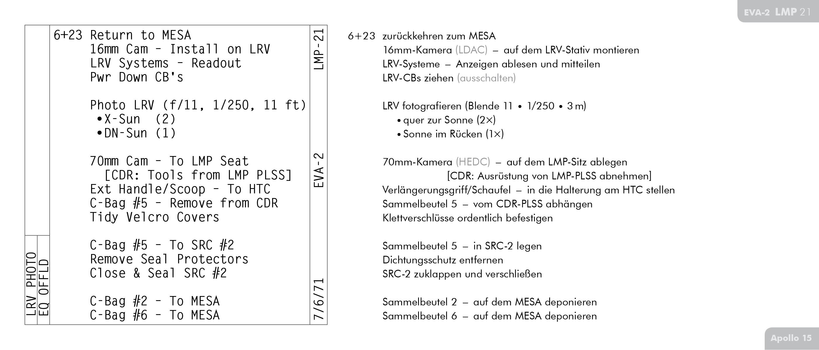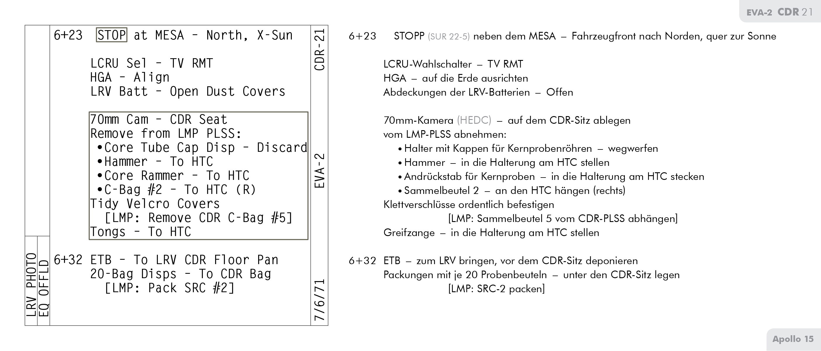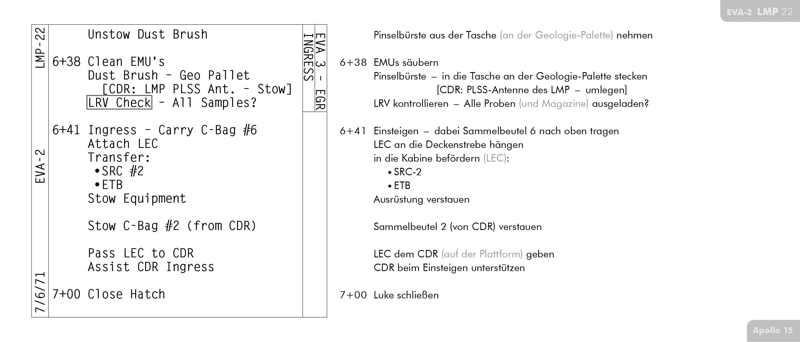 Hier offenbart sich eine wenig durchdachte Vorgehensweise in Houston. Es wäre bei Weitem klüger gewesen, hätte man während der Rückfahrt zur Landefähre einige Minuten verwendet, um die Aufgabenstellung für den Rest der EVA