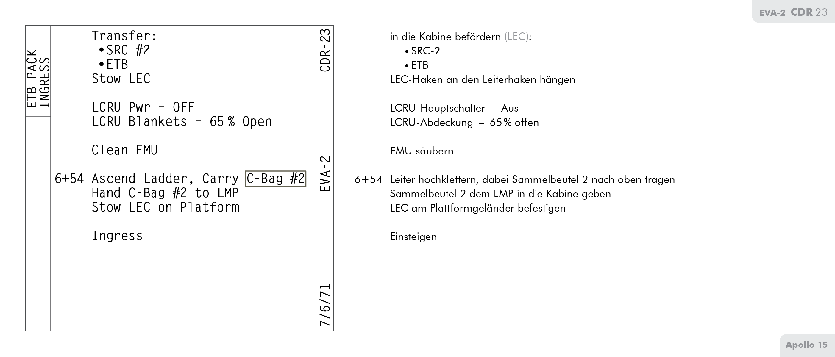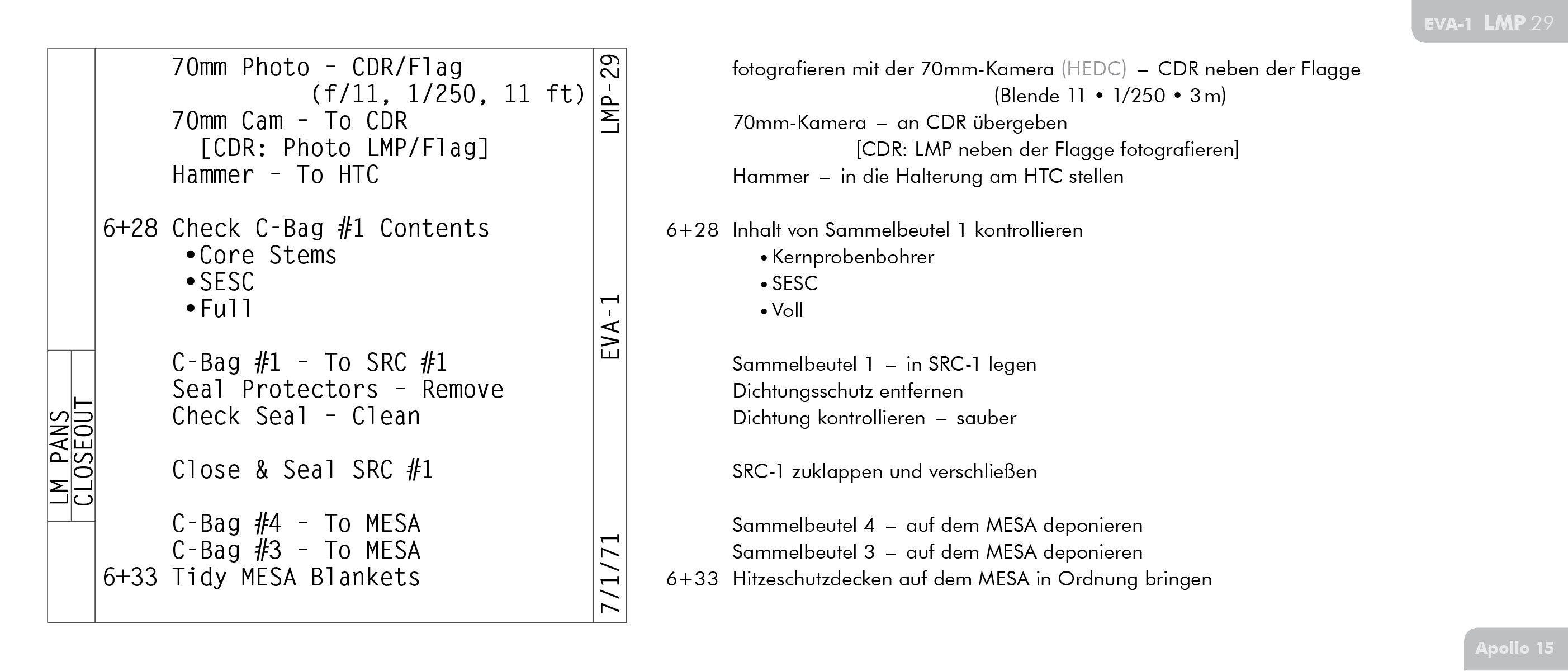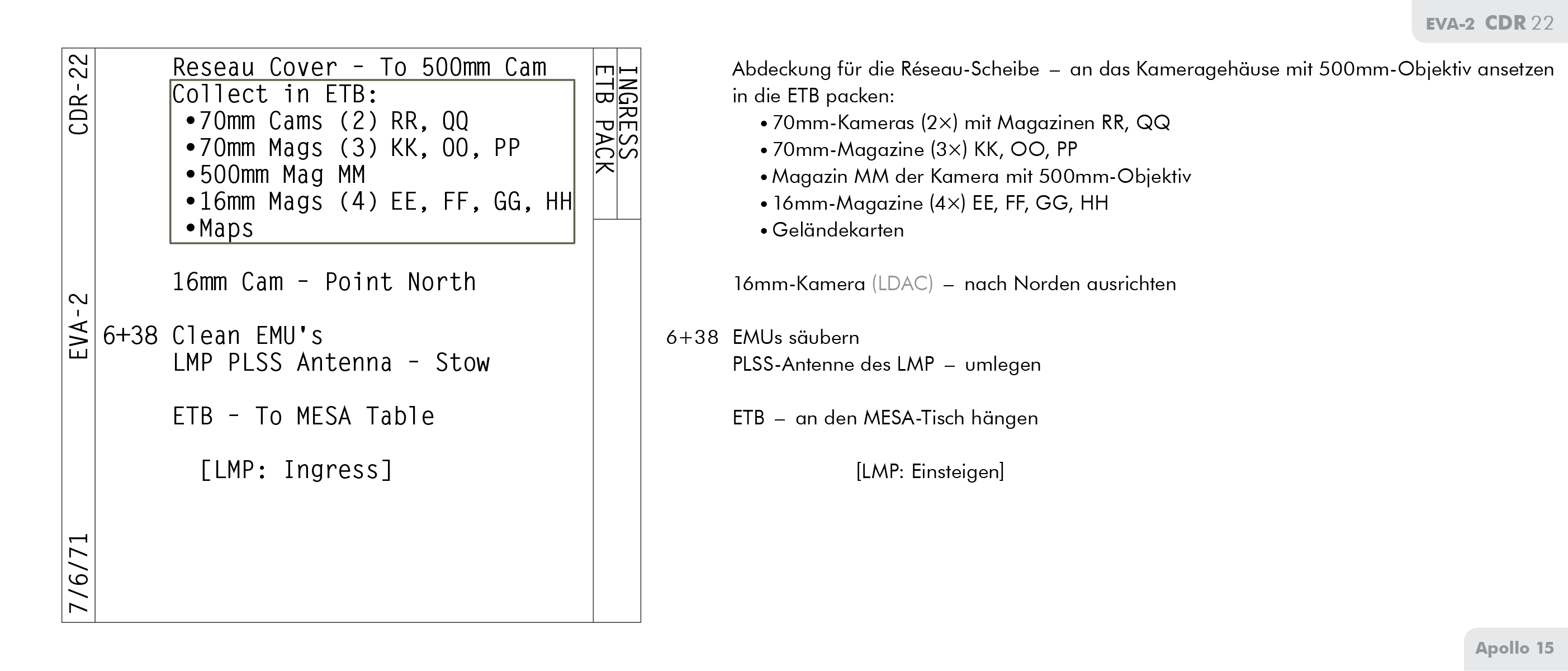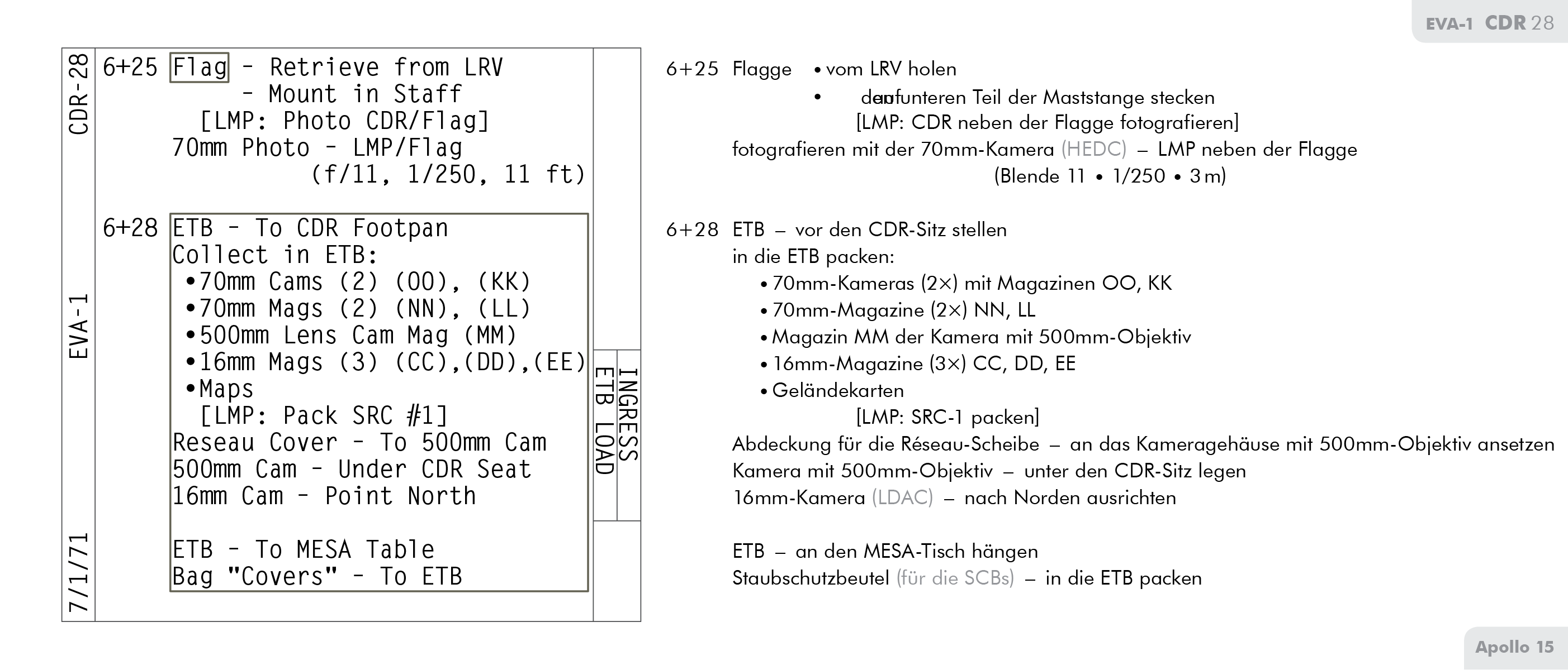 Hier offenbart sich eine wenig durchdachte Vorgehensweise in Houston. Es wäre bei Weitem klüger gewesen, hätte man während der Rückfahrt zur Landefähre einige Minuten verwendet, um die Aufgabenstellung für den Rest der EVA