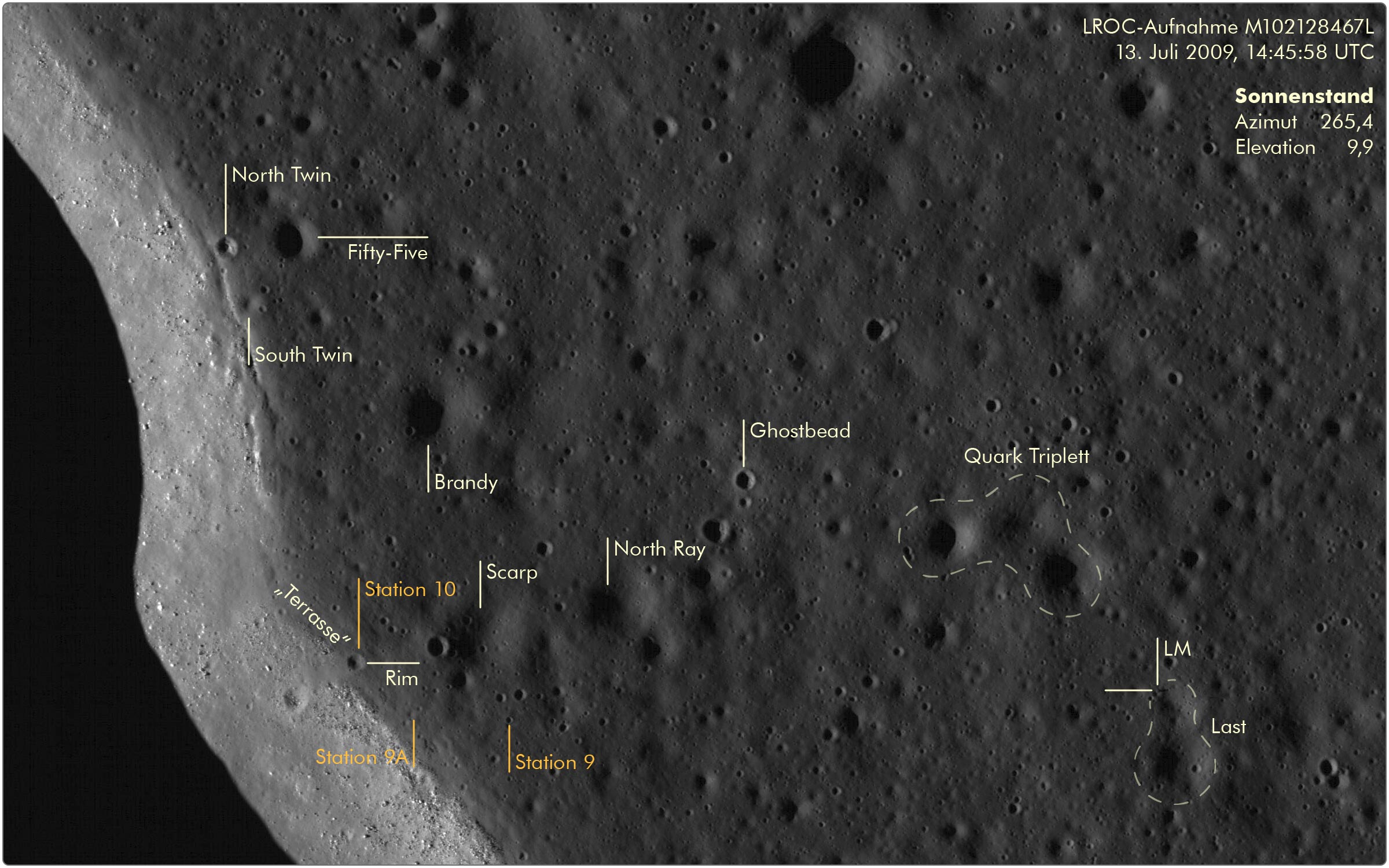 Wie die LROC‑Aufnahme M111571816R zeigt, liegen die Krater North Twin und South Twin etwas über 1 Kilometer von Station 9A entfernt bei Peilung 337. Bis zu Krater Rim, wo Dave und Jim für Station 10 anhalten werden, sind es dagegen nur rund 220 Meter bei Peilung 313.