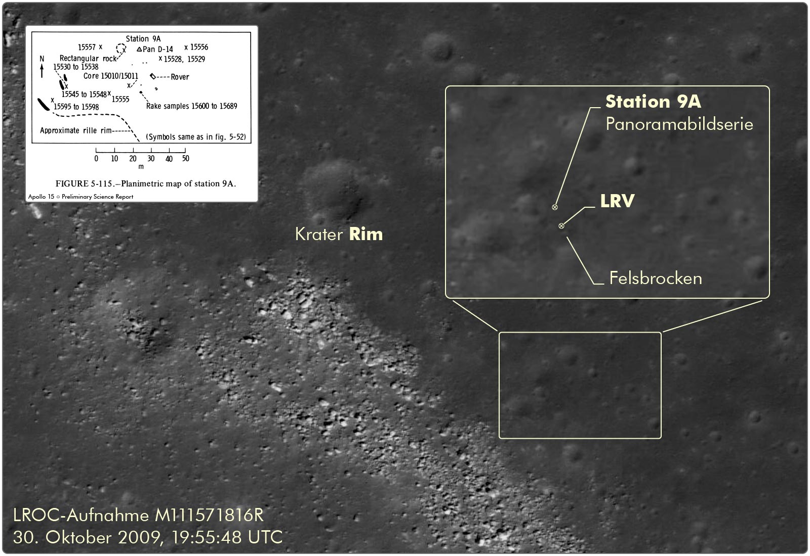 LRVLunar Roving Vehicle stand und wo Jim die Panoramaserie fotografierte. Dave parkte das Fahrzeug neben einem Felsbrocken, zu sehen auf AS15-82-11121 und AS15-82-11129. Vermutlich ist es der Brocken, den man auch auf der LROC‑Aufnahme erkennt.
