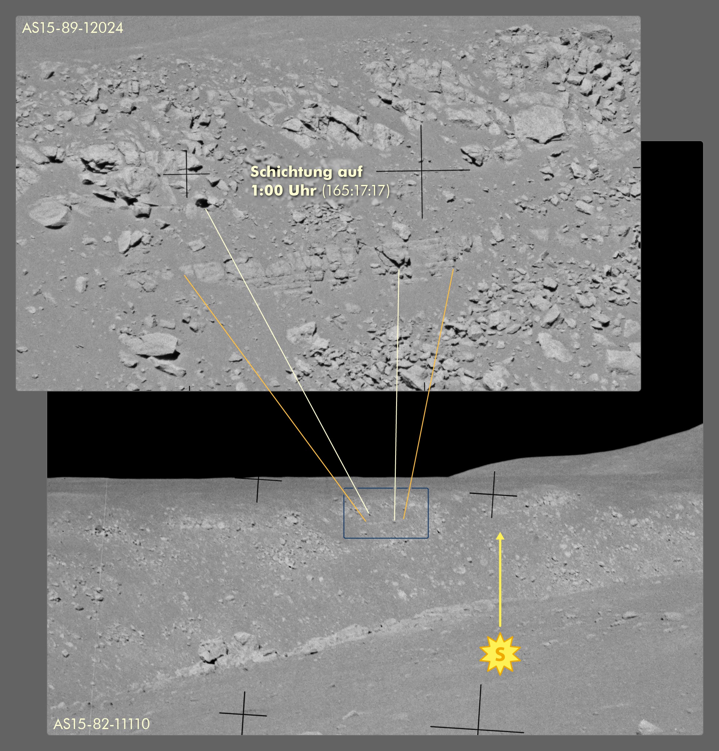 Dave fährt Richtung 267, das heißt mehr oder weniger nach Westen. Ihre 1:00-Uhr-Position liegt demnach etwa bei Peilung 300. Gegenwärtig ist es am . Die Sonne steht 39 Grad über dem Horizont bei Azimut 113 und scheint folglich in Richtung 293. Auf AS15-82-11110 aus der Panoramaserie bei Station 9A ist ziemlich genau einen halben Réseaukreuzabstand südlich der Richtung des Sonnenscheins ein horizontaler Aufschluss zu sehen, also bei Peilung 288. AS15-89-12024 zeigt den Bereich näher und man erkennt deutlich die Schichtung. Dieses Bild entstand, als Dave bei Station 9A die erste horizontale Reihe Teleaufnahmen vom Westhang der Rille fotografierte (beide Fotos im Vergleich). Wenn Dave und Jim direkt nach Westen fuhren, als Jim die Schichtung entdeckte, befand sie sich eher auf ihrer 12:30-Uhr-Position (Peilung 285). Da es in dem Bereich aber keine andere Stelle mit einer so markanten Schichtung gibt, kann man wohl davon ausgehen, dass Jim diesen Aufschluss gemeint hat.