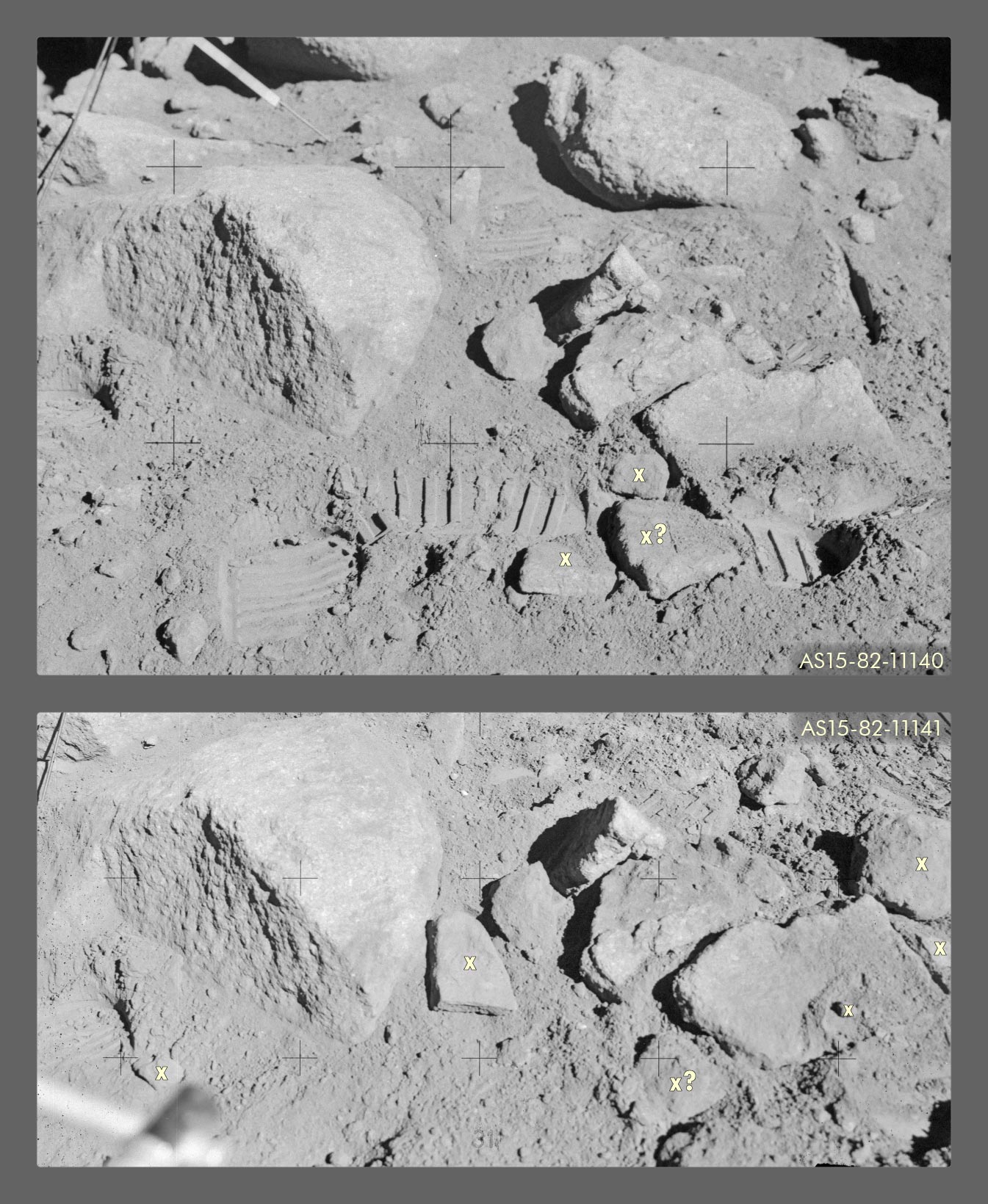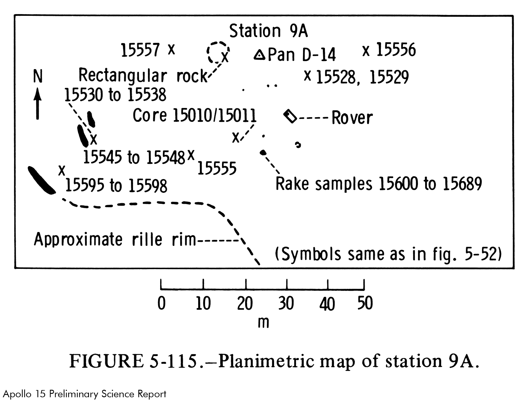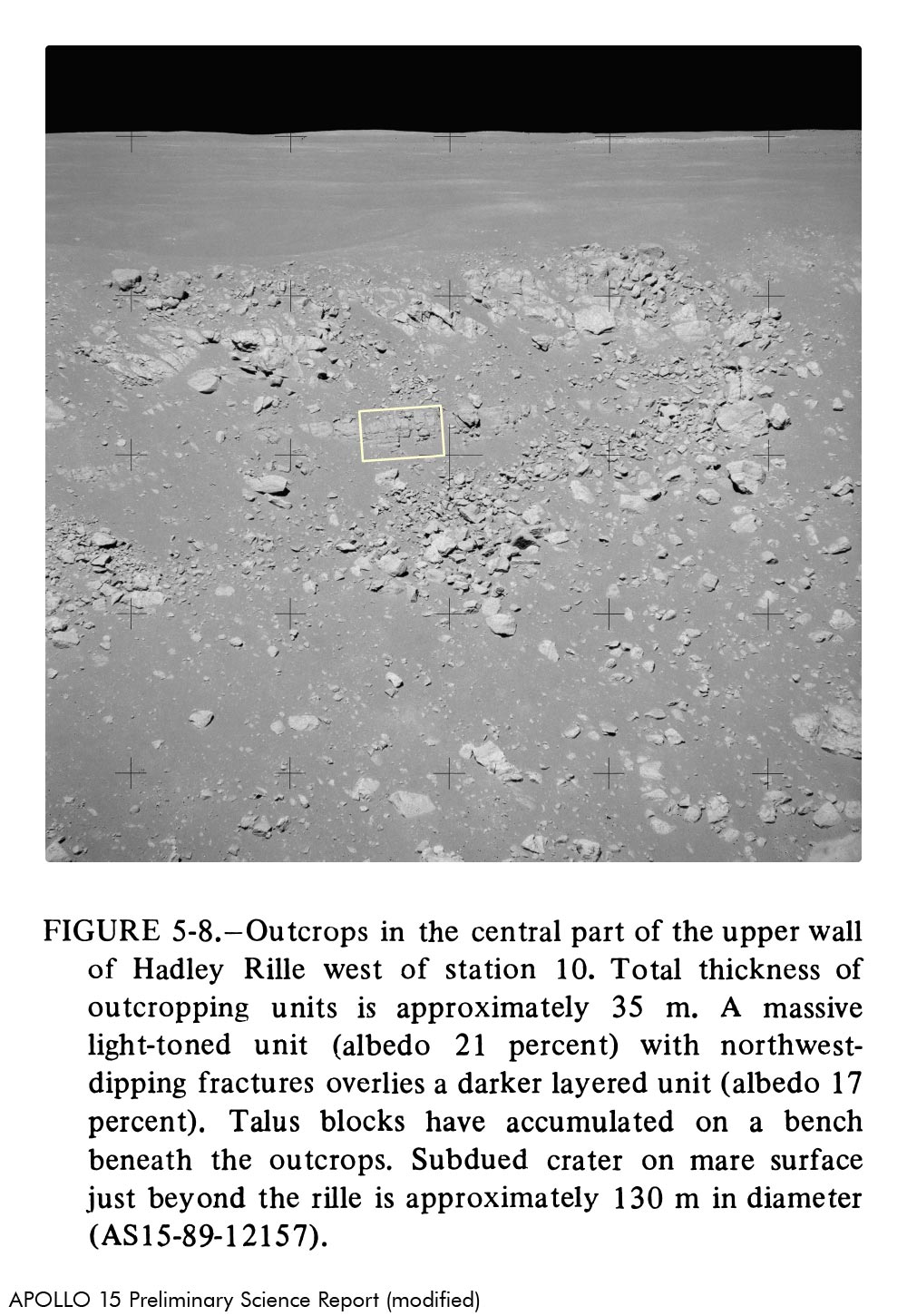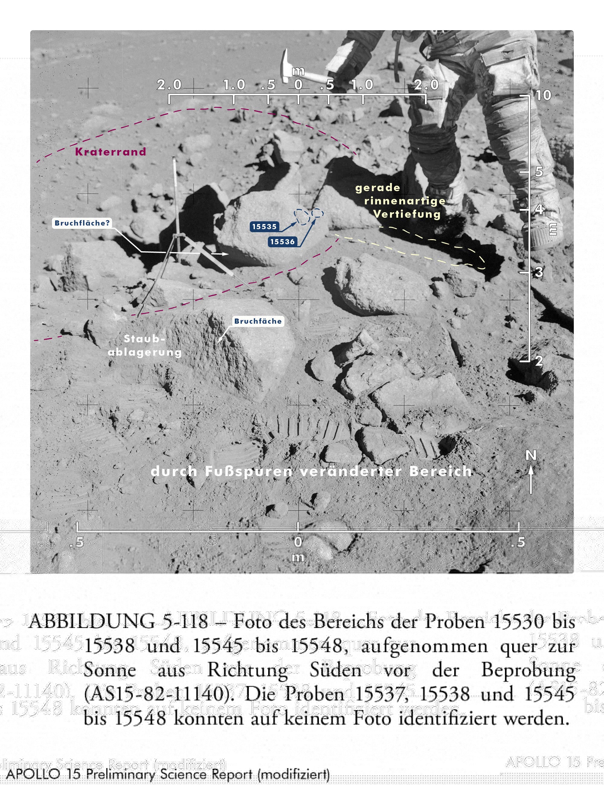 Laut Index der 70‑mm‑Aufnahmen bei Apollo 15 (Apollo 15 Index of 70 mm Photographs) wurde AS15-82-11164 bei Station 10 fotografiert. Bailey und Ulrich (Apollo 15 Voice Transcript Pertaining to Geology) denken jedoch, dass die Aufnahme hier bei Station 9A entstand. Ich bin ebenfalls dieser Meinung.