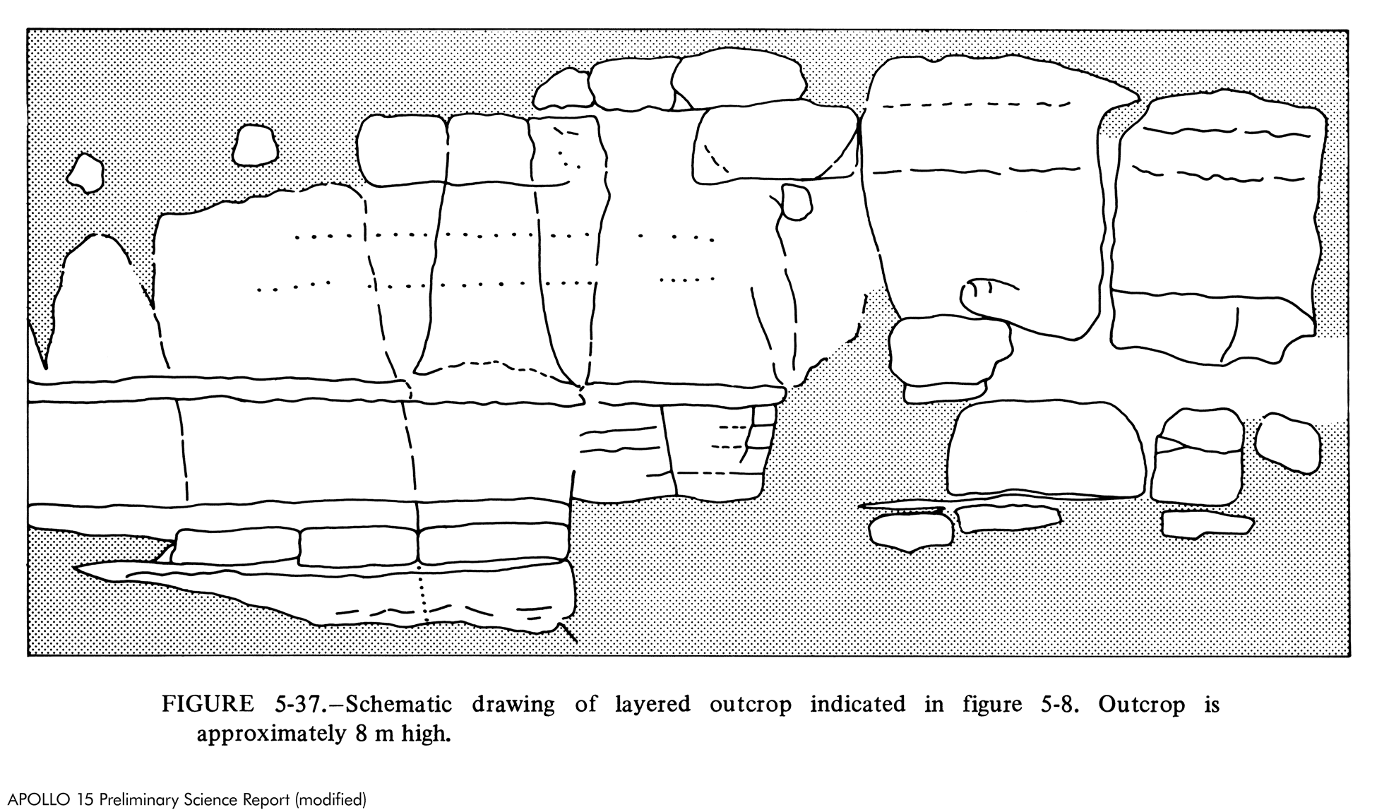Jim will damit sagen, dass diese Brocken freiliegende Bruchstücke des ursprünglichen Grundgesteins sind und nicht infolge von Einschlägen dorthin verfrachtet wurden. Je näher am Rand vor allem die unzähligen kleineren Einschläge stattfinden, umso mehr Auswurfmaterial wird über die Kante geschleudert und fällt in die Rille. Der Effekt ist, dass die Regolithschicht zum Rand hin dünner wird. Dadurch bleiben mehr Aufschlüsse sichtbar und ebenso liegen mehr Gesteinsbrocken auf der Oberfläche, weil sie langsamer vom Regolith begraben werden. Abbildung 5-30 im Vorläufigen wissenschaftlichen Bericht zu Apollo 15 (Apollo 15 Preliminary Science Report) illustriert das Prinzip. Interessant in dem Zusammenhang ist AS15-82-11147, entstanden bei Station 9A, das den Osthang der Hadley‑Rille in Richtung Süden zeigt.