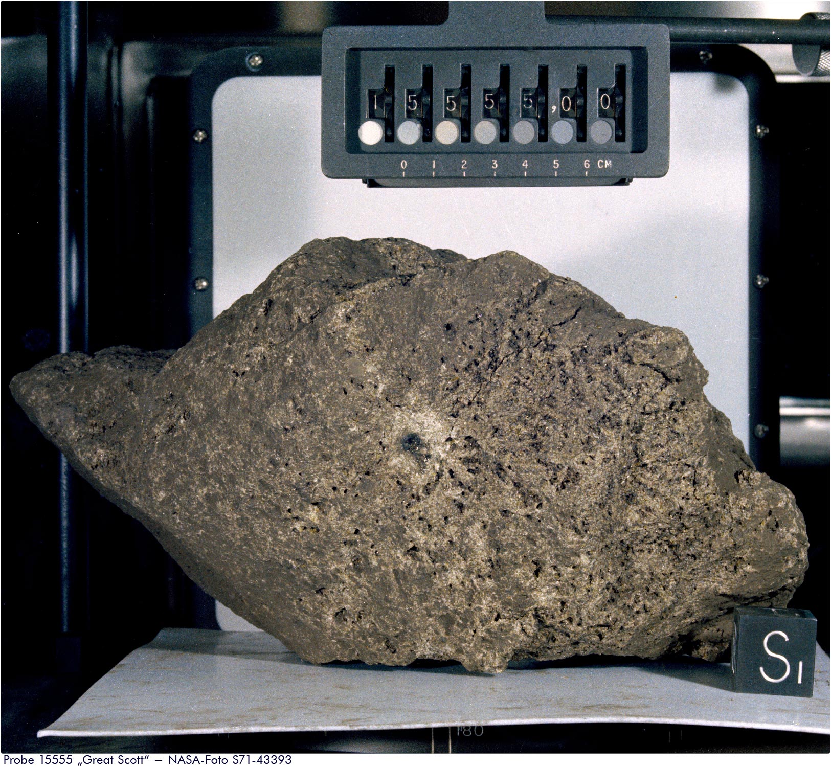Die genauen Abmessungen von Great Scott (Probe 15555) konnte ich nicht herausfinden. Doch mithilfe der Skala auf S71-43393 lassen sich für die Länge rund 26 Zentimeter und für die Höhe 13,8 Zentimeter ermitteln. Weil von einem blasigen Gesteinsbrocken die Rede ist, darf man eine Dichte im unteren Bereich der für Mare‑Basalt typischen Werte annehmen. Ich rechne mit 3,3 g/cm3. Bleiben die zwei spitzen Enden unberücksichtigt, ergeben sich als charakteristische Maße 19 cm Länge und 12,5 cm Höhe. Zusammen mit dem Gewicht von 9600 g und der eben festgelegten Dichte lautet die Gleichung: