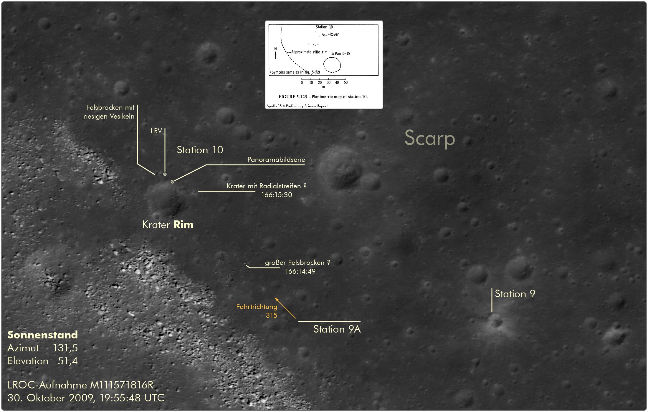 Abbildung 5-125 im Vorläufigen wissenschaftlichen Bericht zu Apollo 15 (Apollo 15 Preliminary Science Report) ist eine planimetrische Karte von Station 10. Krater Rim hat in Wirklichkeit einen Durchmesser von 45 Metern. Beim Einfügen in den Ausschnitt der LROC‑Aufnahme wurde die Karte so angepasst, dass 45 Meter auf der 50-m-Skala dem Durchmesser des Kraters auf der LROC