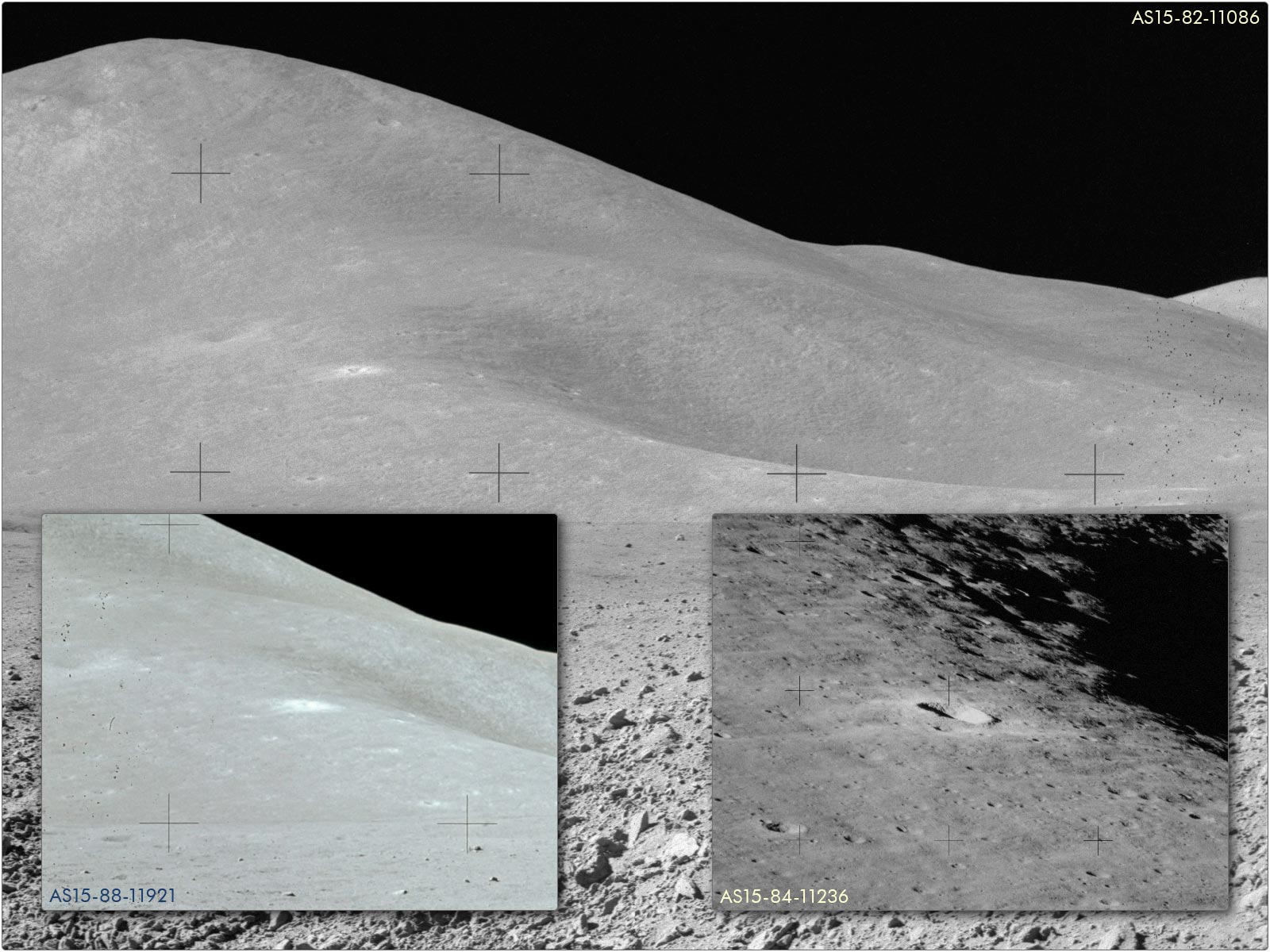 Drei nicht zusammenhängende Aufnahmen: AS15-89-12149, AS15-89-12150 und AS15-89-12151.