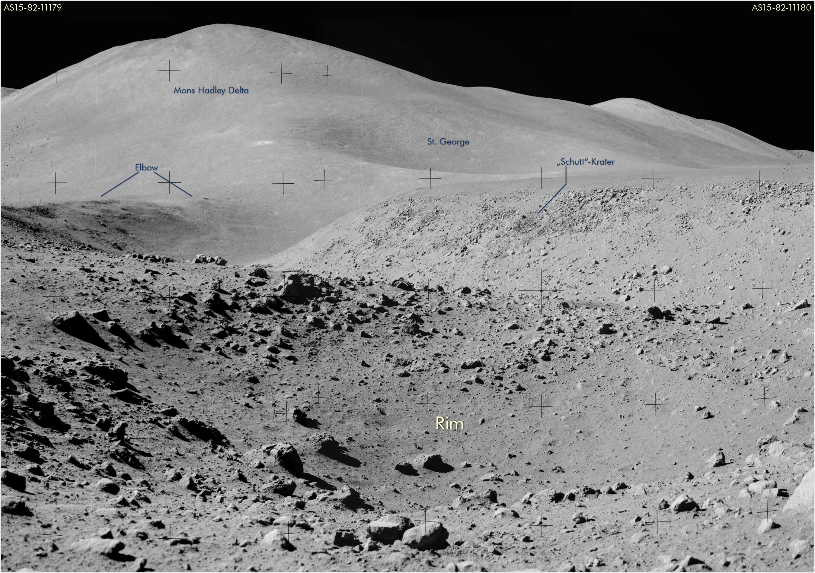 LROCLunar Reconnaissance Orbiter Camera-Aufnahme identifizieren lassen. Damit können bereits zwei Triangulationsachsen festgelegt werden. Als dritte Achse eignet sich die Sichtlinie zu einem mit Schutt gefüllten Krater weiter südlich am Westhang der Rille, zu sehen auf AS15-82-11180. Zwar birgt die Sichtlinie zum Schutt-Krater einen gewissen Unsicherheitsfaktor, kombiniert man jedoch die drei Achsen, wird Jims Position am Nordrand von Krater Rim bestätigt.