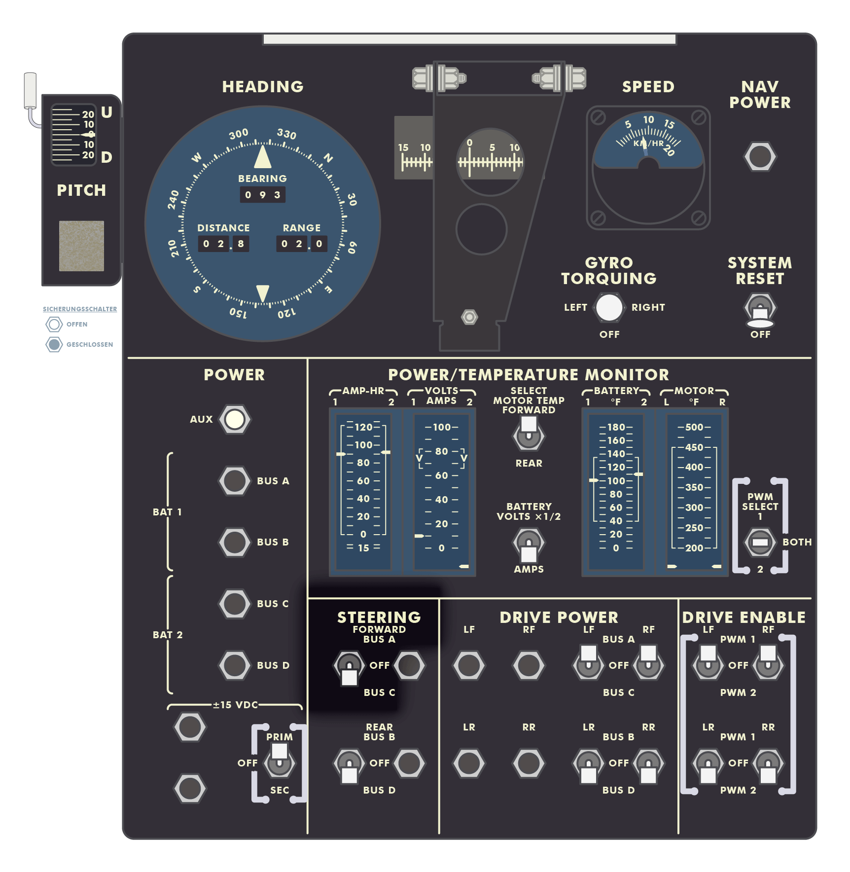 Irwin: Ja. Okay. Fahrzeugausrichtung: 3︱1︱0 · 0︱9︱3 · 0︱2︱8 · 0︱2︱0 · 9︱0 · 9︱2 … (Pause) Ah, 1︱0︱2 und 1︱1︱0.