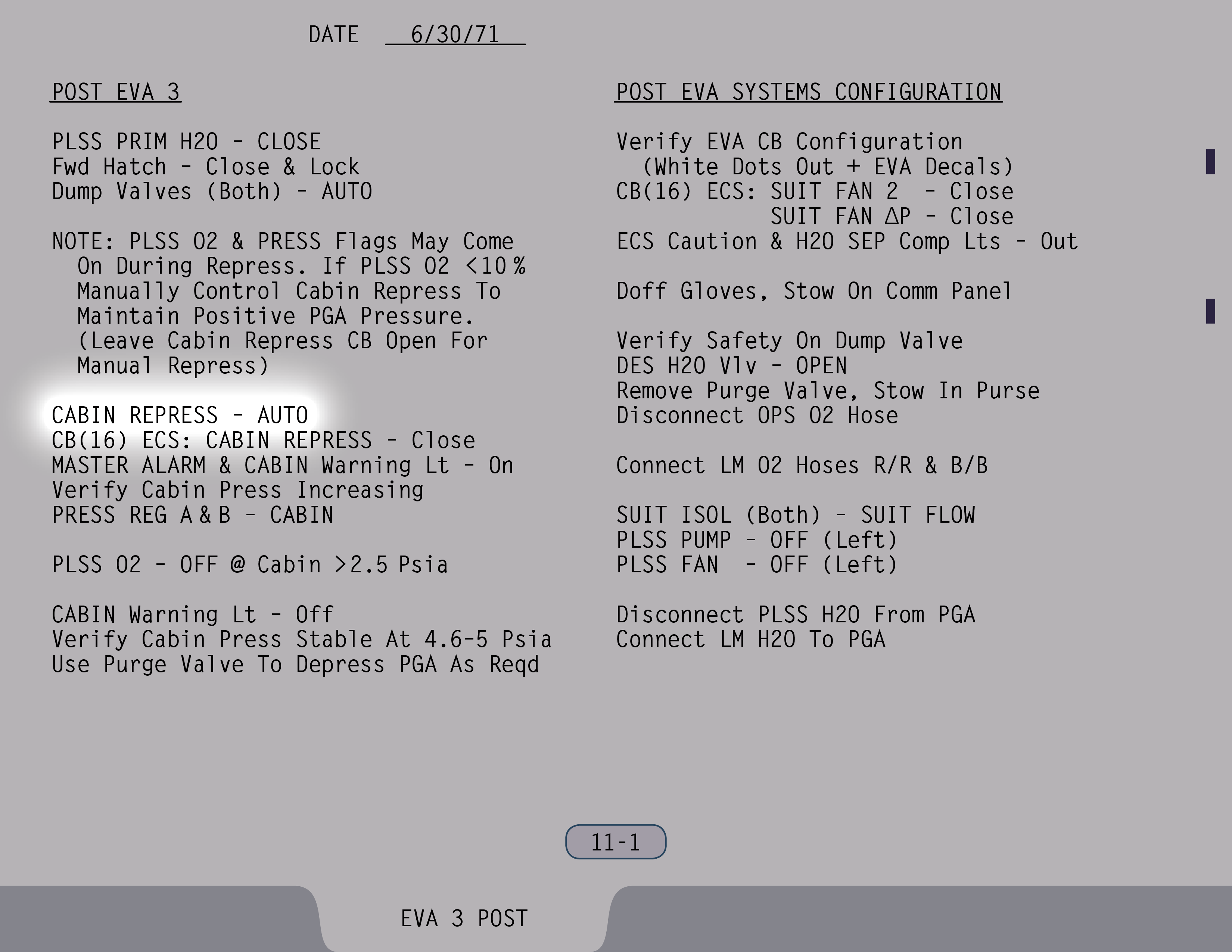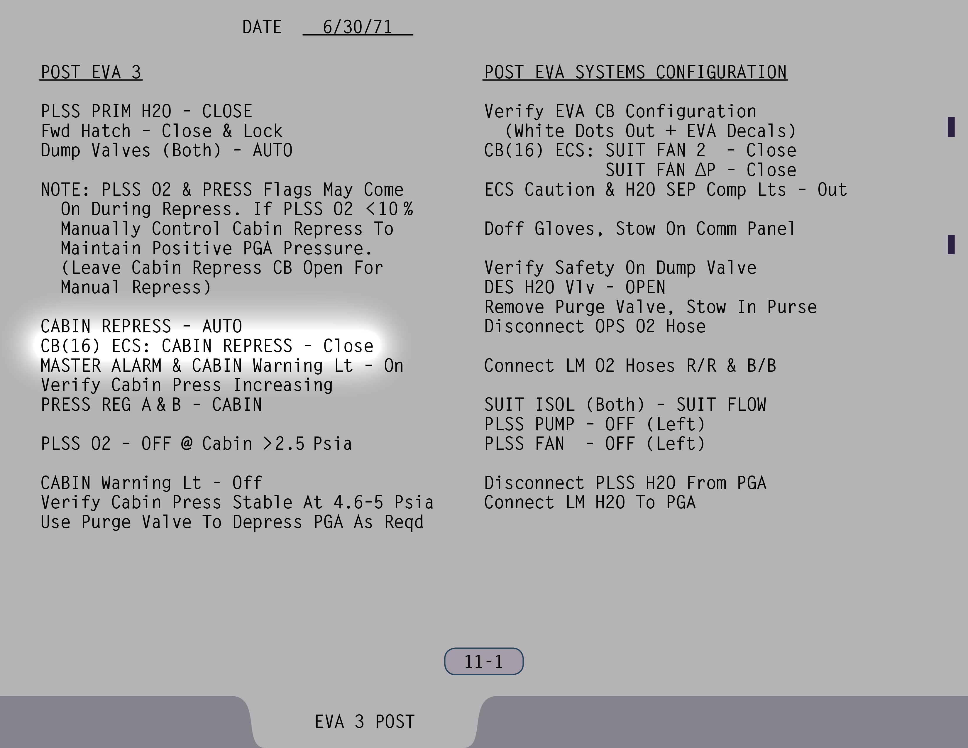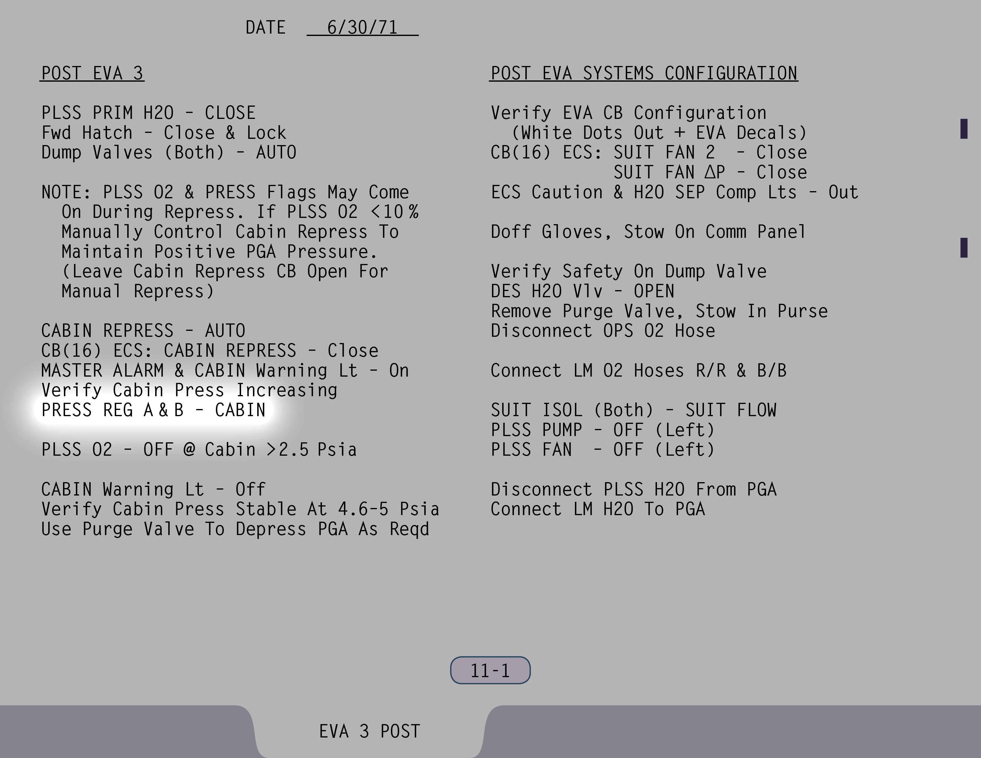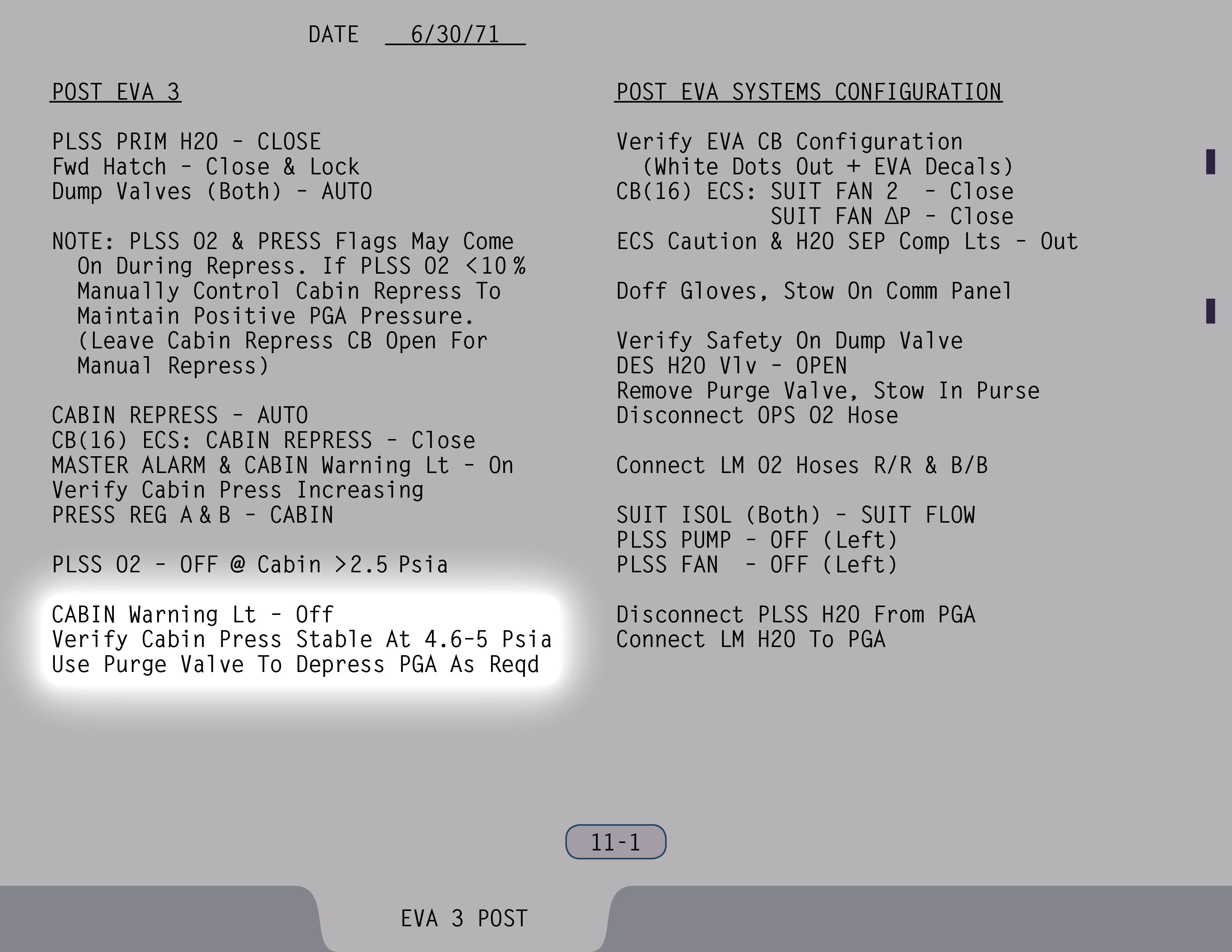Scott: Also, vielen Dank, Gerry. Wir ziehen unsererseits den Hut vor euch. Alle Achtung, ihr Burschen seid absolut auf Draht und wir sind sehr froh darüber. Denn eins dürfte jedem klar sein, ohne euch könnten wir unsere Aufgabe hier oben nicht erfüllen. (Pause) (zu Jim) Okay. Weiter im Text (SUR 11-1). Warnleuchte KABINE ist aus (Paneel 1). Kabinendruck ist stabil bei 4︱5 (4,5 psia/0,31 bar, Paneel 2). Für Druckausgleich (im PGA