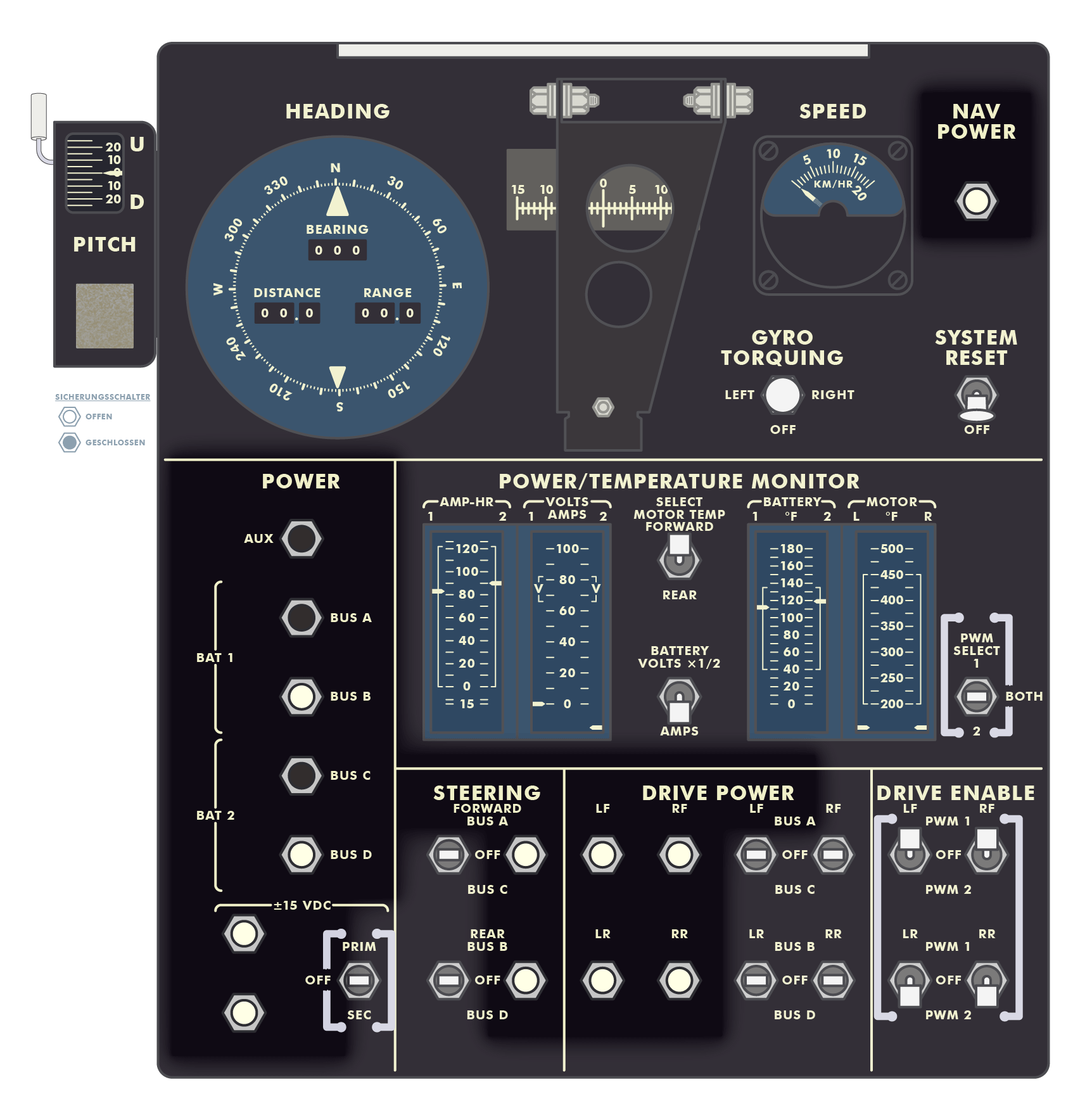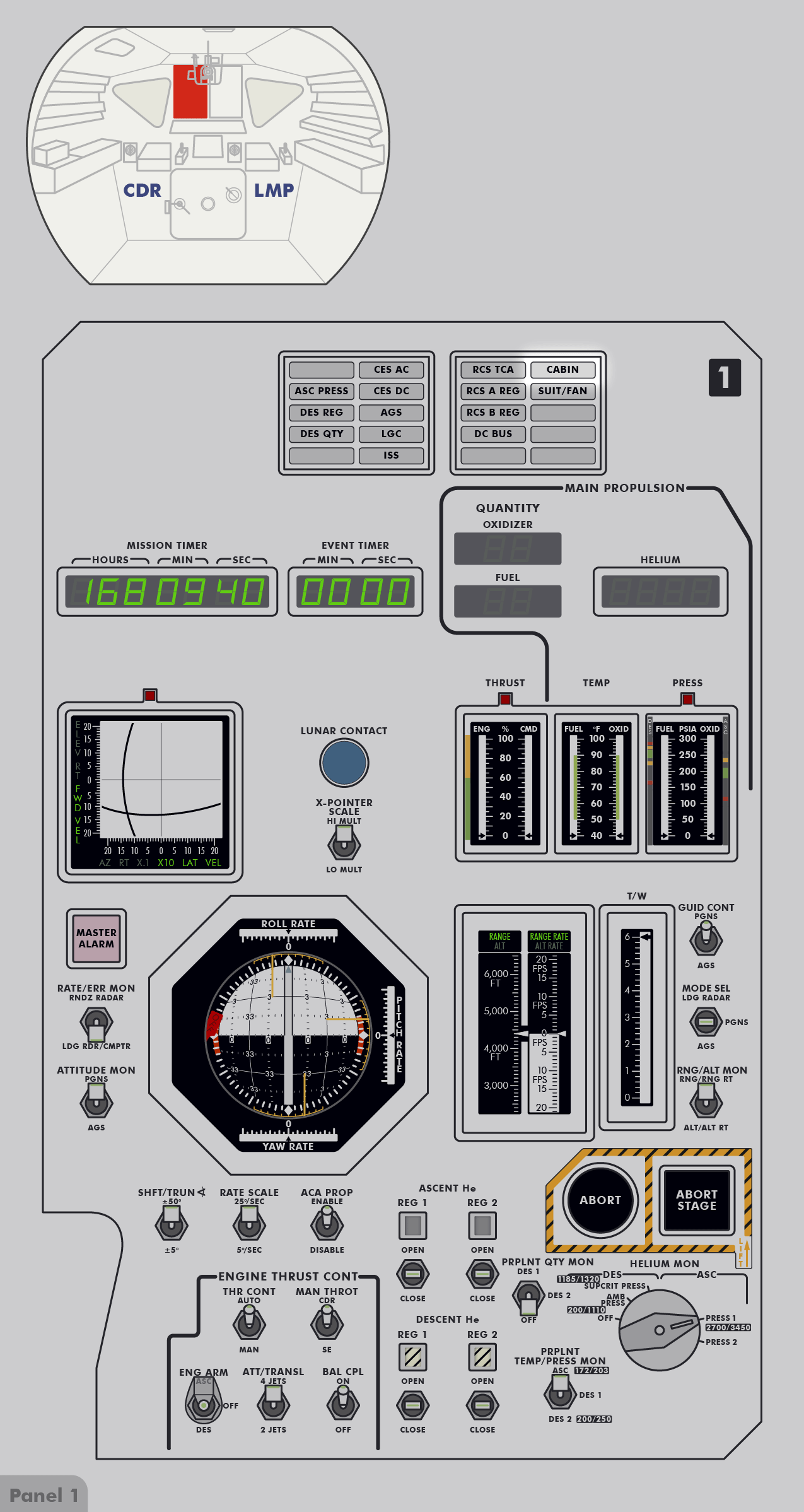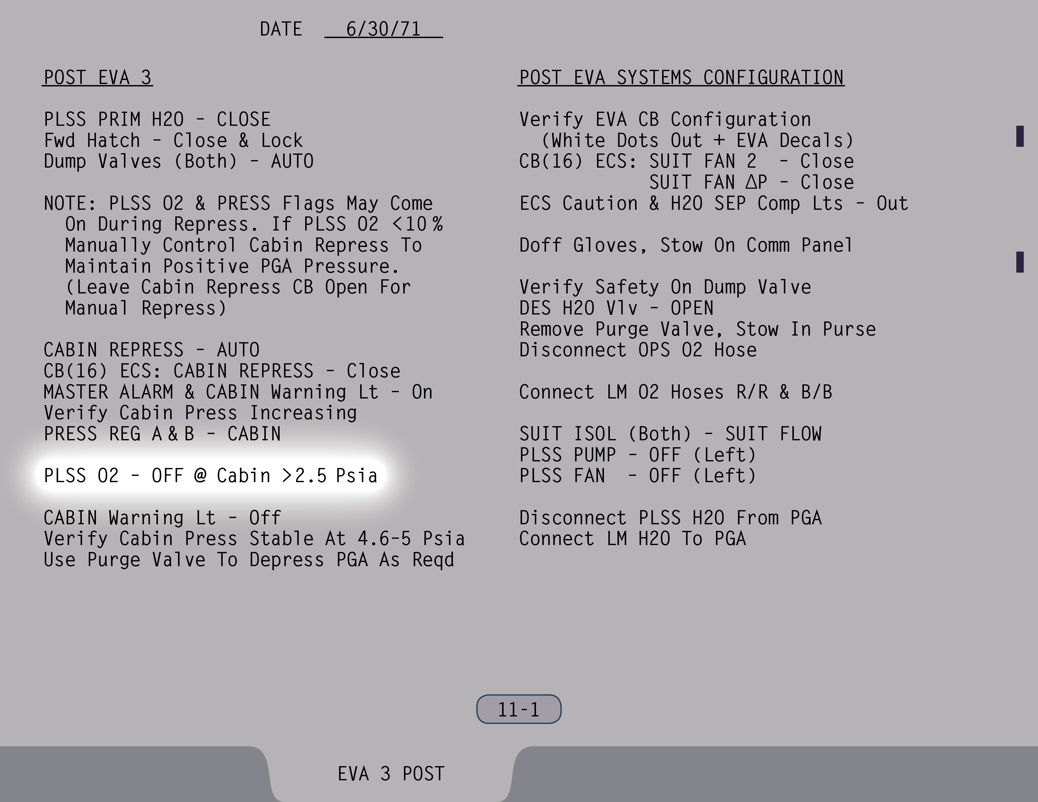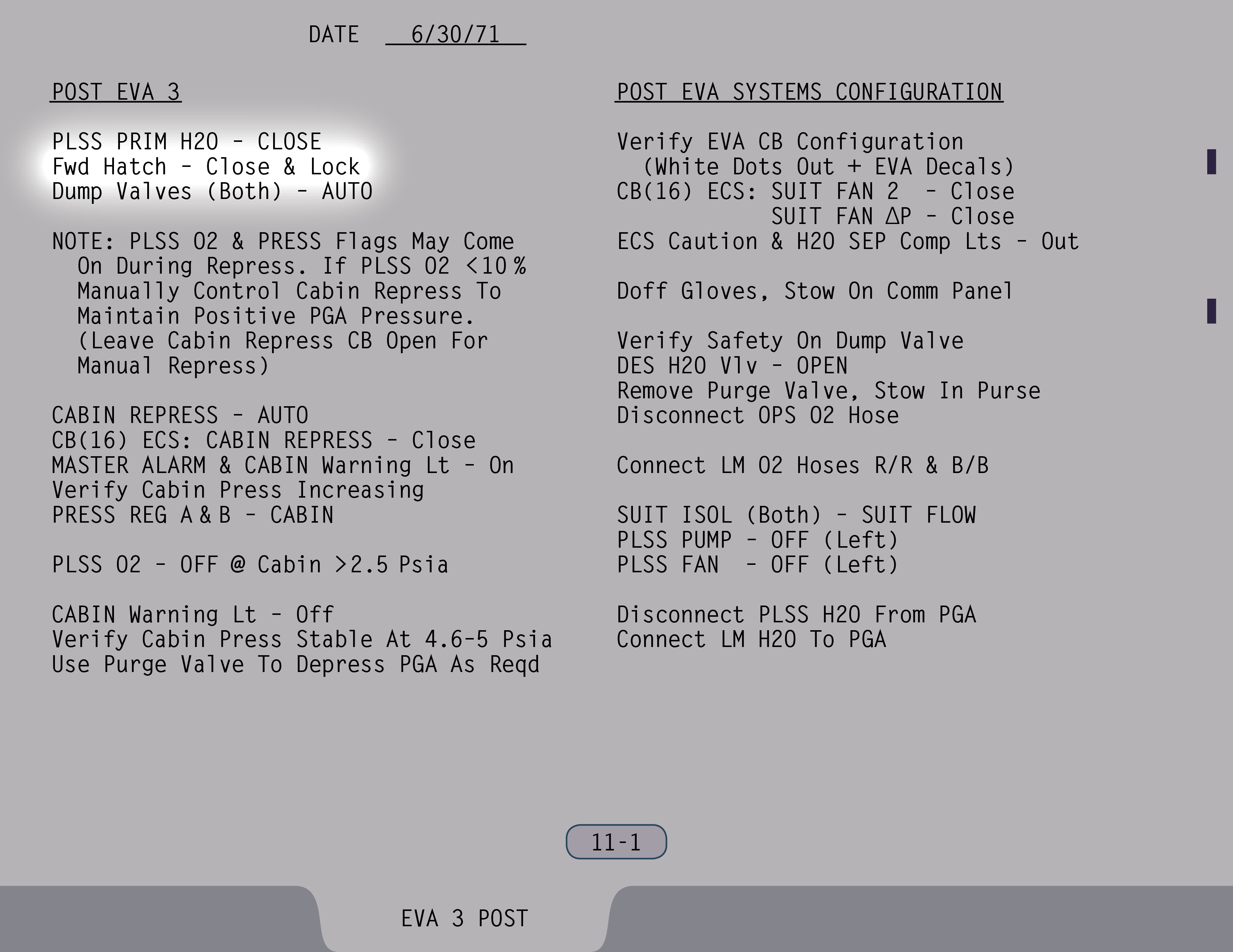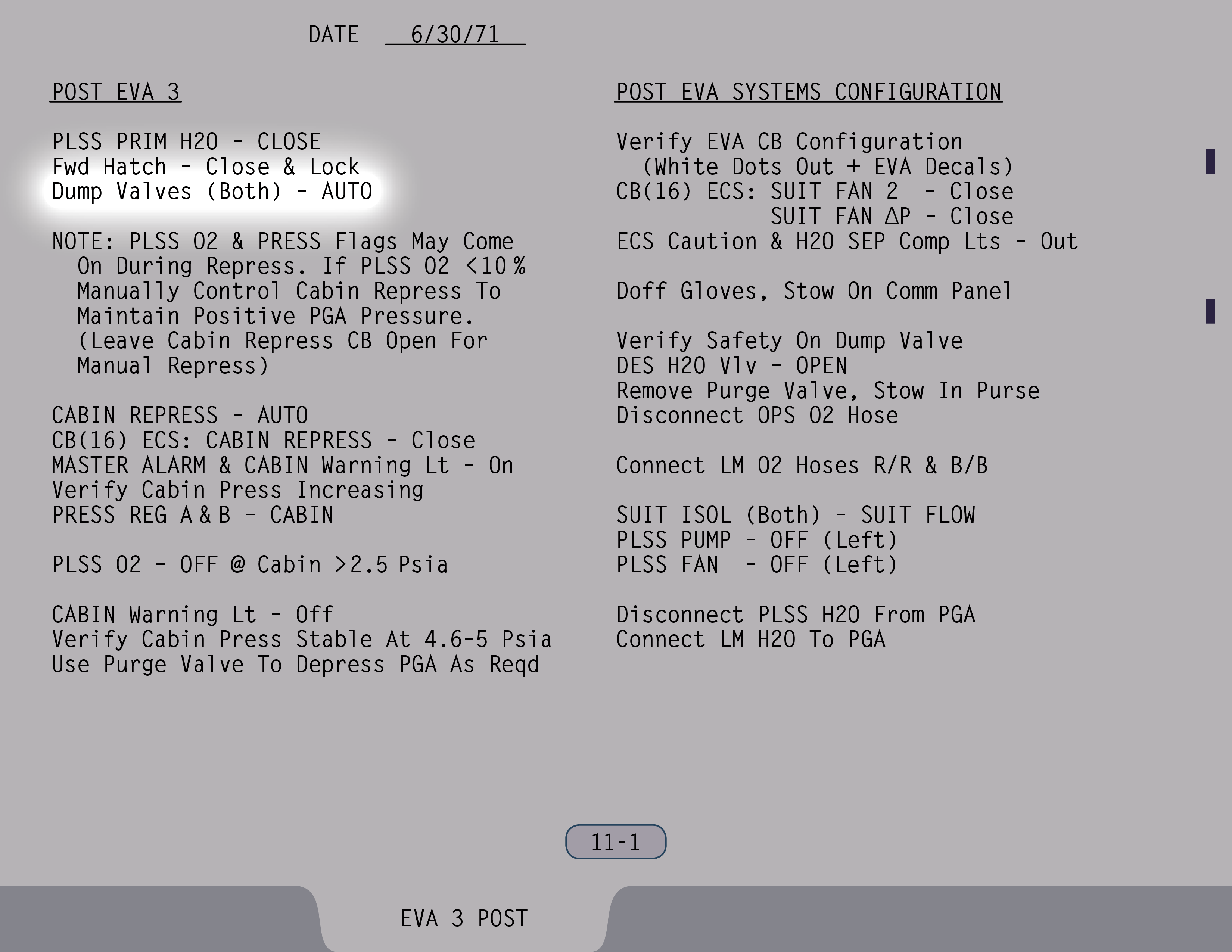Scott: Also, vielen Dank, Gerry. Wir ziehen unsererseits den Hut vor euch. Alle Achtung, ihr Burschen seid absolut auf Draht und wir sind sehr froh darüber. Denn eins dürfte jedem klar sein, ohne euch könnten wir unsere Aufgabe hier oben nicht erfüllen. (Pause) (zu Jim) Okay. Weiter im Text (SUR 11-1). Warnleuchte KABINE ist aus (Paneel 1). Kabinendruck ist stabil bei 4︱5 (4,5 psia/0,31 bar, Paneel 2). Für Druckausgleich (im PGA