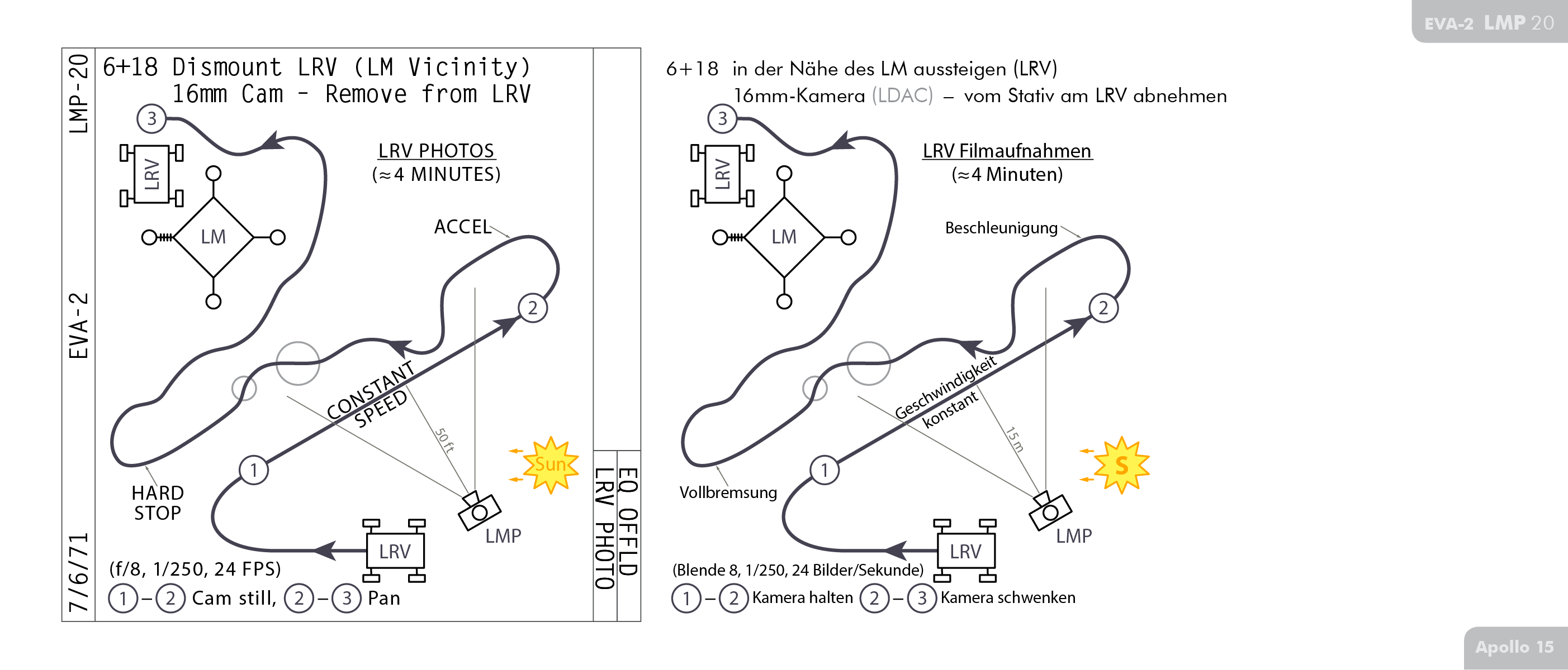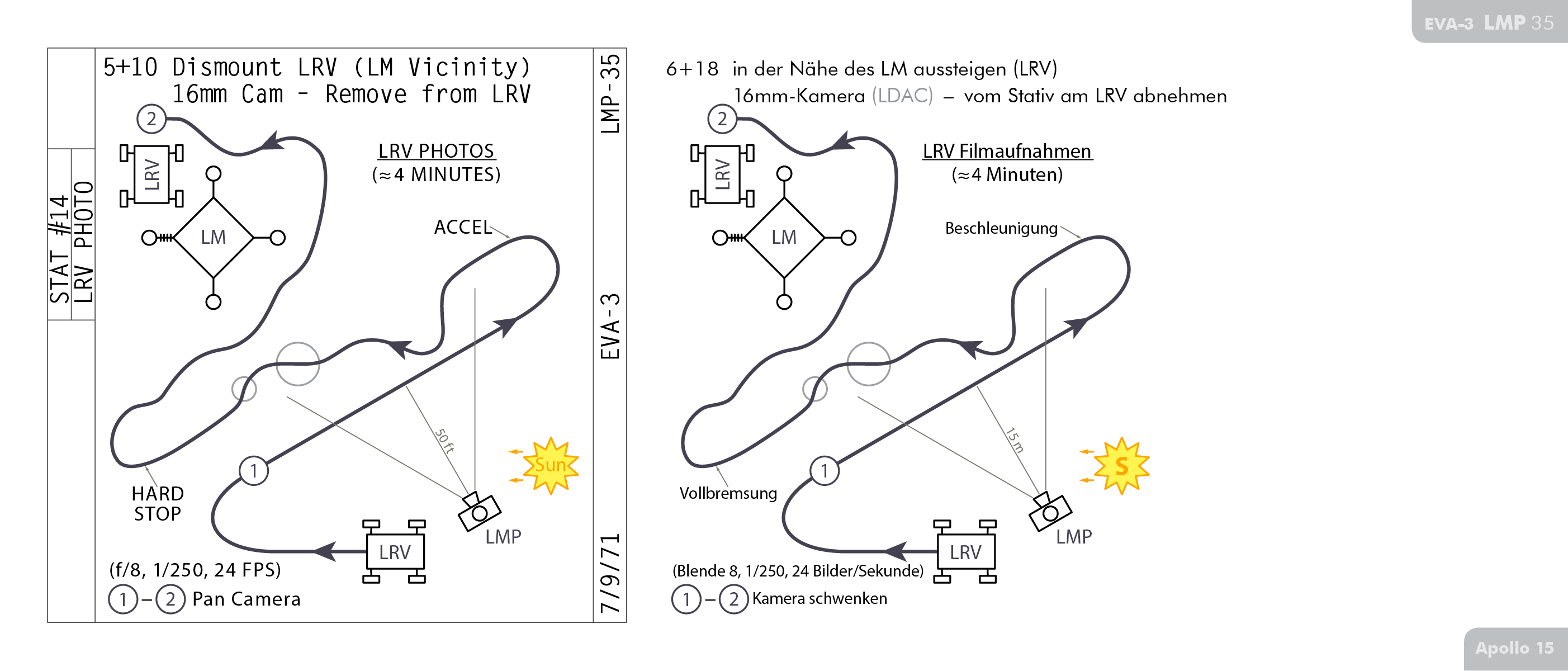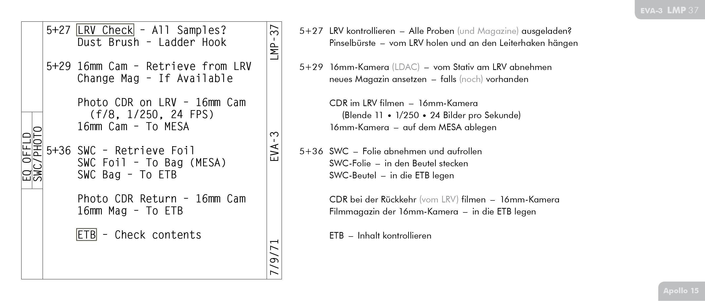 LMLunar Module herum zur Ostseite und sucht eine Stelle, die seit ihrer Landung unberührt blieb. Jim kommt wieder zu seinem Sitz, nimmt erst die Schaufel, dann den SESC