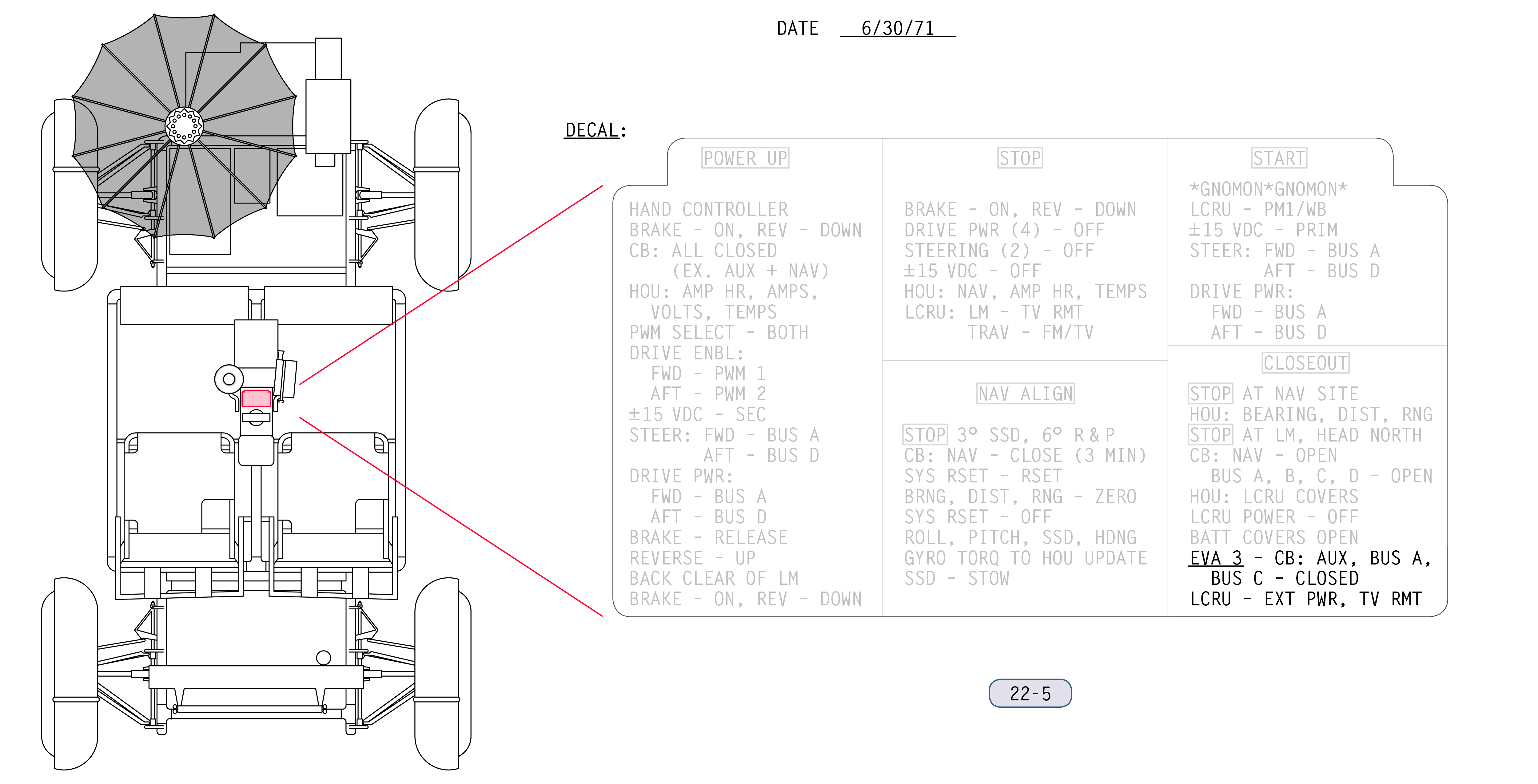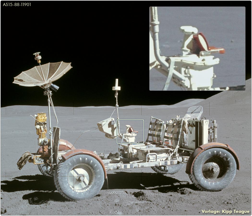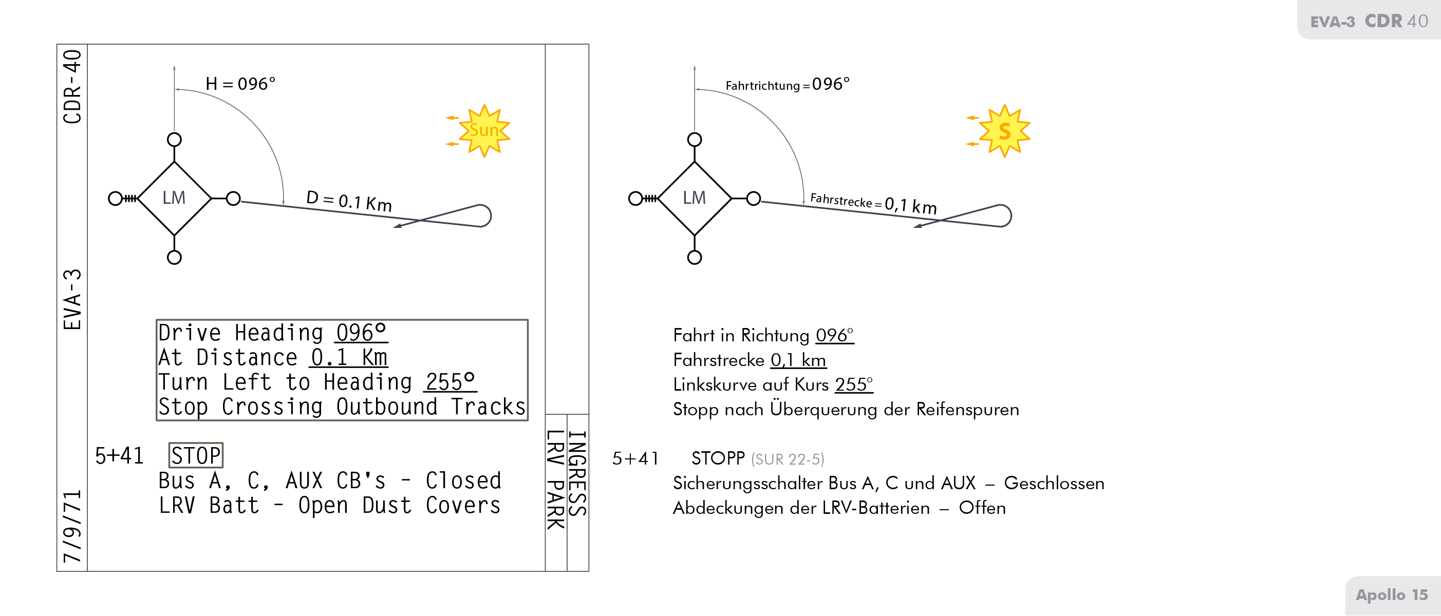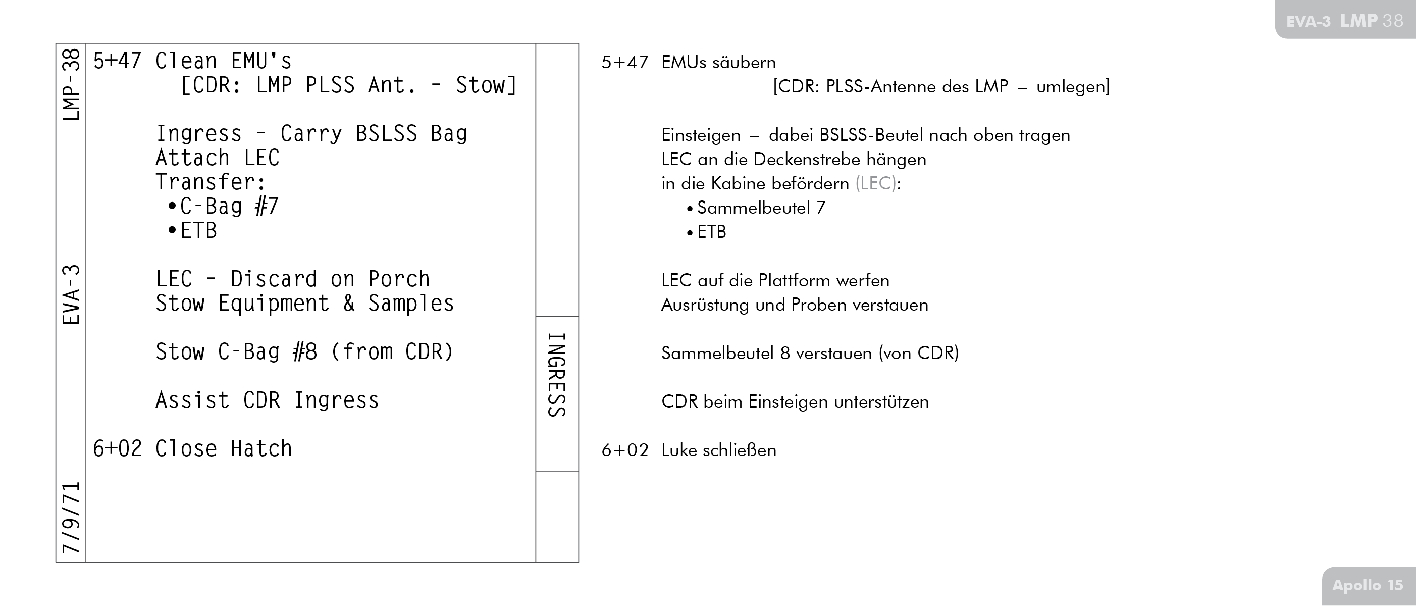 LMLunar Module herum zur Ostseite und sucht eine Stelle, die seit ihrer Landung unberührt blieb. Jim kommt wieder zu seinem Sitz, nimmt erst die Schaufel, dann den SESC