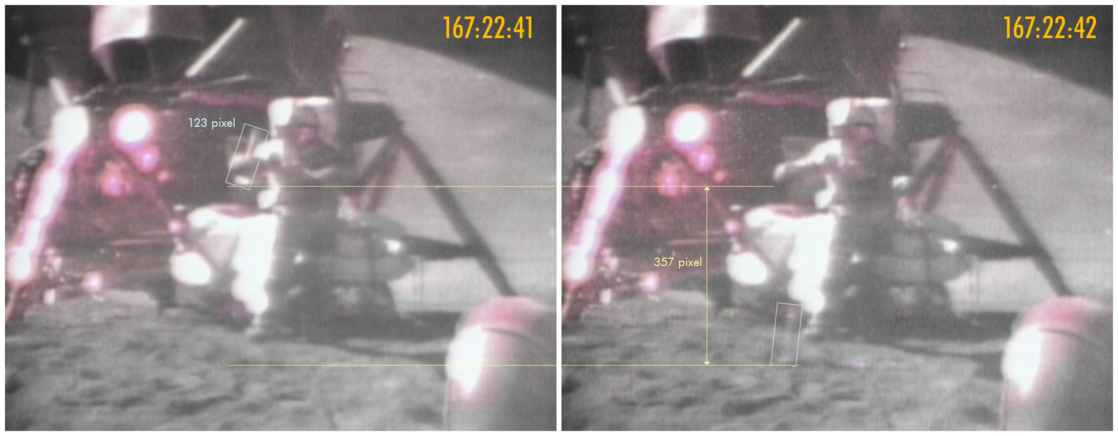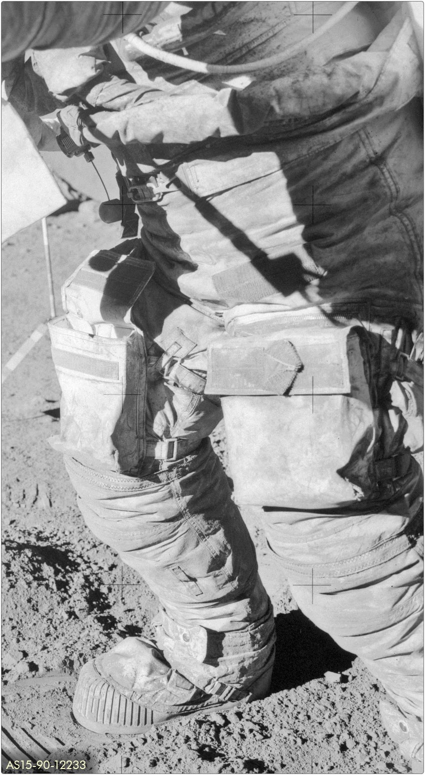 LMLunar Module liegen muss. Anschließend folgt er Jim nach links aus dem Sichtfeld der Fernsehkamera. Ed Fendell ändert weder Ausrichtung noch Zoomeinstellung der Kamera und etwa später laufen Dave und Jim von links nach rechts durchs Bild. Man sieht allerdings nur die Beine.