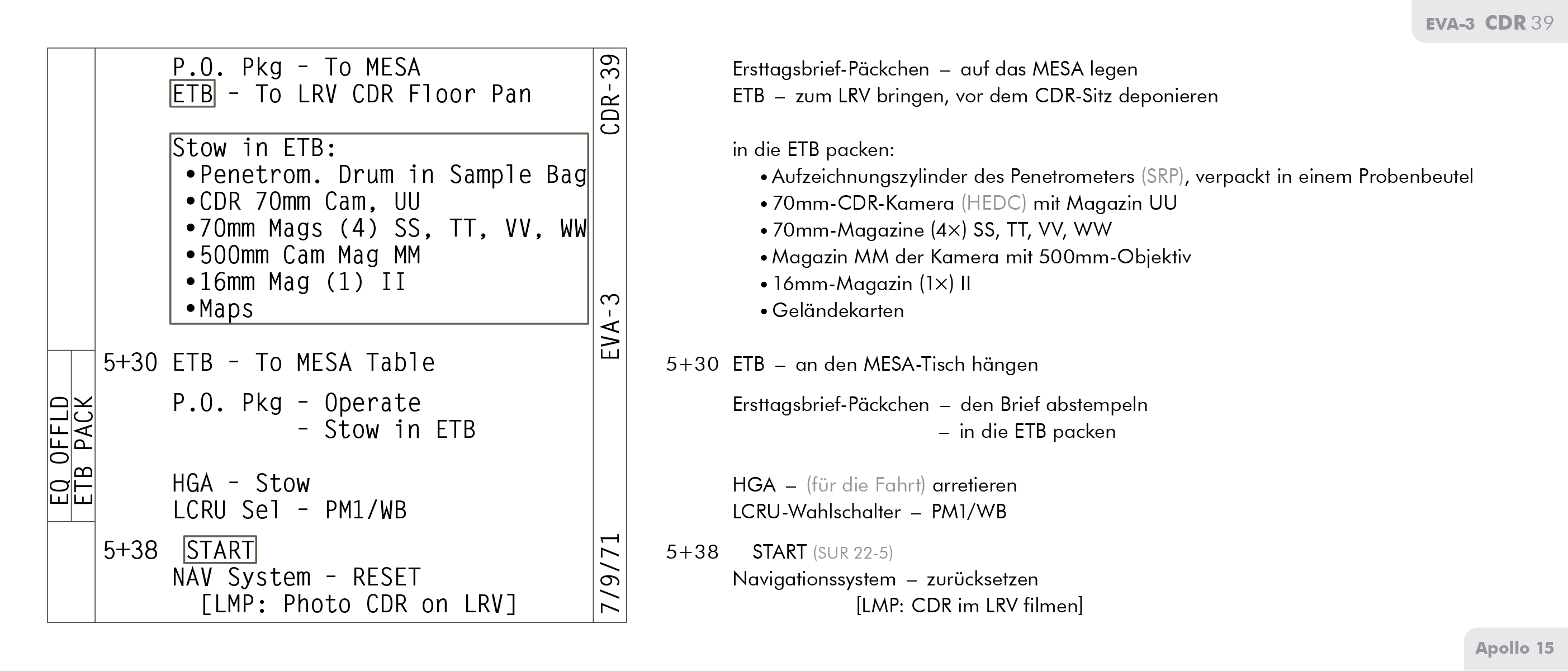 EVAExtravehicular Activity bei , endete bei und dauerte somit , wenn man sich an der Niederschrift orientiert. Laut Missionsbericht zu Apollo 15 (Apollo 15 Mission Report, S. 3-2) begann die EVA