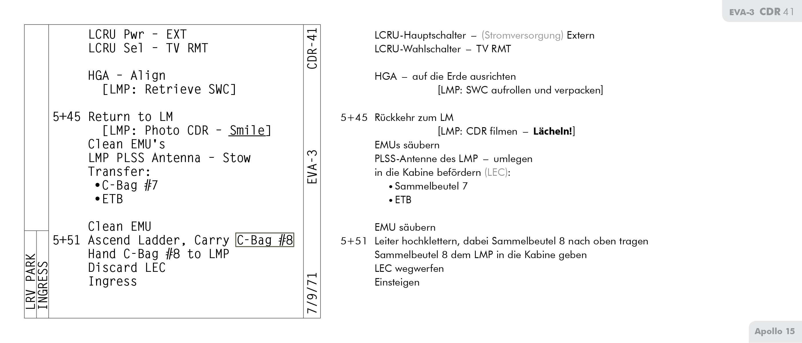 EVAExtravehicular Activity bei und endete bei . Diese geringe Differenz ist kaum von Belang und typisch für die Abweichungen in der originalen Niederschrift.