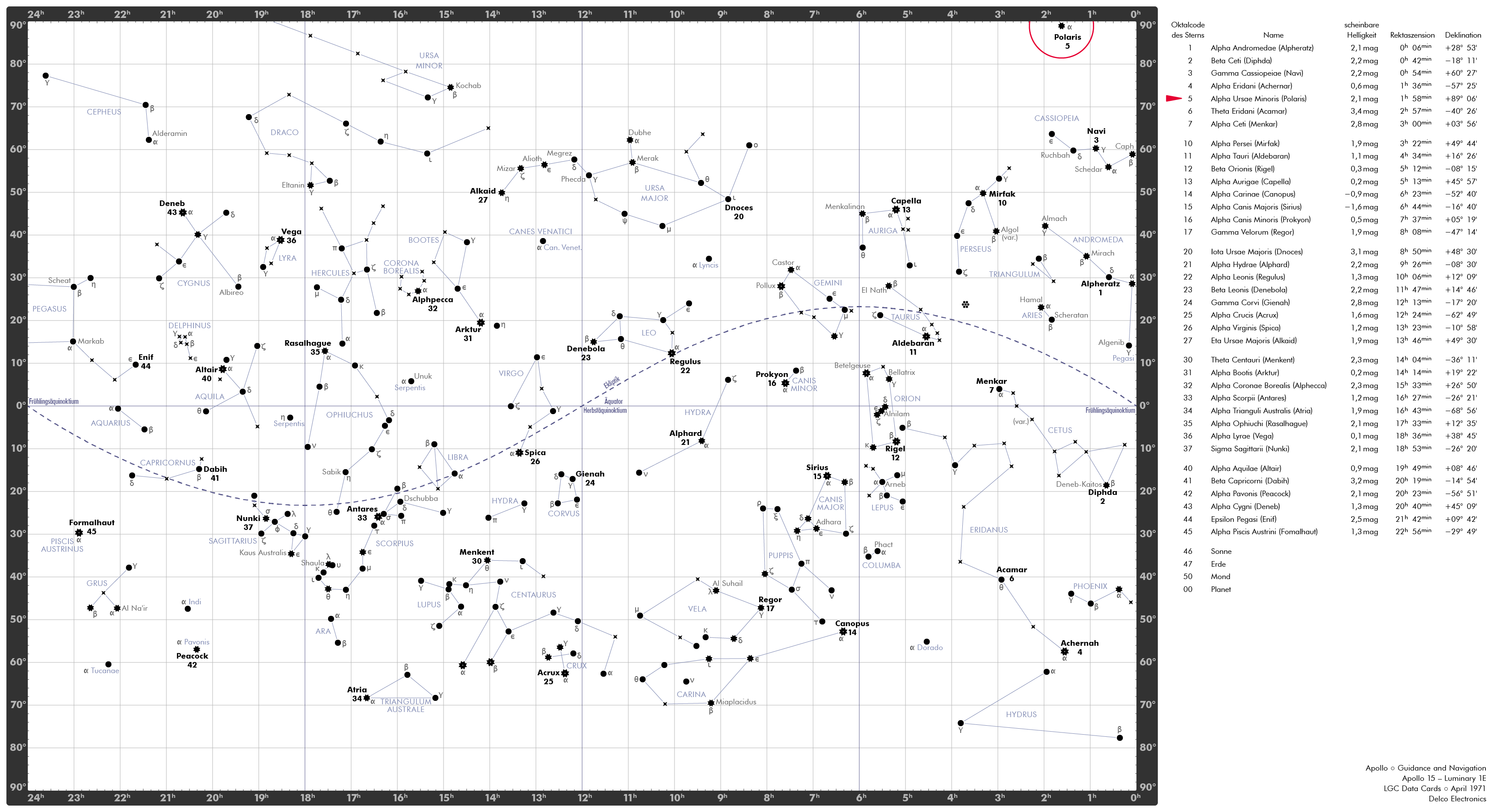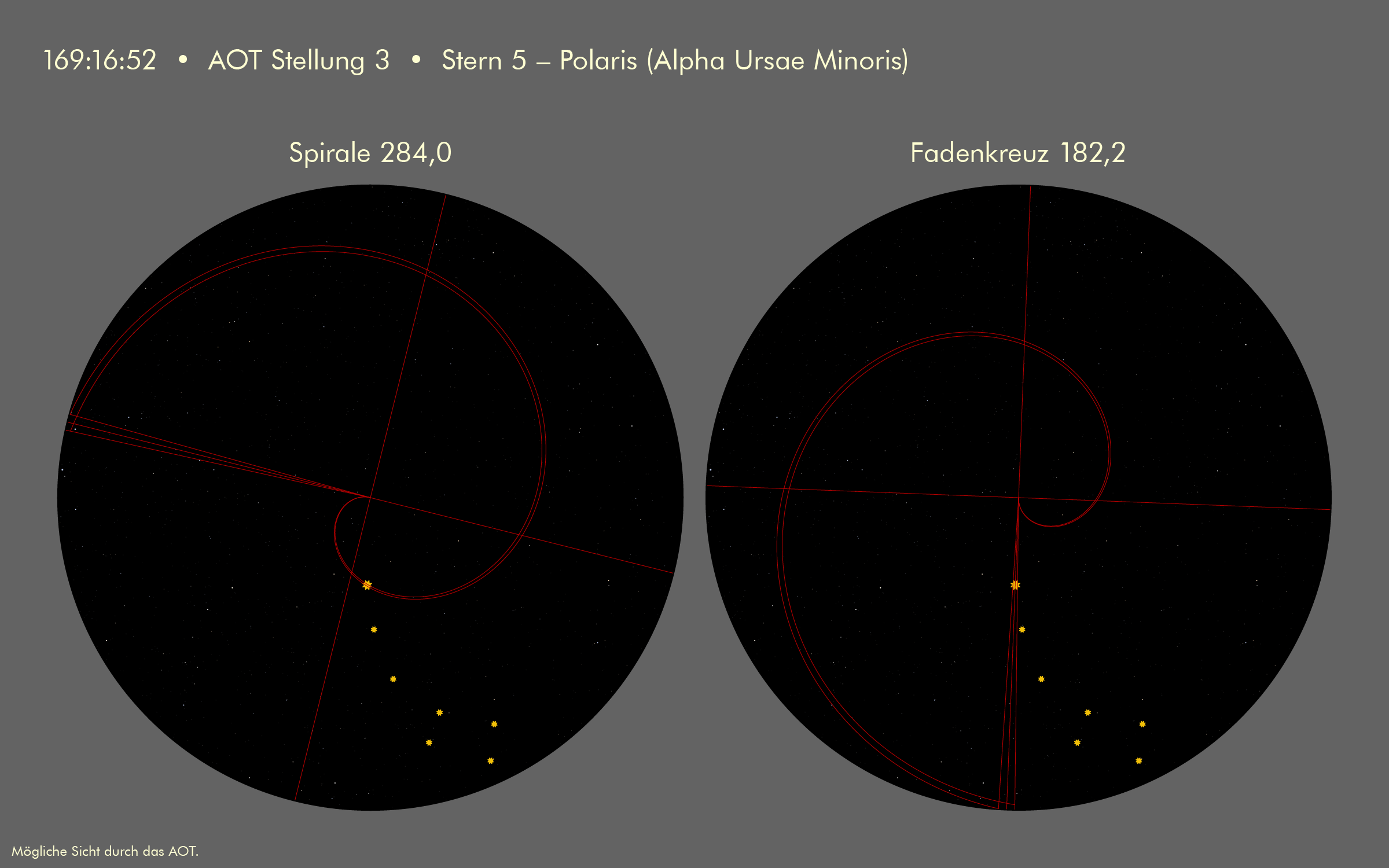 P-57Program 57 (Lunar Surface Align) bitte Stern 5 in Stellung 3 anpeilen. Der Stern müsste bei Fadenkreuz 182,2 und Spirale 284,0 zu finden sein. (Blick durch das AOT)