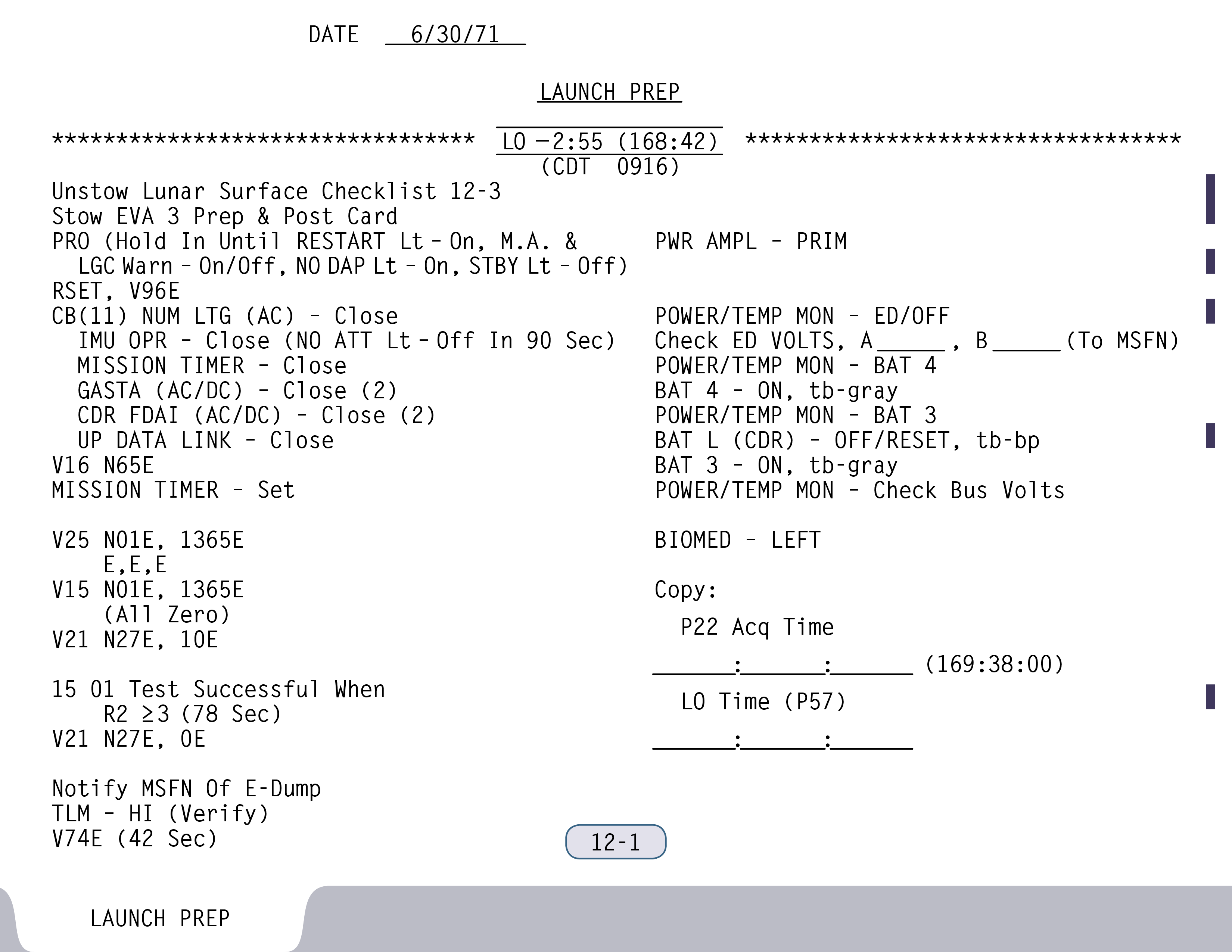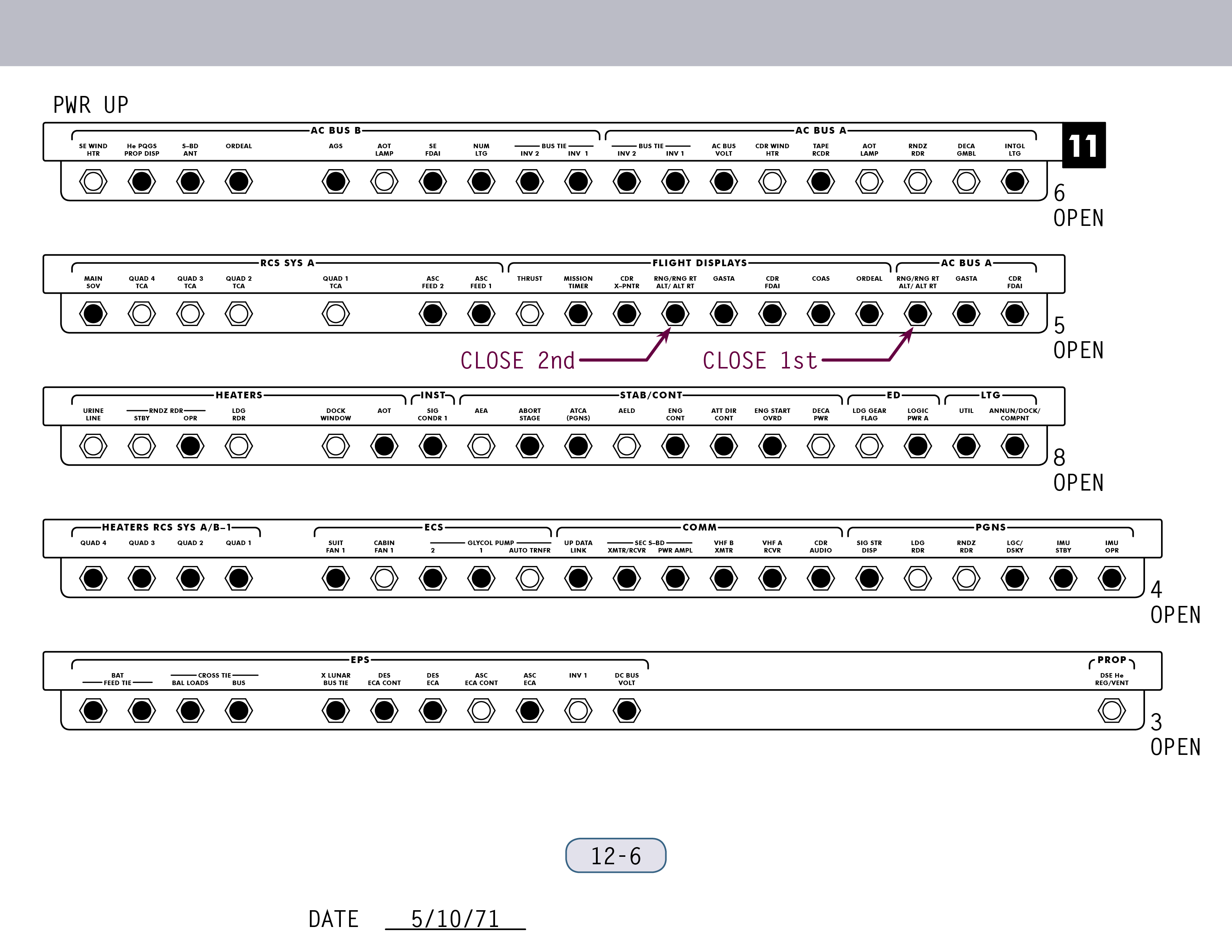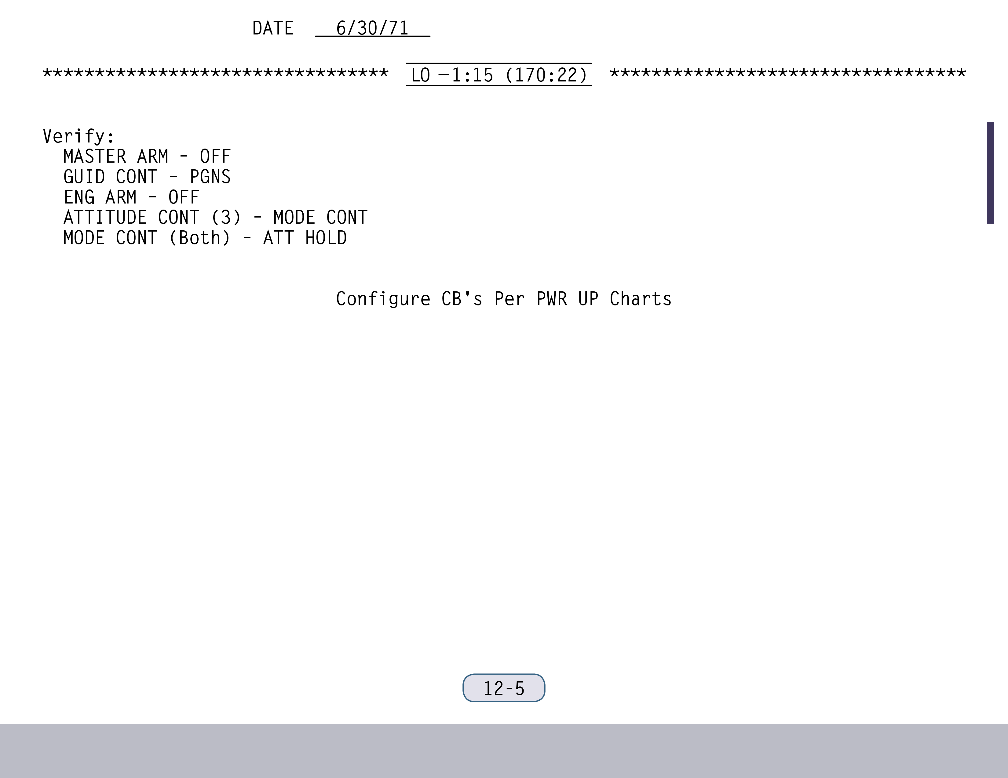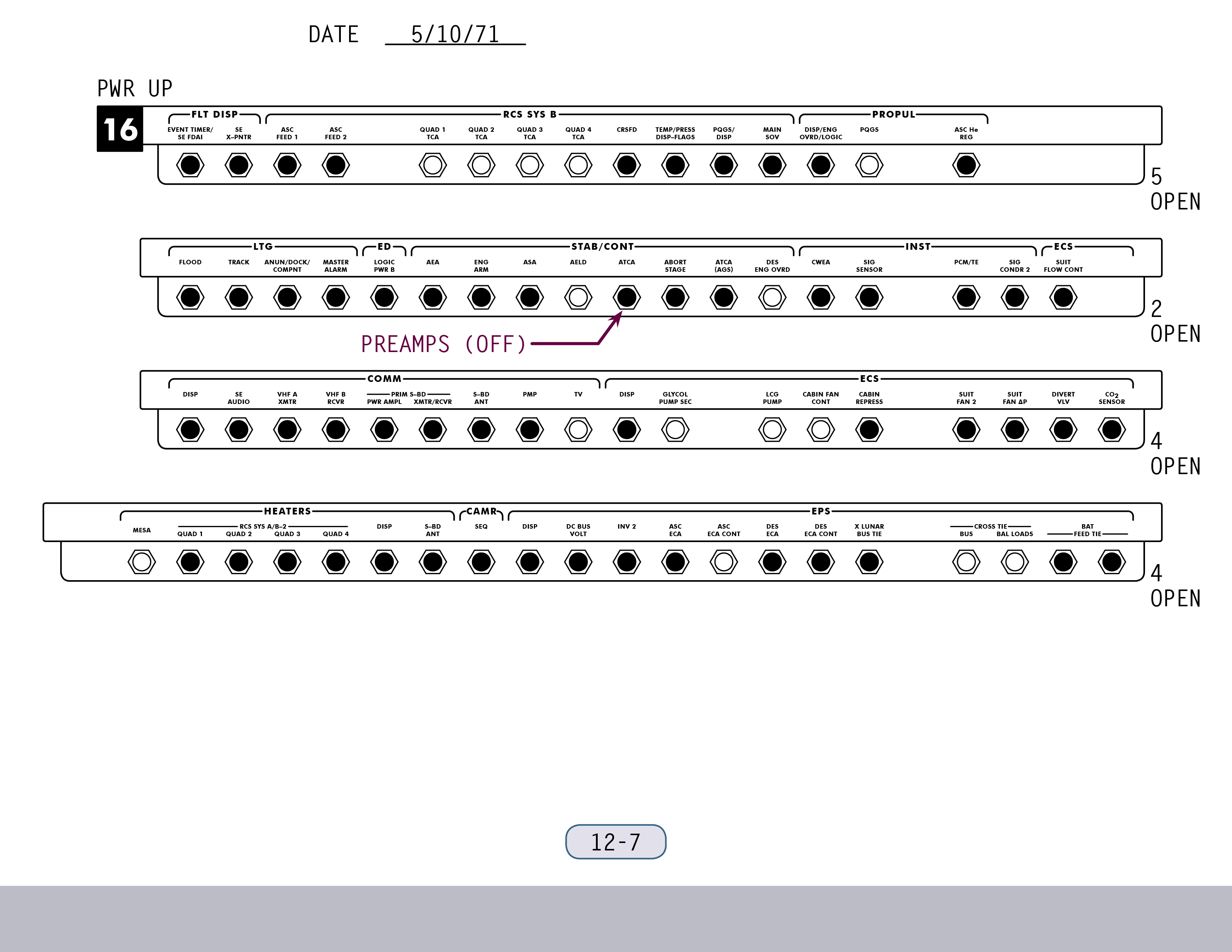 P-22Program 22 (Lunar Surface Navigation) (SUR 12-4) und kontrollieren einige Schalter (SUR 12-5). Wenn Ed Mitchell das nächste Mal mit ihnen spricht, sind sie gerade dabei, anhand der Schemen auf den Seiten SUR 12-6 und SUR 12-7 ihrer Checkliste die Sicherungsschalter zu stellen.