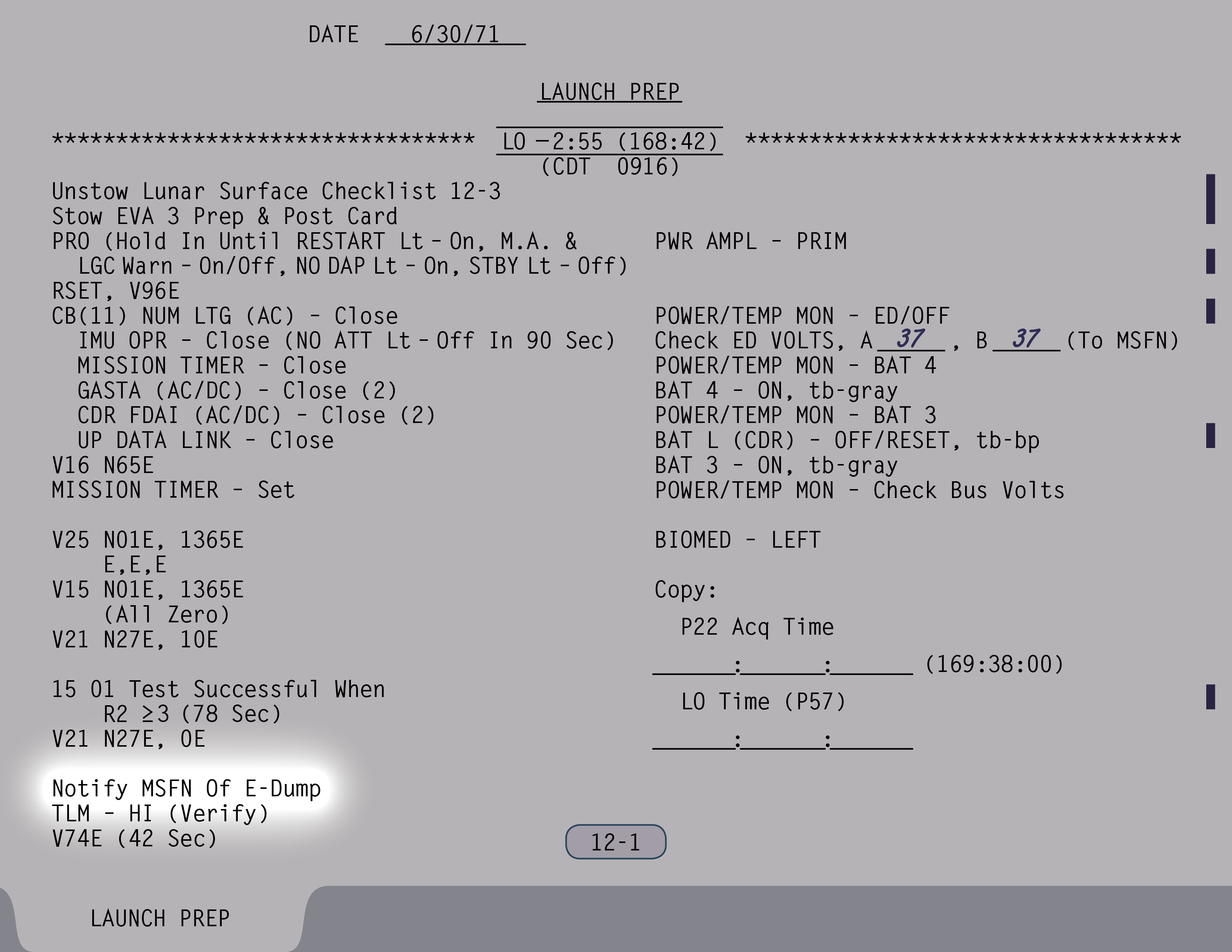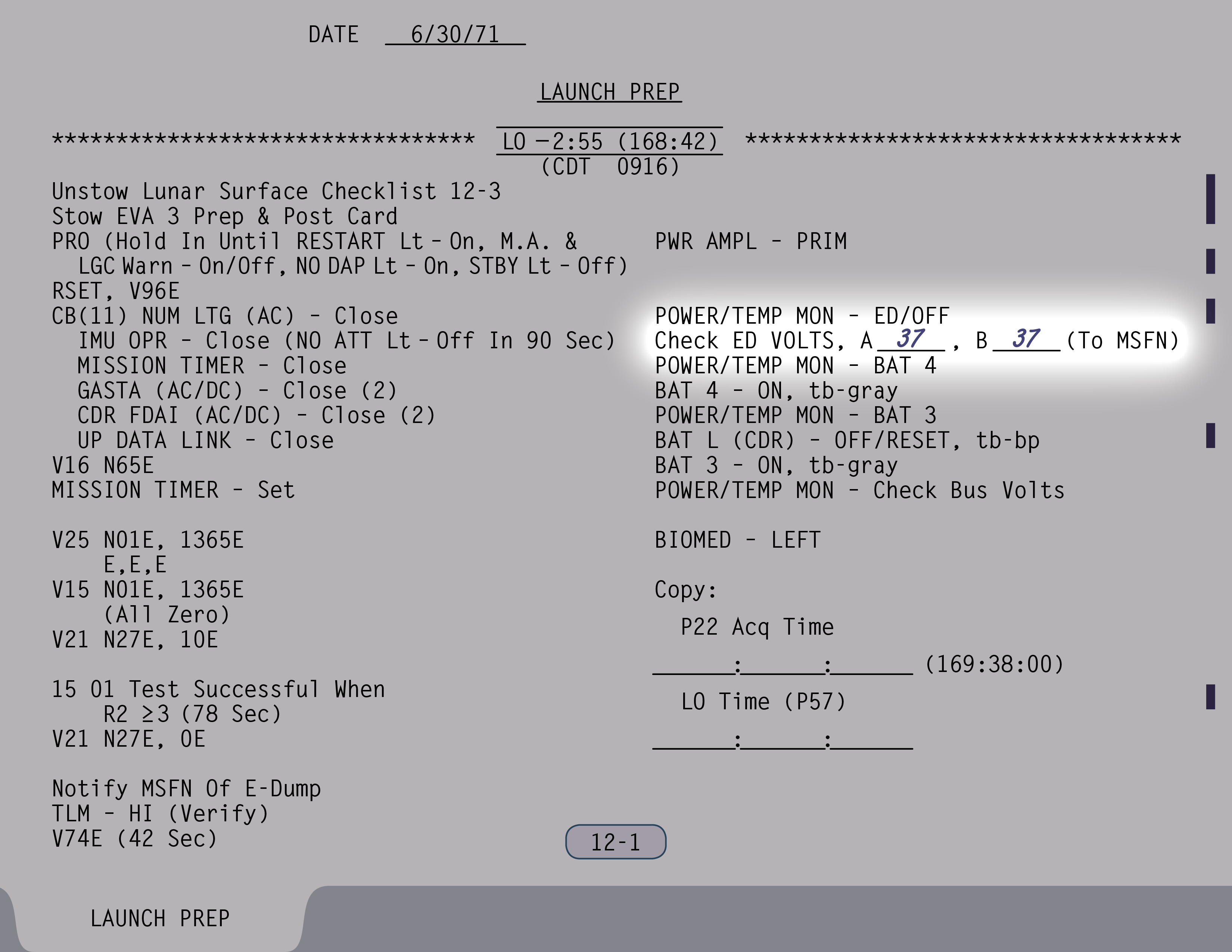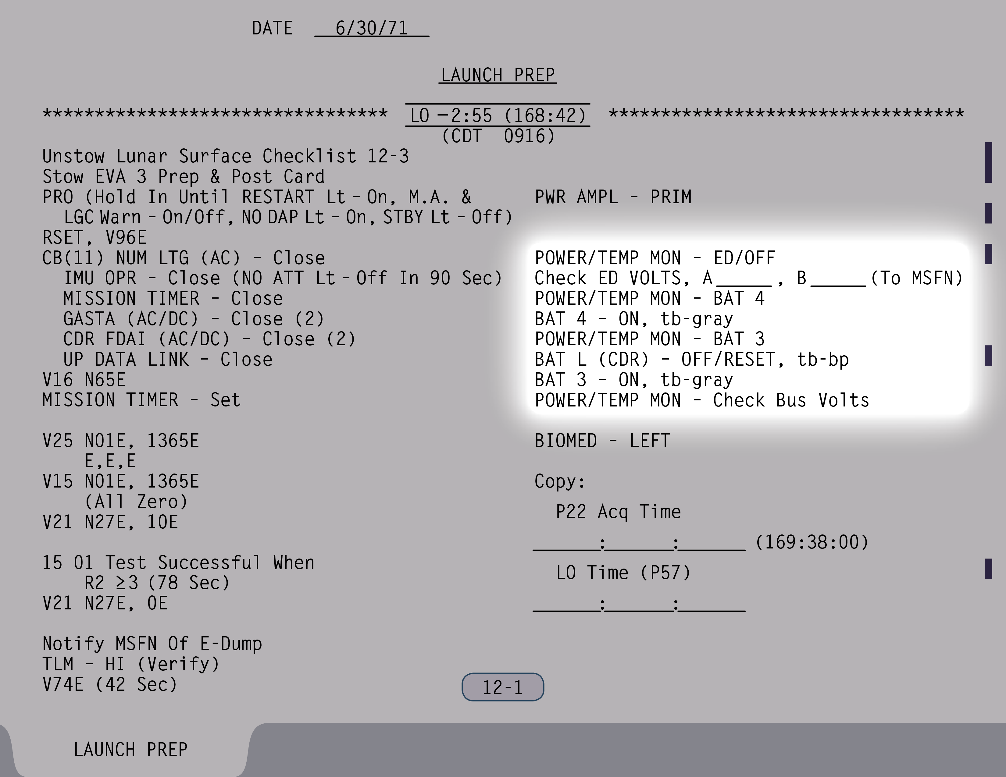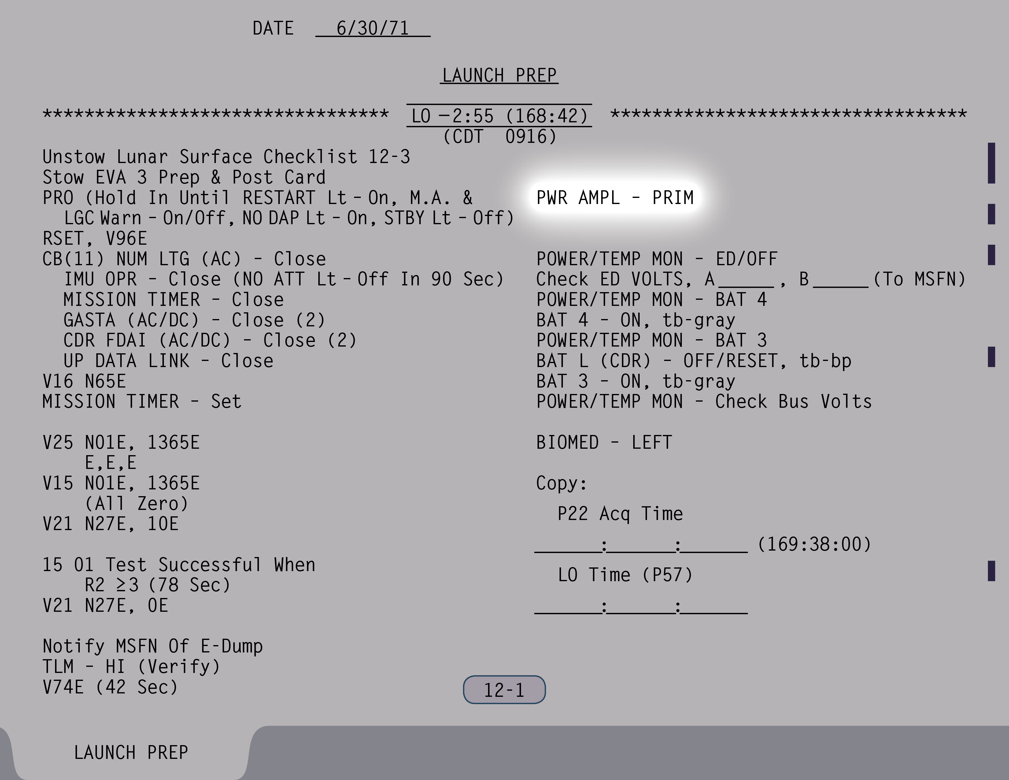 P-22Program 22 (Lunar Surface Navigation) (SUR 12-4) und kontrollieren einige Schalter (SUR 12-5). Wenn Ed Mitchell das nächste Mal mit ihnen spricht, sind sie gerade dabei, anhand der Schemen auf den Seiten SUR 12-6 und SUR 12-7 ihrer Checkliste die Sicherungsschalter zu stellen.