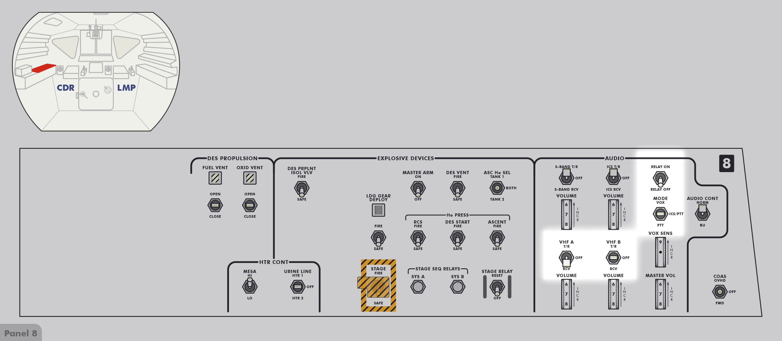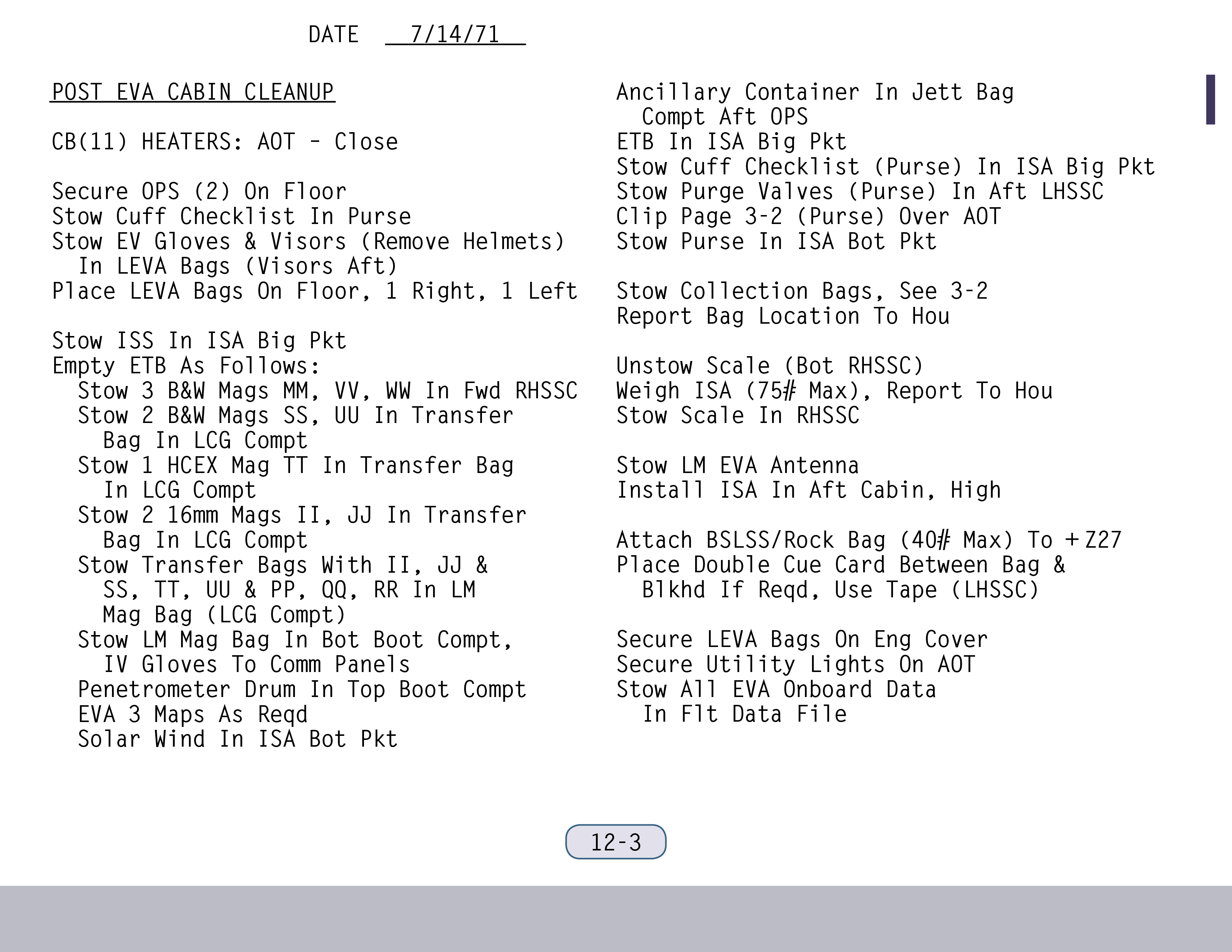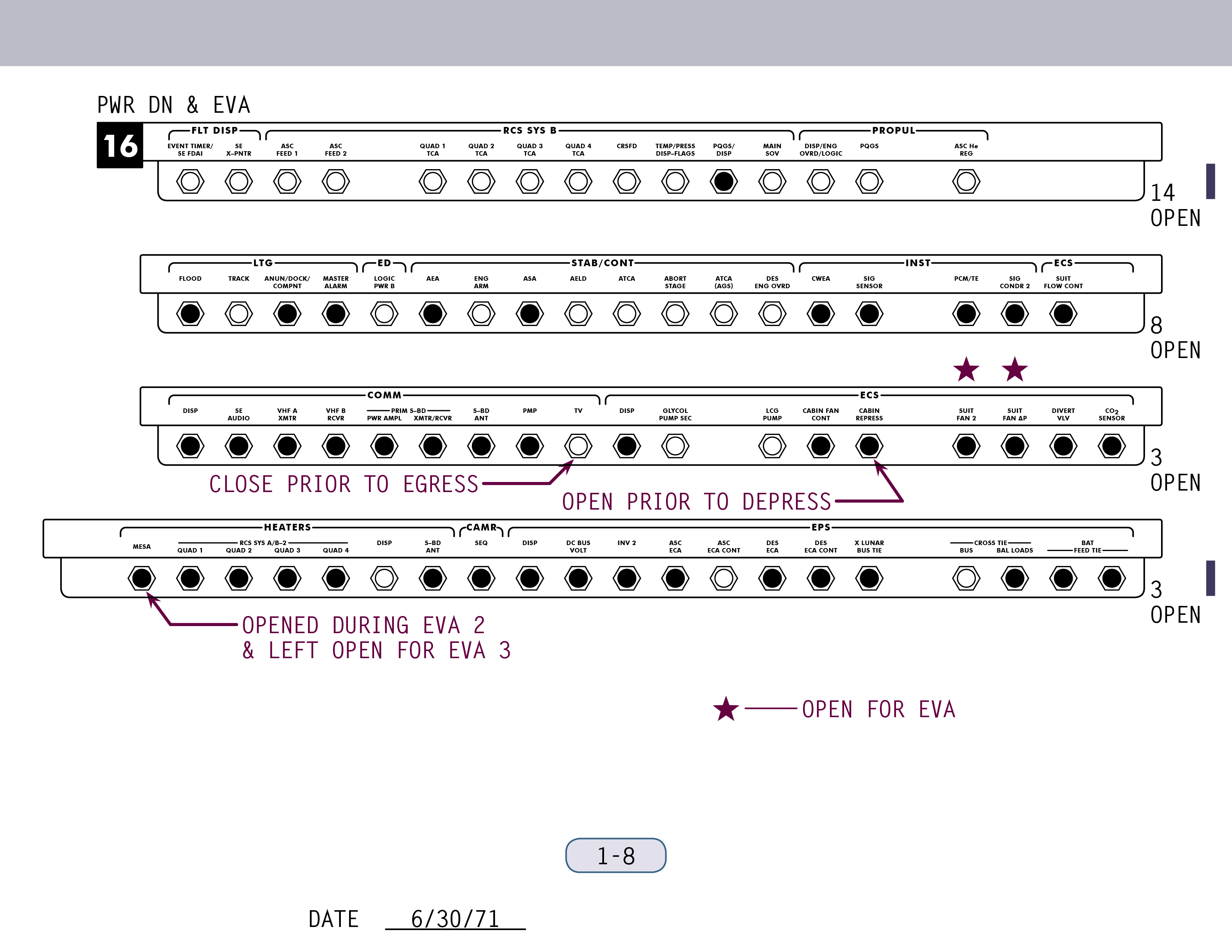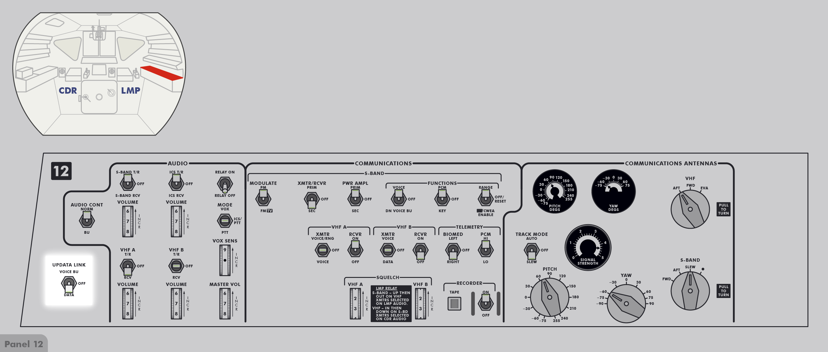 P-22Program 22 (Lunar Surface Navigation) (SUR 12-4) und kontrollieren einige Schalter (SUR 12-5). Wenn Ed Mitchell das nächste Mal mit ihnen spricht, sind sie gerade dabei, anhand der Schemen auf den Seiten SUR 12-6 und SUR 12-7 ihrer Checkliste die Sicherungsschalter zu stellen.