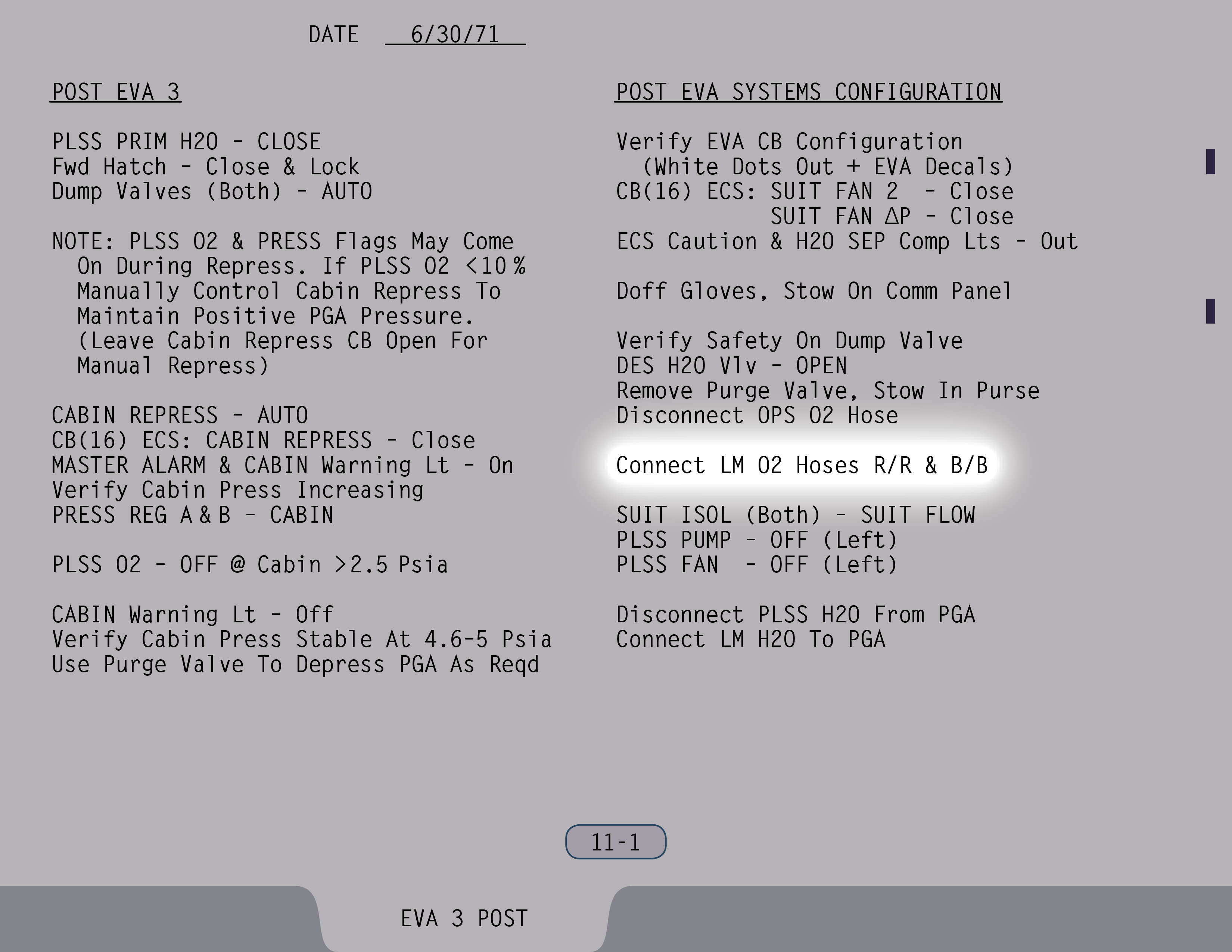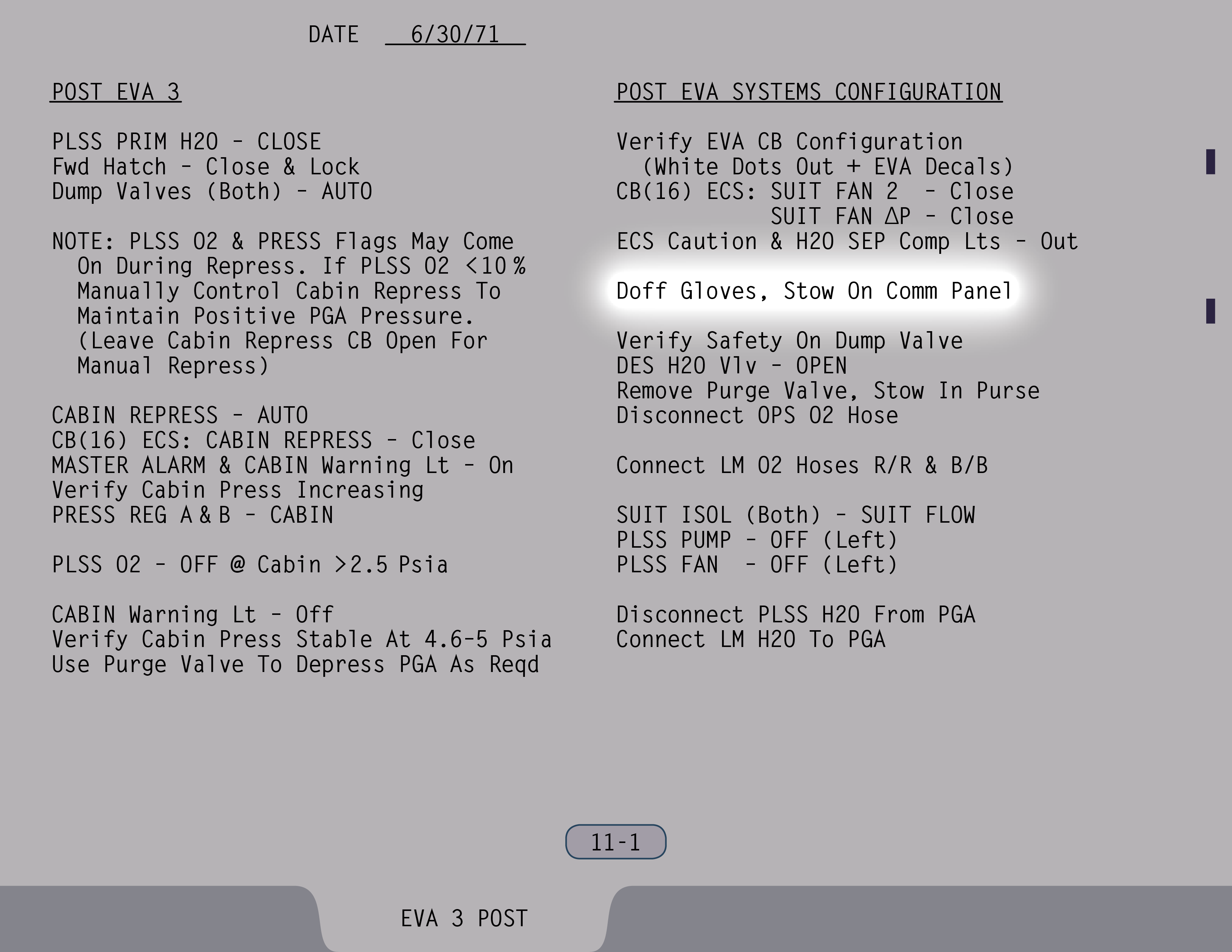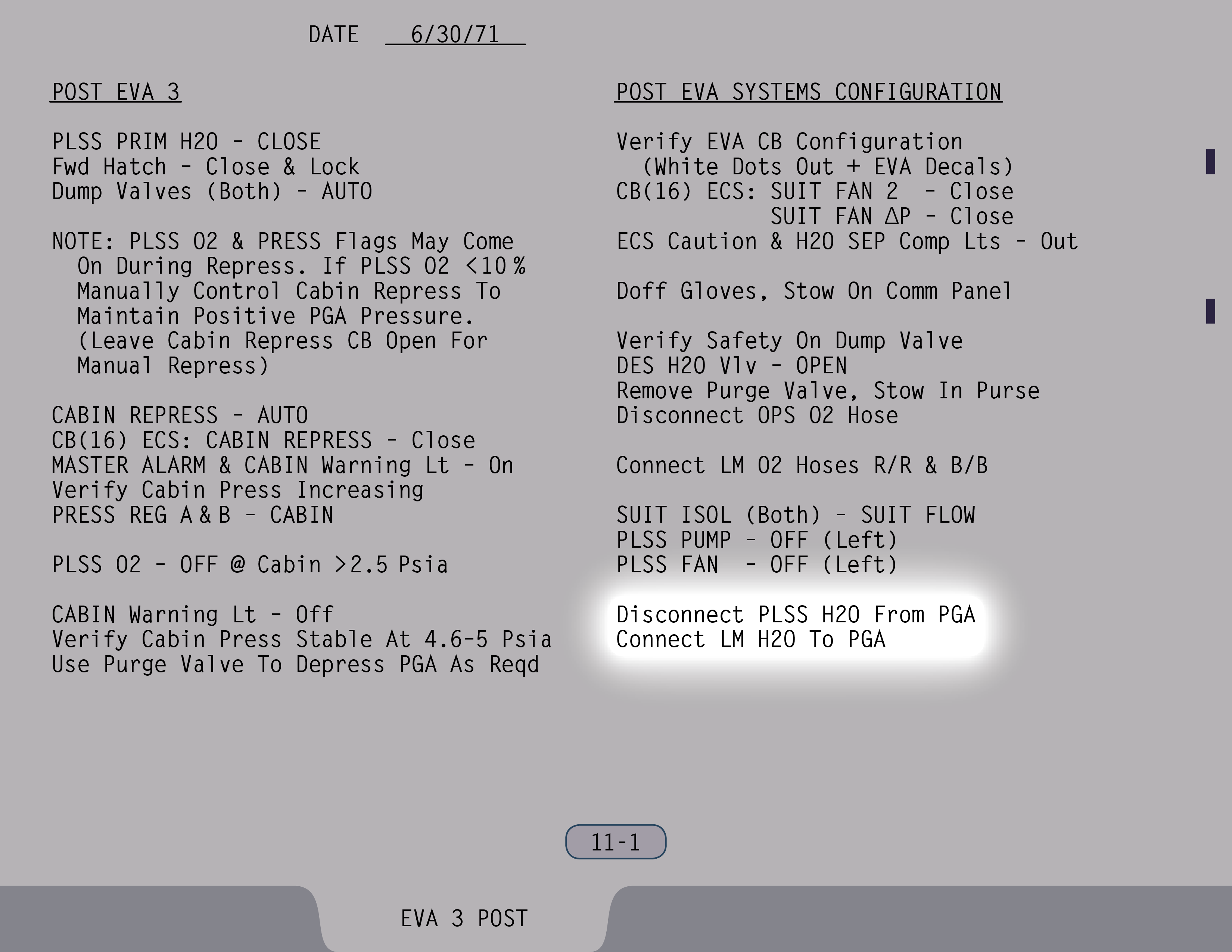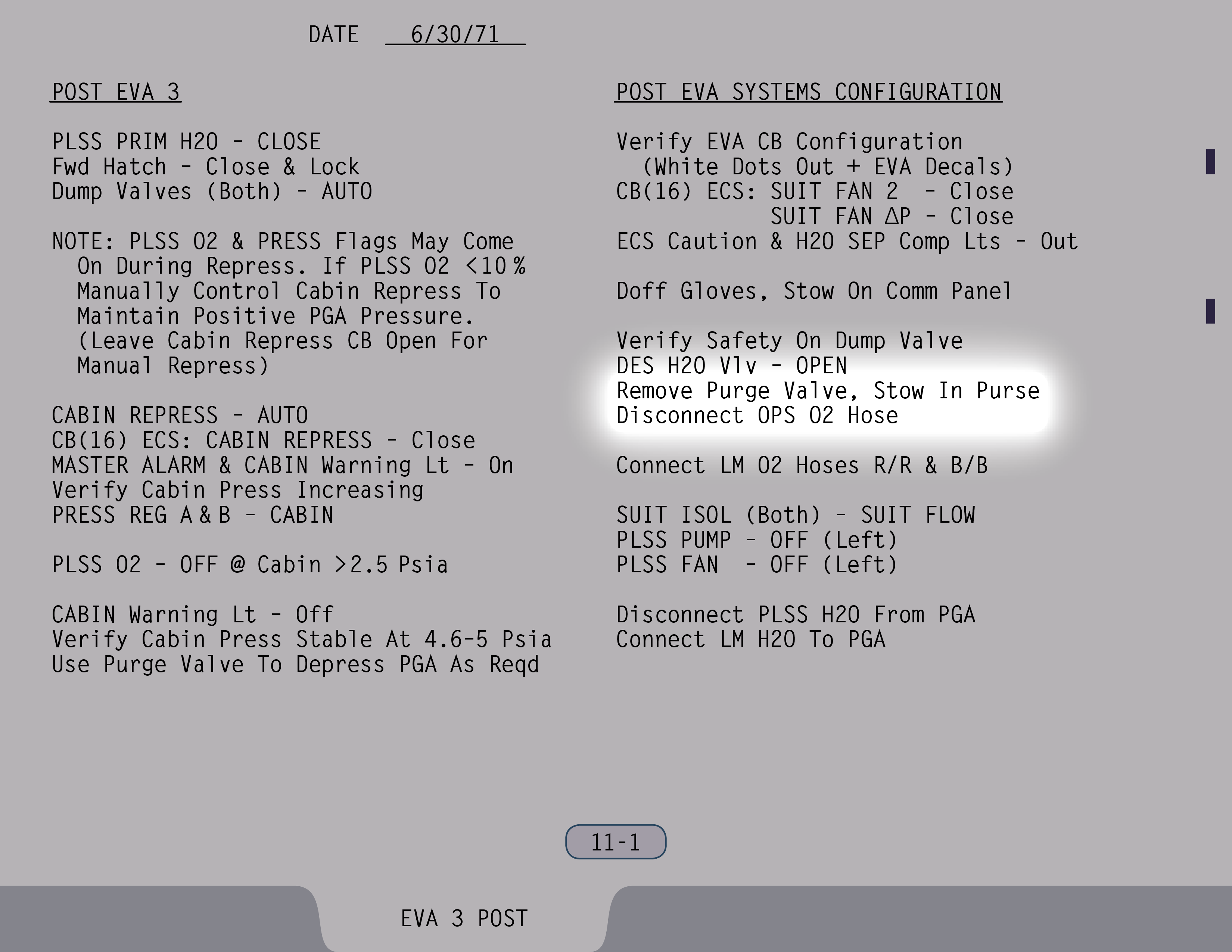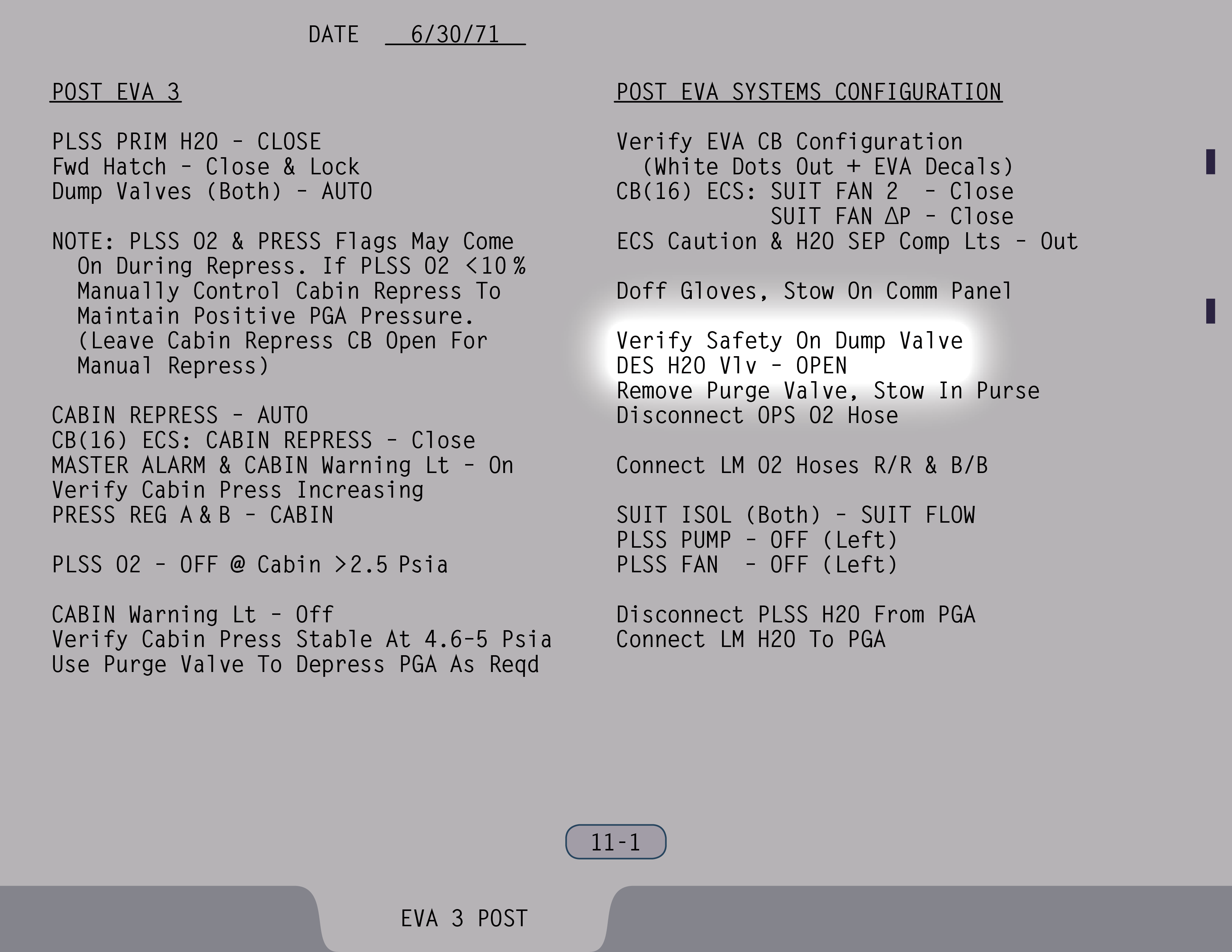 AUTOAutomatic (Ventilstellung). Ventil ist gesichert. (Pause) Die Auslassventile sollen sowieso rausgenommen werden. Ventil für Wasser aus Landestufentanks – Offen, wenn du hinkommst, Jim. (SUR 11-1)