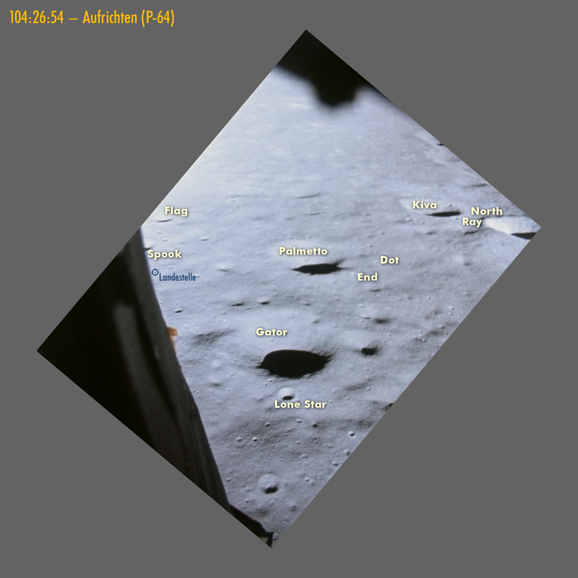 LMLunar Module und ist 6,2 Kilometer entfernt. Die höchste Erhebung im Landegebiet von Apollo 15, der Gipfel des Mons Hadley, ragt 4080 Meter auf und ist 20 Kilometer entfernt. Der Gipfel des Süd-Massivs, die höchste Erhebung im Landegebiet von Apollo 17, liegt rund 2400 Meter über dem Niveau der Landestelle und ist 12,5 Kilometer entfernt. (Quelle: Lunar/LROC QuickMap, Höhendifferenzen und Entfernungen für Apollo 15, Apollo 16, Apollo 17)