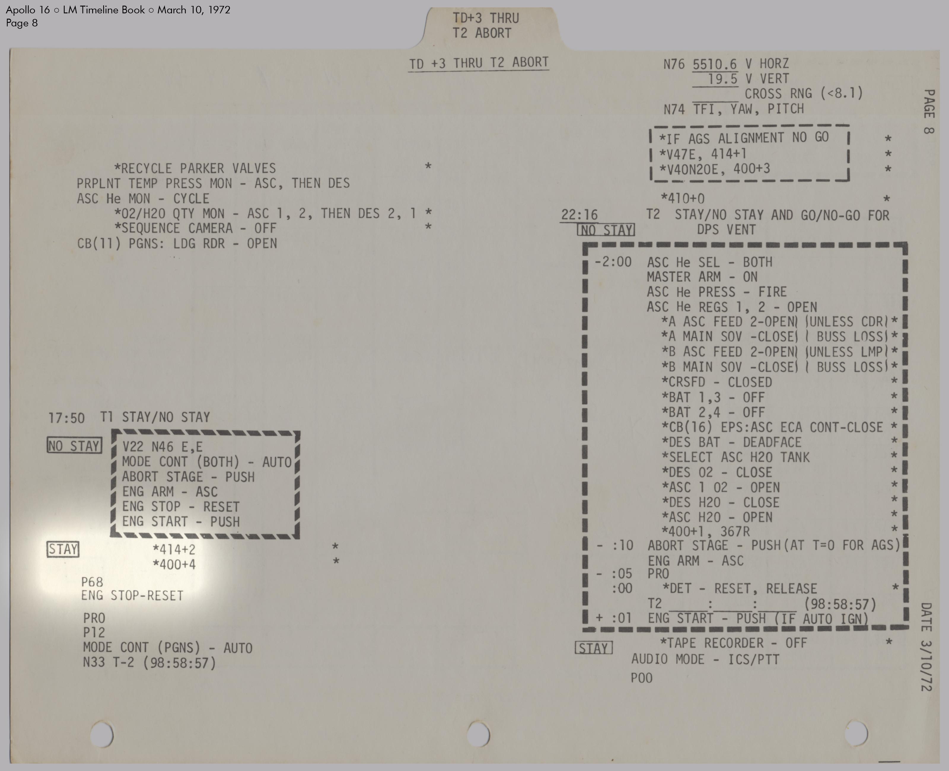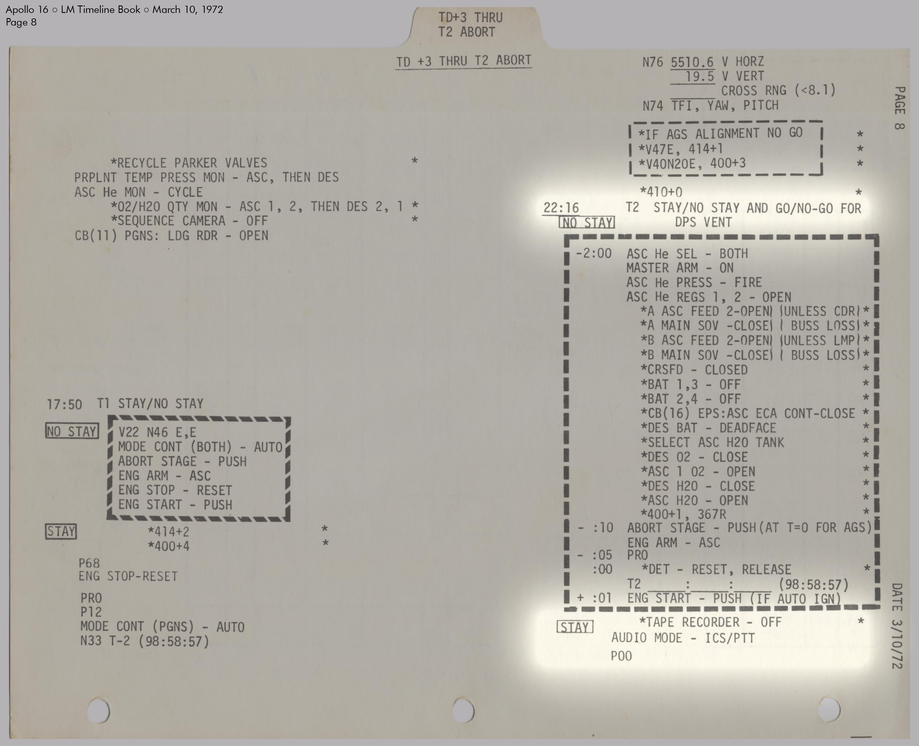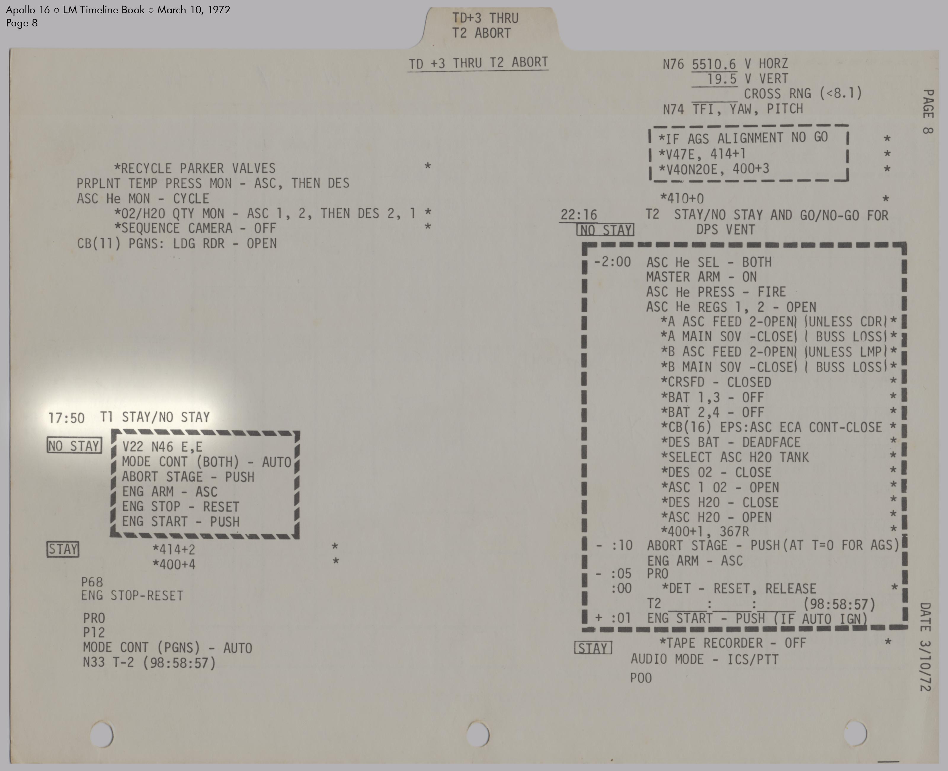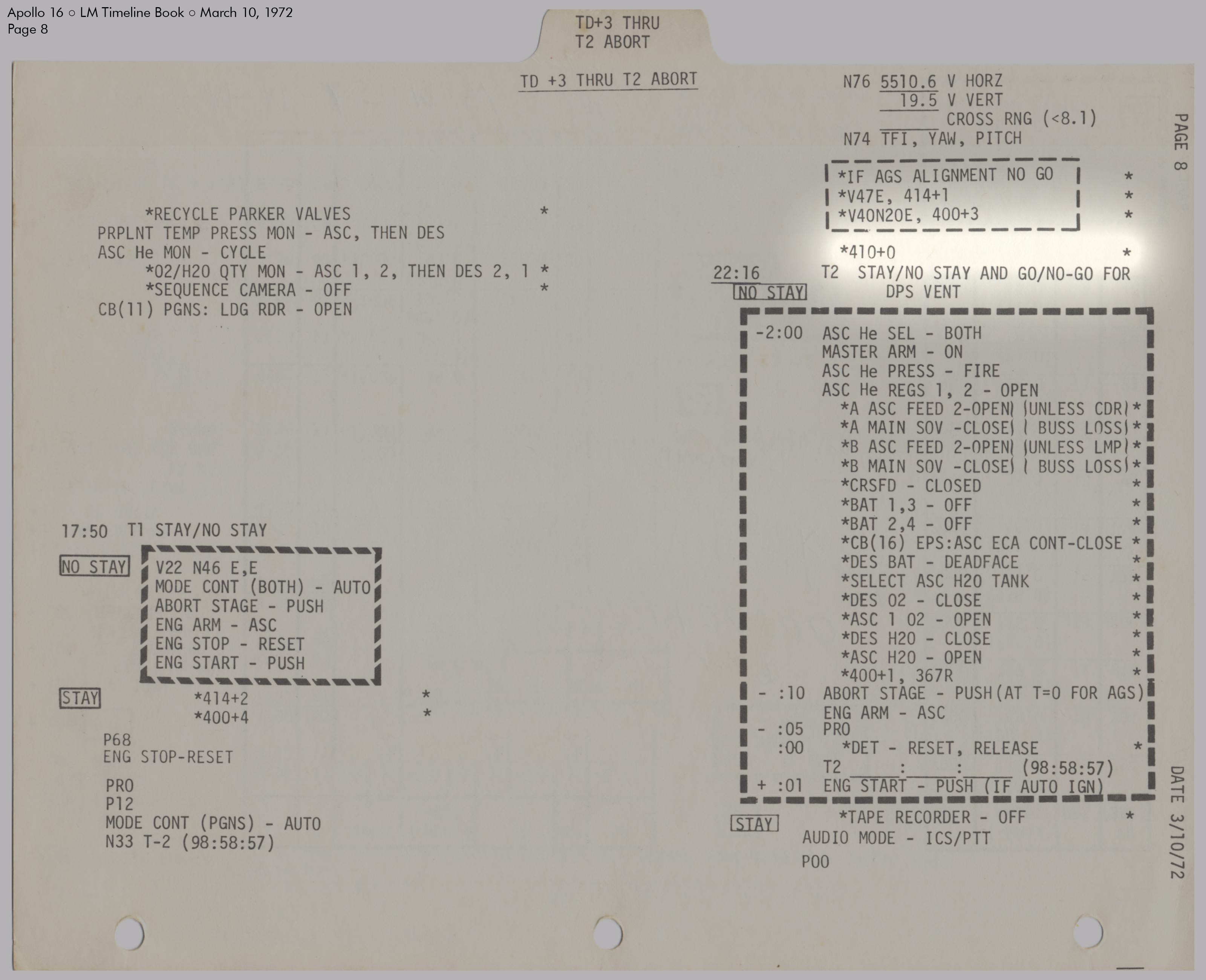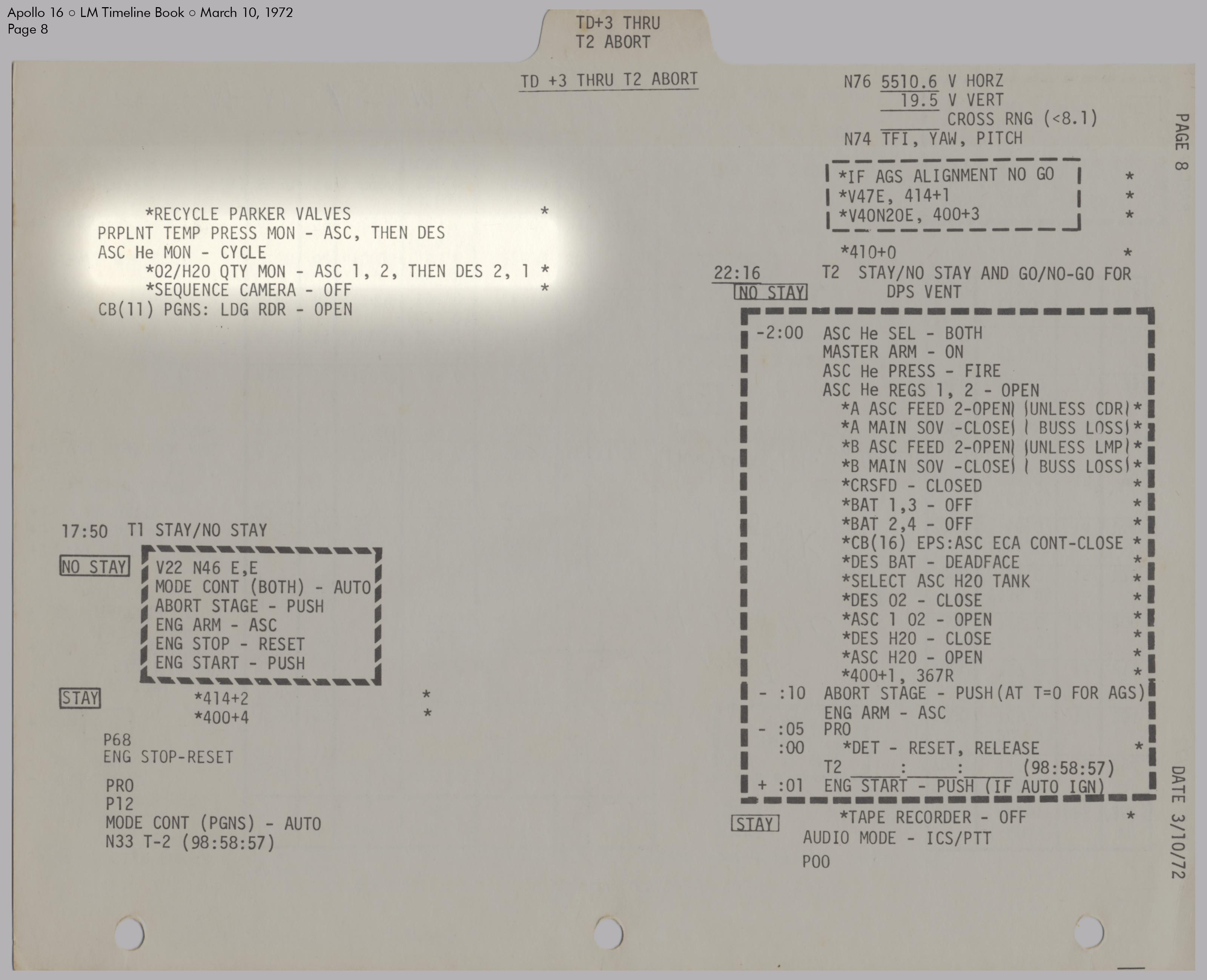 RCSReaction Control System, um die Treibstofftanks unter Druck zu setzen. Kurz darauf stellte er fest, dass der Druck in System A den Normalwert von 184 psi (12,7 bar) überstieg und sich mit 10 psi (0,7 bar) pro Minute weiter erhöhte. Einzelheiten dazu sind im Missionsbericht (Apollo 16 Mission Report), Abschnitt 9.6.3 Aktivierung und Überprüfung der Landefähre und Abschnitt 14.2.4 Leck im RCS‑Heliumdruckregler zu lesen. Um den Druck zu senken, leitete Young schrittweise einen Teil des Treibstoffs in die Tanks des Aufstiegsstufentriebwerks (APS