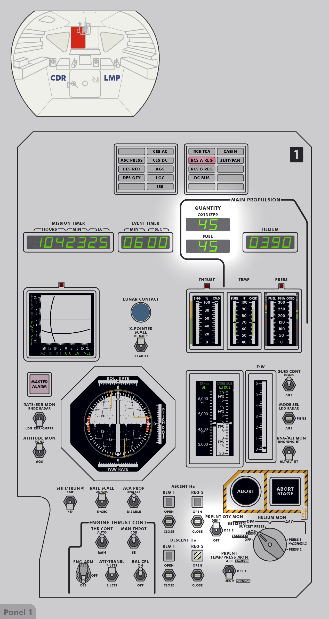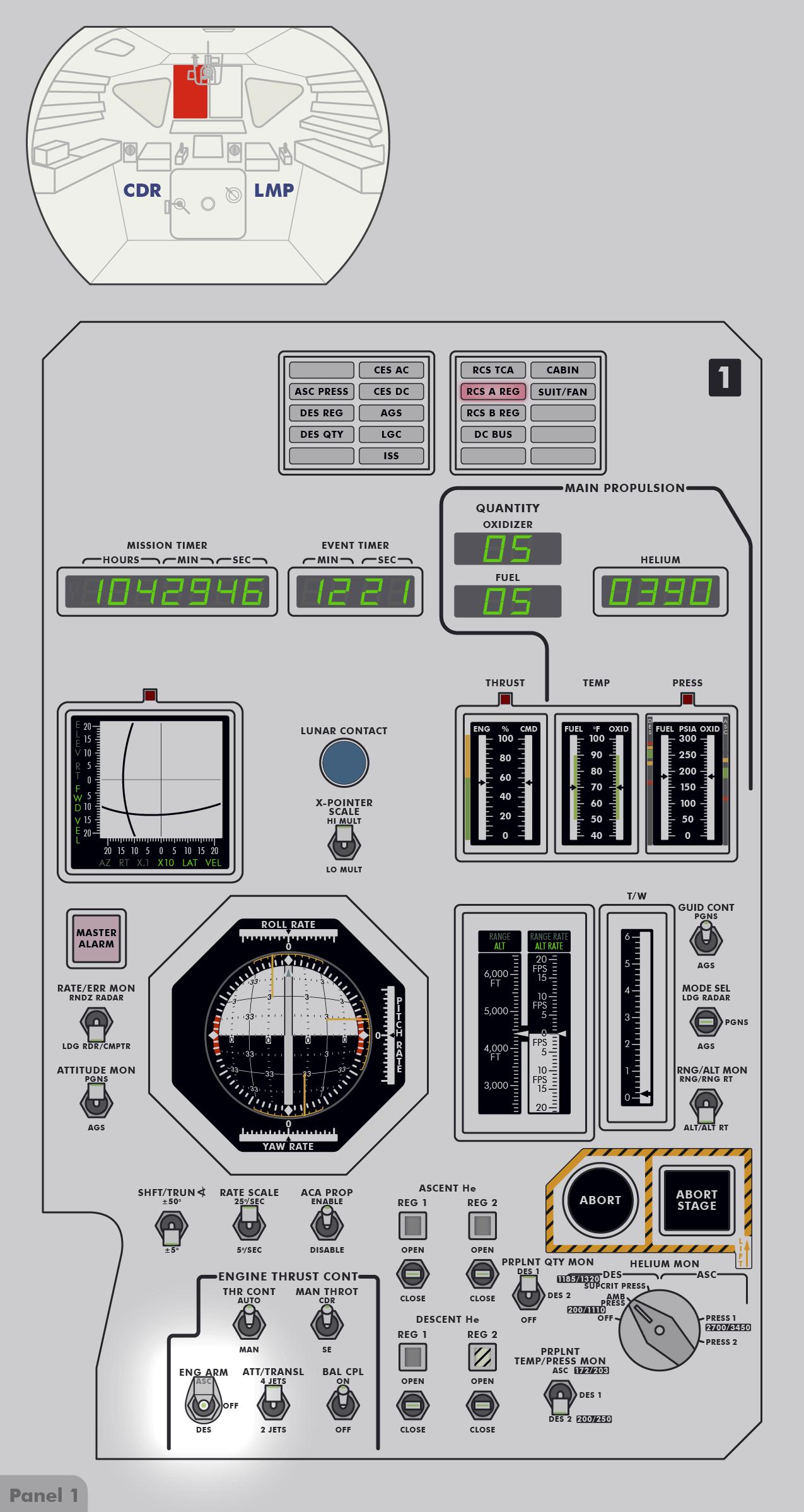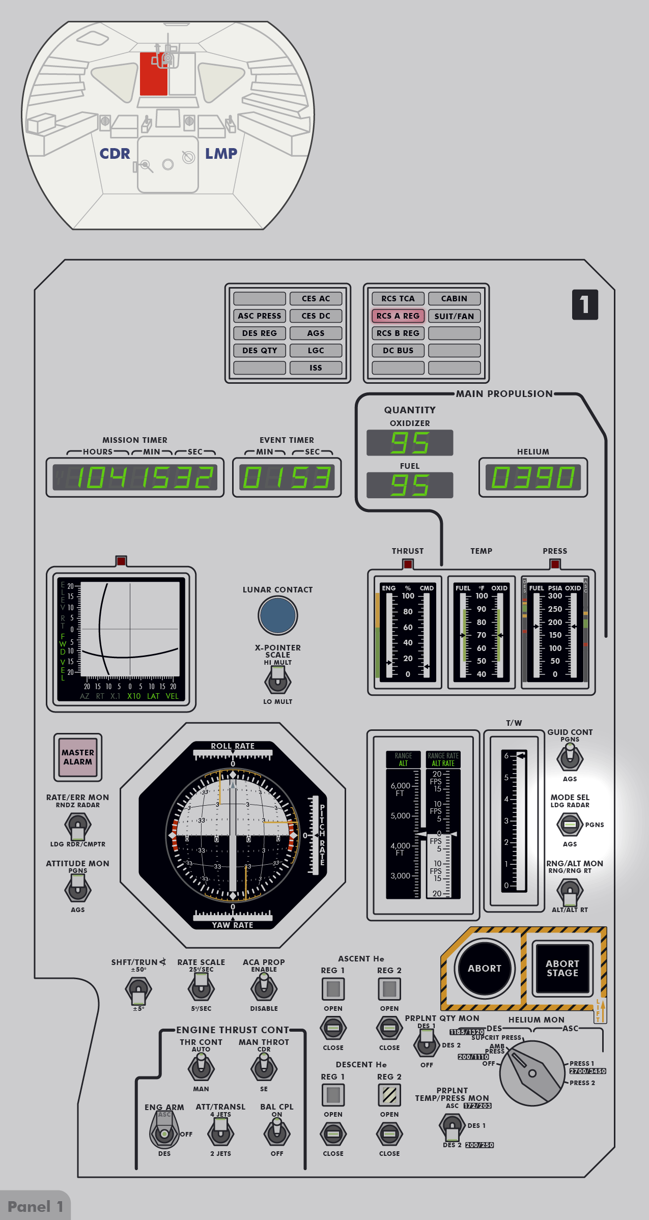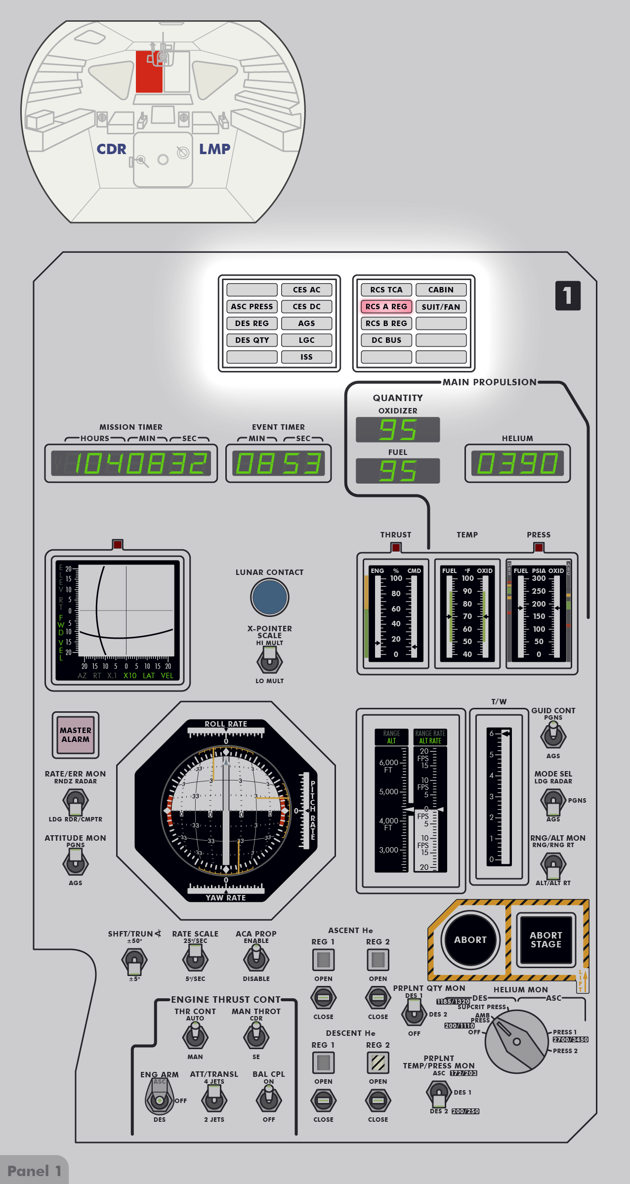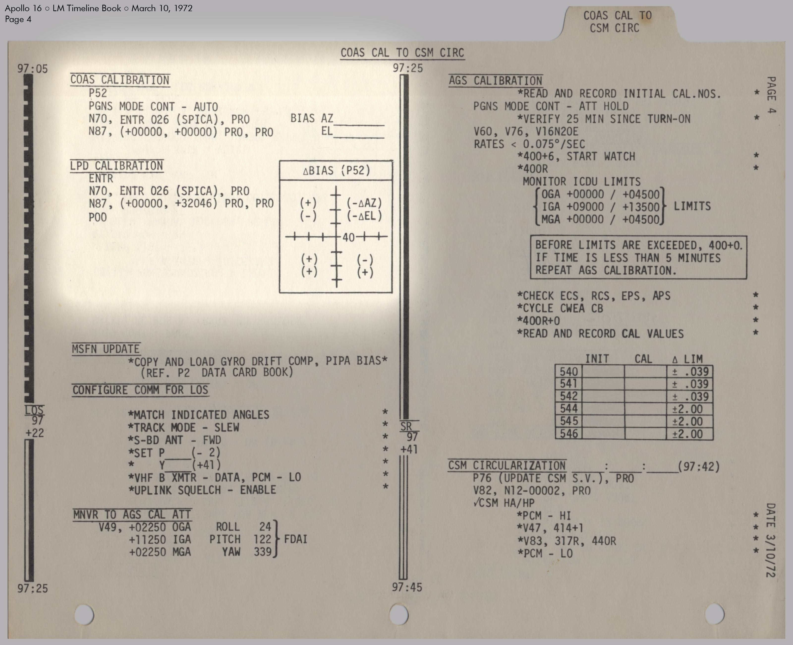 RCSReaction Control System, um die Treibstofftanks unter Druck zu setzen. Kurz darauf stellte er fest, dass der Druck in System A den Normalwert von 184 psi (12,7 bar) überstieg und sich mit 10 psi (0,7 bar) pro Minute weiter erhöhte. Einzelheiten dazu sind im Missionsbericht (Apollo 16 Mission Report), Abschnitt 9.6.3 Aktivierung und Überprüfung der Landefähre und Abschnitt 14.2.4 Leck im RCS‑Heliumdruckregler zu lesen. Um den Druck zu senken, leitete Young schrittweise einen Teil des Treibstoffs in die Tanks des Aufstiegsstufentriebwerks (APS