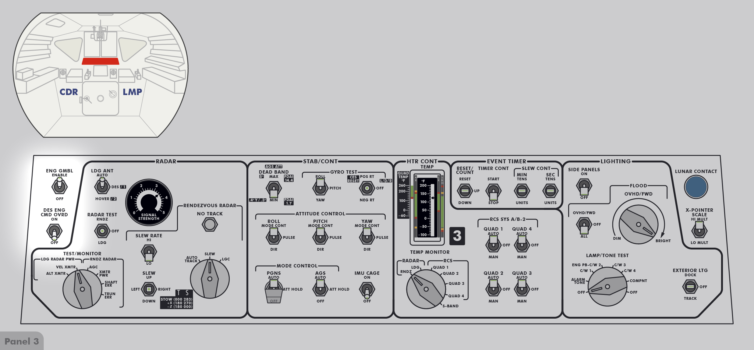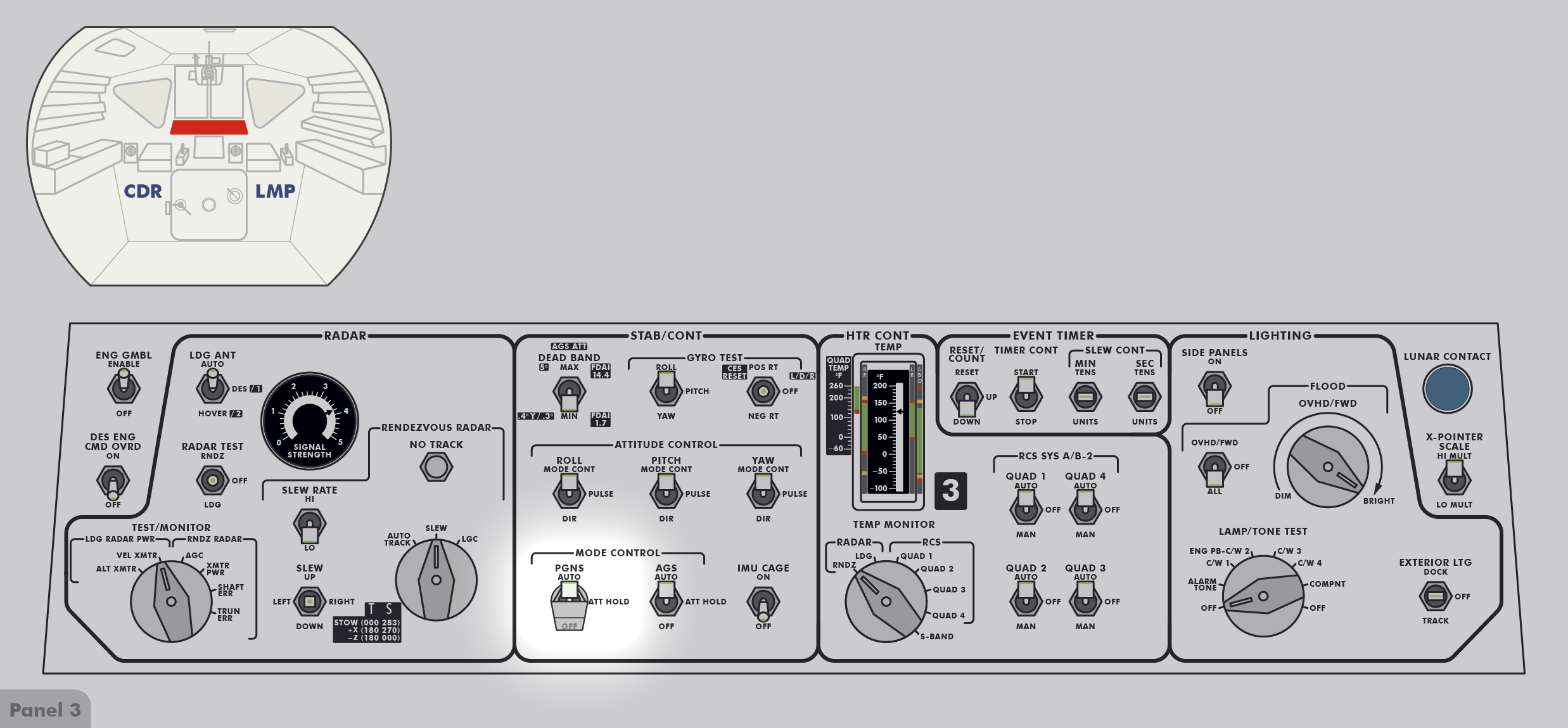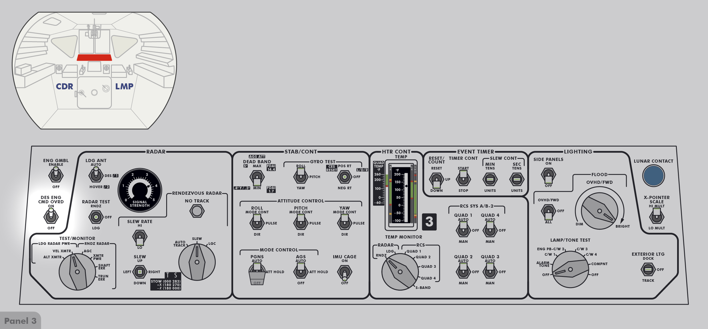 LMLunar Module bedeutet dies für die nach vorn blickende Besatzung: Rollen ist eine Rotation um die Achse von hinten zur vorderen Luke, Neigen ist eine Rotation um die Achse von links nach rechts und Gieren/Schwenken ist eine Rotation um die Achse von unten nach oben zum Andockadapter.