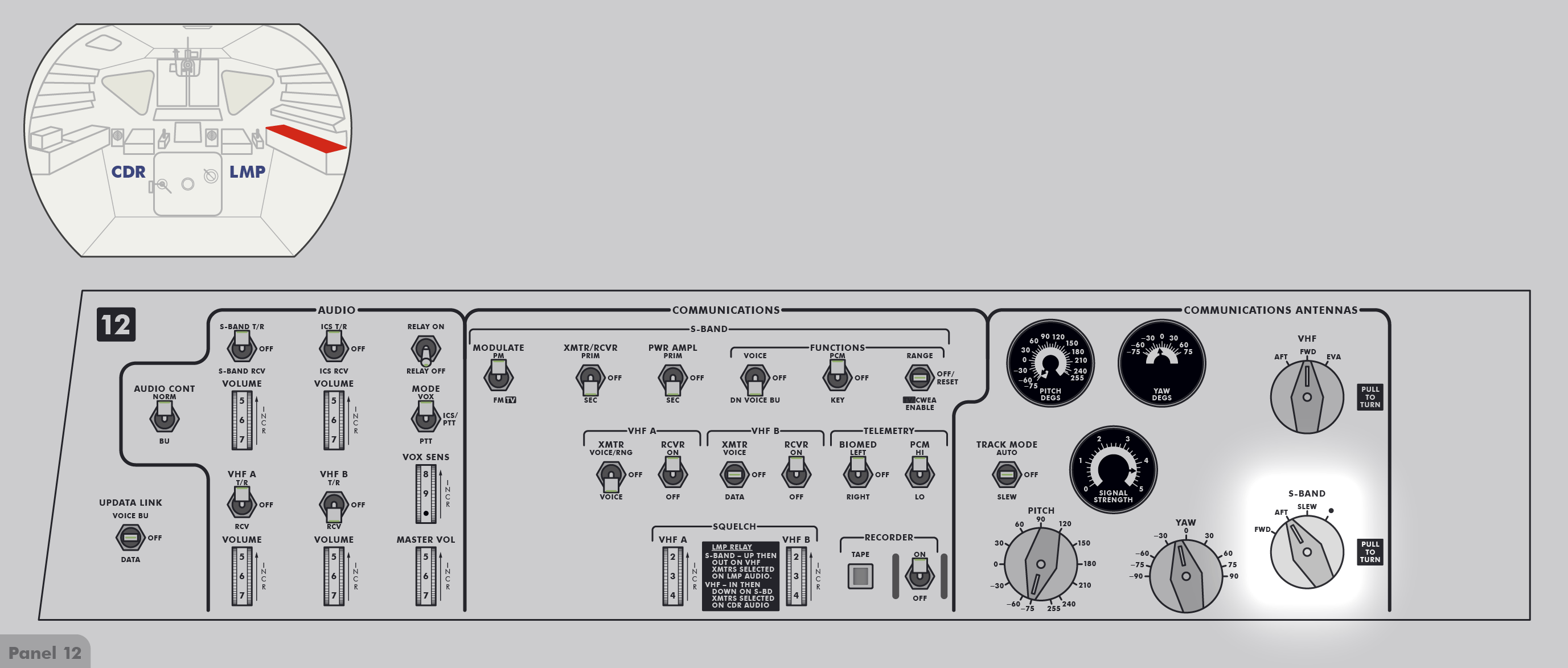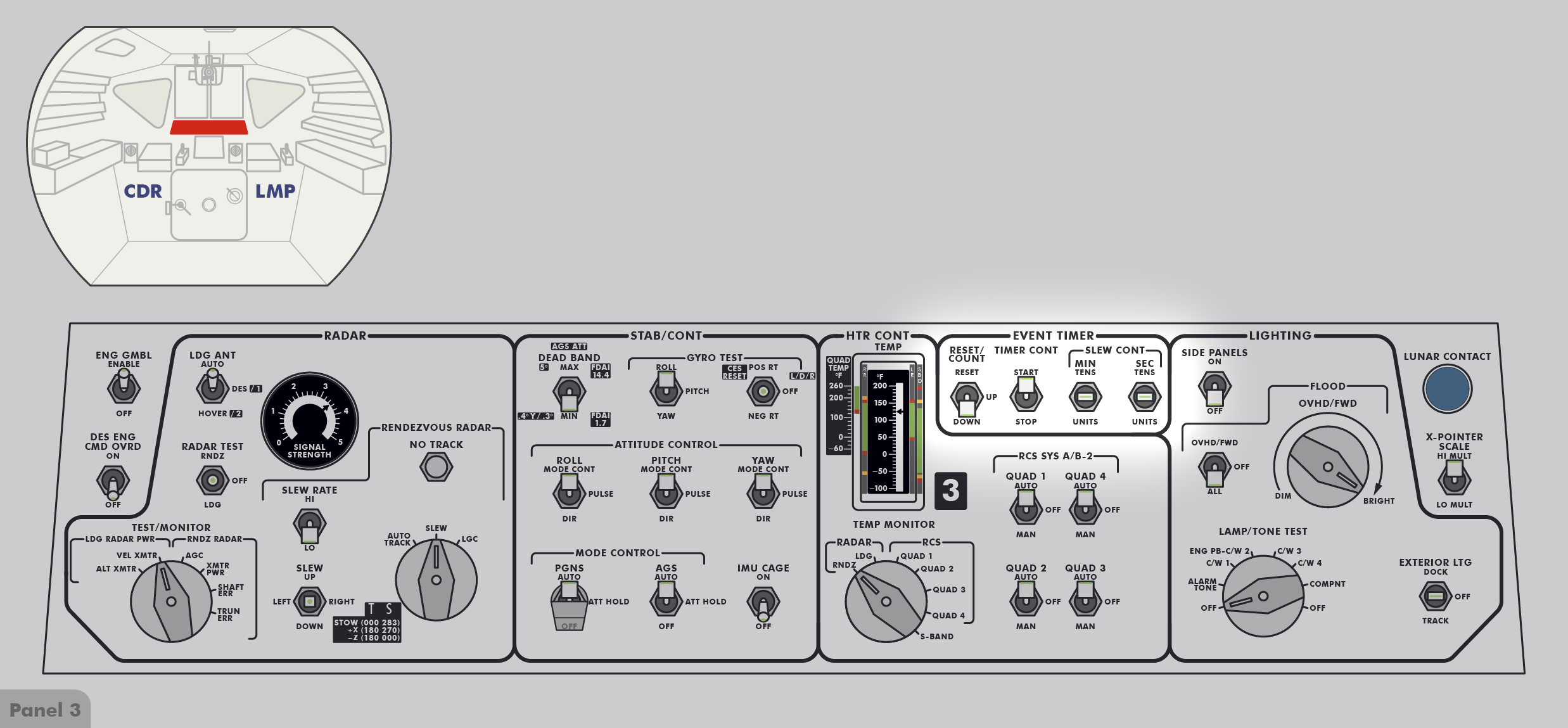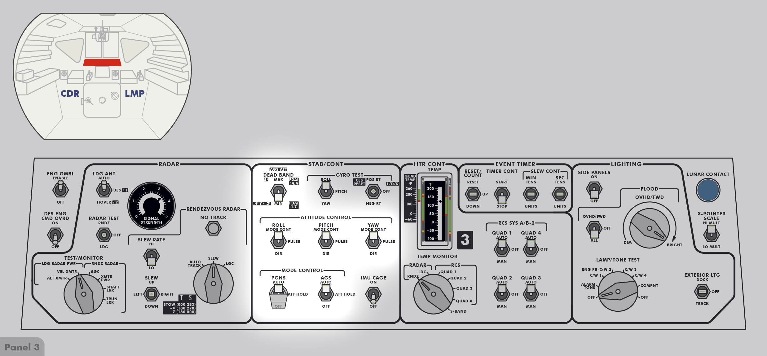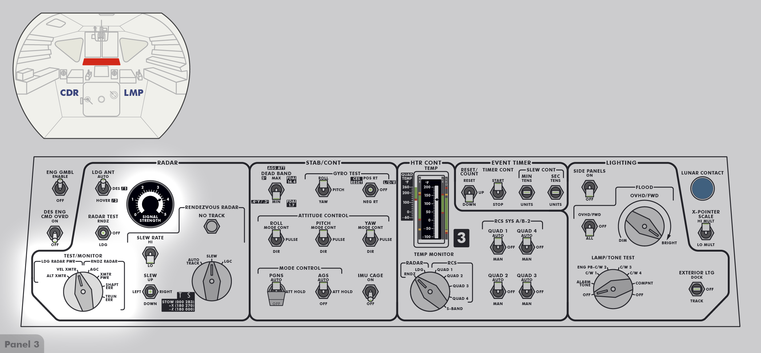 LMLunar Module bedeutet dies für die nach vorn blickende Besatzung: Rollen ist eine Rotation um die Achse von hinten zur vorderen Luke, Neigen ist eine Rotation um die Achse von links nach rechts und Gieren/Schwenken ist eine Rotation um die Achse von unten nach oben zum Andockadapter.