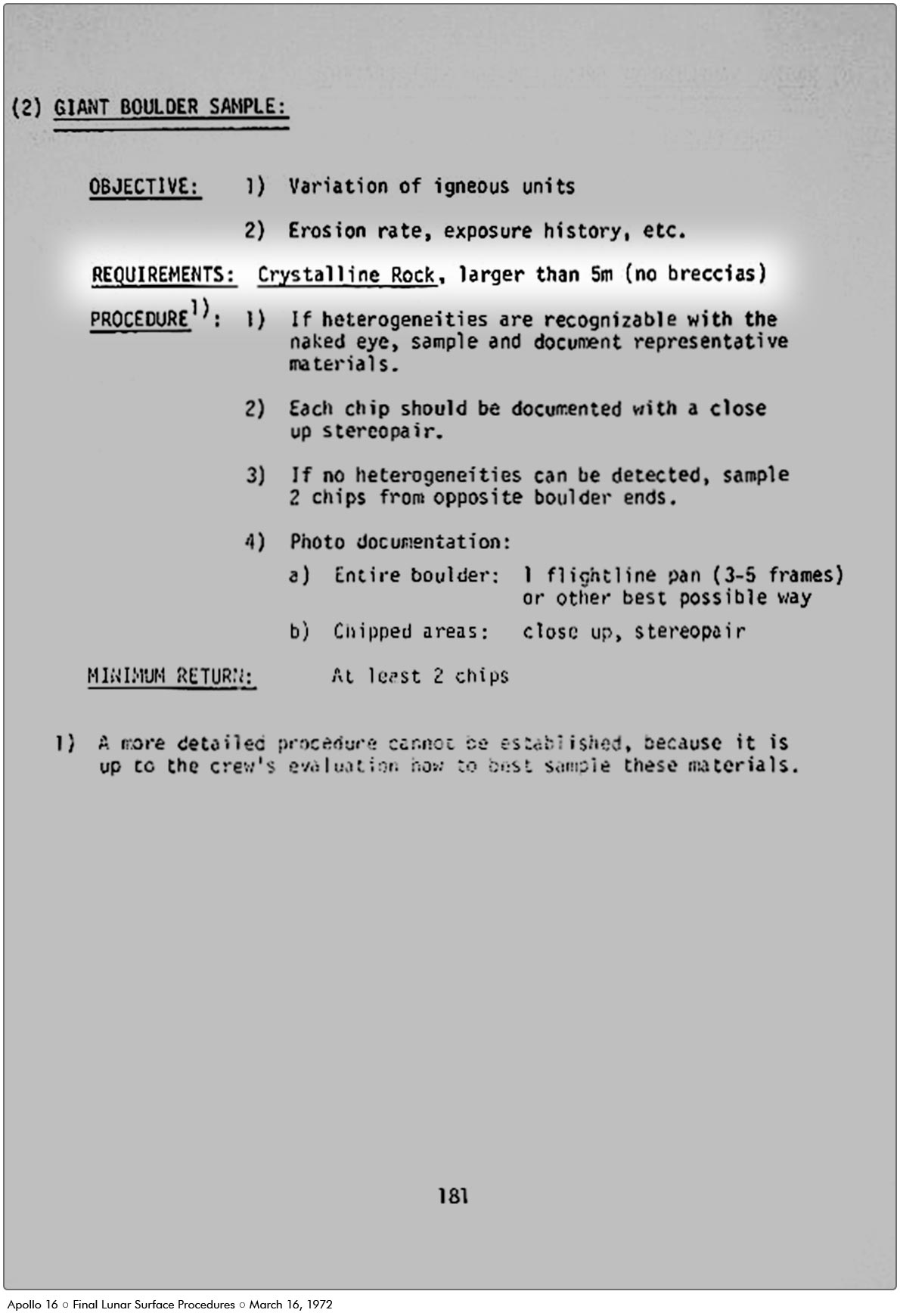 MOCRMission Operations Control Room) aus die Fernsehkamera steuerte, behielt Young und Duke im Bild, wobei er den Zoom stetig vergrößerte. Dadurch wurden die Astronauten auf dem ersten Teil des Weges nicht kleiner, der Felsen dagegen wuchs, bis er die obere Bildhälfte einnahm. Wirklich ein Koloss. Als Duke dort ankam, sagte er: … hier haben wir euren hausgroßen Felsen.