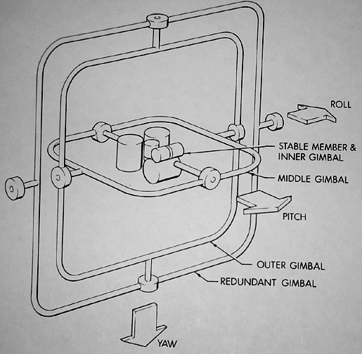 [Armstrong - "This is Mike at his best. We had a four-gimbal platform on Gemini."]The following is taken from an April 1963 MIT Instrumentation Laboratory Document, E-1344, 'Apollo Guidance and Navigation: Consideration of Apollo IMU Gimbal Lock' by David Hoag. "The difficulties near gimbal lock can be avoided by the addition of a fourth gimbal to the IMU. This will be called here the redundant gimbal since it provides more degrees of freedom than theoretically necessary. This redundant gimbal will be considered in this memo to be mounted outside the normal outer gimbal. The order used in this description is then: inner, middle, outer, and redundant. The most likely operation would use the inner three gimbals to drive the stabilizing gyro error signals to zero while the fourth if driven so as to keep the middle gimbal near zero and away from the gimbal lock orientation. This can be done by generating a redundant gimbal rate command by expressions similar to