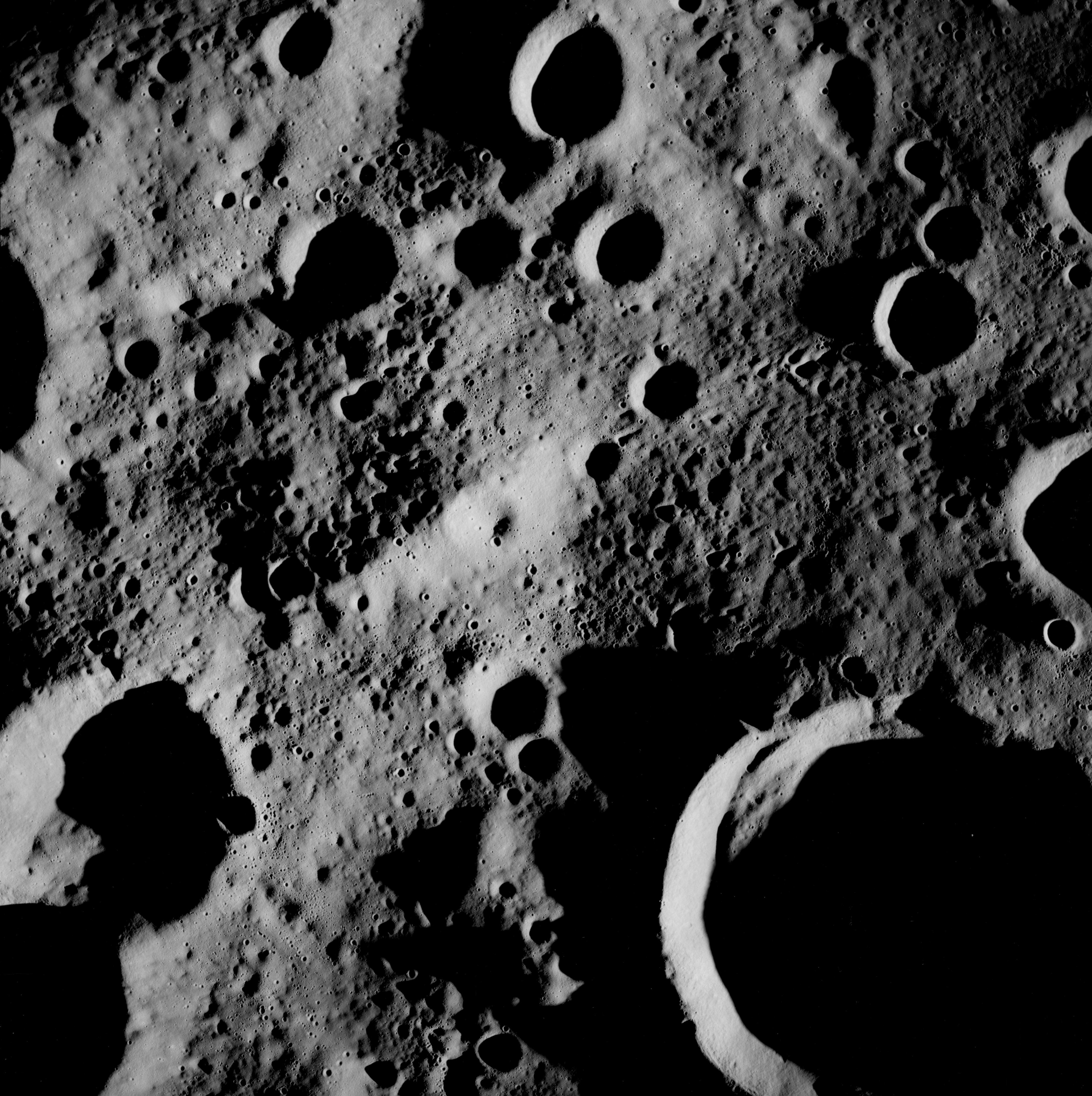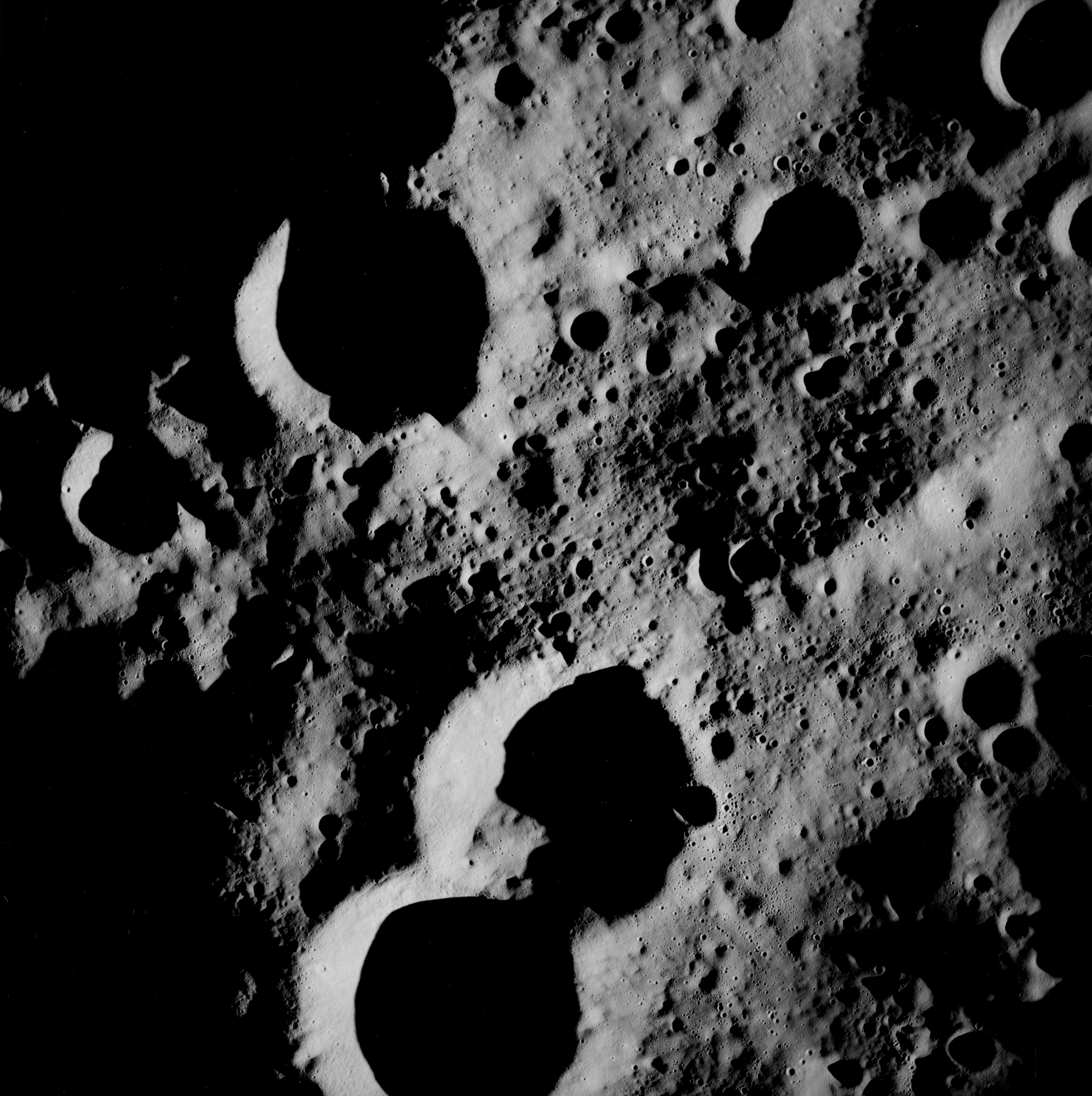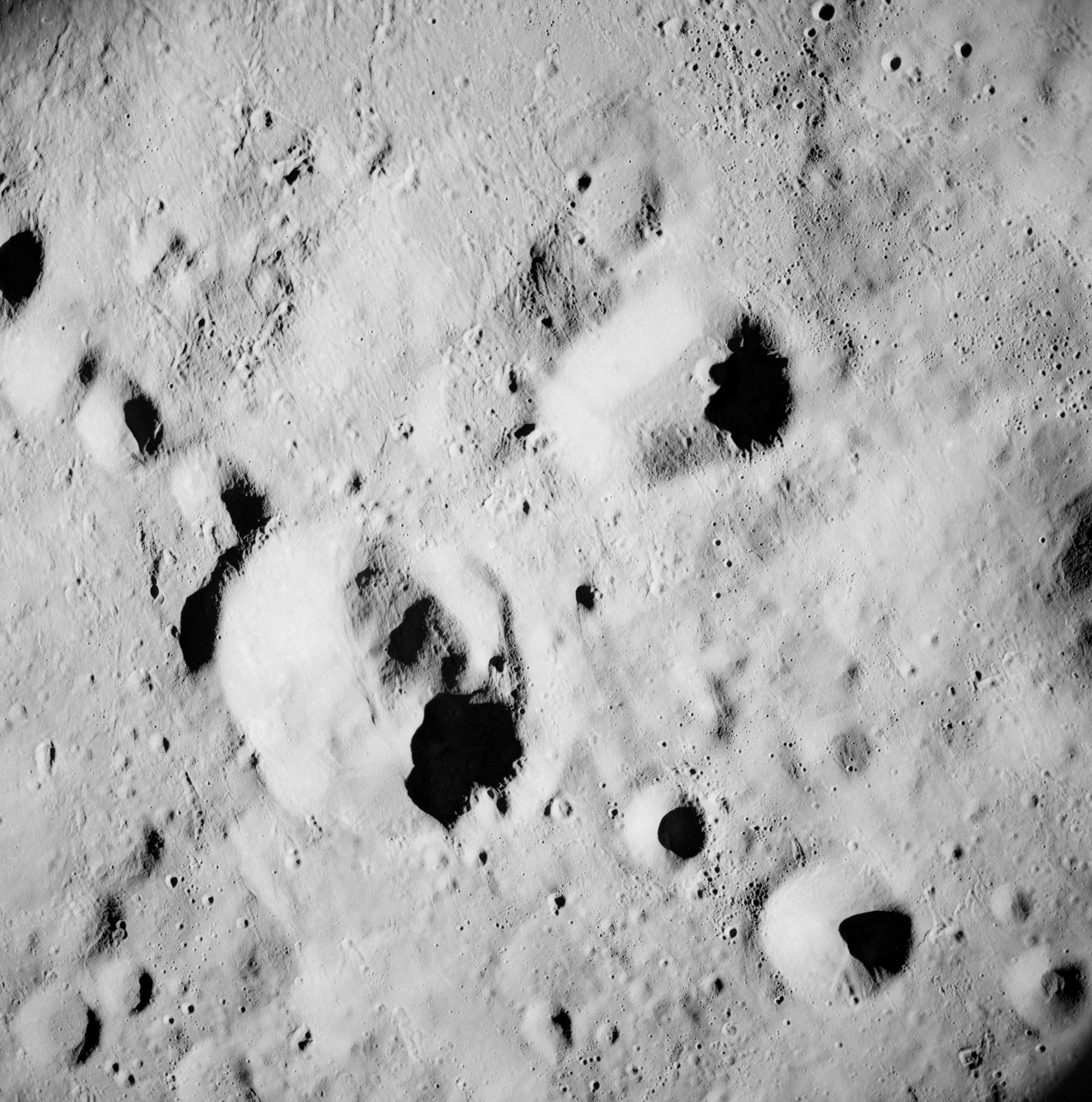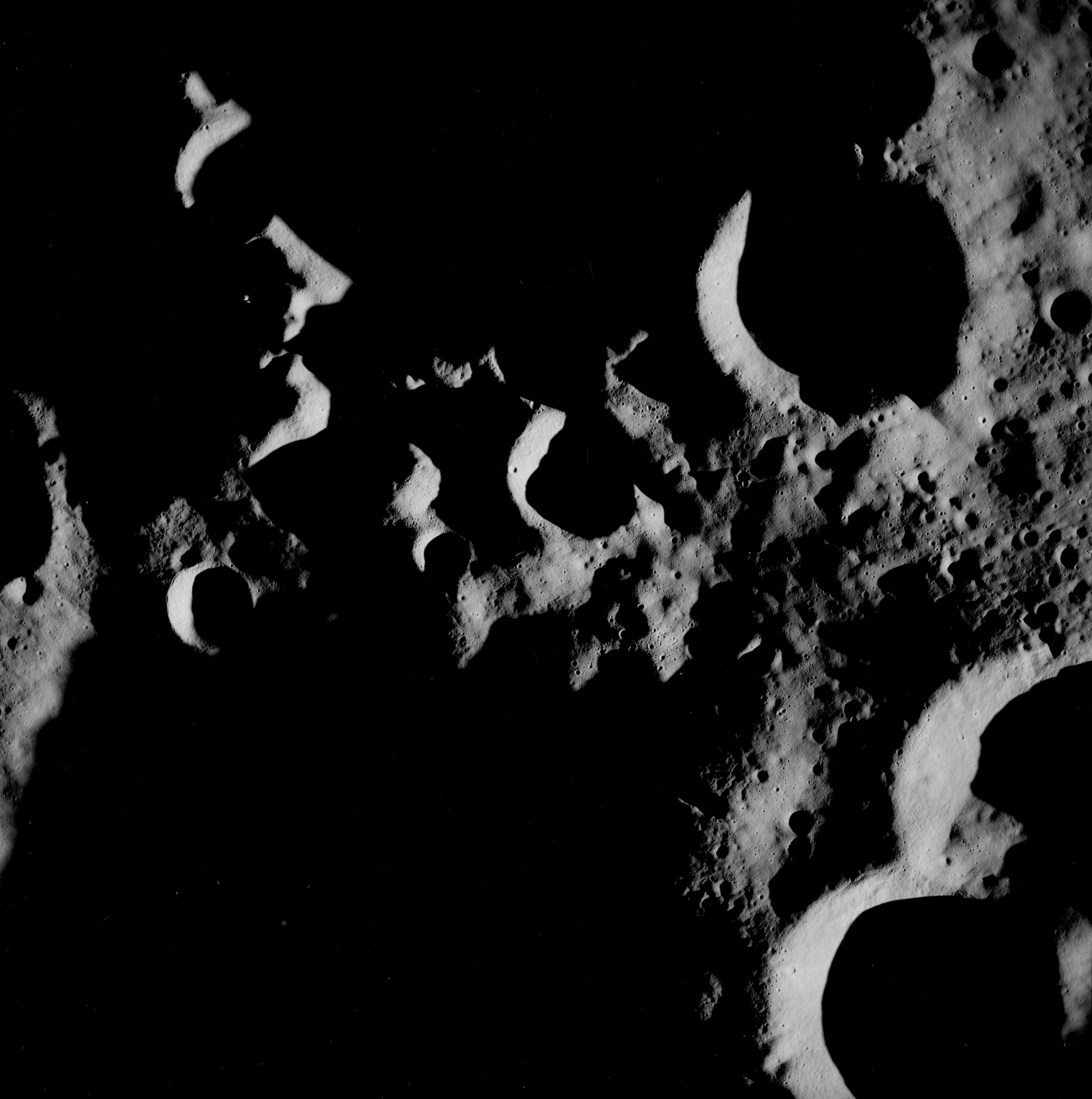 Continuing Bill's vertical stereo sequence, this image is a composite of frames AS08-12-2106 to 2123 with crater Chauvenet being the main feature. The high-angle lighting, however, renders the crater almost invisible with the smaller, fresher craters dominating the landscape. The image centreline runs along the 12°S line of latitude between the lines of longitude 152°E on the right and 133°E on the left.