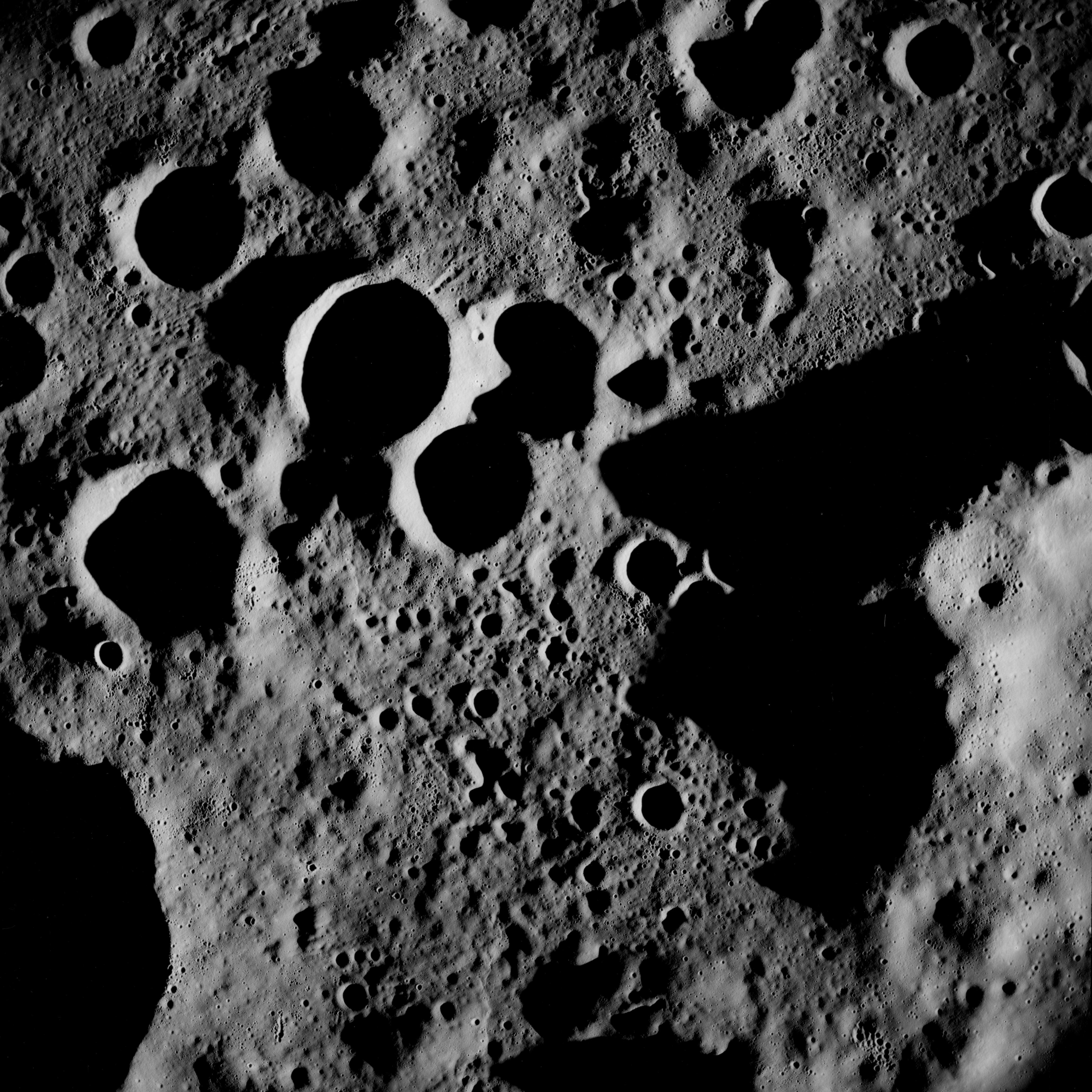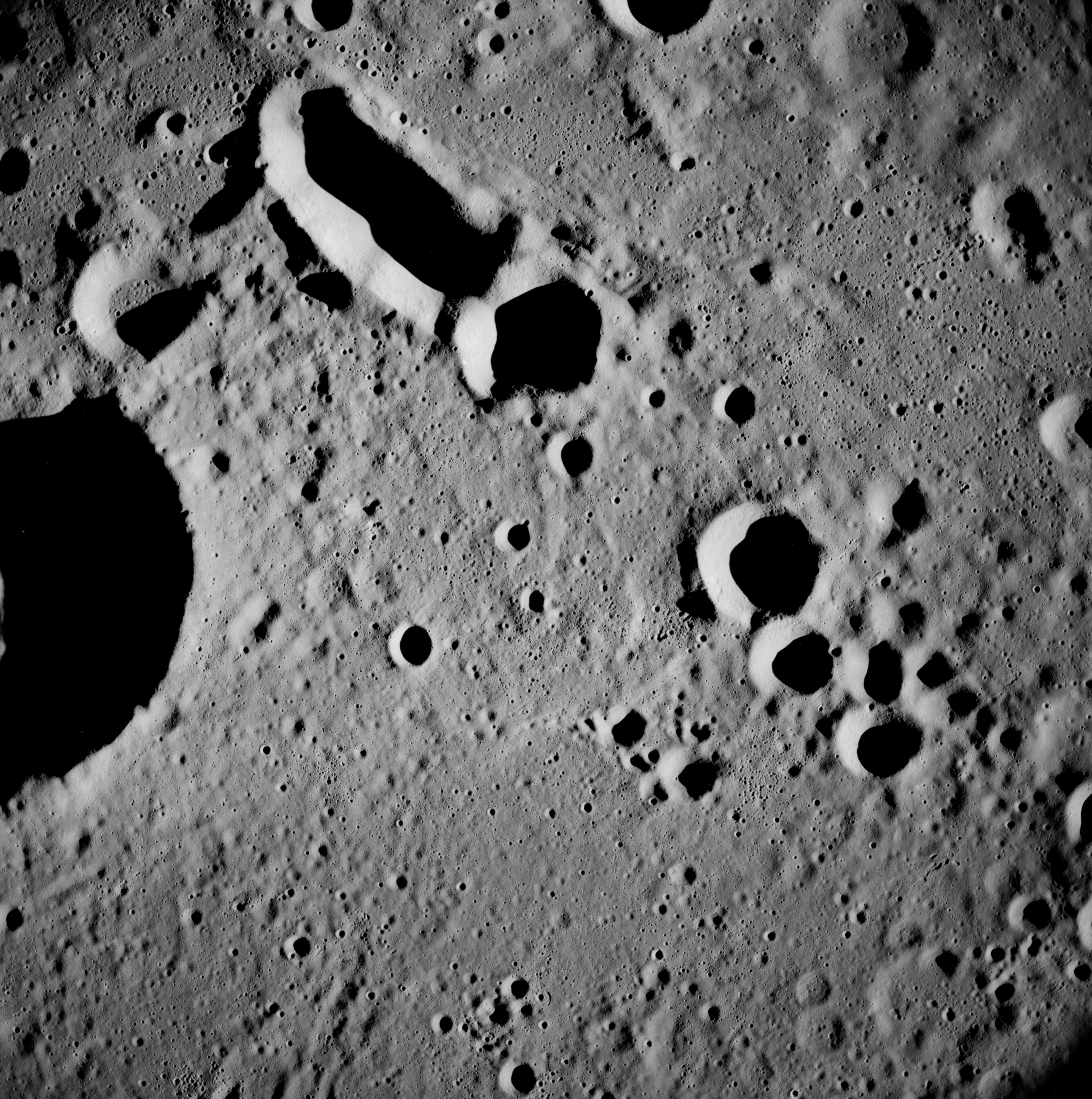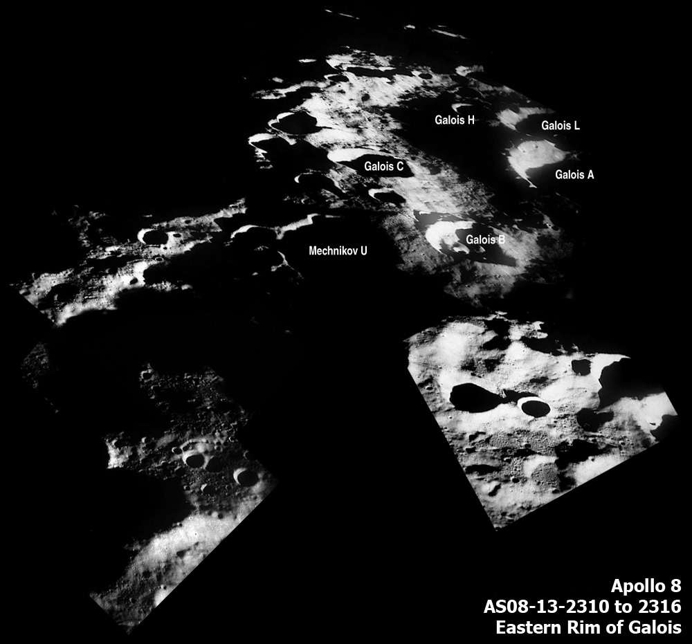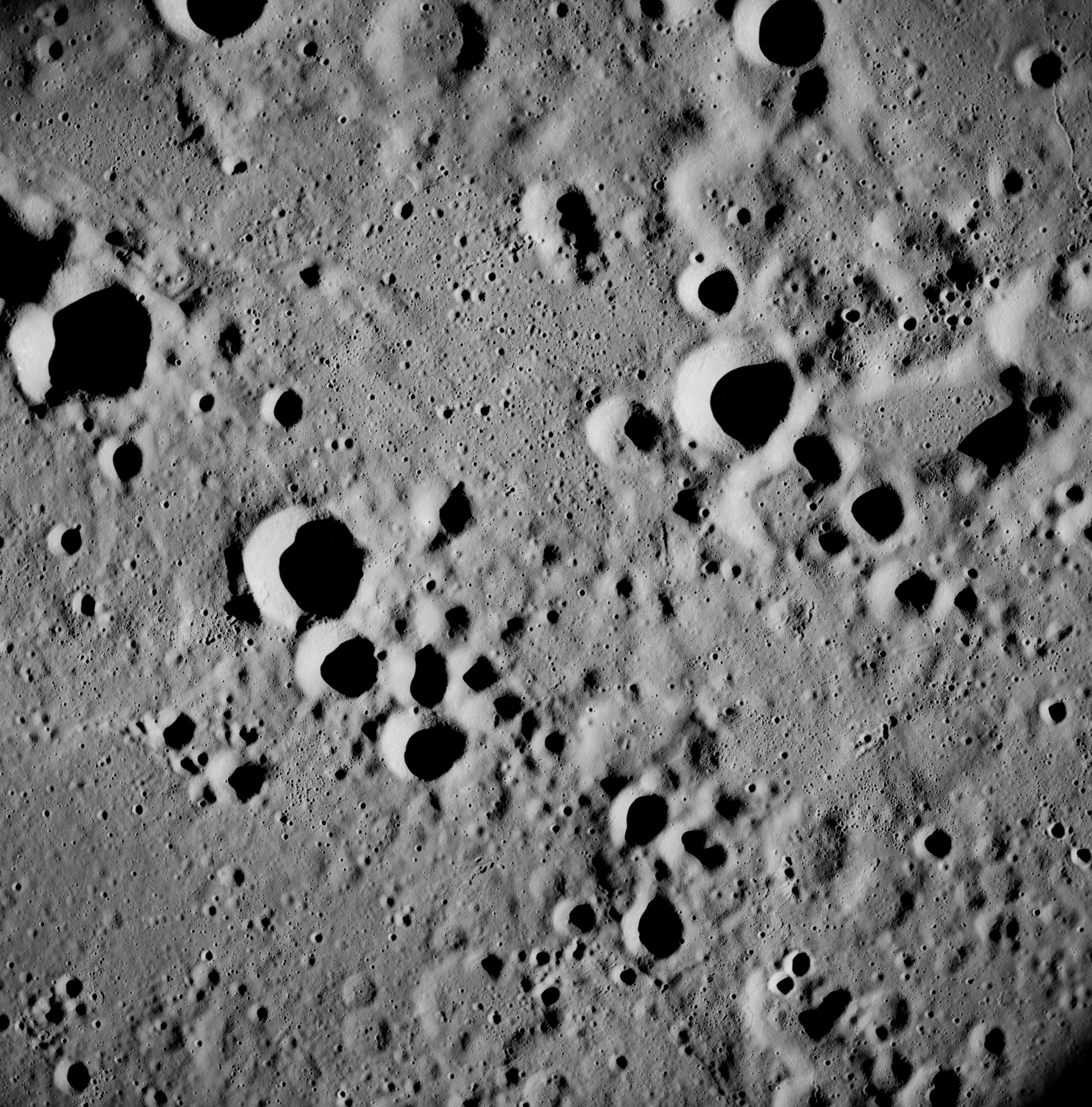 Continuing Bill's vertical stereo sequence, this image is a composite of frames AS08-12-2106 to 2123 with crater Chauvenet being the main feature. The high-angle lighting, however, renders the crater almost invisible with the smaller, fresher craters dominating the landscape. The image centreline runs along the 12°S line of latitude between the lines of longitude 152°E on the right and 133°E on the left.