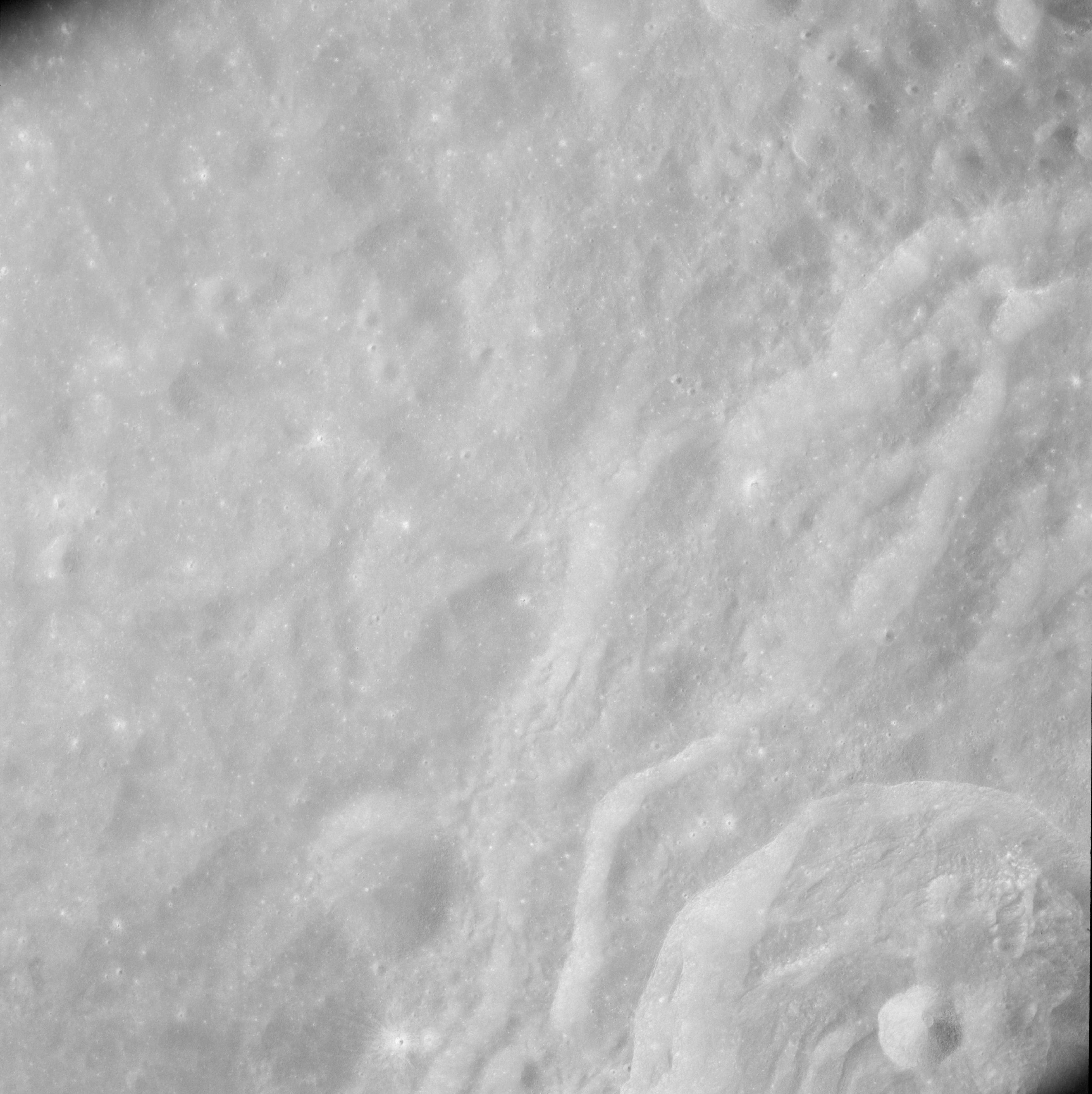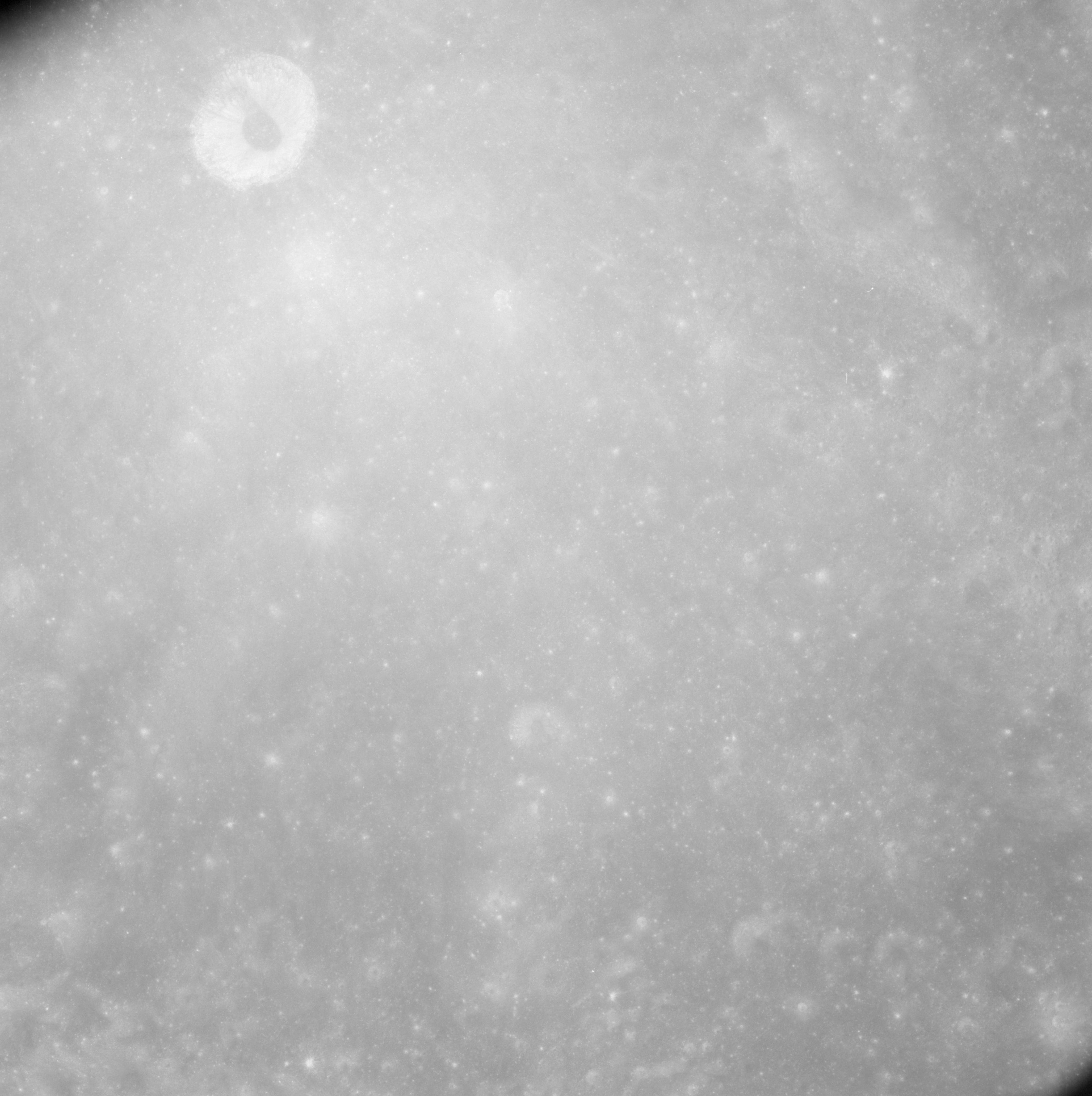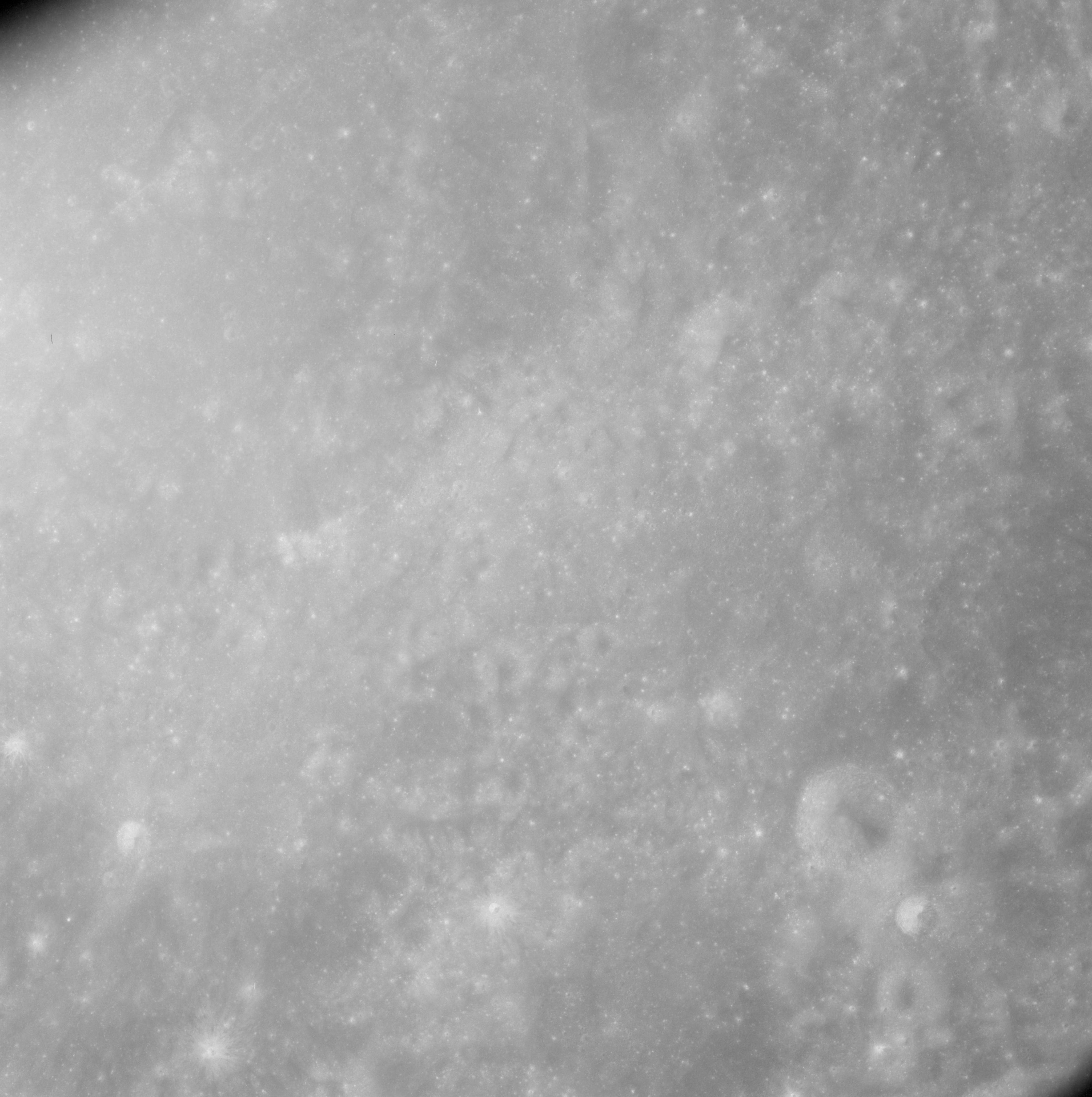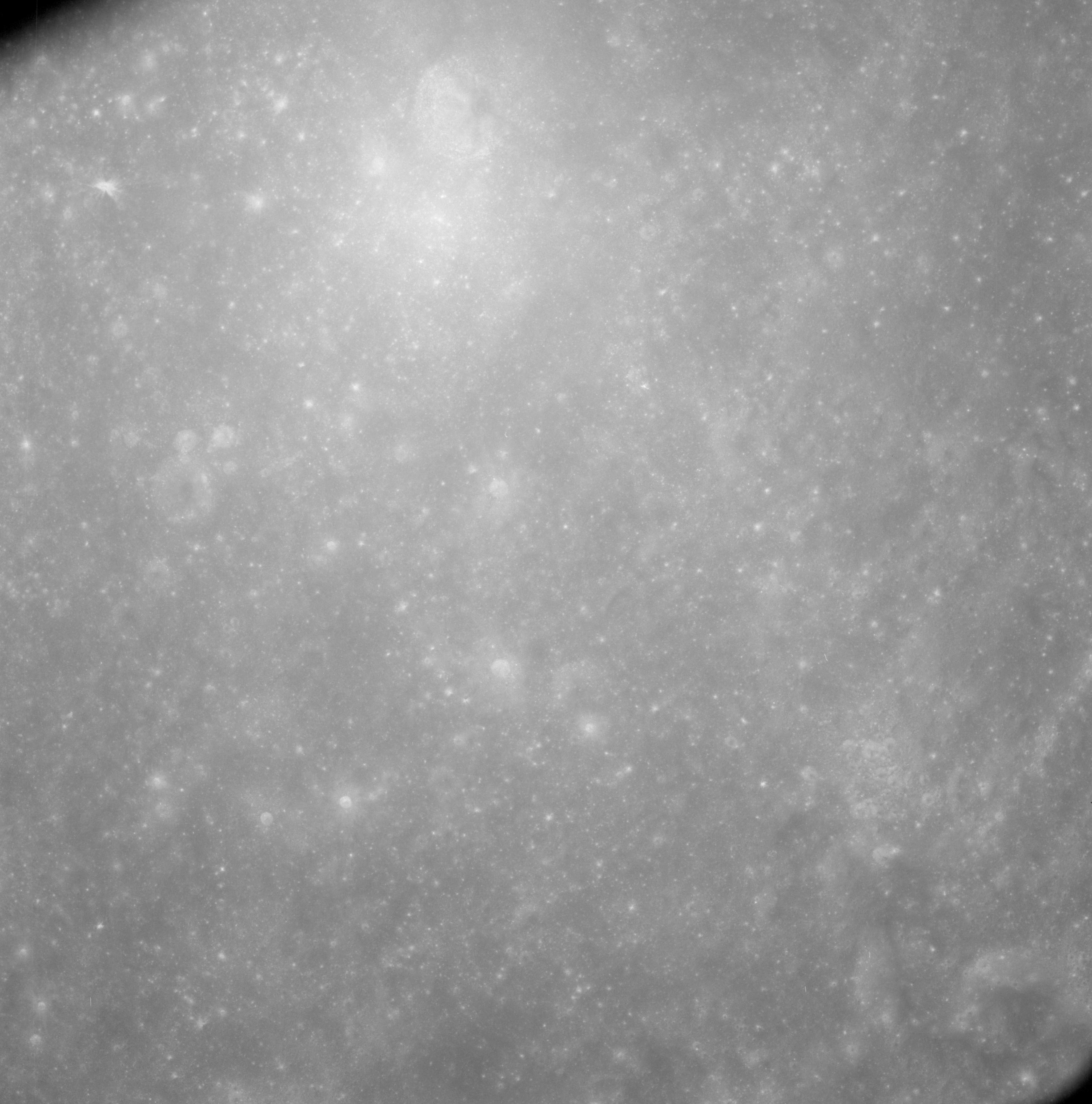 Composited image of frames AS08-12-2124 to 2135. There is essentially no visible relief and in our compositing work, we have tried to dodge around the zero-phase bright spots that each individual image exhibited. Craters Danjon and Shirakatsi, though large and important in this region, are difficult to spot.