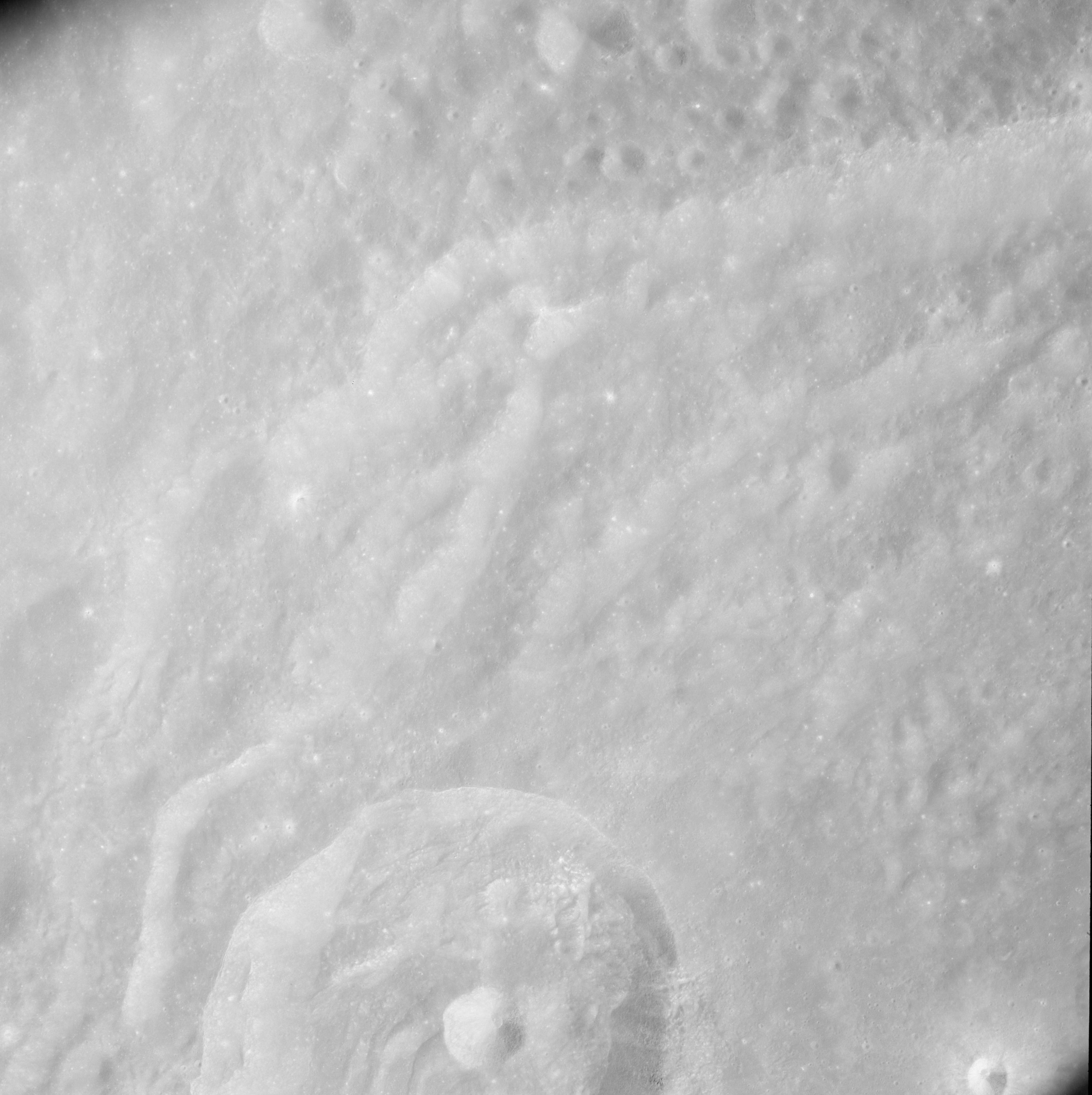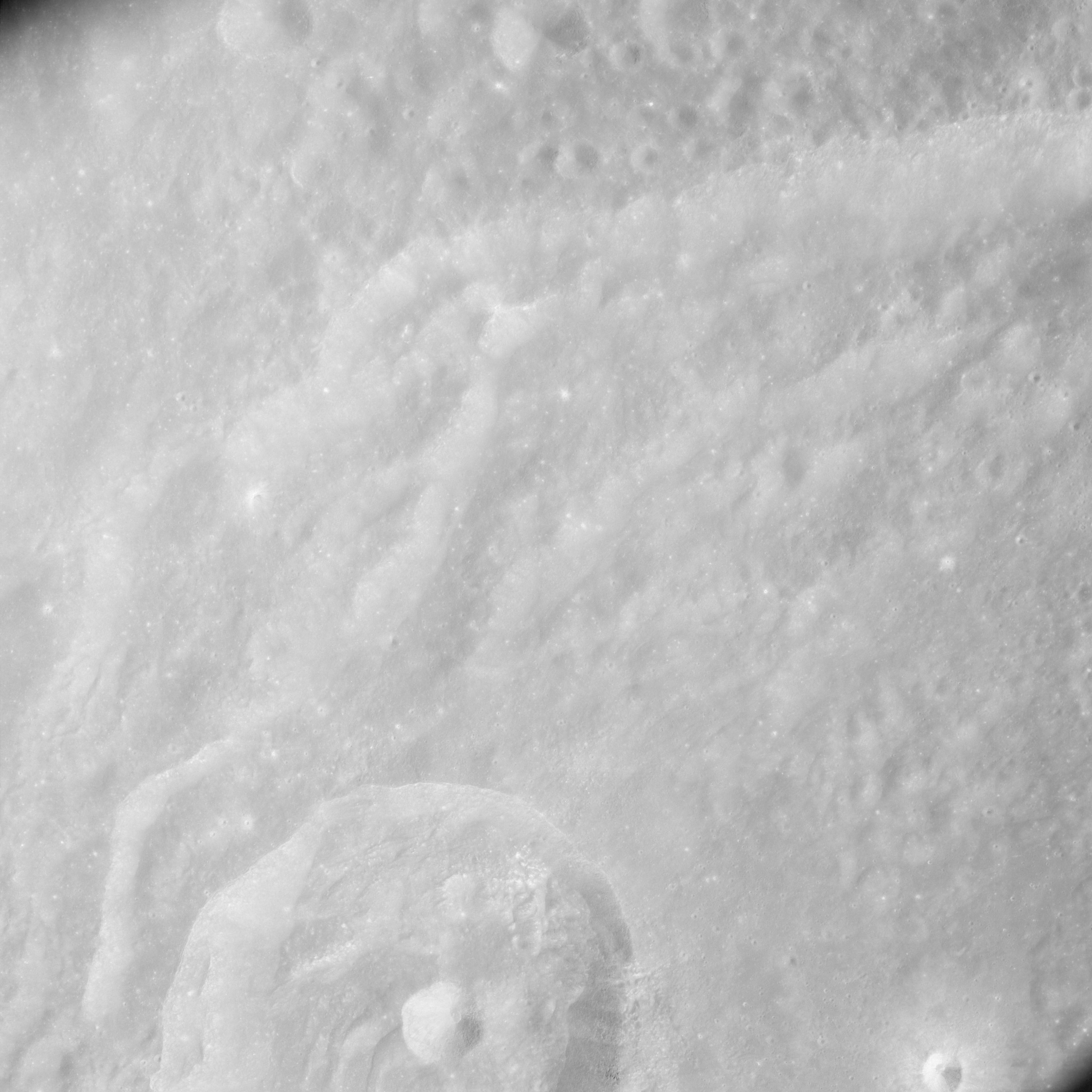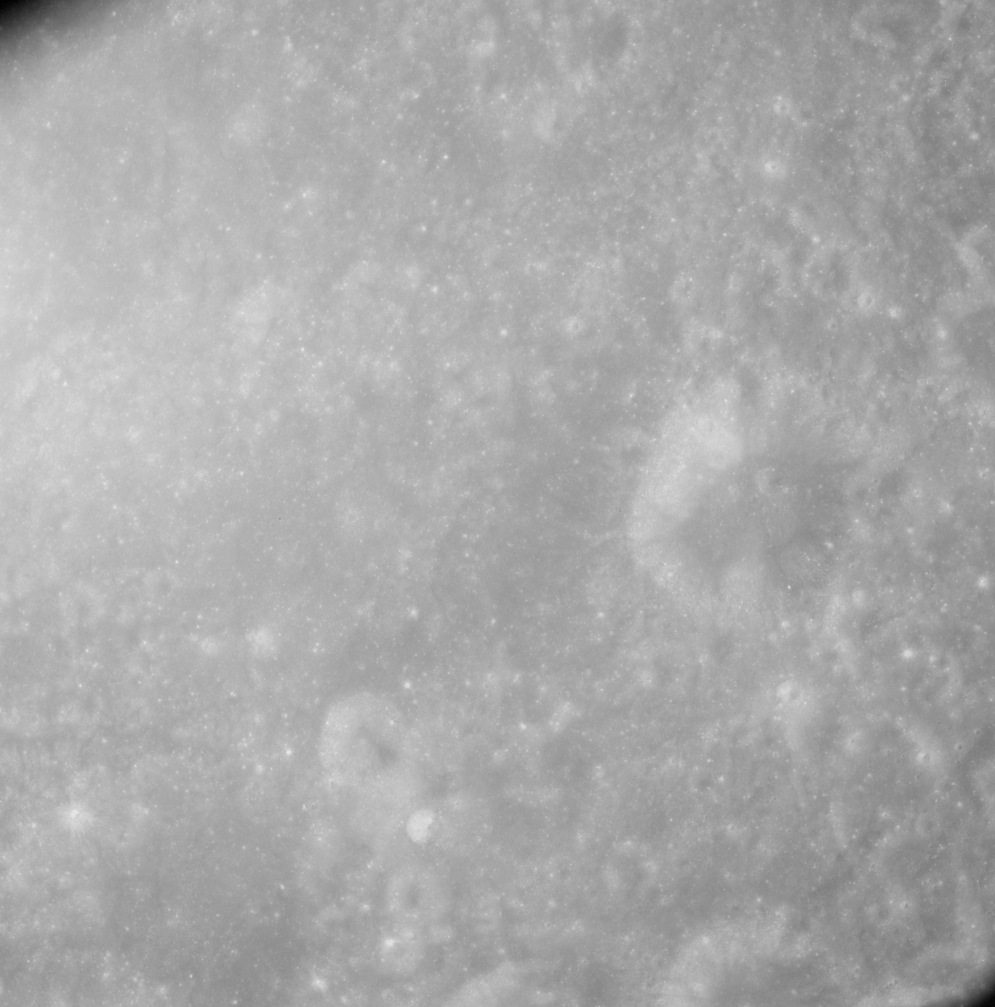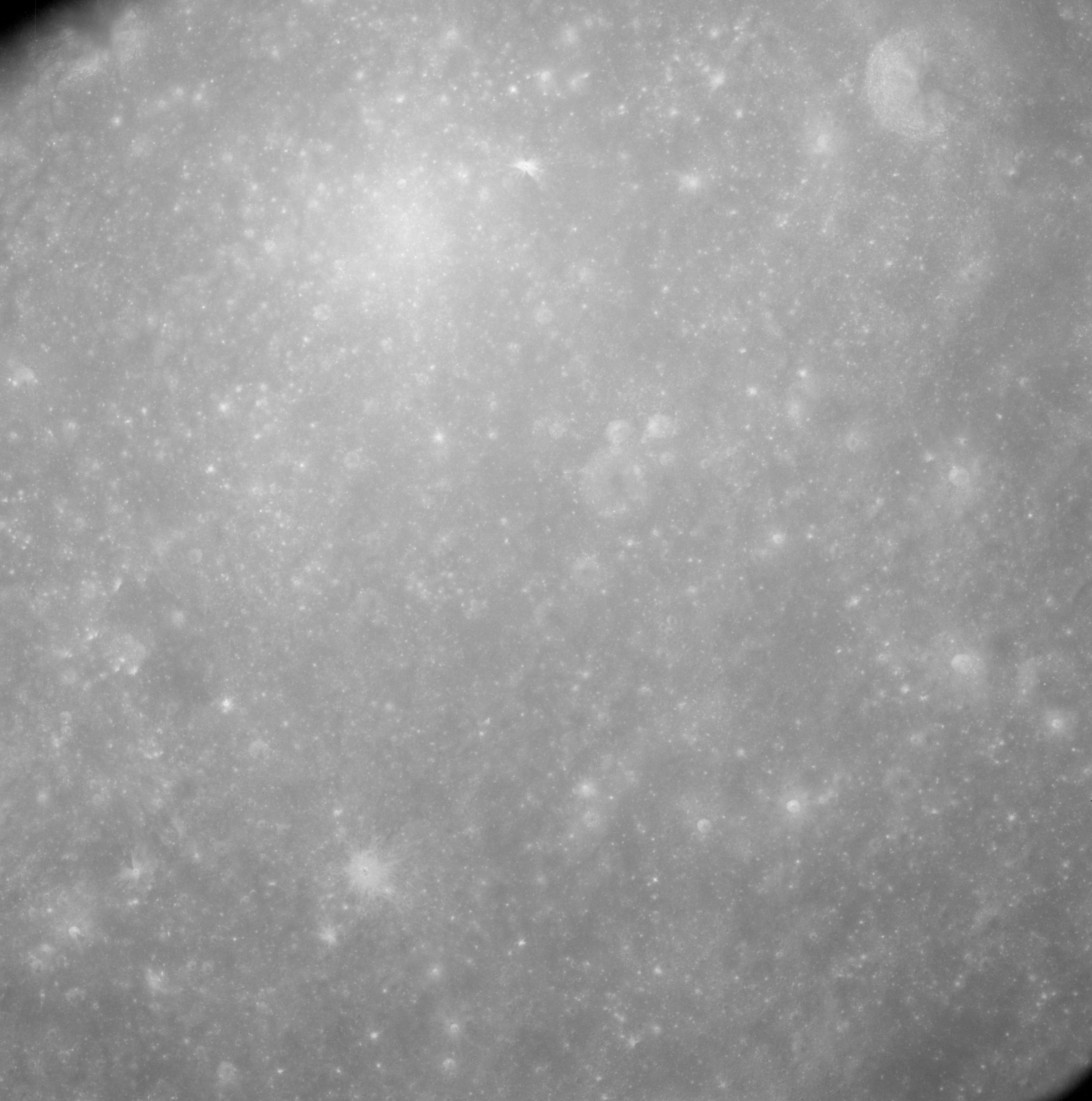 Composited image of frames AS08-12-2124 to 2135. There is essentially no visible relief and in our compositing work, we have tried to dodge around the zero-phase bright spots that each individual image exhibited. Craters Danjon and Shirakatsi, though large and important in this region, are difficult to spot.