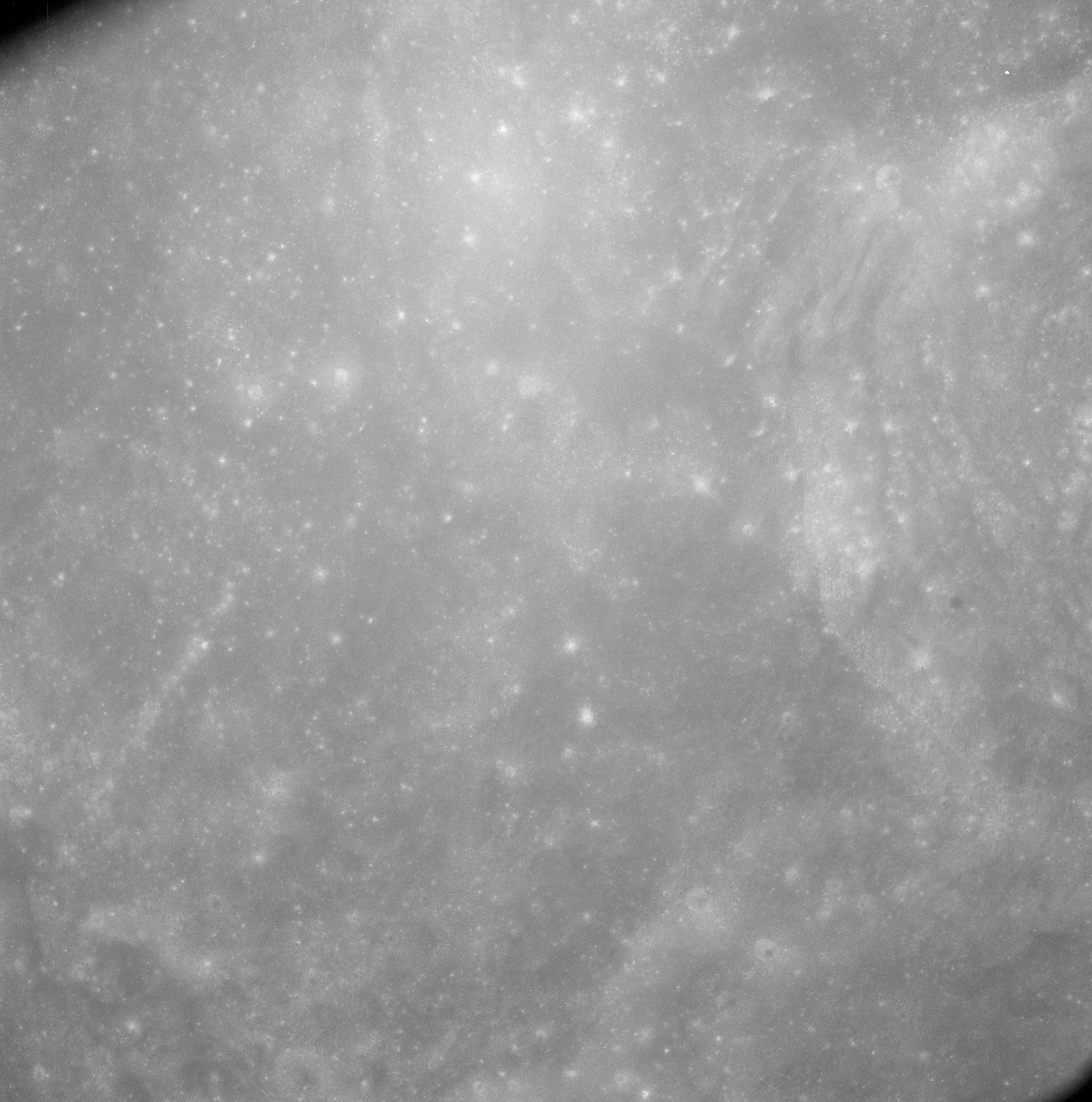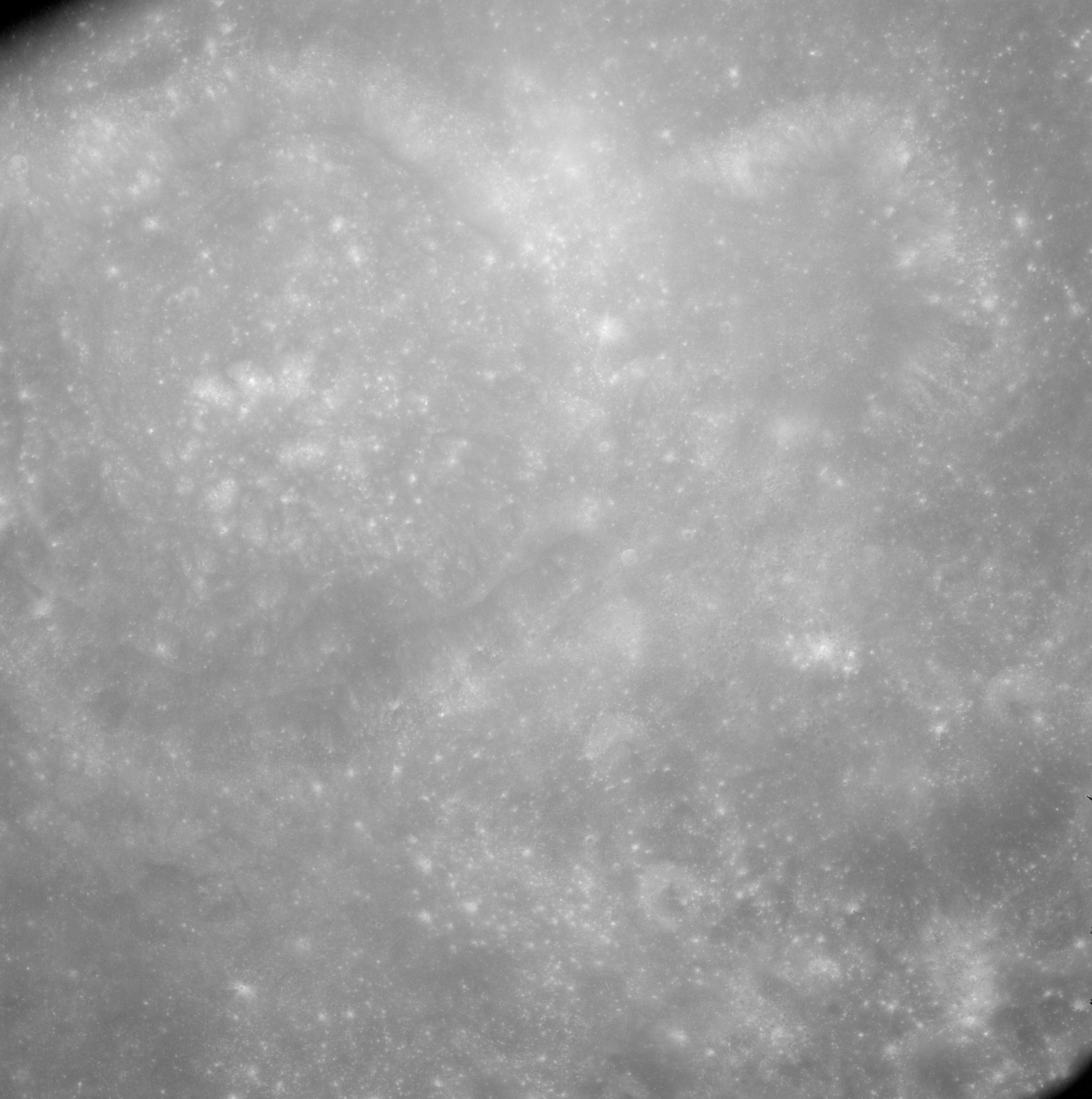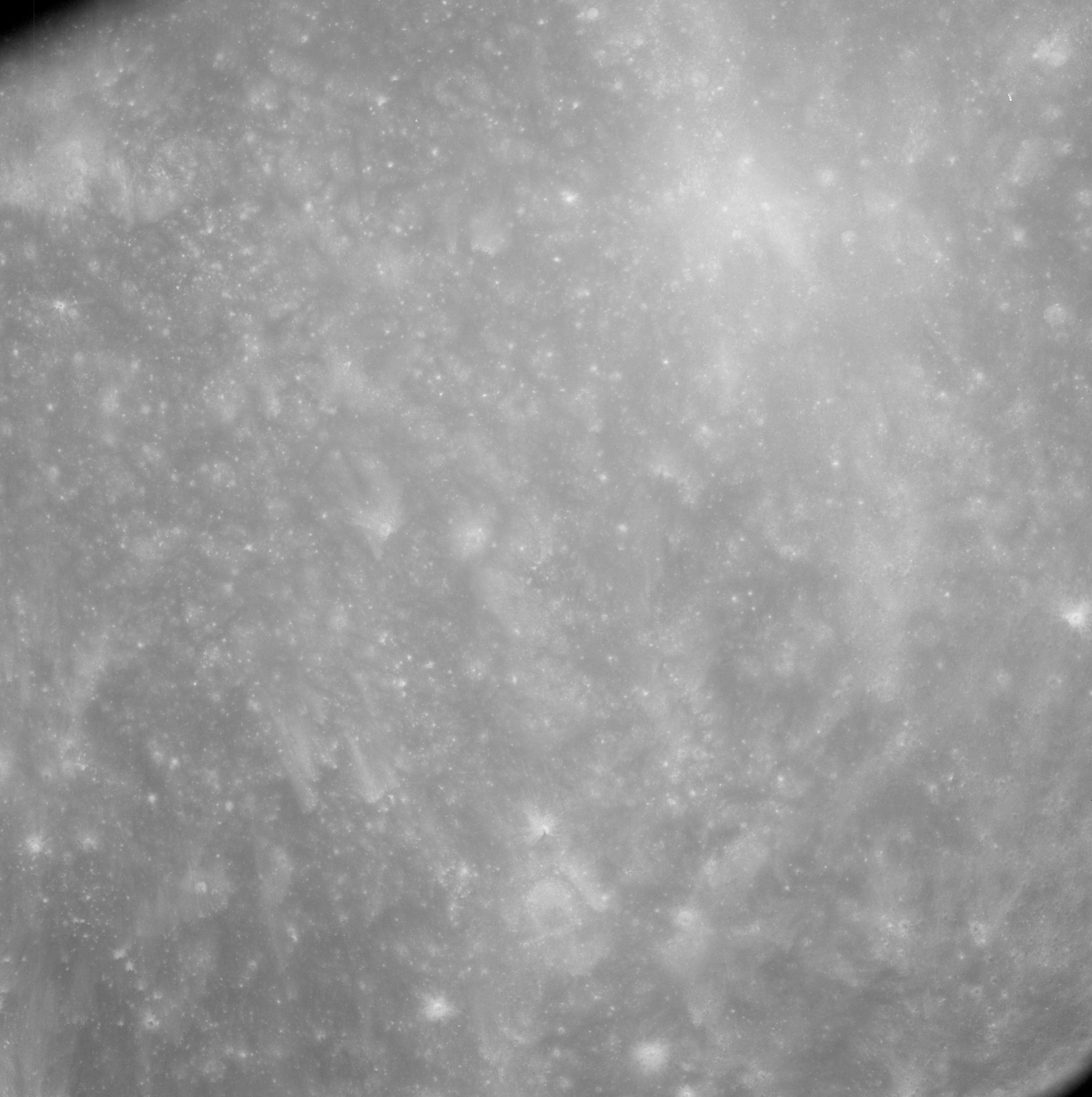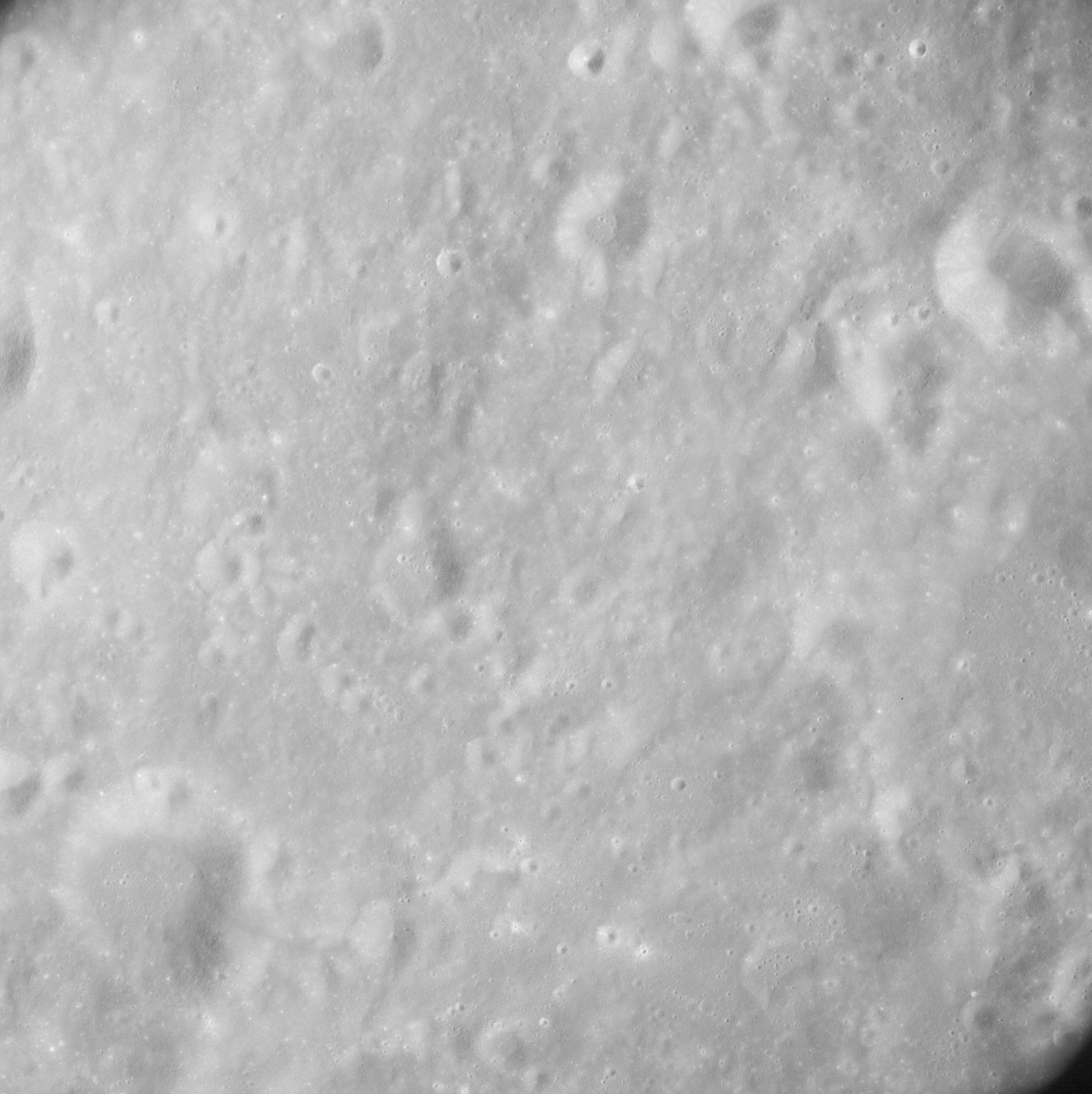 Composited image of frames AS08-12-2124 to 2135. There is essentially no visible relief and in our compositing work, we have tried to dodge around the zero-phase bright spots that each individual image exhibited. Craters Danjon and Shirakatsi, though large and important in this region, are difficult to spot.