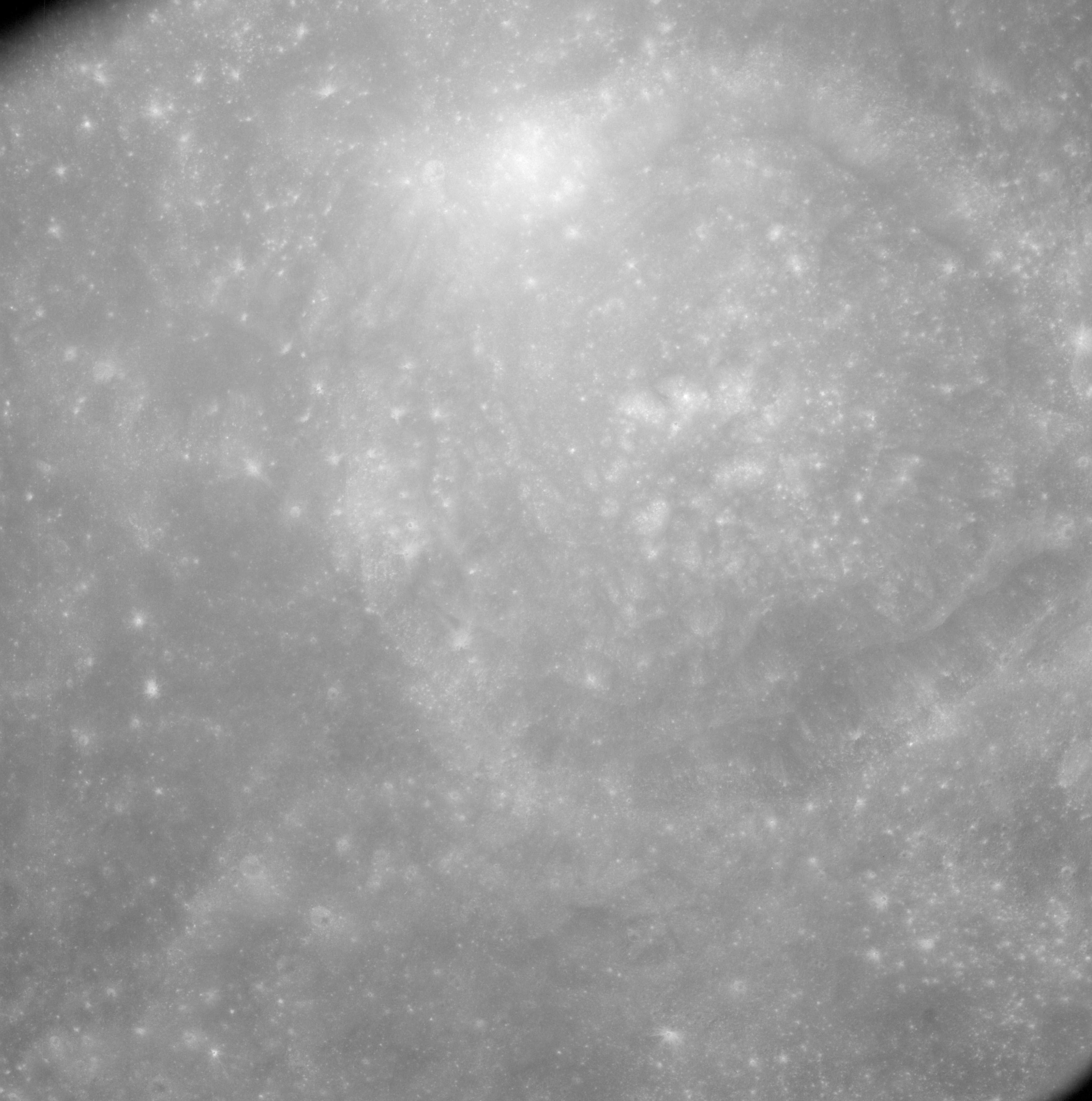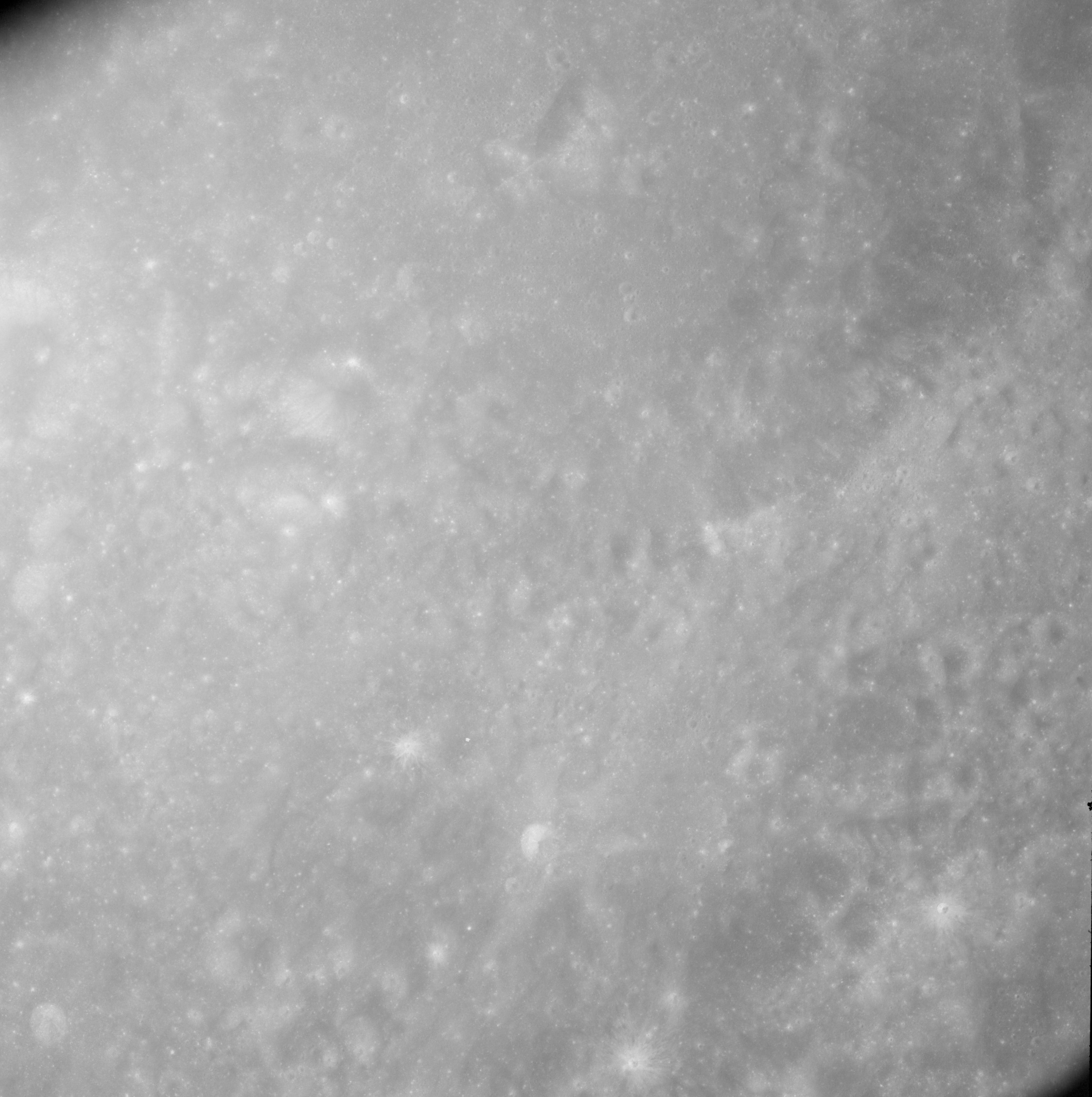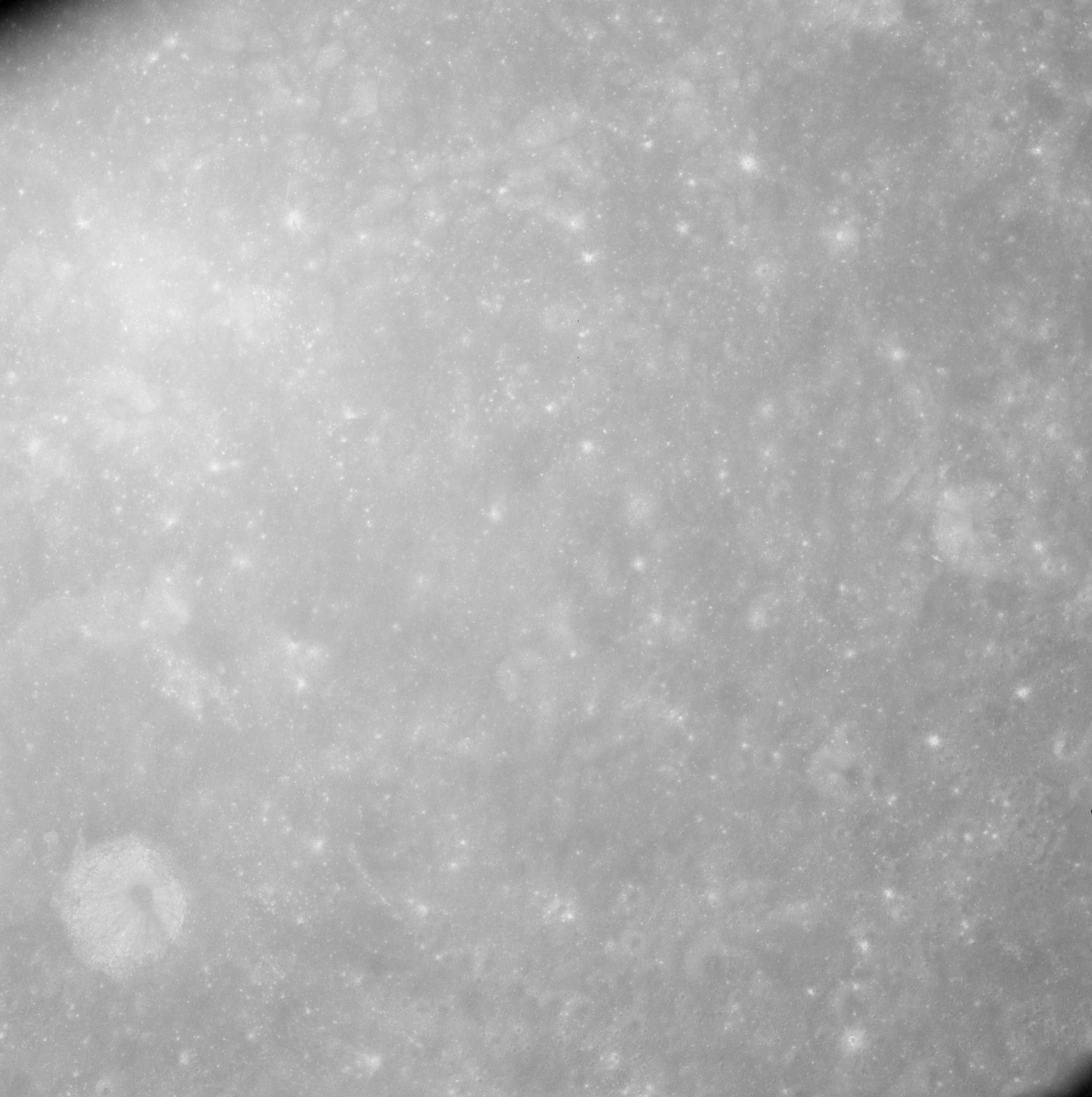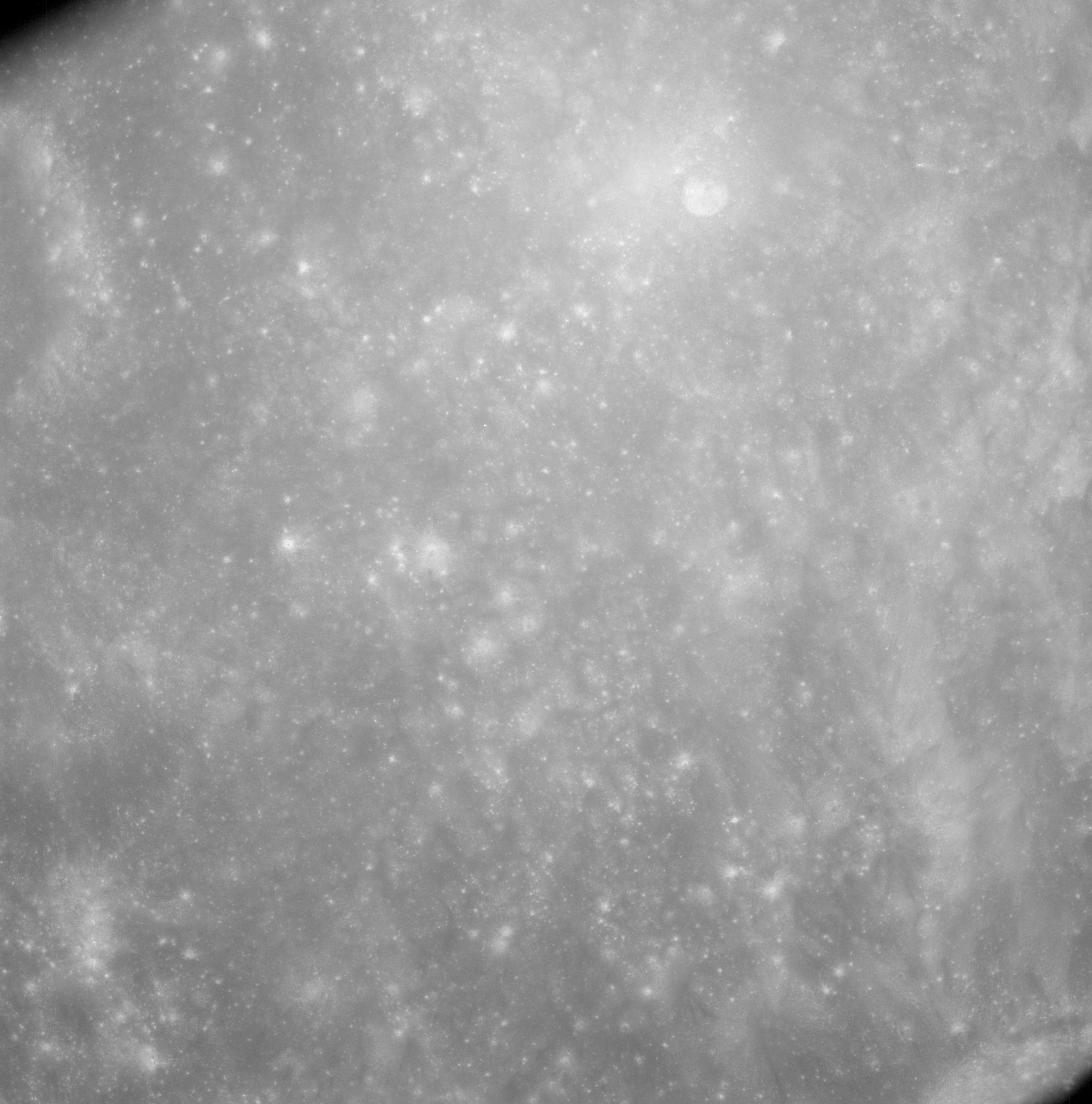 Composited image of frames AS08-12-2124 to 2135. There is essentially no visible relief and in our compositing work, we have tried to dodge around the zero-phase bright spots that each individual image exhibited. Craters Danjon and Shirakatsi, though large and important in this region, are difficult to spot.