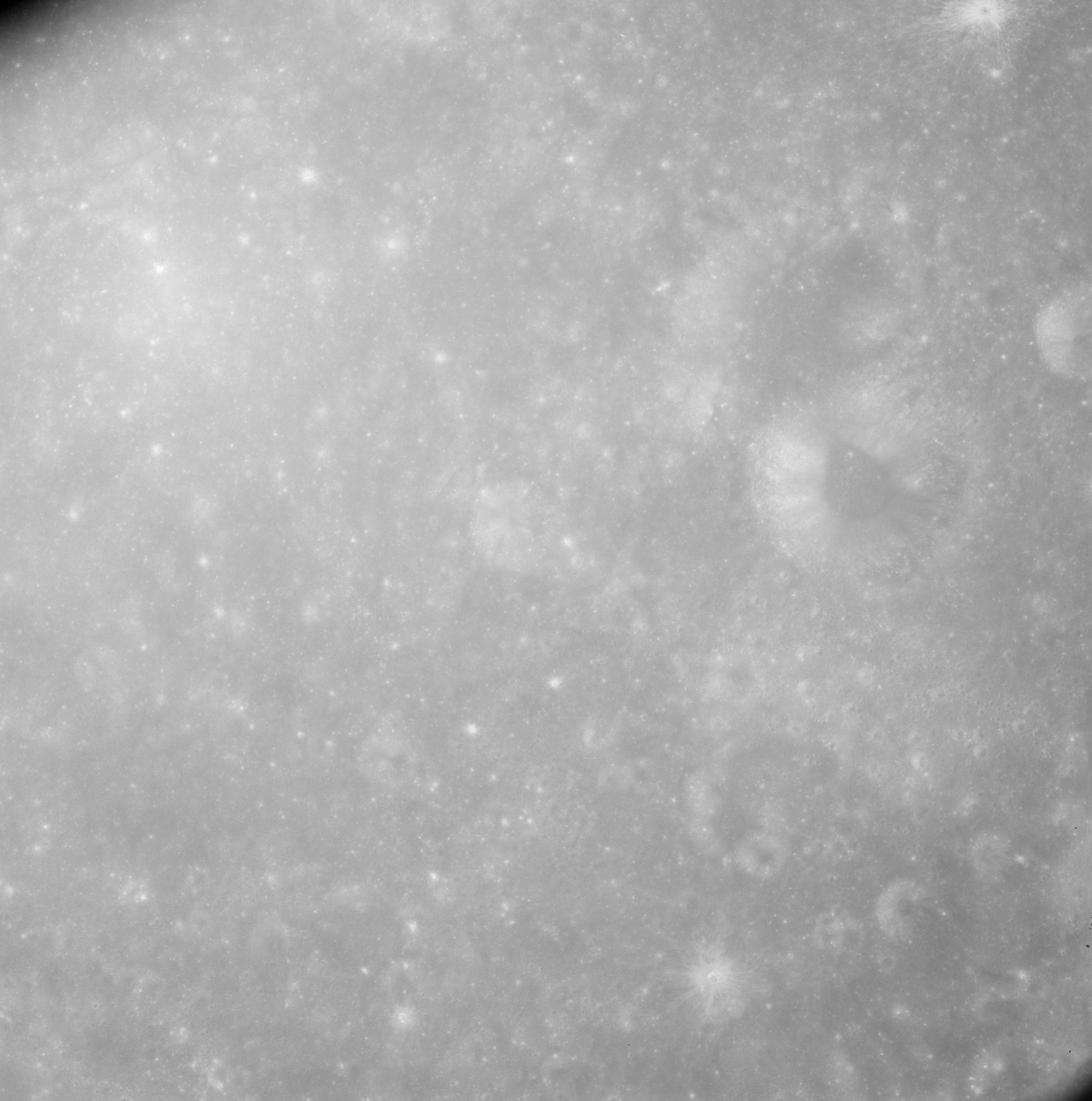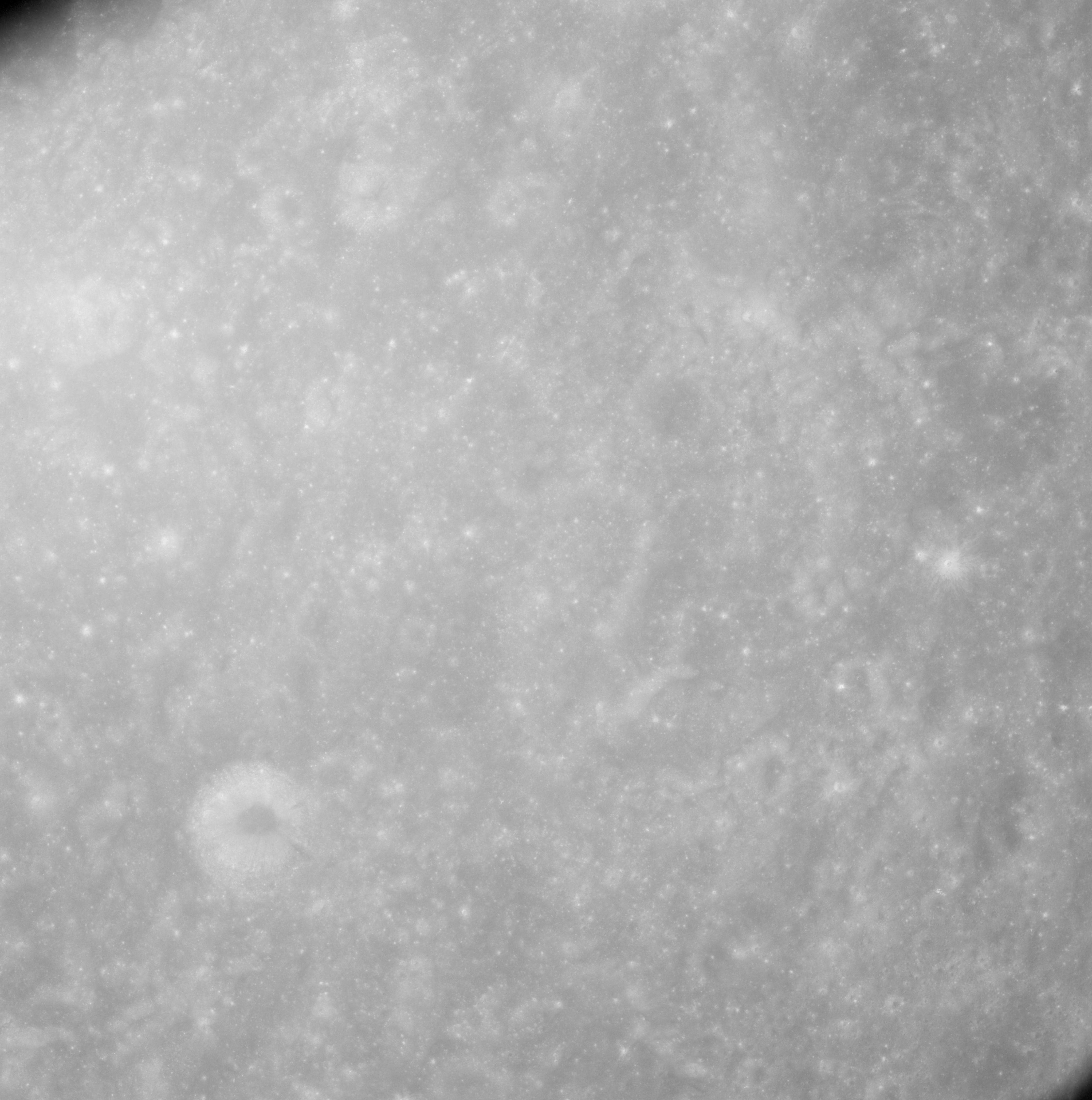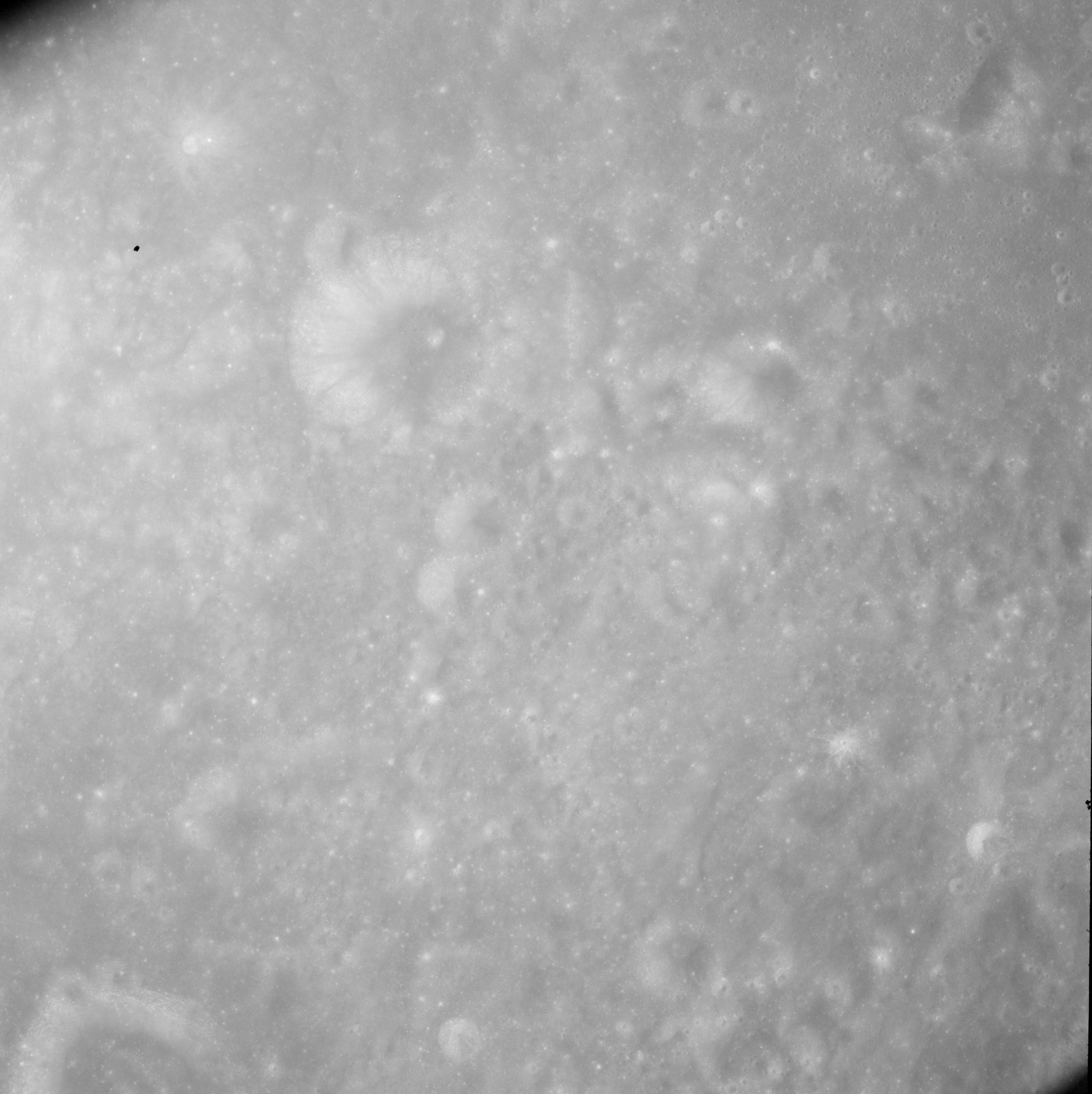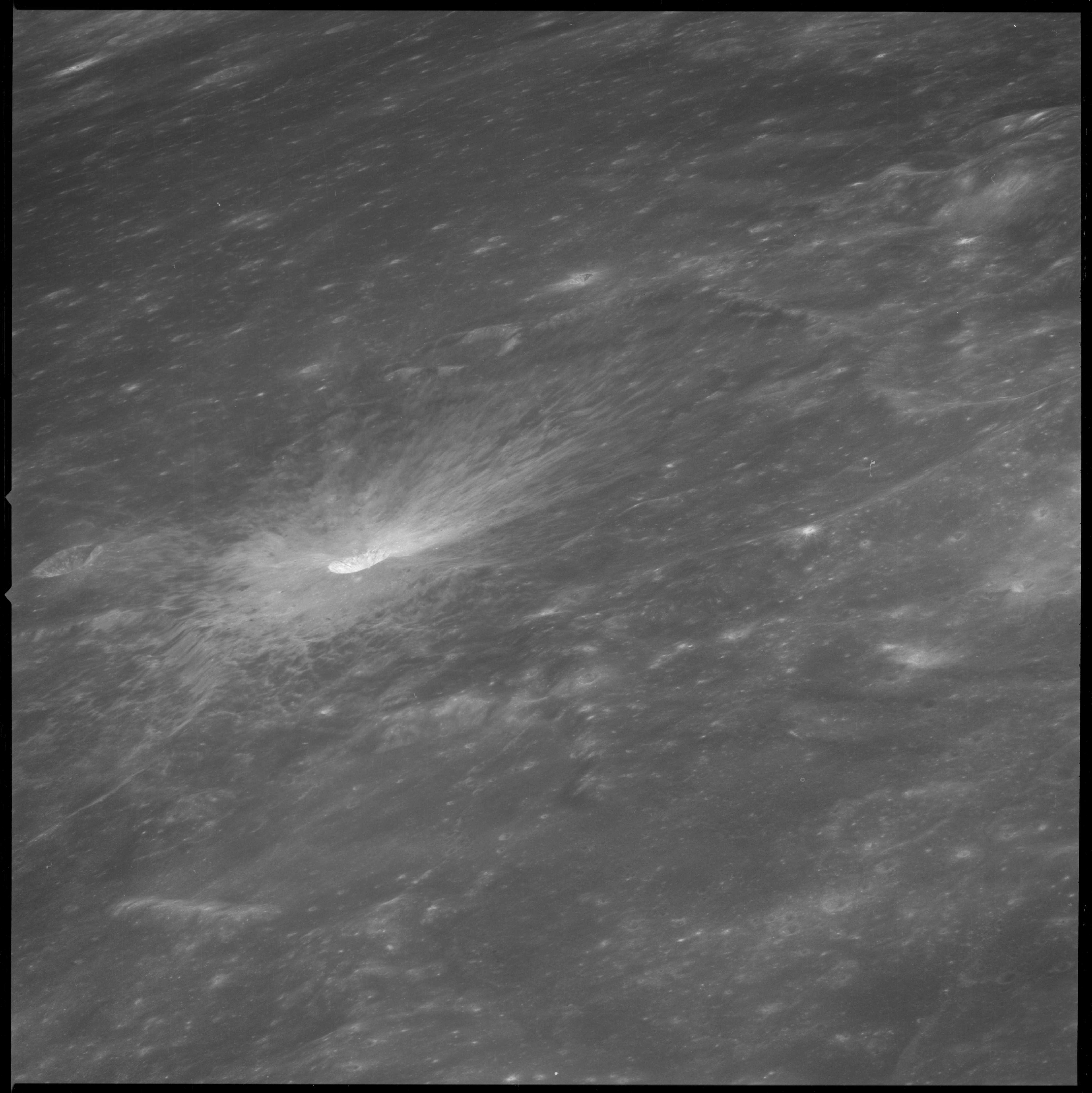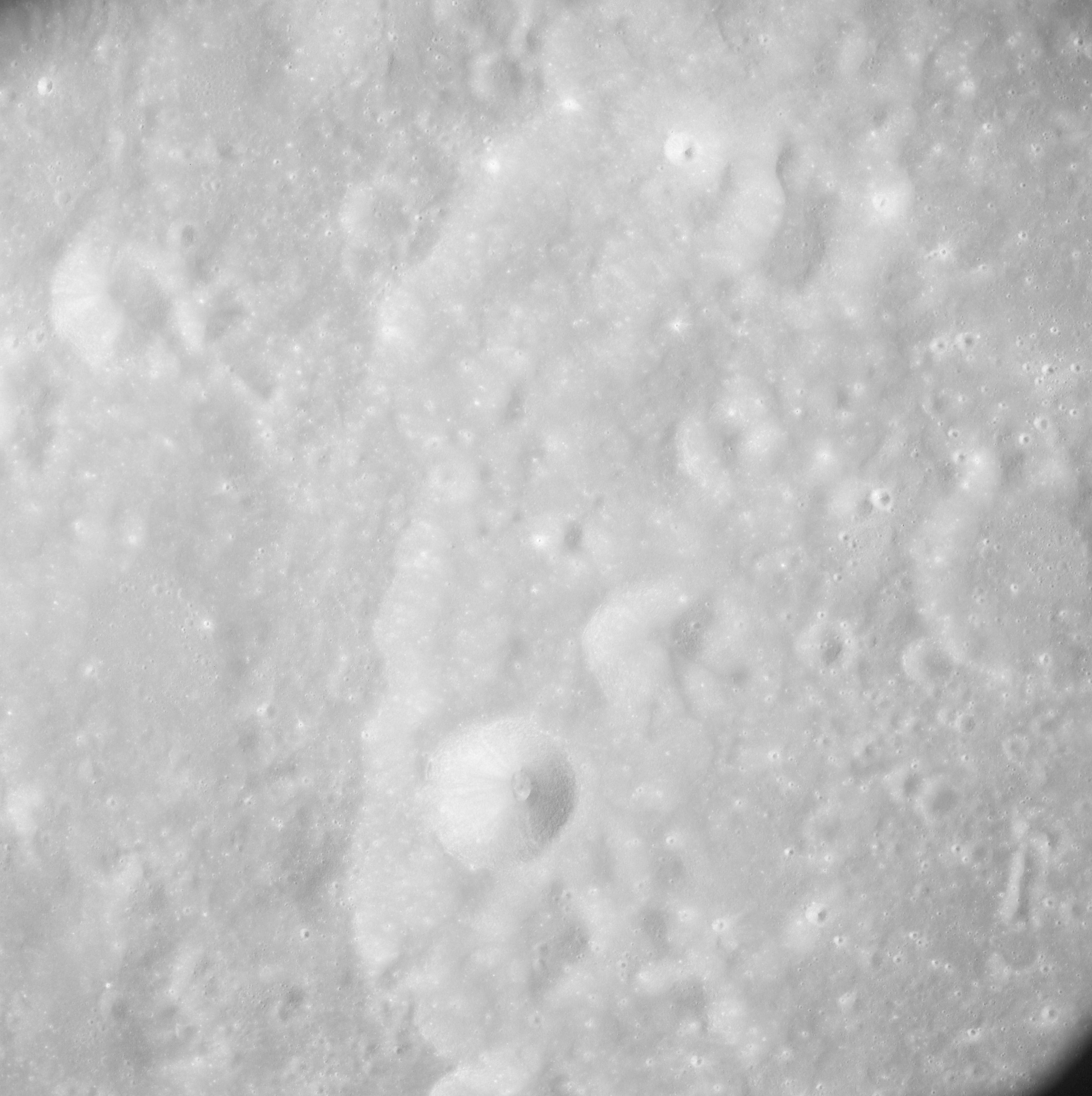 Frame AS08-13-2328 shows the difference in the ray pattern when the impact comes from a meteorite strike at a low angle. In particular, there is an excluded zone around the crater about 120° wide in which there is little sign of ejecta. This indicates that the incoming projectile came in from the top left of the photograph. Within the excluded zone is Denning V, mainly distinguishable by its dark floor.