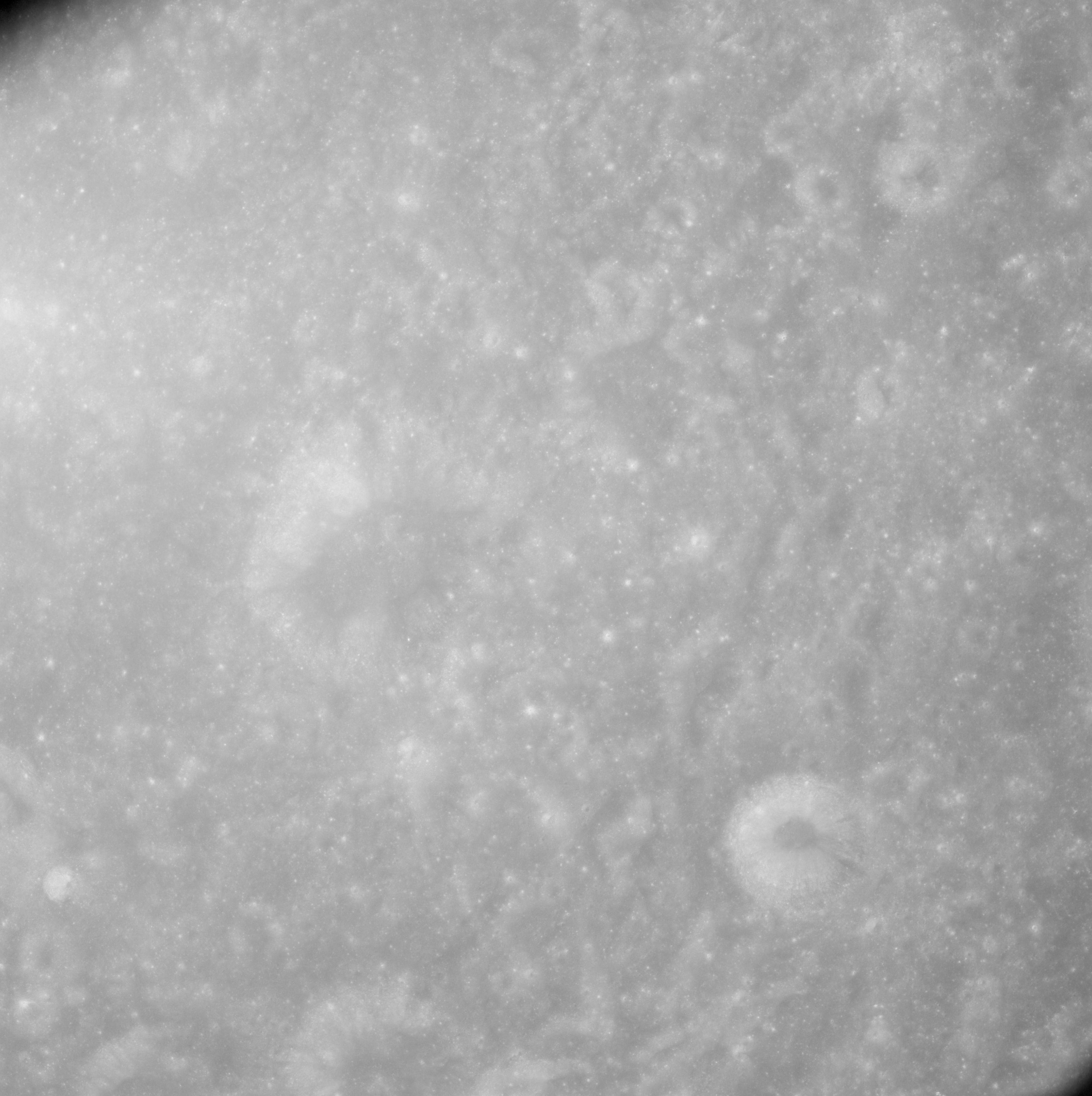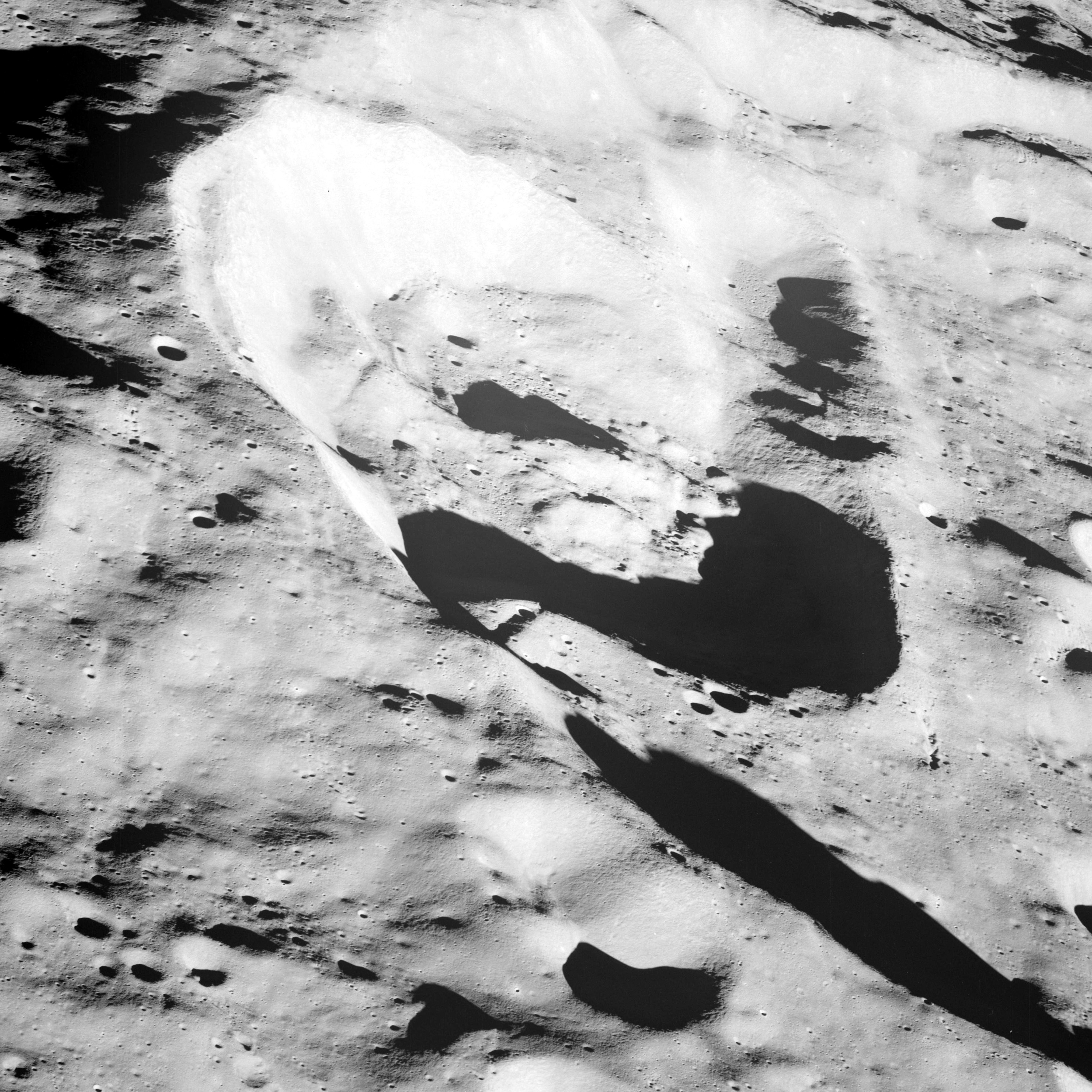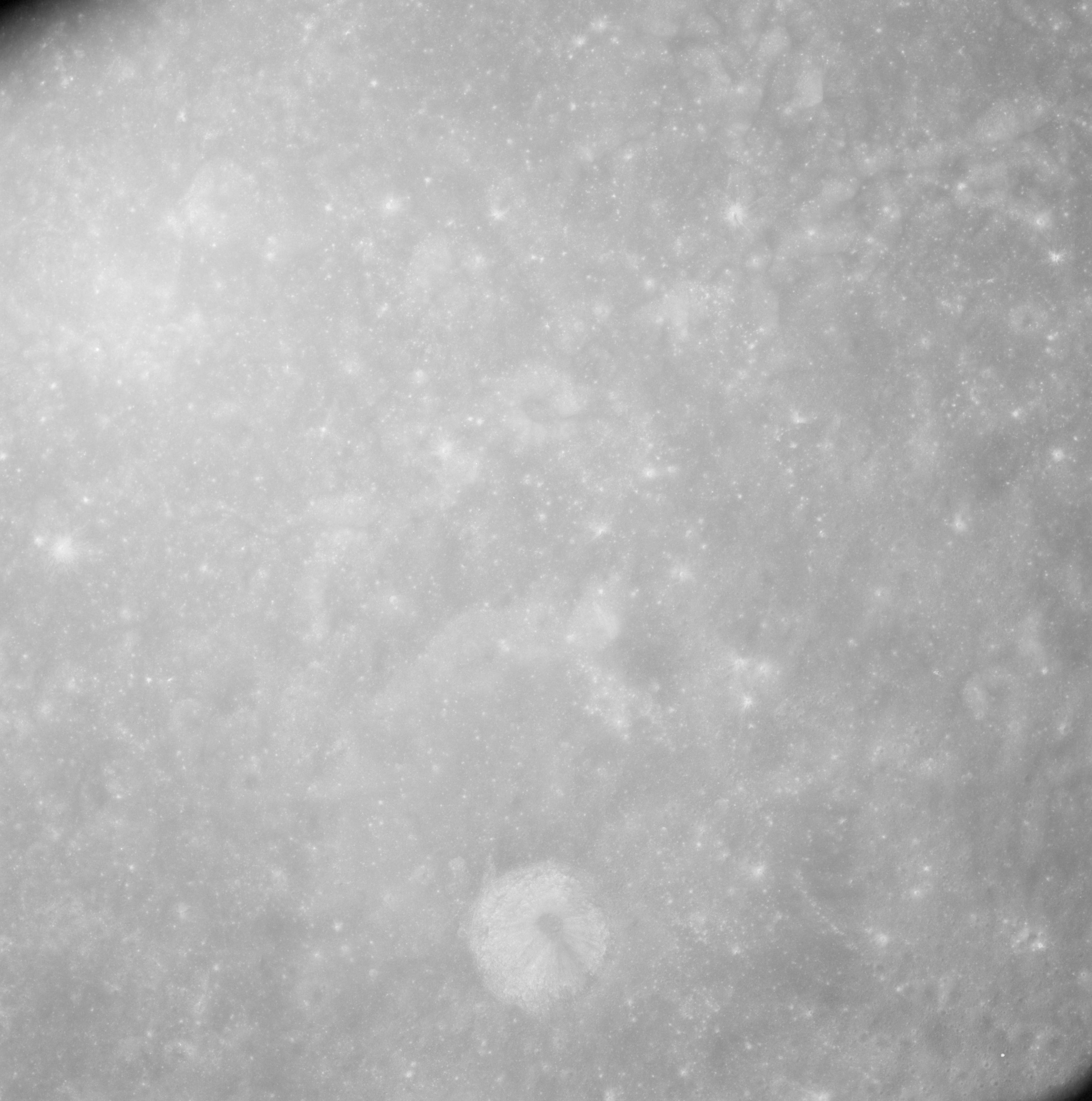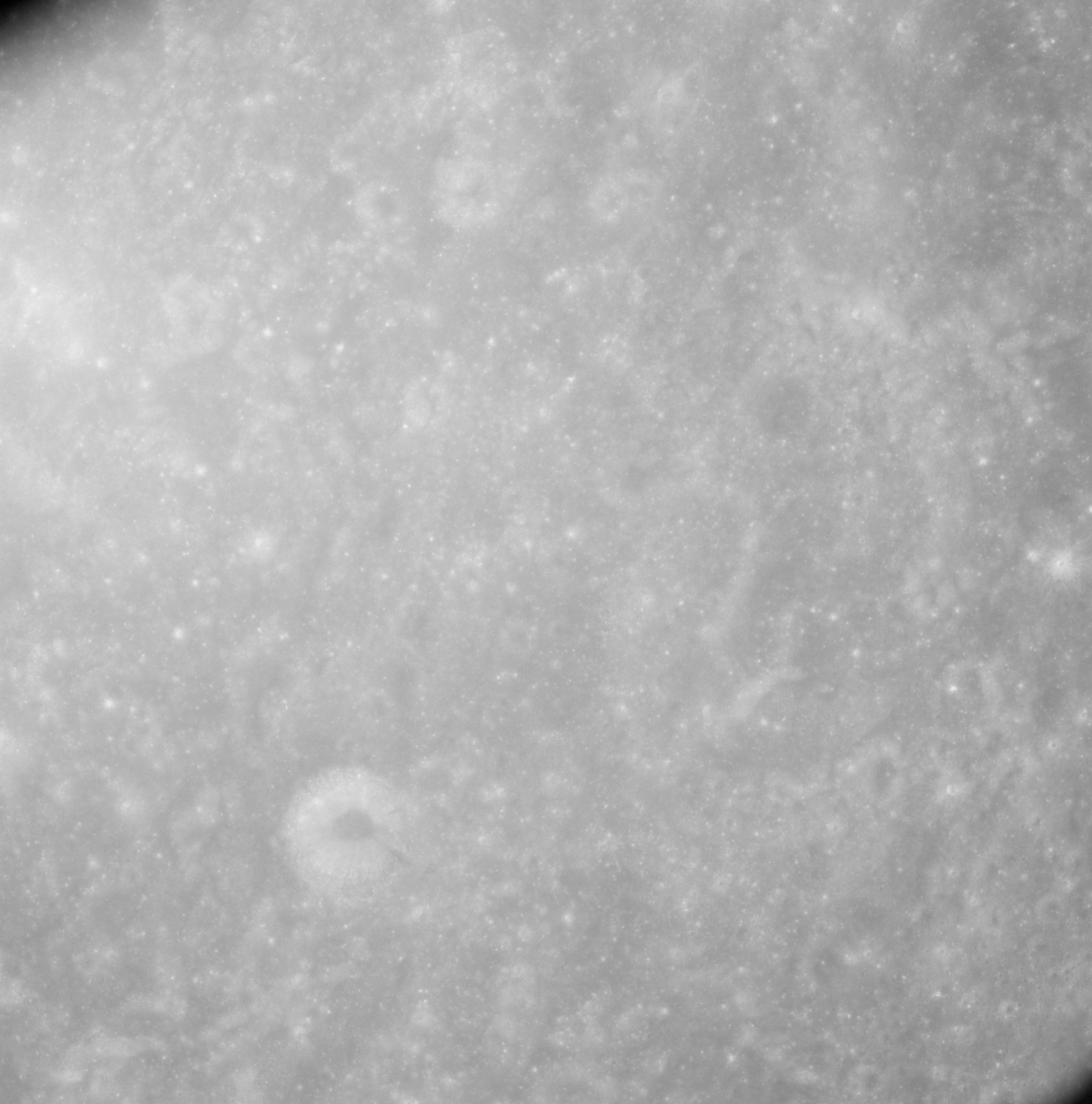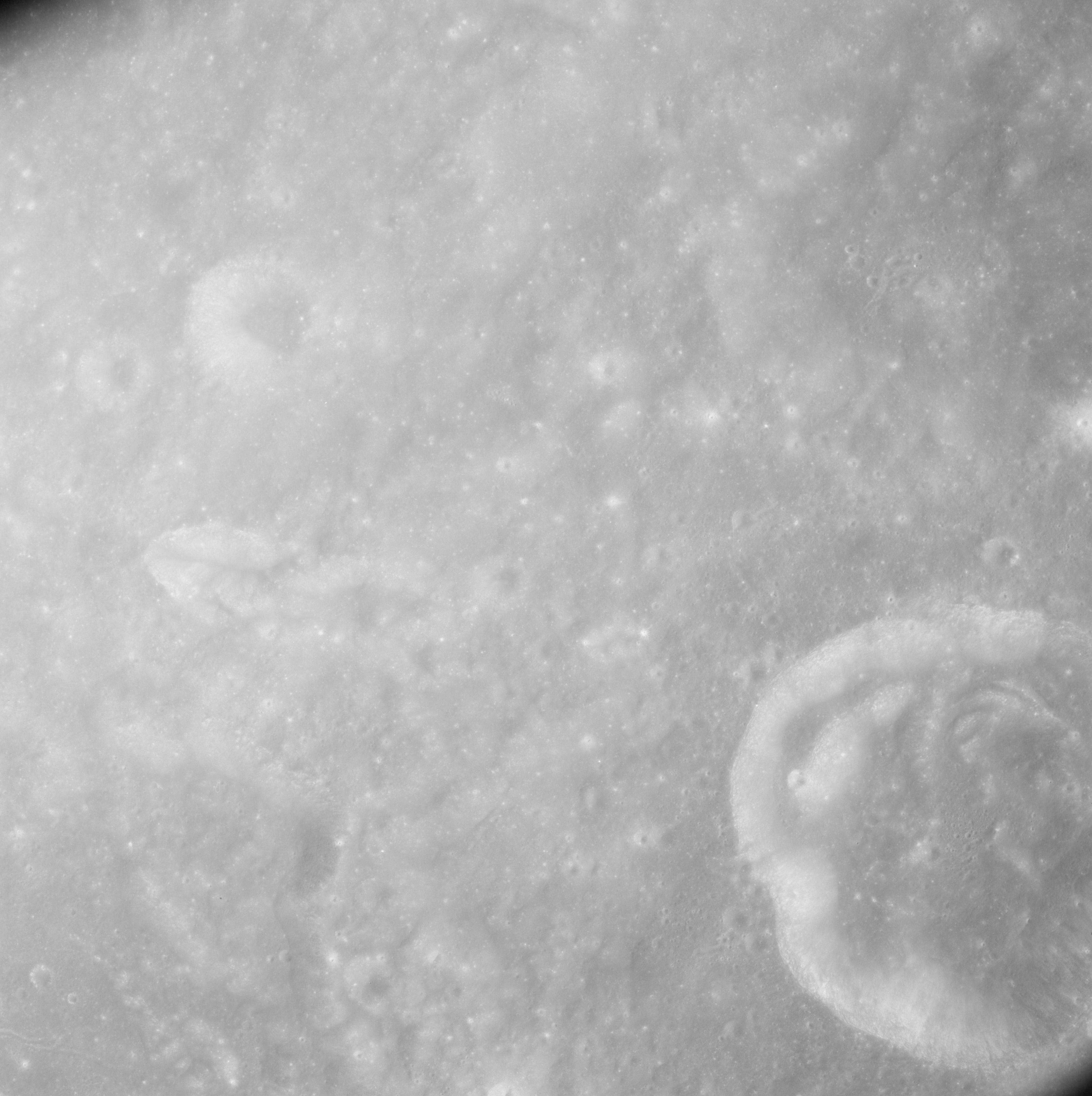 Frame AS08-13-2328 shows the difference in the ray pattern when the impact comes from a meteorite strike at a low angle. In particular, there is an excluded zone around the crater about 120° wide in which there is little sign of ejecta. This indicates that the incoming projectile came in from the top left of the photograph. Within the excluded zone is Denning V, mainly distinguishable by its dark floor.