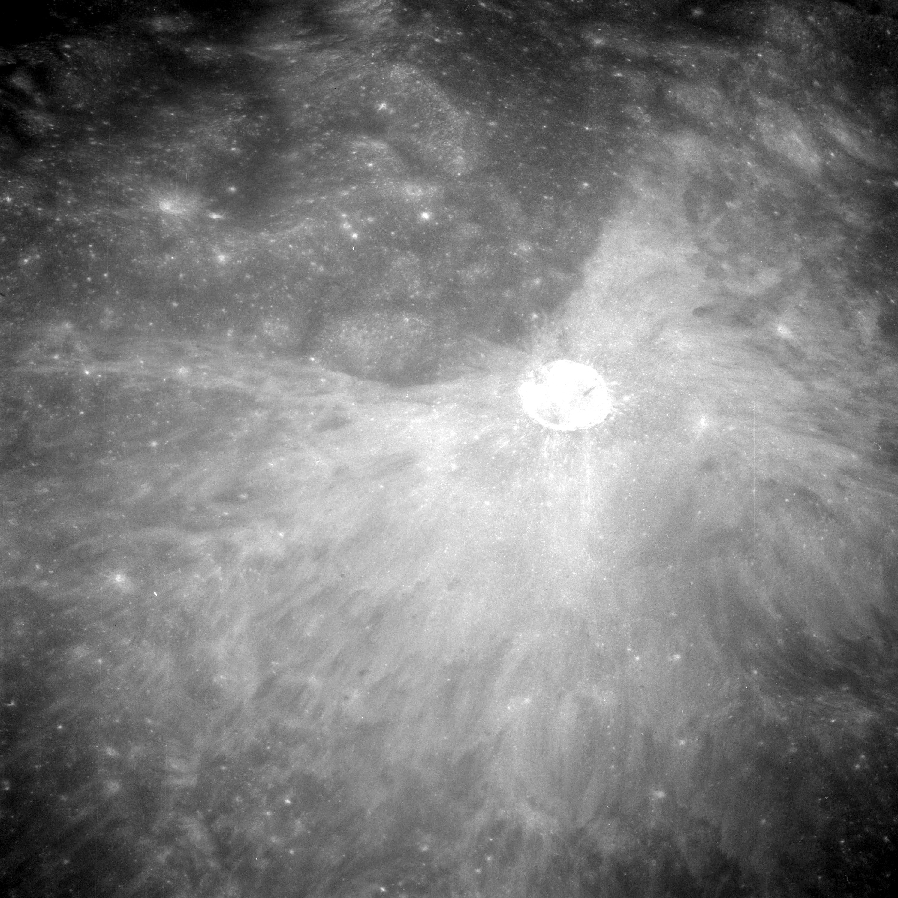 This image dramatically shows the ray pattern from a simple, near vertical impact. Close to the crater, the ejecta blanket is continuous. Two crater diameters out, the blanket becomes discontinuous.