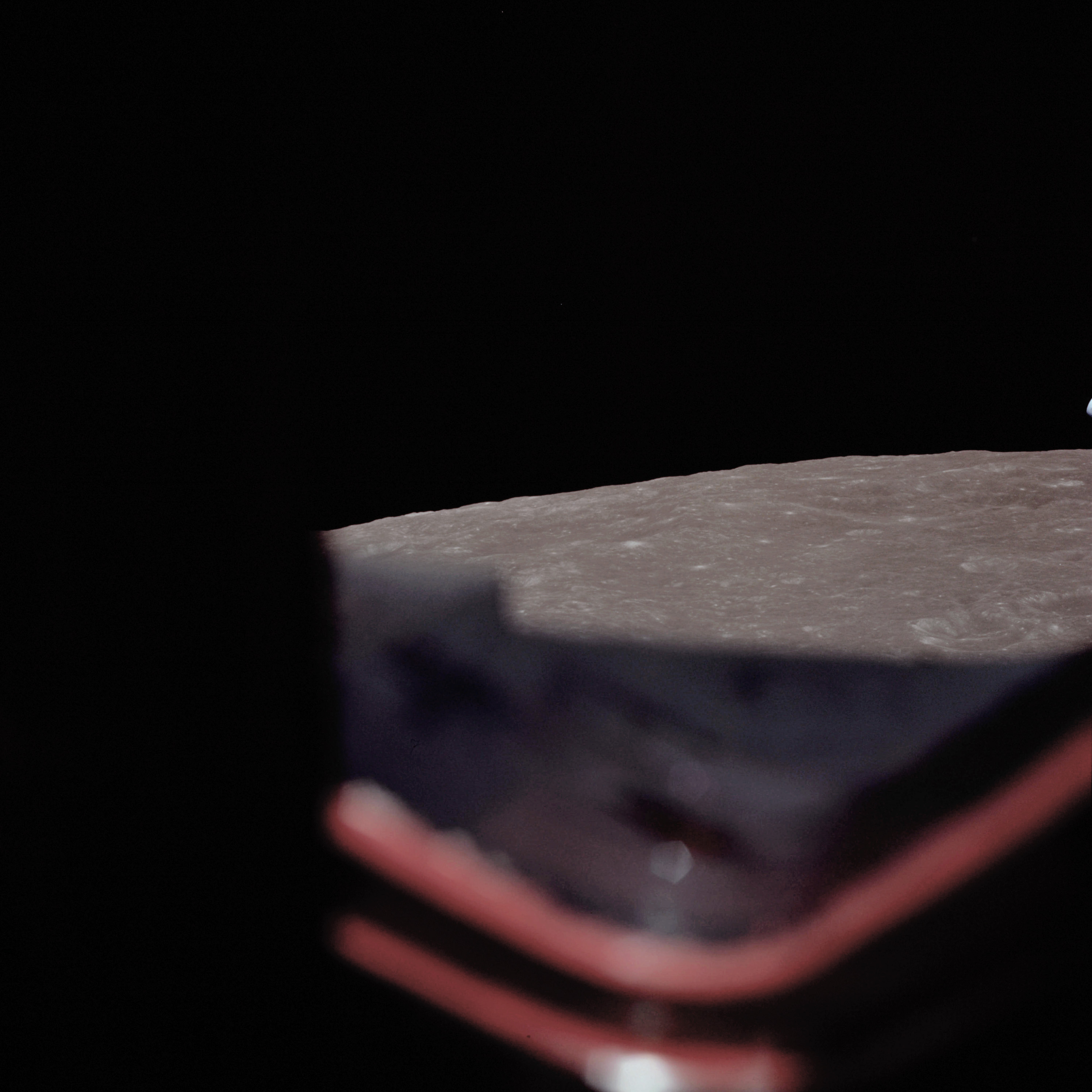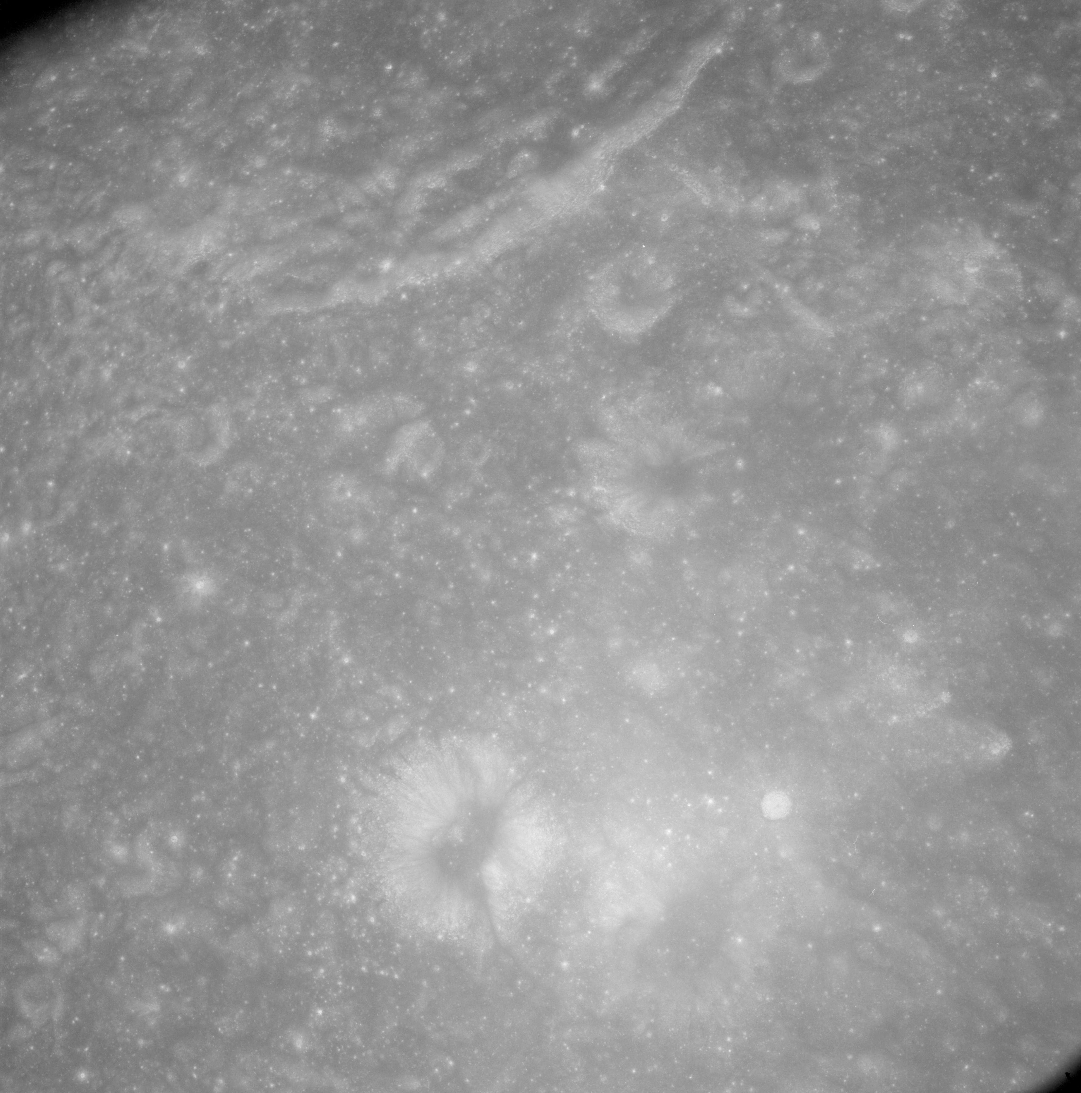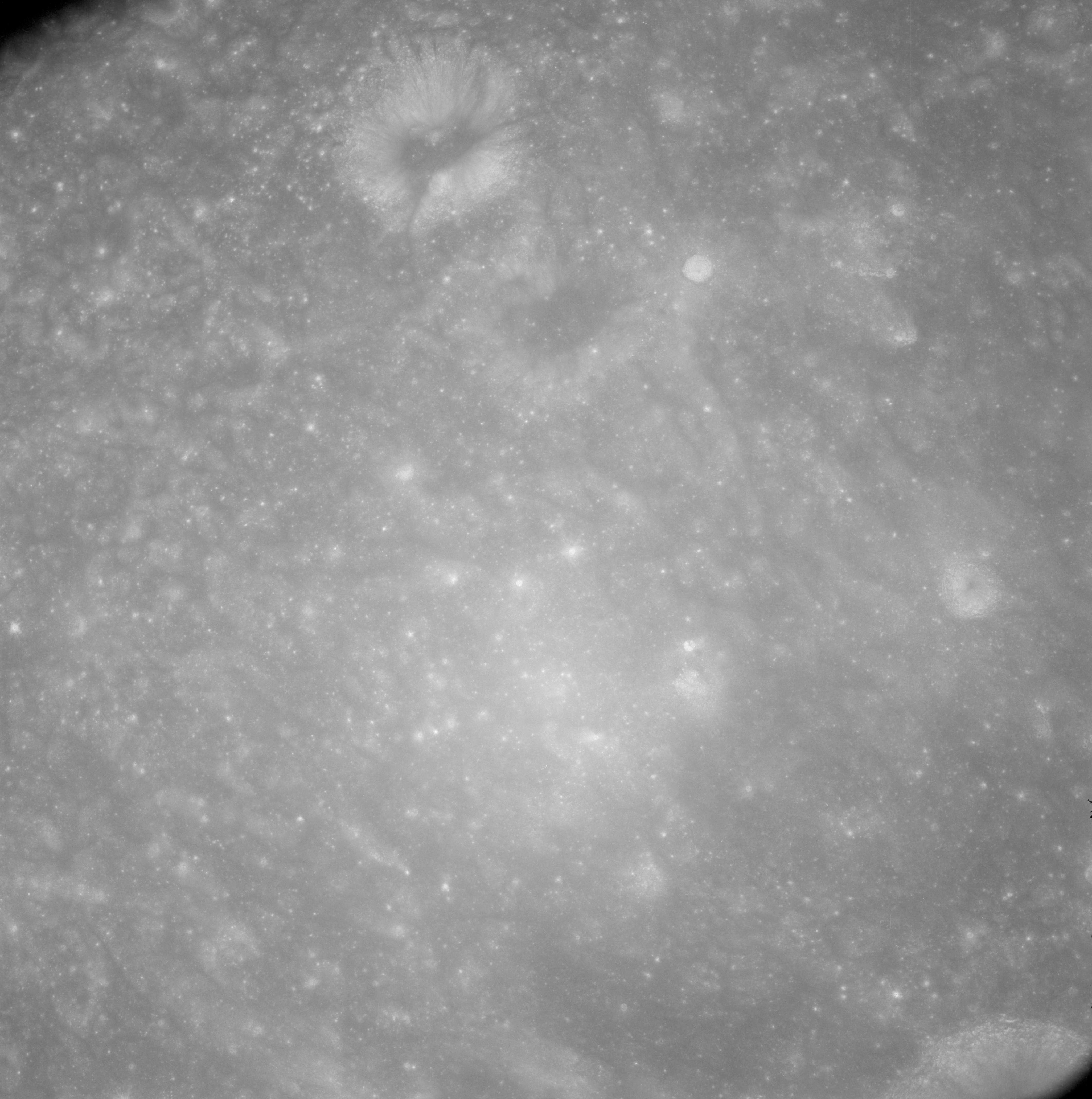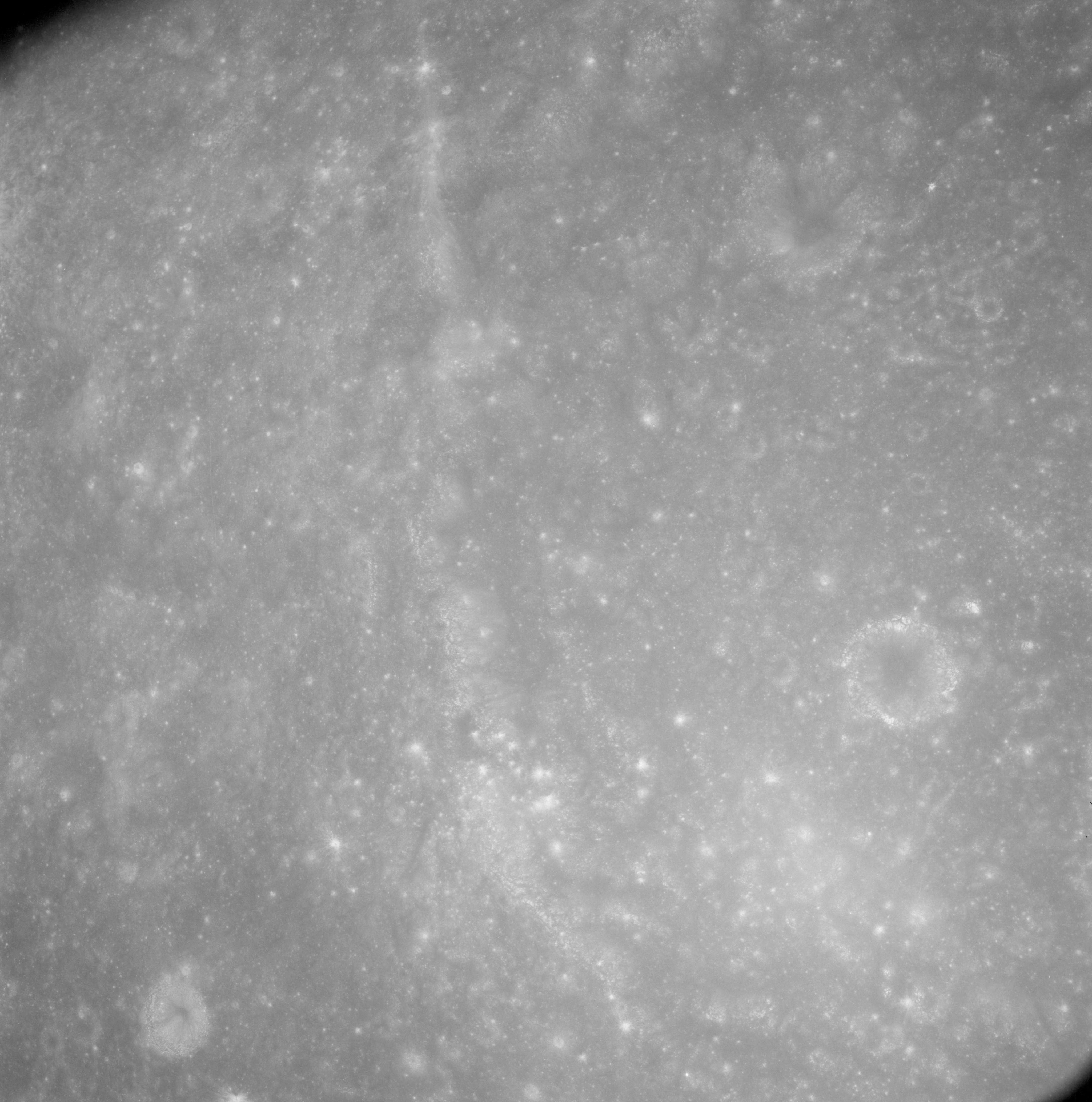 Around the far side, as they began flying over the sunlit half of the Moon, Bill began to take a long series of stereo photographs of the surface, as per the Flight Plan, using magazine D on a Hasselblad camera mounted in one of the forward-facing rendezvous windows. The camera is fitted with an 80-mm lens and controlled by an intervalometer t0 take frames at preset intervals, in this case every 20 seconds.
