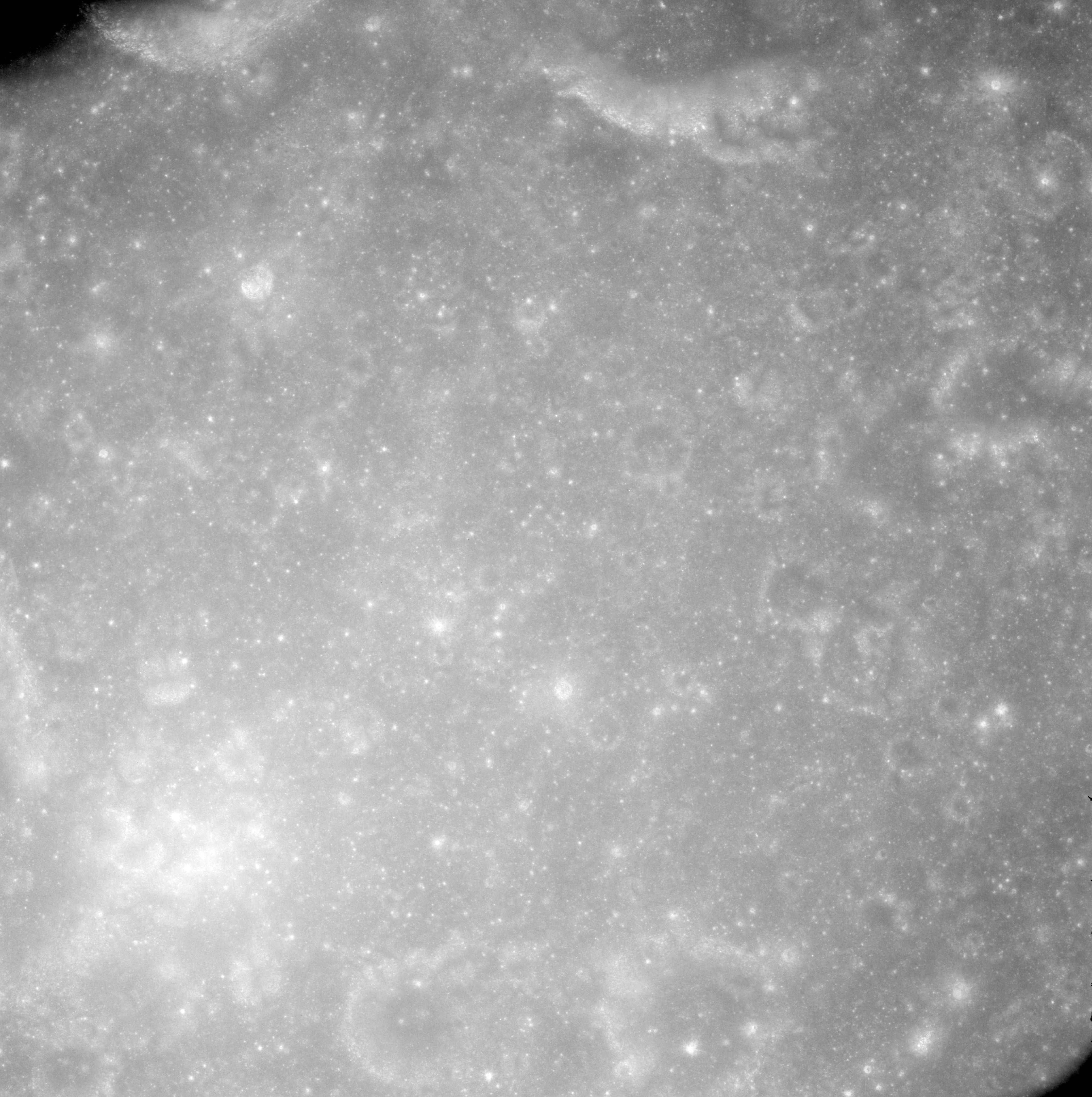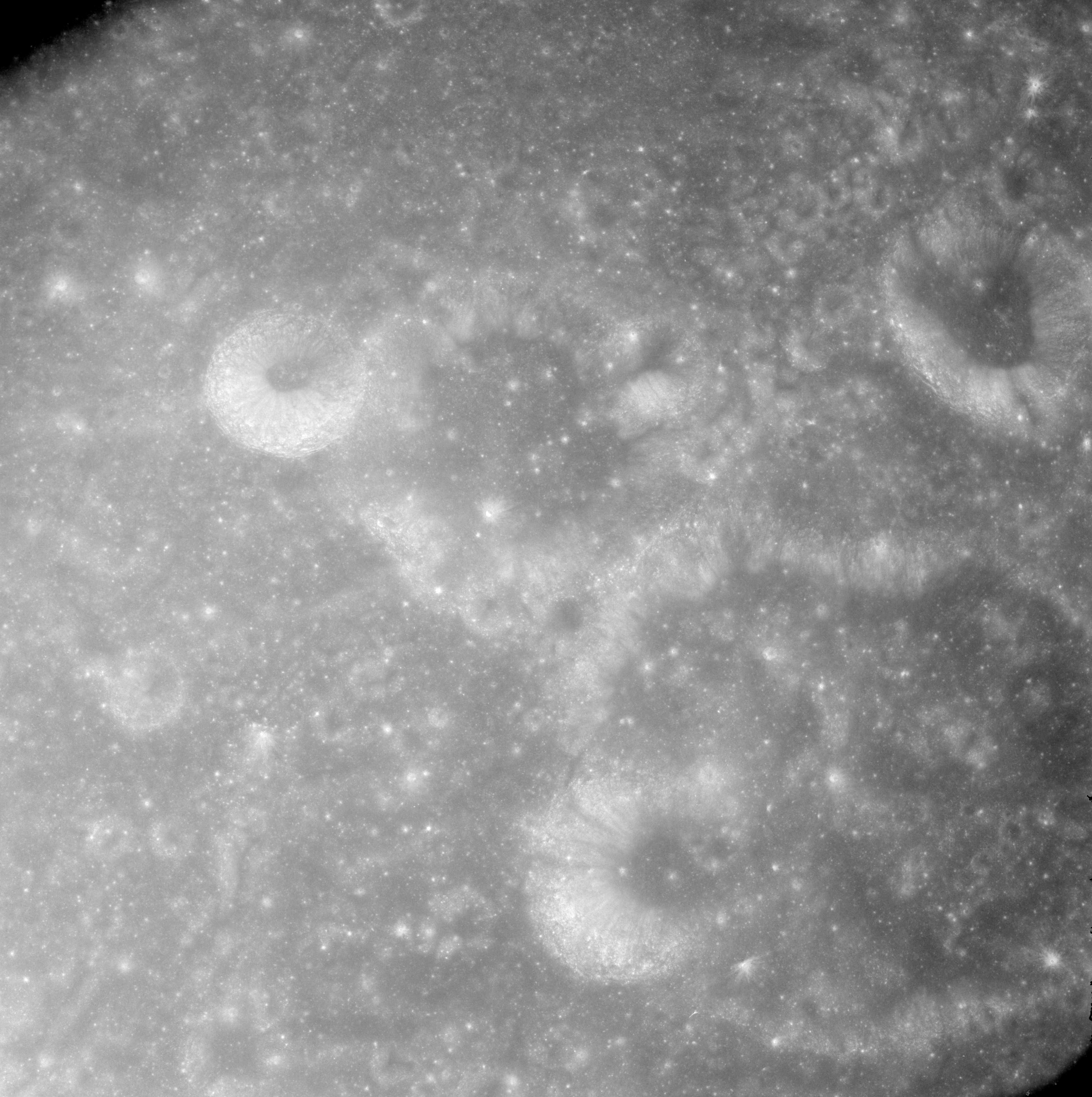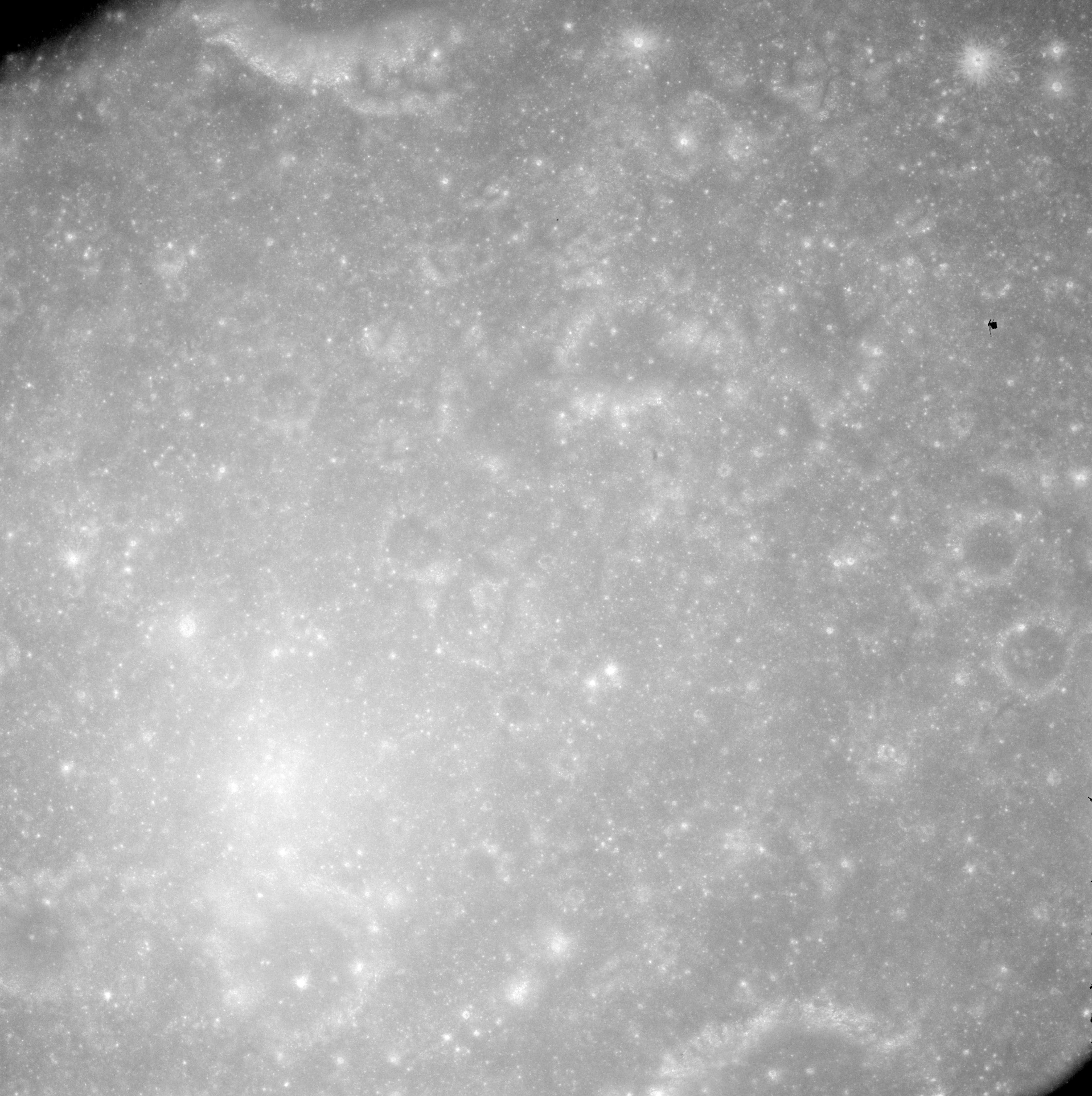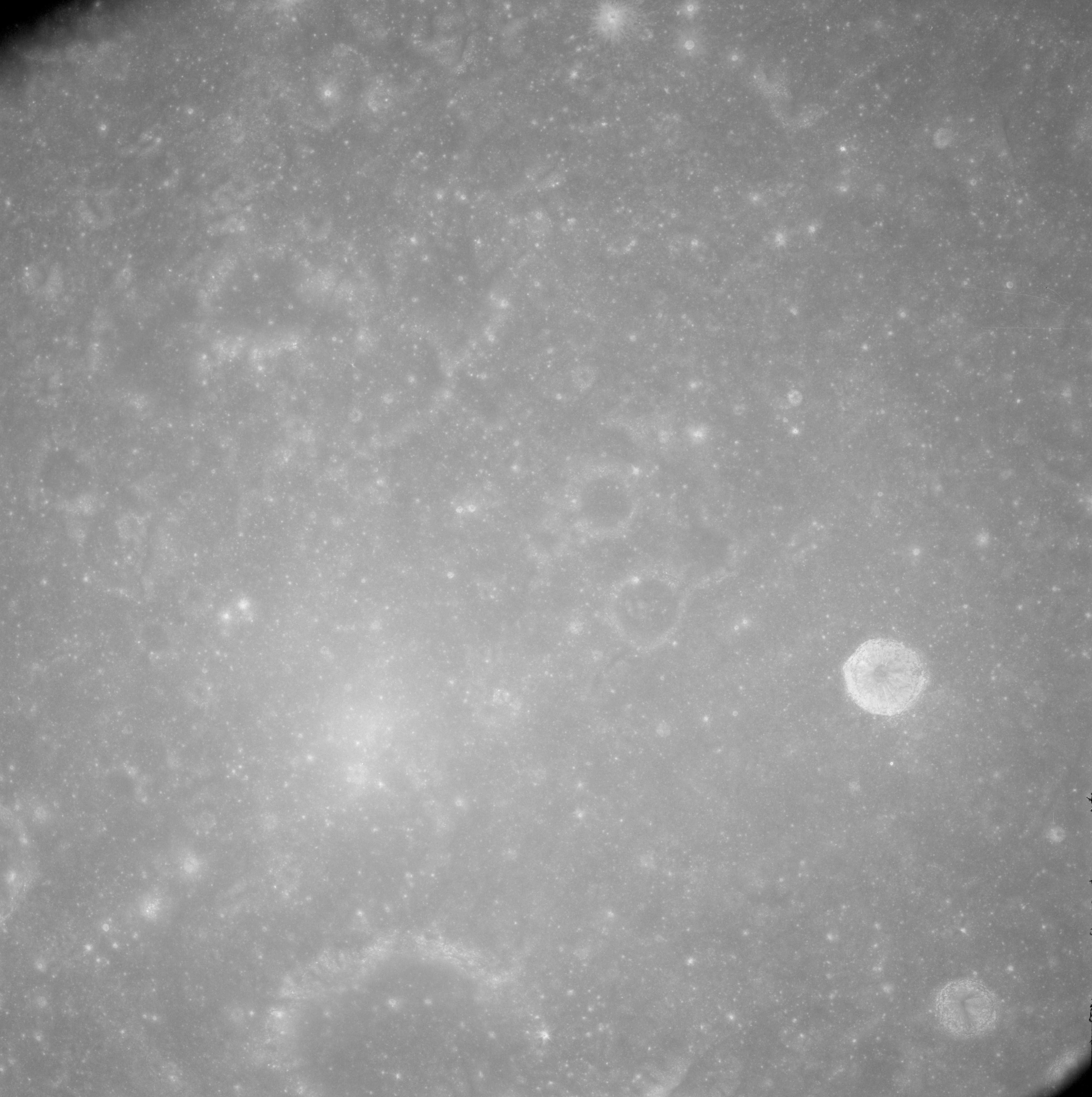 Around the far side, as they began flying over the sunlit half of the Moon, Bill began to take a long series of stereo photographs of the surface, as per the Flight Plan, using magazine D on a Hasselblad camera mounted in one of the forward-facing rendezvous windows. The camera is fitted with an 80-mm lens and controlled by an intervalometer t0 take frames at preset intervals, in this case every 20 seconds.