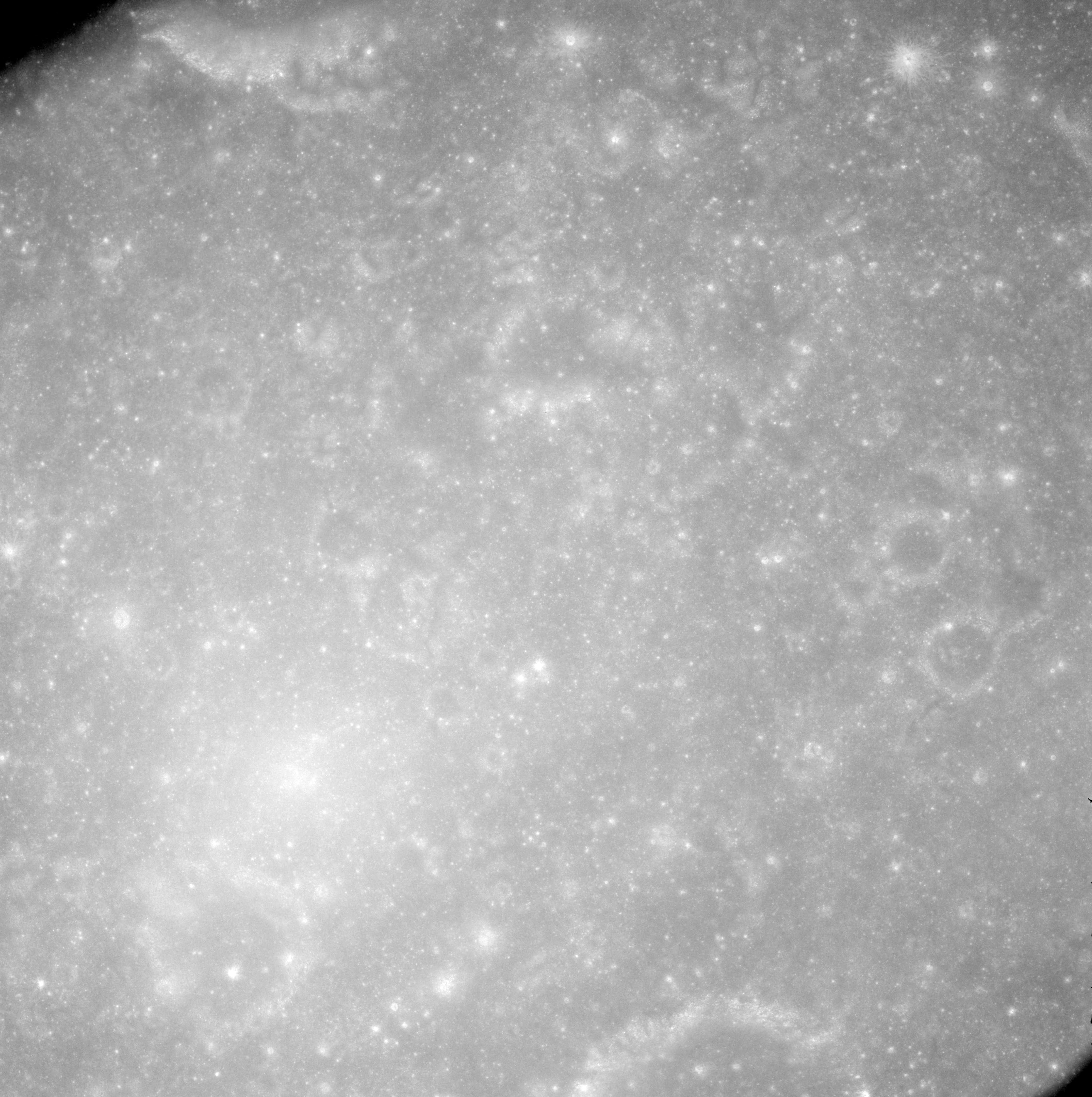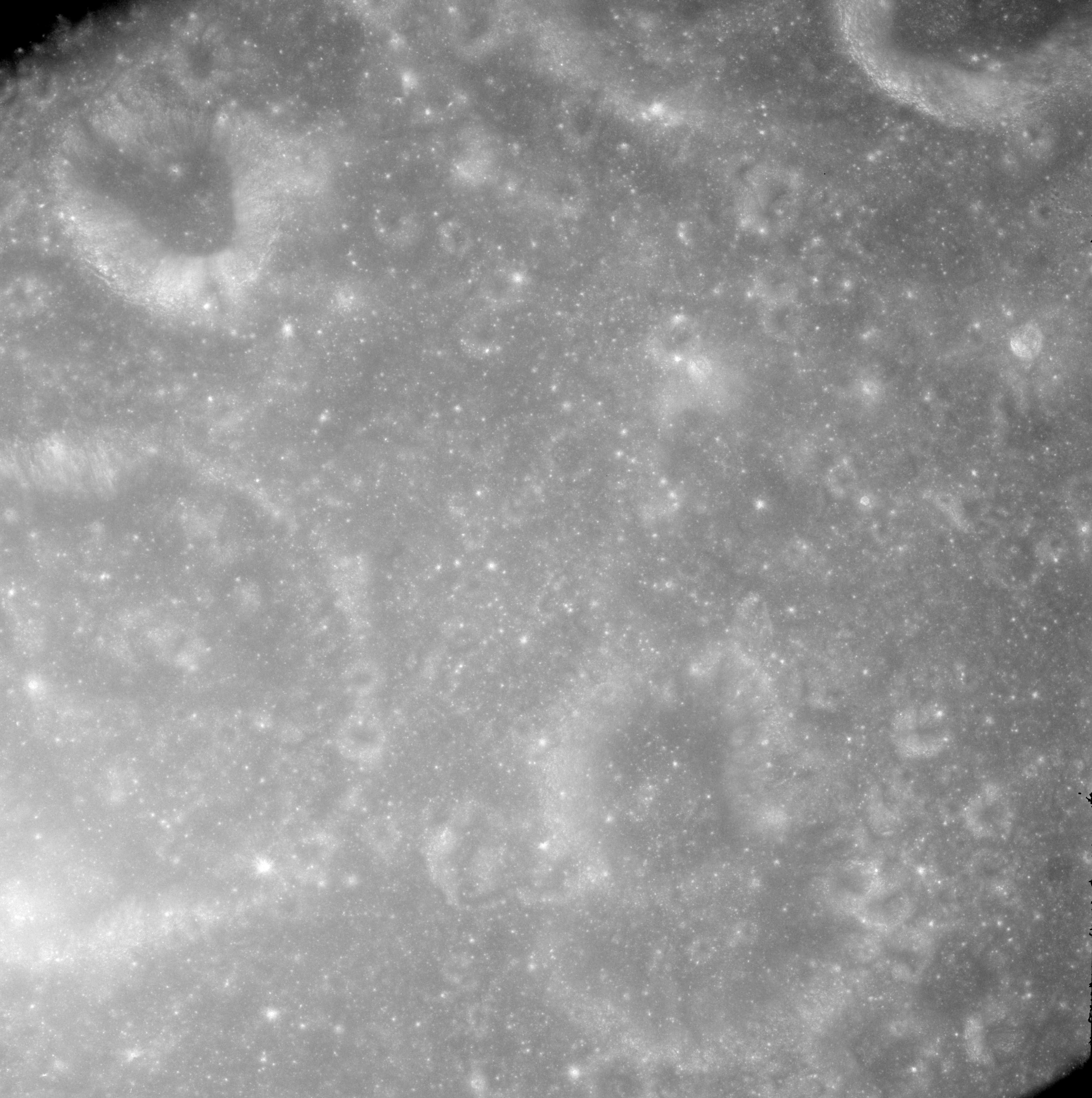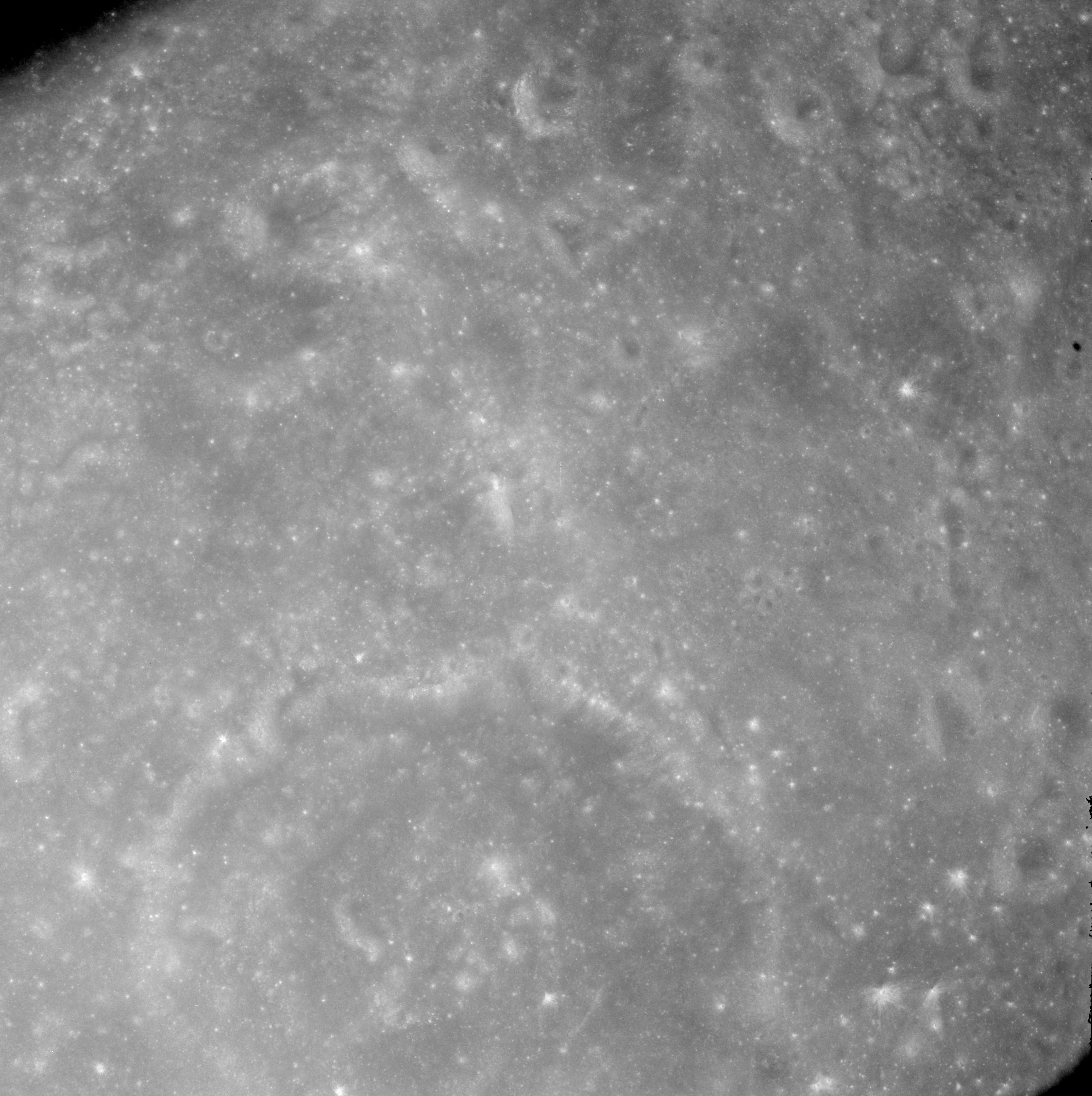 This is a composite of images from frames AS08-12-2136 to 2149. As the spacecraft moves from right to left with the camera automatically taking regular images, the rotation of successive frames betrays Frank's manoeuvre. The whole of crater Meitner is vaguely visible near centre, revealed by its darker floor and the lightening of some of its inner rim. The composite stretches from 122° on the right to 105° on the left.