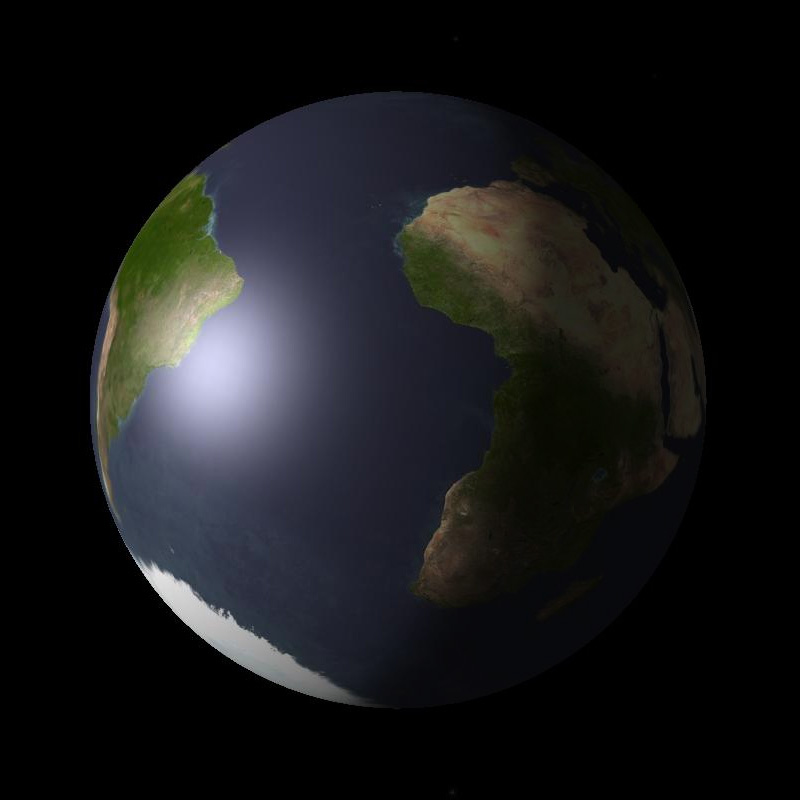Journal reader, Syd Buxton has kindly supplied this rendering of Earth without cloud which shows South America in the noonday Sun and Western Africa at sunset.