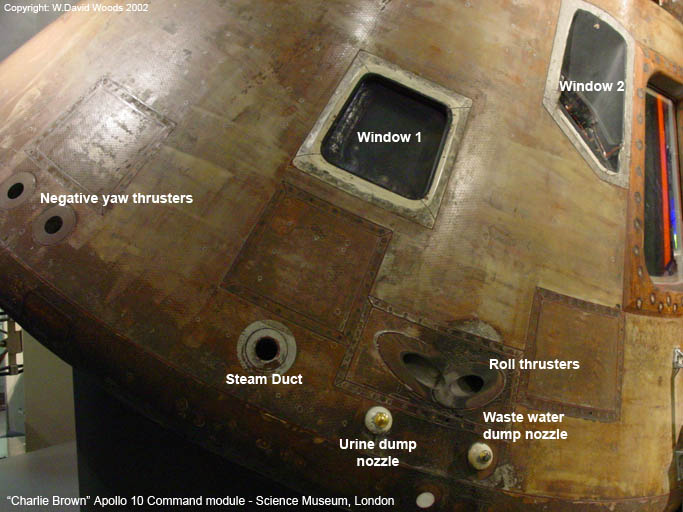 Water builds up from two sources, the excess produced by the fuel cells and urine passed by the crew. It is the latter that Frank is most concerned with. Both are ejected through two ports on the side of the Command Module, as shown in this image of Charlie Brown, the Apollo 10 CM. As the water hits the vacuum of space, it quickly evaporates while at the same time freezing. By this vigourous evaporation, it imparts a tiny thrust on the spacecraft that has measurable effects on its trajectory. At some point, such perturbation must be compensated for.
