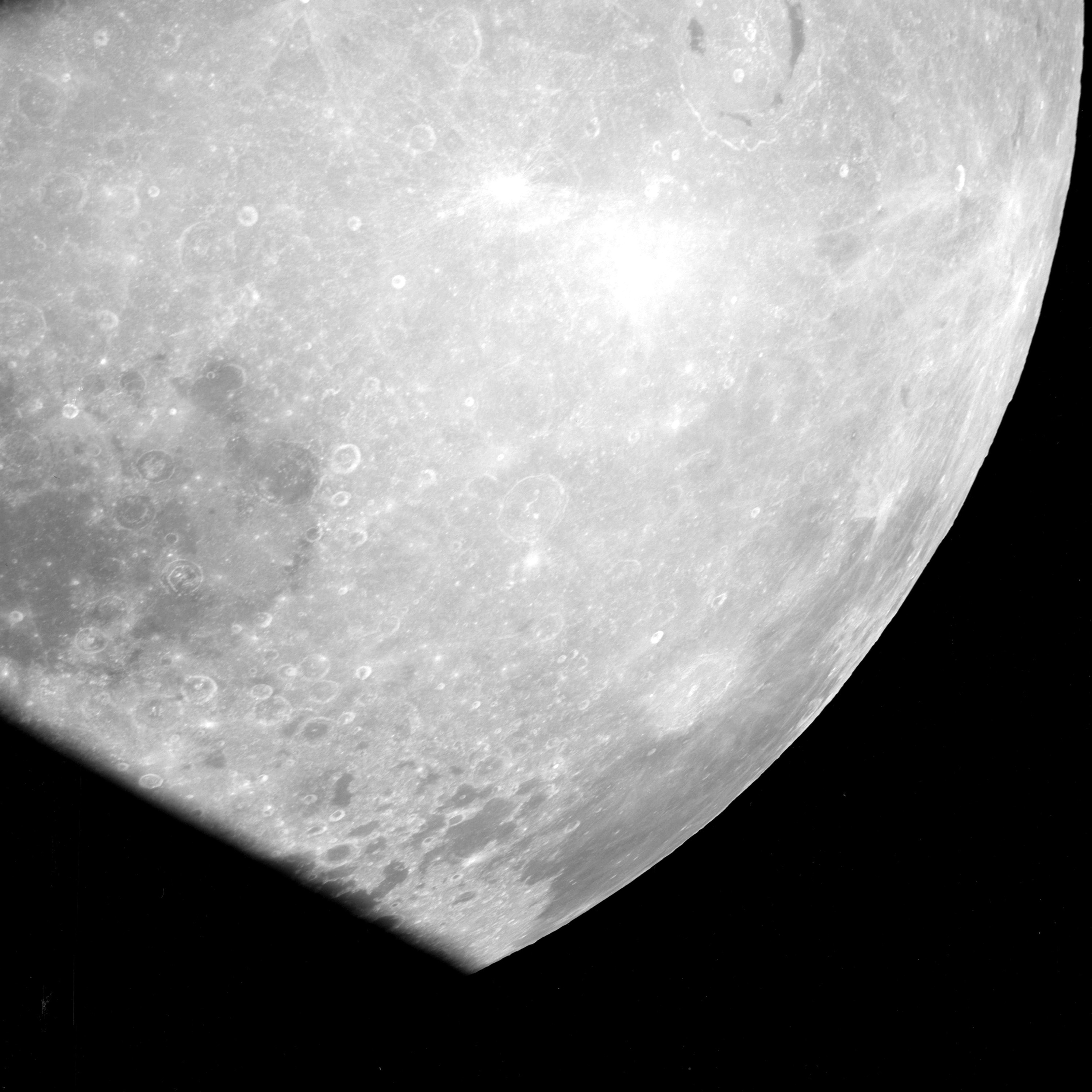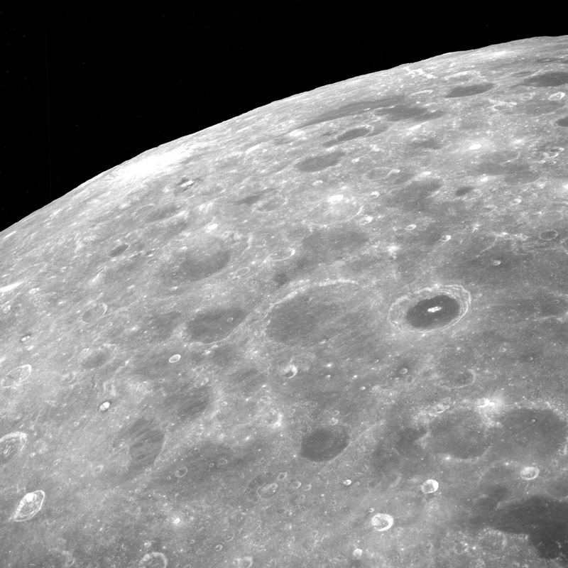 AS08-12-2197 181 kB or 1,309 kB Receding Moon after TEI. Eastwards towards far-side equator north of Tsiolkovsky. Image credit: Image Science and Analysis Laboratory, NASA-Johnson Space Center. |